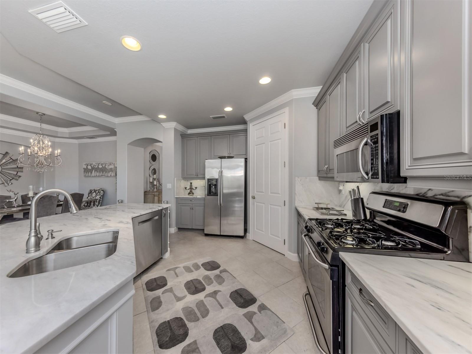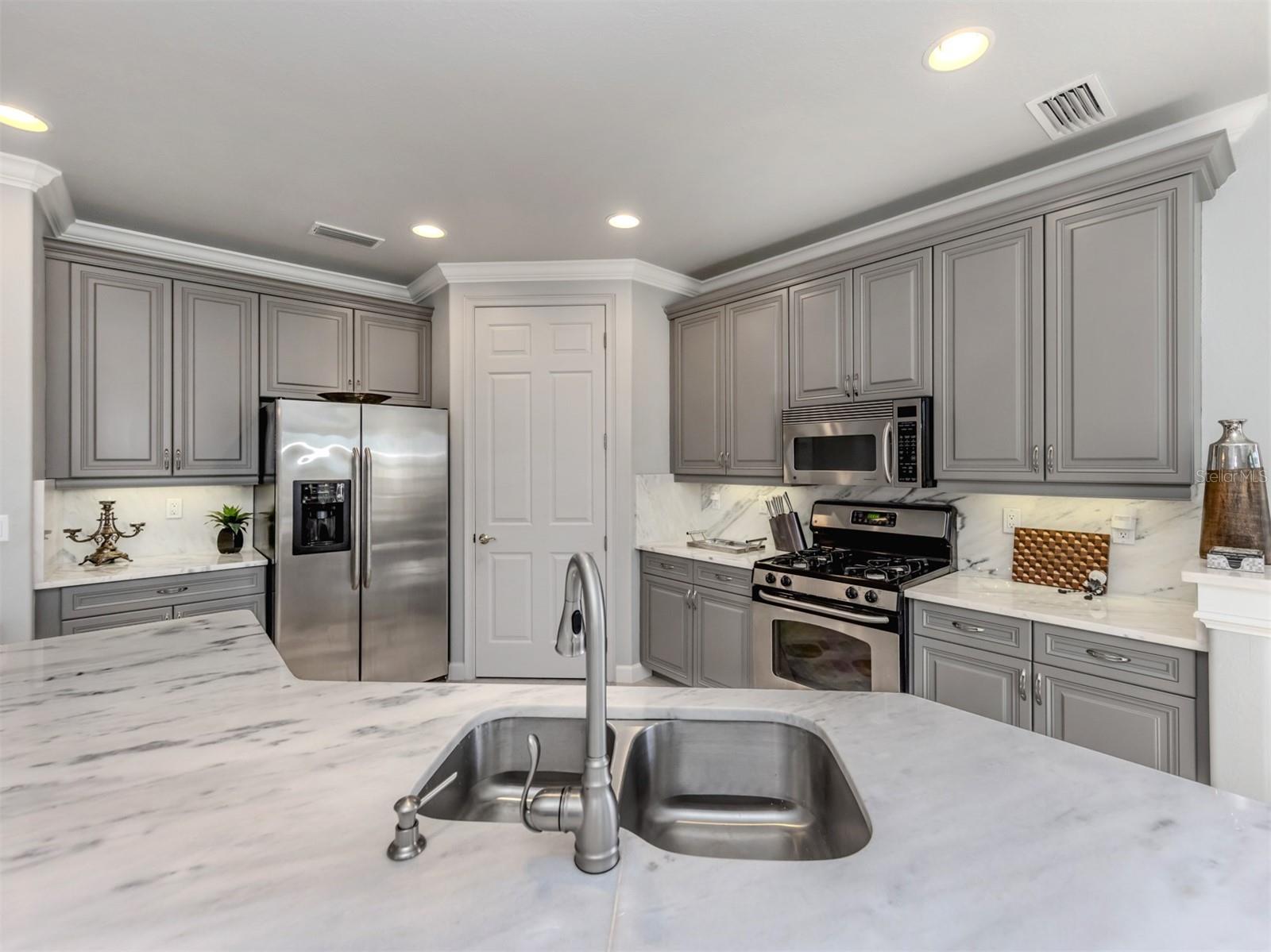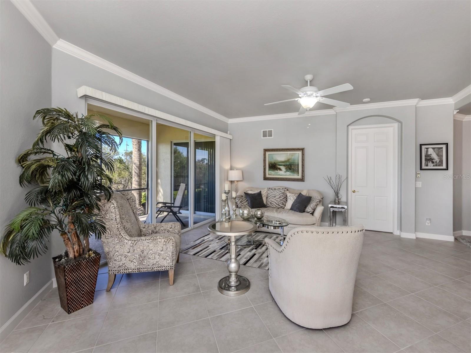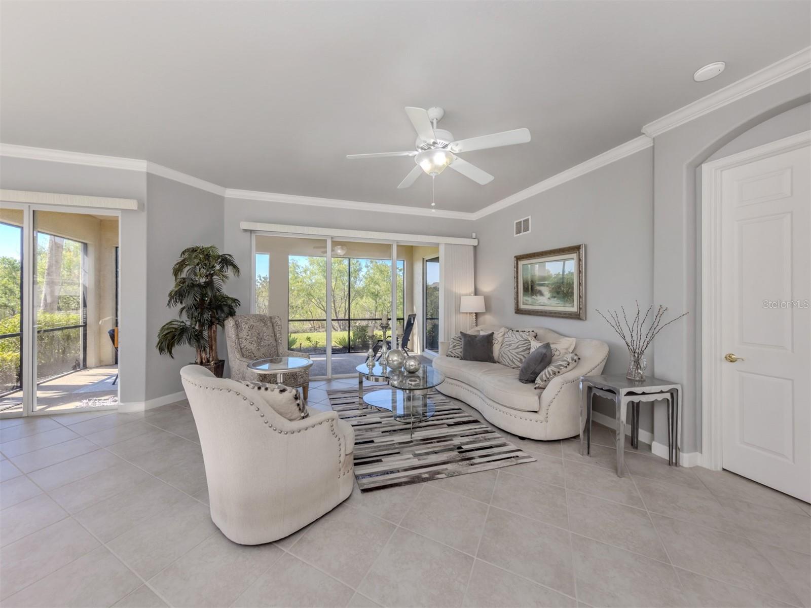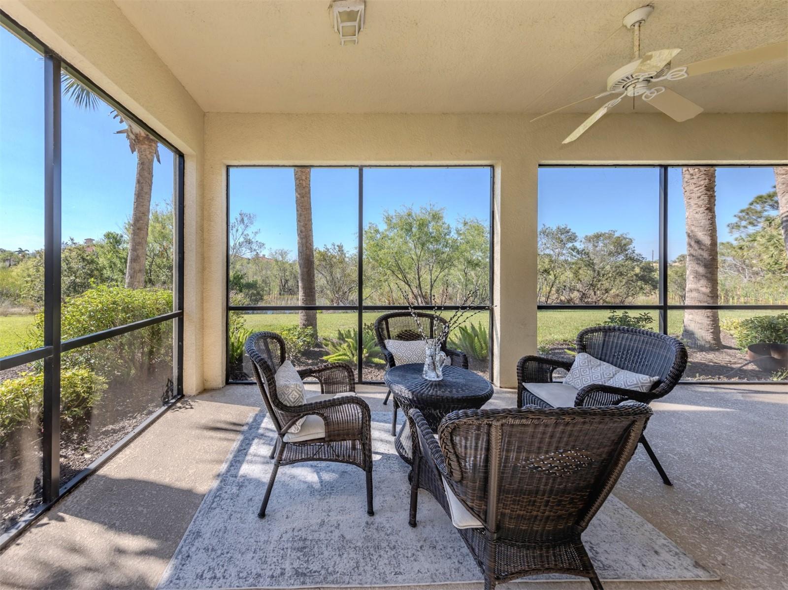 Puttin' on the Ritz! You can move right into this luxurious and elegant first-floor condominium today. This newly redone kitchen makes entertaining a breeze. The bright open great room includes multiple sliders to lanai, large living room area, dining room, sitting area and large kitchen with new granite stainless appliances, walk-in pantry and gas range. This split floor plan offers two bedrooms, one with a walk-in closet, hall bath, and laundry room leading to two-car attached garage. The primary is on the other side with sliders to lanai, en-suite bath with dual sinks, large walk-in shower and nearby walk-in closet and two linen closets. Enjoy sunsets from your private lanai with private marshy preserve views and all the visiting wildlife. Turnkey furnished. Just move in and enjoy your new resort living with private restaurant with wonderful chef, featuring special dinners, dances, events, hamburger night, fish fry Fridays, buffets, Sunday breakfast and recently added pizza oven. Yum! No waiting or traffic in season. Other offerings in this wonderful and popular neighborhood are six Har-Tru tennis courts, three pickleball courts, large resort pool with spa, tiki bar for drinks and food, and occasional entertainment and karaoke, lap pool, gym, aerobics room, many games groups and last but far from least, a ½-mile boardwalk through the jungle down to the Myakka River. All this and so conveniently near the highway, hospital, fire station, many beaches and beautiful downtown Venice. Enjoy today!