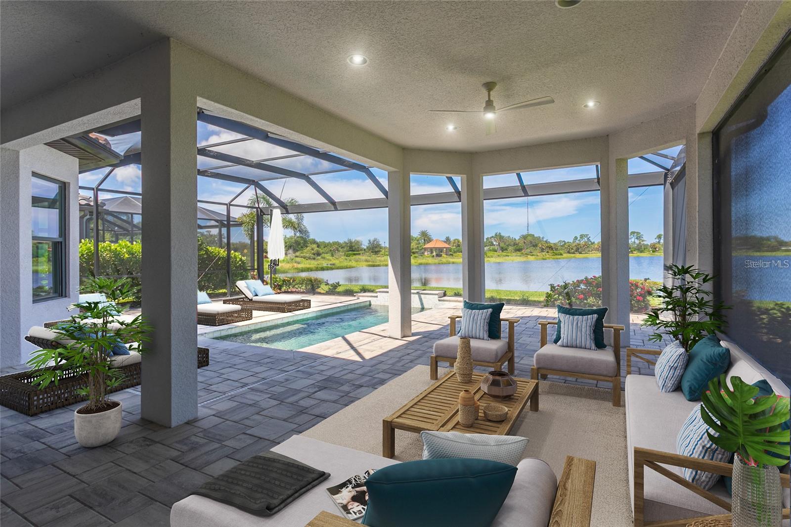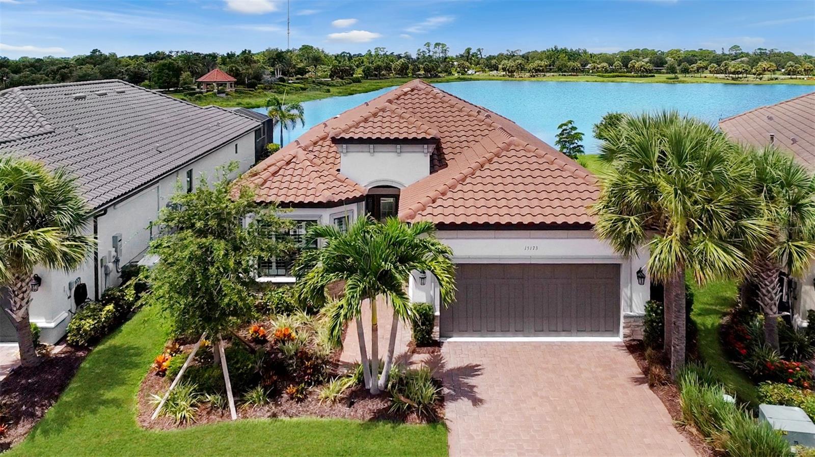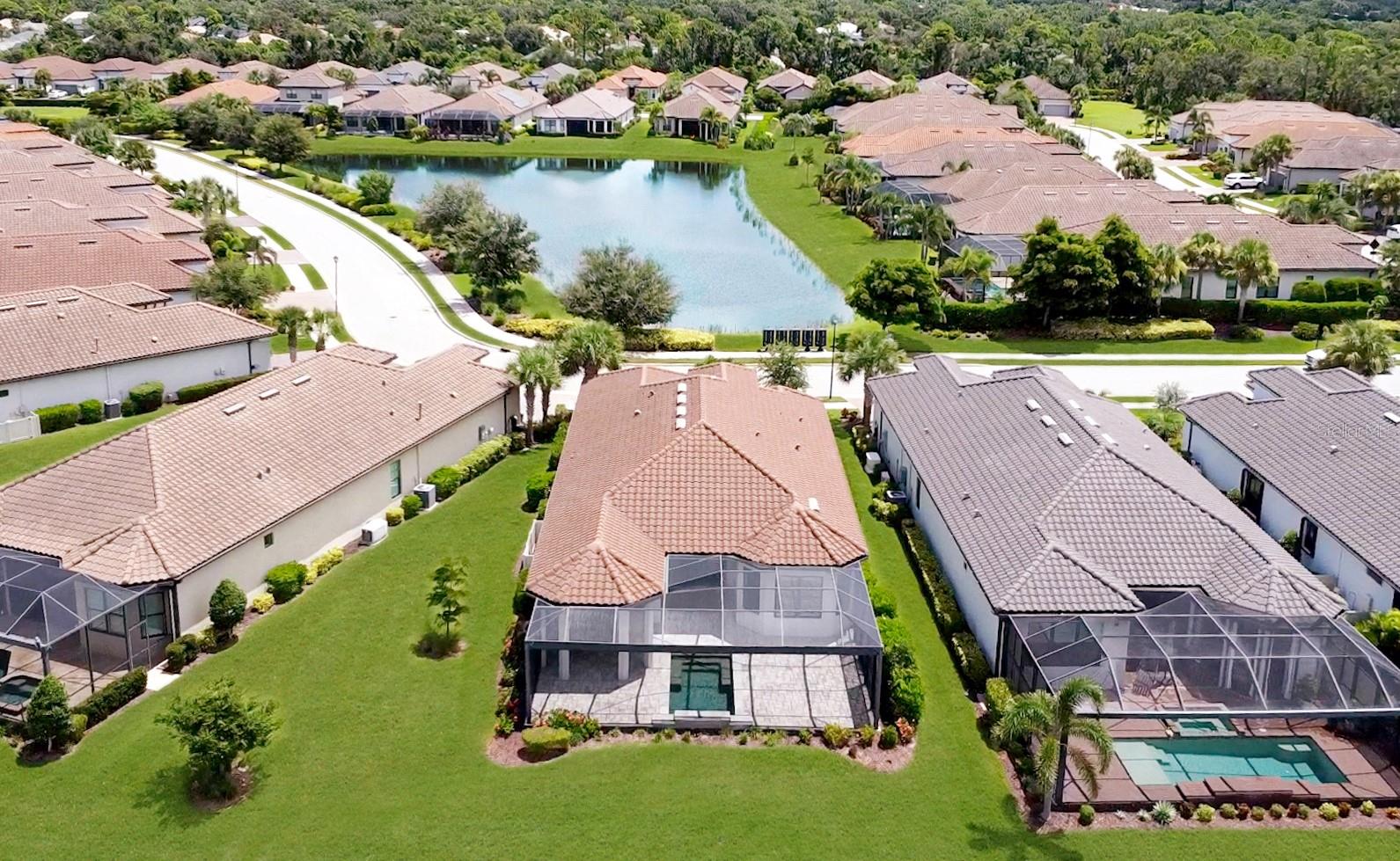 One or more photo(s) has been virtually staged. Welcome to Bellacina by Casey Key, one of the closest gated communities to the Gulf—ideally located just 2.5 miles from Nokomis Beach, with easy access to local restaurants, shopping, and all that coastal living entails. This beautifully designed and upgraded Taylor Morrison Piceno model offers 1,929 sq. ft. of open, single-level living with 2 bedrooms, 2 bathrooms, and a versatile study/den—perfect for a home office or flex space. From the moment you arrive, this home is ideally situated on a private .20-acre lot with a tranquil lake out back and a peaceful pond across the street—no front-facing neighbors! The entrance has a stunning front door with decorative glass inserts, flanked by matching sidelights and topped with a transom window, setting the tone for the elegance that continues throughout. Built for durability and peace of mind, the home features hurricane impact windows and doors, smart home technology, and a Nest thermostat. The open-concept layout is designed for modern living and effortless entertaining, featuring a chef’s kitchen with a natural gas cooktop, an expansive 11’ x 5’ quartz island accented by two brass palm leaf pendant lights, GE Café appliances with gold accents, a double oven, and a glass subway tile backsplash. The kitchen flows into the dining and living areas, highlighted by two triple sliding glass doors and a transom window that fill the space with natural light and provide seamless access to the west-facing screened lanai—perfect for enjoying spectacular sunsets over a large, tranquil lake. The outdoor area is made for year-round relaxation, complete with concrete pavers with travertine accents, a gas-heated, saltwater pool featuring a water fall feature and hot tub functionality, an extended roof for added shade, and pre-plumbing for a future outdoor kitchen. The primary suite is a private retreat with windows and double doors overlooking the lake and lanai, while a pocket door creates a private en-suite for the guest bedroom and bath. Additional interior features include laminate flooring, plantation shutters, ceiling fans, tray ceilings, frosted glass interior doors, and 24” x 24” porcelain tile flooring and walls in the bathrooms and laundry room. The laundry room is fully equipped with a utility sink and both upper and lower cabinetry for added storage. The spacious 2+ tandem garage can accommodate 3 cars or a boat, golf cart and extra storage. Residents of this resort-style, maintenance-free community enjoy premium amenities including a heated pool with cabanas, outdoor spa, 24-hour fitness center with showers, clubhouse with a chef’s kitchen and pool table, bocce ball courts, corn hole, grilling area, cozy gas fire pits, 4 lighted pickleball courts, a Har Tru tennis court, playground, and 2 dog parks. The community also features a private entrance to the Sarasota Legacy Trail and hosts a full calendar of events coordinated by an on-site Activities Director. Bellacina’s prime location puts you just 2.5 miles from Nokomis Beach, 5 miles from historic downtown Venice, 20 minutes to Siesta Key, and 30 minutes to downtown Sarasota and SRQ International Airport. This home is not just a gorgeous residence—it's a lifestyle!