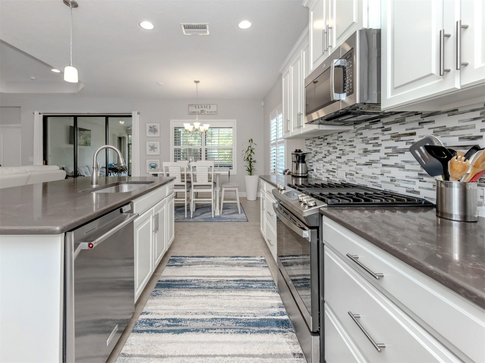 WELCOME TO 264 ACERNO DRIVE in the gated Milano community. This beautifully upgraded and coveted White Star floor plan offers 3 bedrooms, 2.5 baths, and a versatile flex/office space across 2,065 square feet. Enjoy peaceful privacy with lake views in front and a wooded preserve behind—no neighbors in front or back—plus a large buffer on one side of the home and room to add a pool. INTERIOR FEATURES include 9’4” ceilings, coffered ceilings in the living and primary suite, hardwood flooring in the office, crown molding, and 5¼” baseboards. The kitchen features upgraded cabinets, counters, backsplash, a large island, and newer stainless steel appliances (2023). The adjoining Butler’s Pantry adds function and style. UPGRADES AND IMPROVEMENTS include an Impact Glass front door, paver driveway, walkway, and lanai, plantation shutters, new ceiling fans throughout, Accordion Storm Shutters on all windows and sliders, insulated garage door with attic insulation and ceiling storage racks, utility tub, retractable front entry screen, and natural gas for cooking, hot water, and optional gas dryer hookup. The home's exterior was painted in 2020 and inside in 2024. OUTDOOR LIVING features an expansive under-roof, L-shaped screened lanai—an extended layout no longer offered by the builder—and a private HotSprings saltwater spa for relaxation. COMMUNITY HIGHLIGHTS: Milano is a gated, active-lifestyle community with low HOA fees, No CDD, resort-style amenities, and an ideal Venice location close to downtown, beaches, and Wellen Park.
