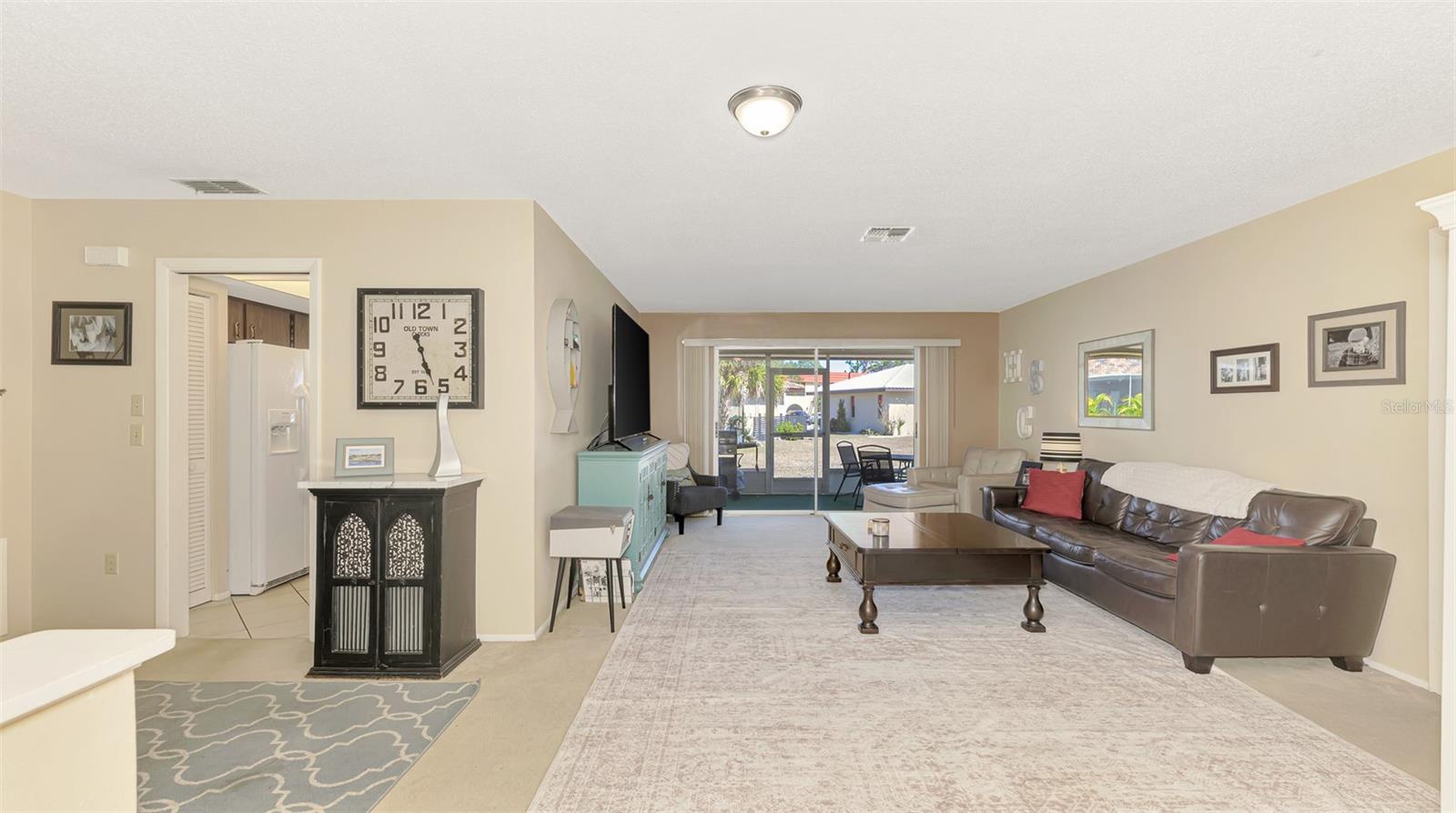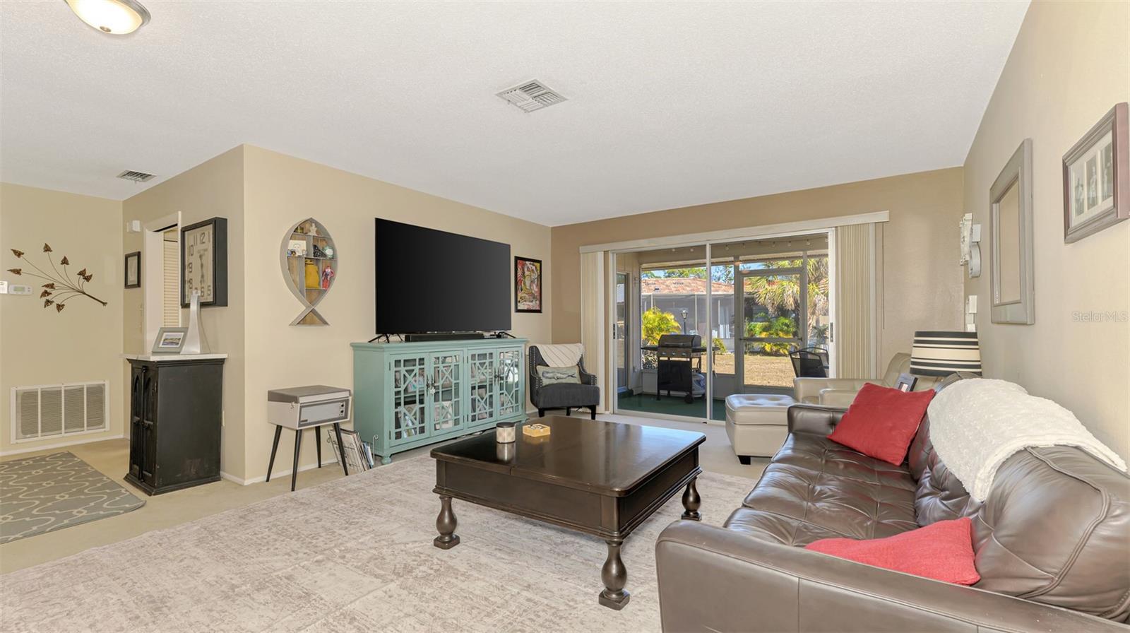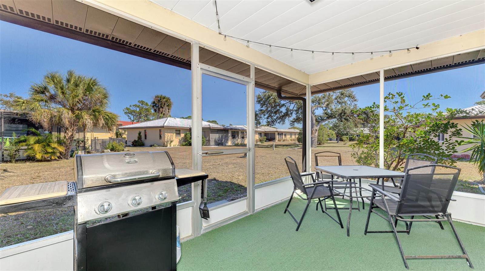 Sorrento Villas is an area of detached single family homes whose ownership is classified as a condominium. The monthly fee includes insurance, roofs, exterior, painting, lawn maintenance and more. This detached home is situated privately with trees on the side and across the street along with a water view in the front. There is an enclosed porch in the front and also the in the back. The living room is spacious with sliders to the enclosed porch. The kitchen is open to a dining area with sliders to the lanai. The primary bedroom has a walk-in closet and a full bath with a shower. The second bedroom has a walk-in closet. The seller is giving a $2,000 flooring allowance for new carpet. You are within in minutes to shopping, restaurants, Casey Fish House and Tiki Bar along with downtown Venice and Nokomis Beach.