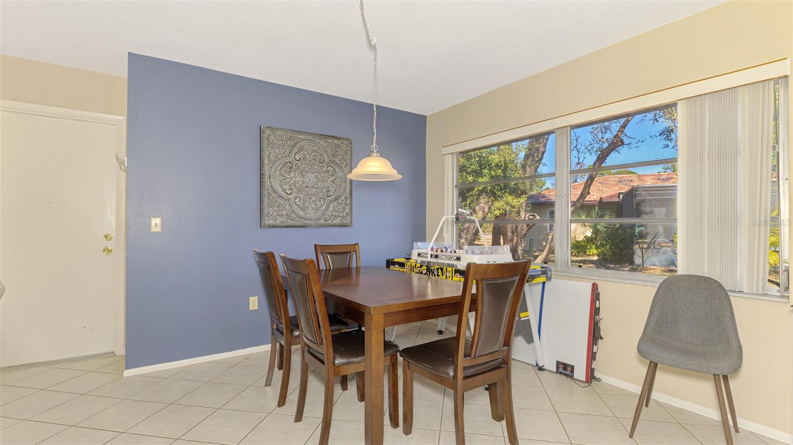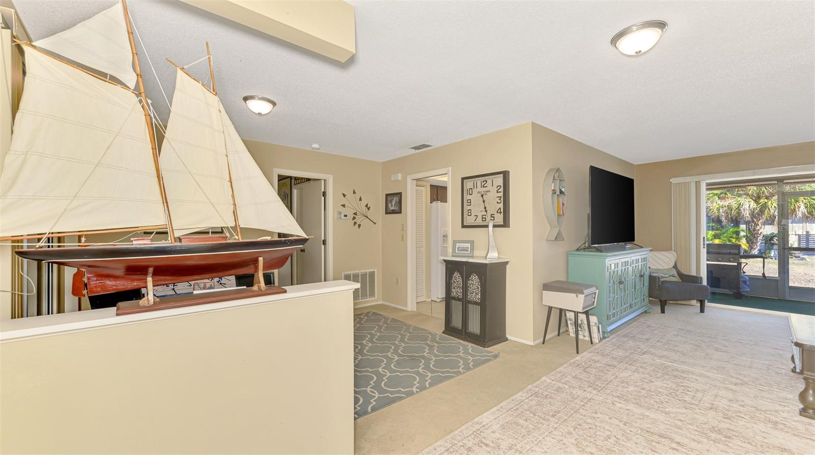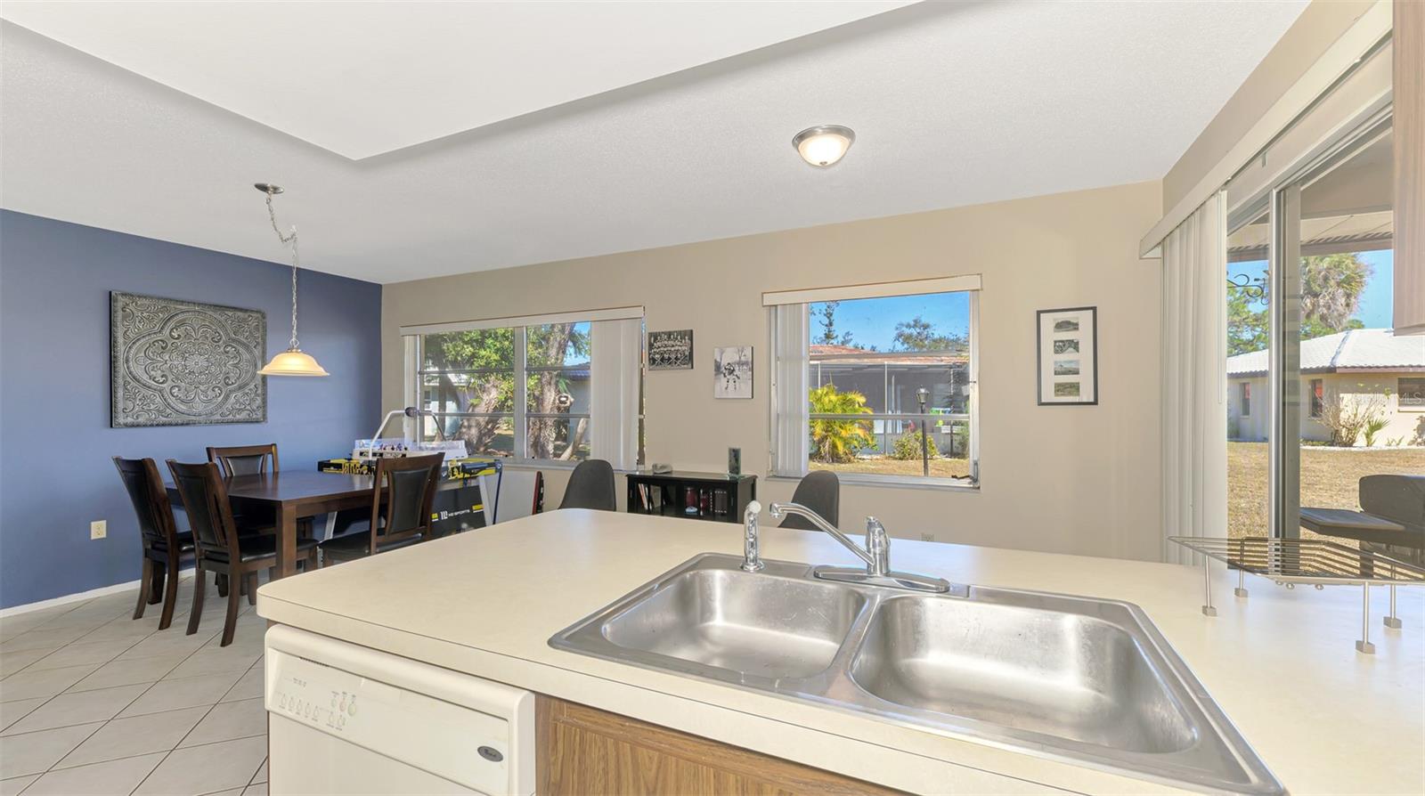 Sorrento Villas is an area of detached single family homes whose ownership is classified as a condominium. The monthly fee includes insurance, roofs, exterior, painting, lawn maintenance and more. This detached home is situated privately with trees on the side and across the street along with a water view in the front. There is an enclosed porch in the front and also the in the back. The living room is spacious with sliders to the enclosed porch. The kitchen is open to a dining area with sliders to the lanai. The primary bedroom has a walk-in closet and a full bath with a shower. The second bedroom has a walk-in closet. The seller is giving a $2,000 flooring allowance for new carpet. You are within in minutes to shopping, restaurants, Casey Fish House and Tiki Bar along with downtown Venice and Nokomis Beach.