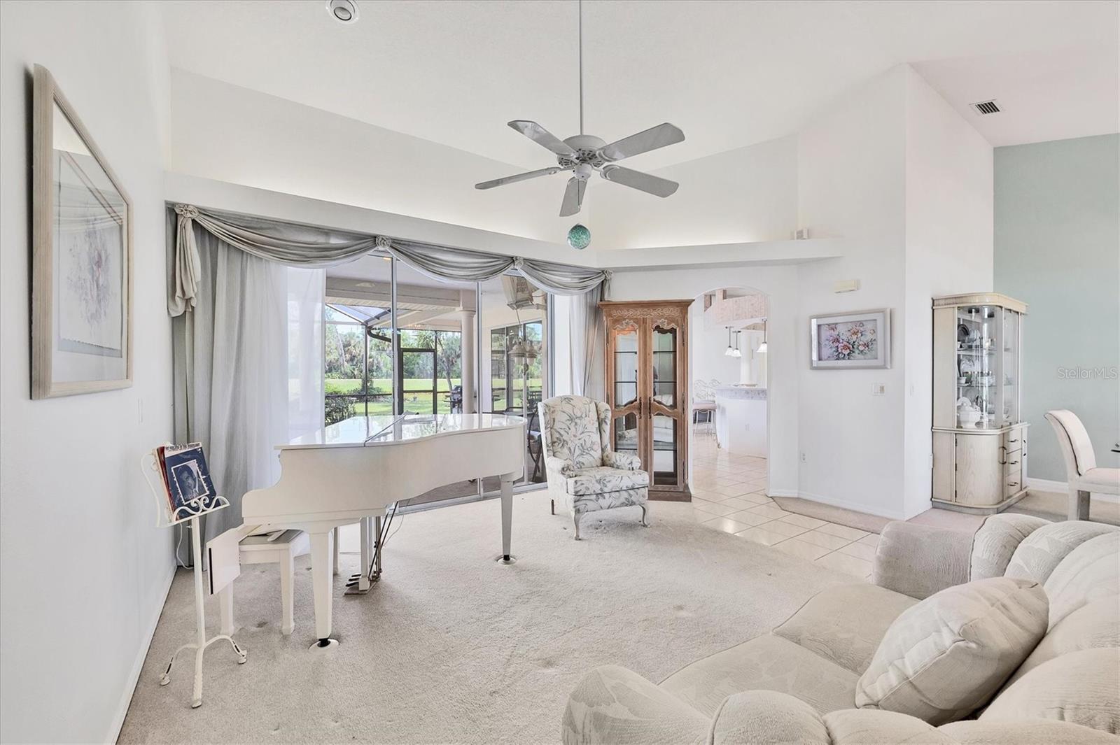 One or more photo(s) has been virtually staged. Welcome to your private retreat in the coveted, gated golf community of Calusa Lakes. Nestled among mature trees and tropical landscaping in maintenance-free Woodland Trails, this beautiful 3 bedroom, 2-bath with almost 2300 sq.ft. home offers a serene WATER VIEW overlooking the 5th hole tea box of the Calusa Lakes Golf Course. Relax in your own private spa in your screened in lanai during the evenings and during the day you have access to your heated COMMUNITY POOL for sunbathing and swimming. This lot is also large enough to build your own pool. NEWER TiLE ROOF (2018), NEW Hot Water Heater (2025) and recently serviced and maintained HVAC. Inside, you will find an open concept layout with high ceilings, a spacious kitchen with breakfast bar, and a bright living area with expansive sliding doors that let in natural light. The split bedroom plan offers privacy, with a generous primary suite that includes lanai access, a garden tub, separate walk-in shower and dual vanities. Calusa Lakes is one of Nokomis's most desirable communities, conveniently located near the Gulf of Mexico, fine dining, boutique shopping, cultural attractions, and the newly opened Sarasota Memorial Hospital. This exceptional neighborhood features majestic shade trees, scenic lakes, well-kept homes, a semi-private golf course, and clay tennis courts. Whether you’re looking for a full-time residence or a seasonal getaway, this distinguished property in Calusa Lakes is the perfect Florida retreat.