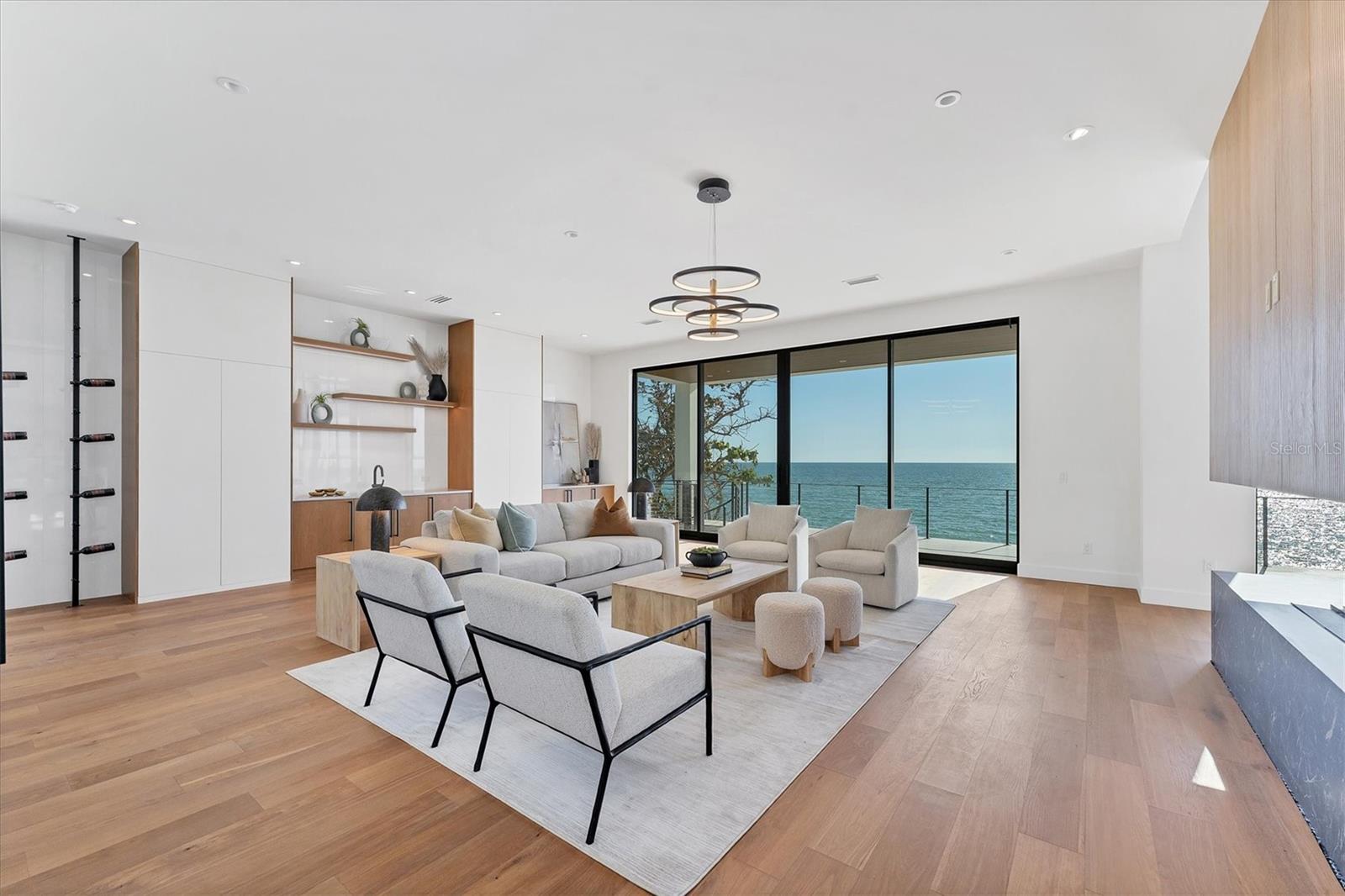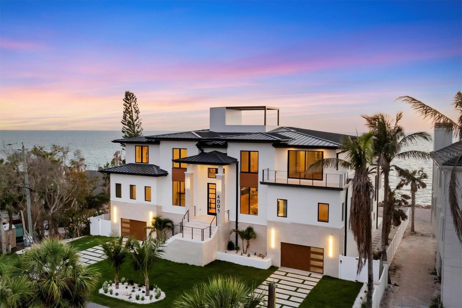 WELCOME TO ONE OF THE FEW BRAND-NEW GULF FRONT HOMES FOR SALE ON THE WEST CENTRAL COAST OF FLORIDA. A rare and extraordinary offering, where cutting-edge design meets endless sea-to-sky vistas. Nestled on the exclusive barrier island of Casey Key, this newly constructed Modern Coastal estate designed by Modesta Homes defines luxury beachfront living. Positioned directly on the sand with unobstructed Gulf views, this striking residence offers 7,977 square feet of elevated, FEMA-compliant living space, showcasing the pinnacle of craftsmanship and architectural innovation. Built to the highest standards with concrete block construction, pilings, impact-rated windows and doors, and a four-stop elevator, every detail of this home has been thoughtfully curated for style, function, and resilience. Inside, soaring 24-foot ceilings welcome you into the grand foyer and great room, anchored by a dramatic floating staircase and a 24-foot feature fireplace wall. With 6 spacious en-suite bedrooms, state-of-the-art home theater, lounge, bar, and a wine wall, this home offers both grand entertaining and serene retreat. The chef’s kitchen is a design showpiece, featuring European cabinetry, dual waterfall-edge islands clad in book-matched 3cm quartz, and premium Sub-Zero & Wolf appliances. Dual laundry rooms, breakfast nook, and custom built-in vanities provide elevated everyday living. The primary suite is a private sanctuary, complete with a spa-like bathroom featuring a 71-inch freestanding tub, dual rainfall showers, a makeup vanity, and a 400 sq ft walk-in closet. Every bathroom throughout the home is appointed with bespoke cabinetry, quartz surfaces, and backlit mirrors. Designed to impress from every angle, the home is finished with smooth stucco, level 5 drywall, hardwood floors, imported tile, and integrated LED tray ceilings. A sleek rooftop terrace crowns the home, offering panoramic views of the Gulf and beyond. Step outside to your private resort: an expansive terrace with an oceanfront pool, floating spa, sun decks, outdoor fireplace, and fully equipped kitchen. Lush, tropical landscaping, Zoysia grass, and a concrete drive with turf inlays complete the impeccable exterior design. Sleek metal railings accentuate balconies and the rooftop for a modern edge. Set on a half-acre of prime waterfront. This is coastal modern luxury at its finest—a rare opportunity to own a brand-new, Gulf-front estate on one of Sarasota’s most coveted stretches of sand. Designed and developed by Modesta Homes and built by Tide Homes, LLC.