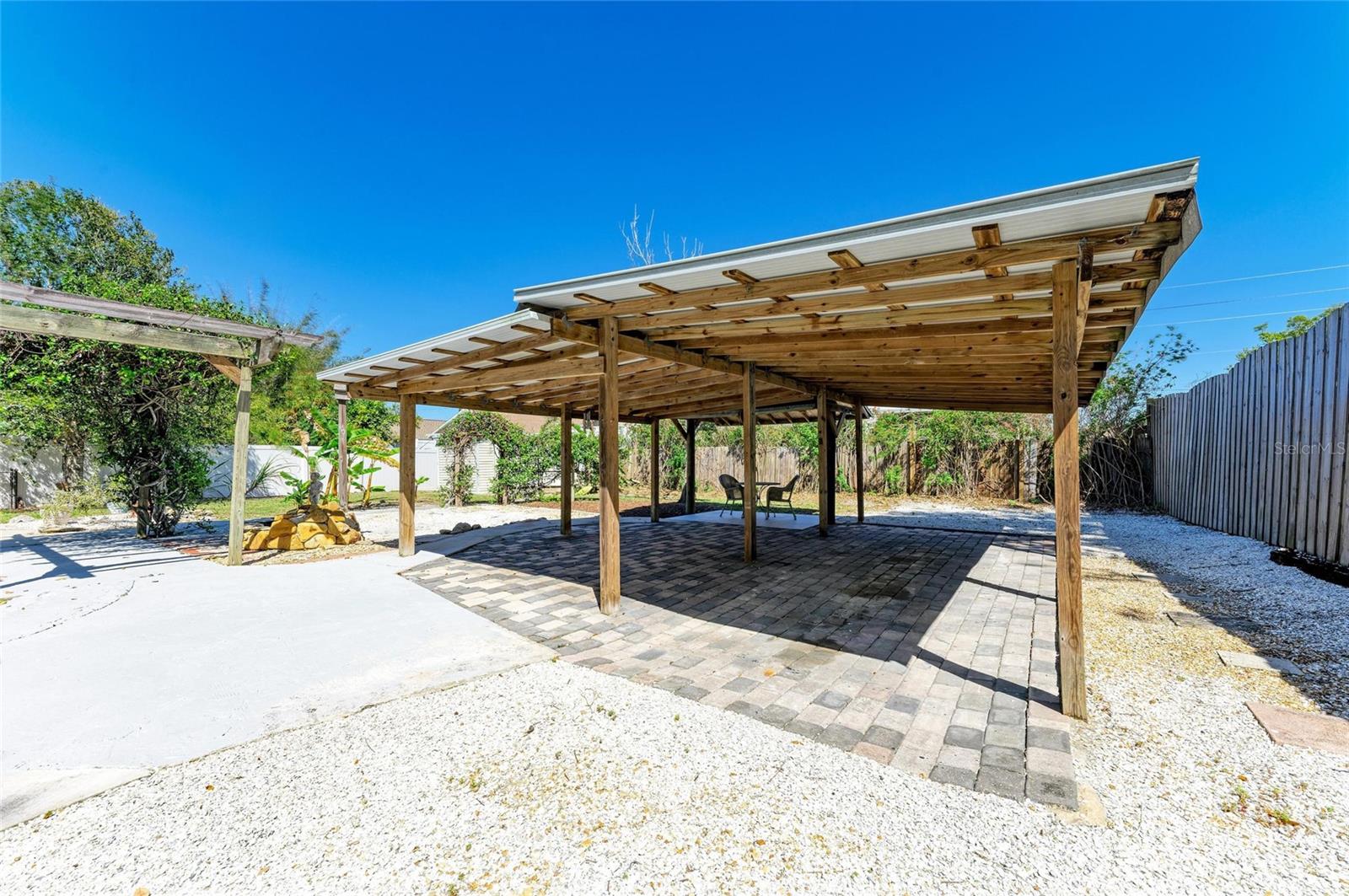 Nestled between Roberts Bay and Dona Bay, this charming home offers a prime location just minutes from the stunning Gulf beaches, the Legacy Bike and Walking Trail, shopping, and dining. Top-rated schools and a new state-of-the-art hospital are also conveniently nearby. At the end of the street, a county boat ramp provides easy access for boat and kayak launching directly into the Gulf. Best of all, this home is not in a flood zone and has remained high and dry through multiple storms and hurricanes over the years. Located in Nokomis, this well-maintained 2-bedroom, 1-bath concrete block home is connected to city water and has been cared for by the same owners for nearly 30 years. Recently painted inside and out, it features a newer roof (just 2 years old and still under warranty), providing peace of mind for years to come. With approximately 720 sq. ft. of living space under air, the home also includes an attached 120 sq. ft. screened porch for added comfort. Inside, an open-concept kitchen, living, and dining area creates a spacious feel, while a dedicated laundry space adds convenience. Decorative tile flooring extends throughout the main living areas, while both bedrooms feature wood laminate flooring and ample closet space. The full bathroom boasts a tiled tub/shower combination, vanity, and tile flooring. Additional features include ceiling fans throughout and 2-inch white faux wood blinds with coordinating valances. French doors leading from the dining area to the screened-in porch with beautiful terra cotta Saltillo tile—perfect for relaxing or entertaining. The fully fenced and gated yard offers a secure space for pets, and outdoor shower and easy-to-maintain tropical landscaping to enhance the tranquil setting. Enjoy the lush surroundings, which include banana trees, bird of paradise, areca palms, a jasmine-covered pergola, and two ornamental fish ponds. Several concrete and paver walkways lead to patios, ideal for barbecues and gatherings. For added convenience, the home provides ample parking, including a carport and additional covered and open space for a boat, motorhome, or extra vehicles. Don’t miss this opportunity to own a well-kept home in a prime location with no flood worries and plenty of outdoor space to enjoy Florida living at its best!