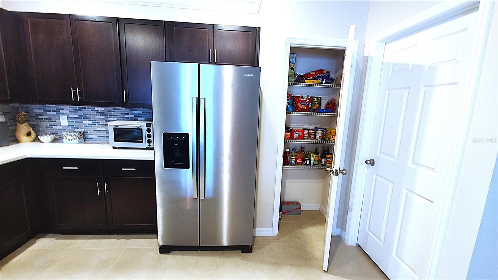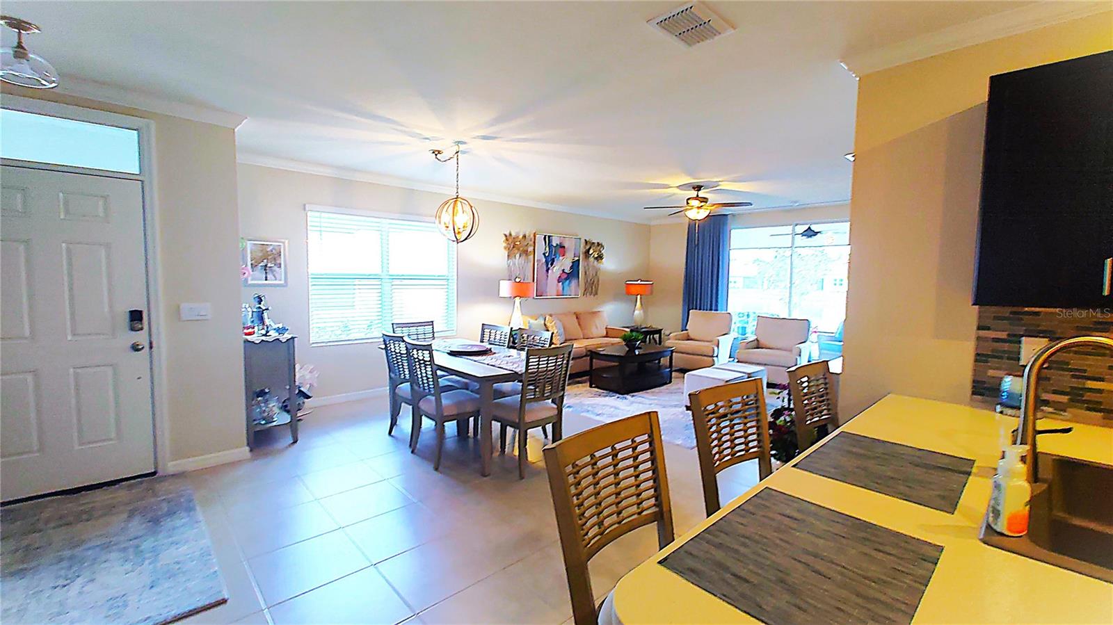 Upgraded villa with high ceilings and direct lake views from your screened lanai. Watch the sunset over the lake each day. Primary bedroom has tranquil views of the lake, large bathroom with double vanities and walk-in shower. Custom closet organizers (also in the bathroom) are impressive and make fabulous use of the space. Kitchen upgrades include custom backsplash, island bar, quartz and sink. Two pantries provide plenty of storage. Washer & Dryer have their own appointed place. Deep closets in hall and custom storage rack provided in garage. Brand new golf cart is also available. The bonus den is super flexible. Split bedroom floor plan gives everyone their own private space. Whether you prefer a quiet walk on the many sidewalks, social gatherings at the club, or a resort style pool, there is an activity for everyone. Enjoy this safe neighborhood with friendly guarded gate entrance, sidewalks, and bike paths. Not in a flood zone, no storm damage, no age restrictions and pets welcome. The HOA fee covers your roof, insurance, painting and so much more!