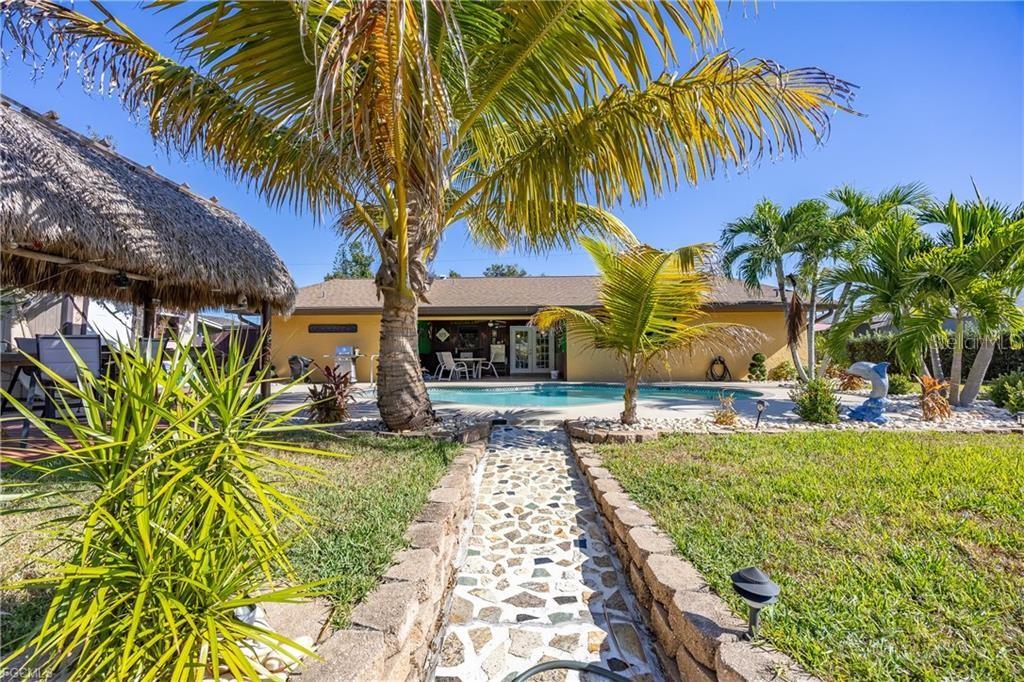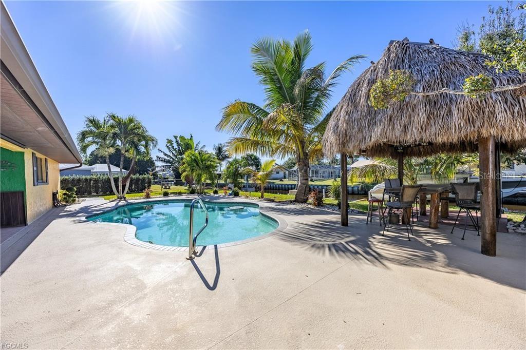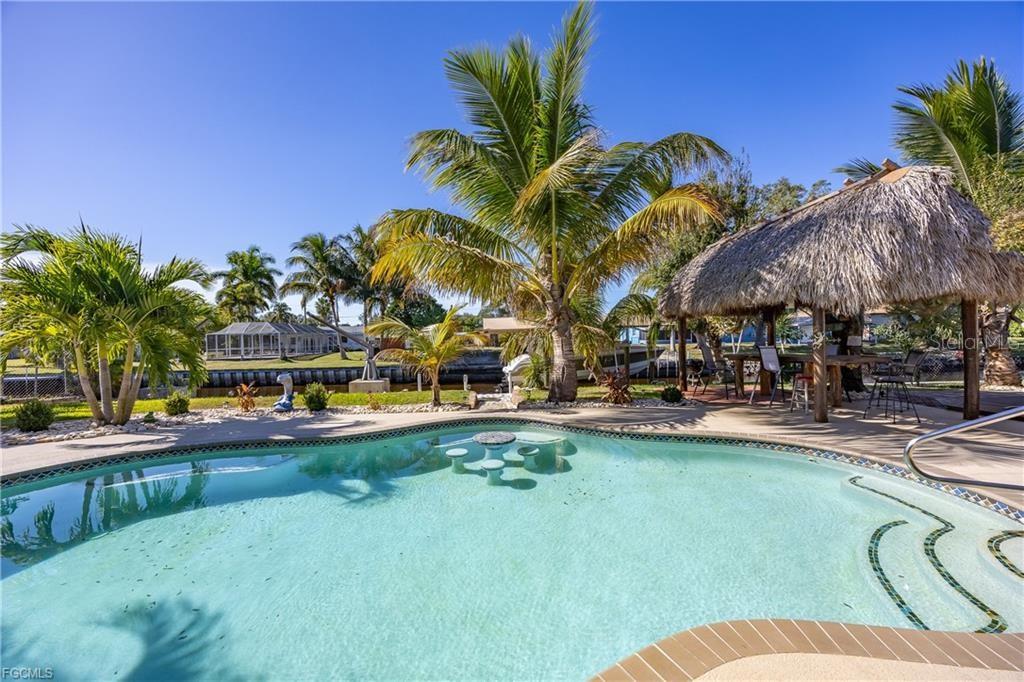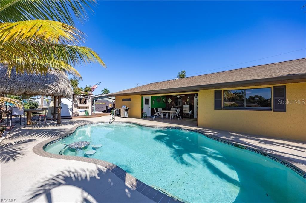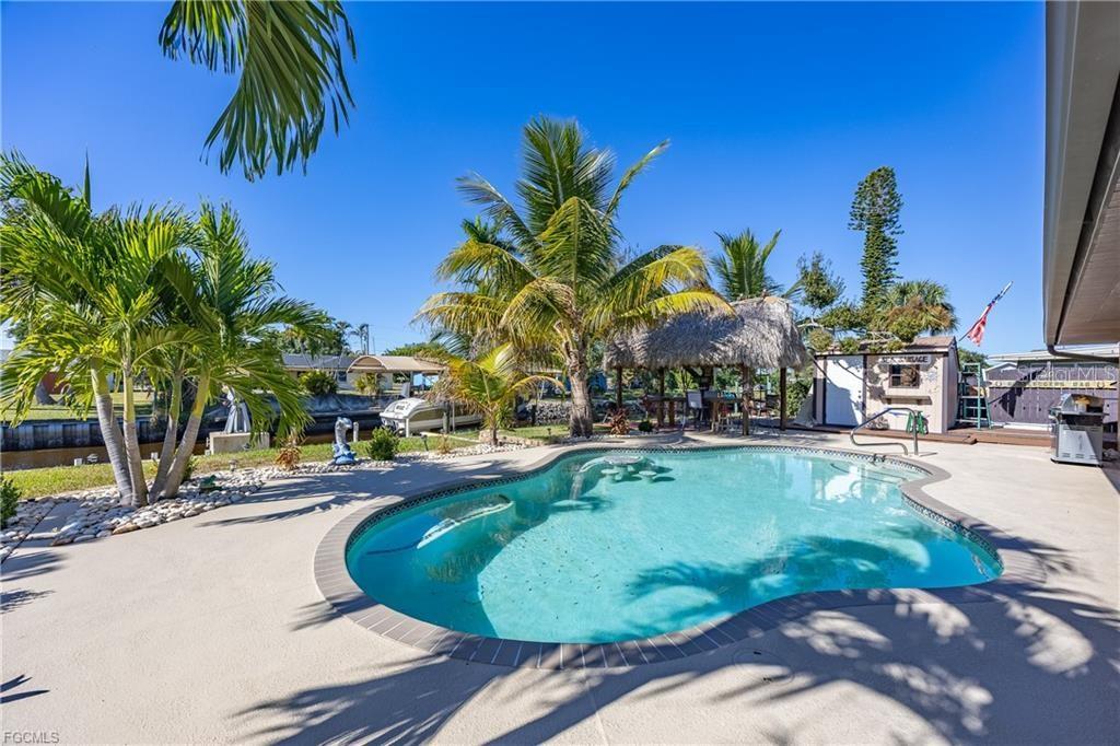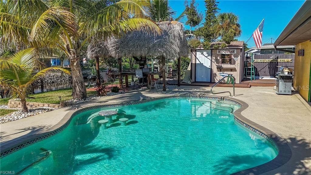 **Waterfront Paradise with Gulf Access – 3BR/2BA Pool Home in Prime North Fort Myers Location!** Welcome to your dream Florida lifestyle! This stunning 3-bedroom, 2-bathroom waterfront oasis combines modern upgrades with resort-style living and direct Gulf access. Boat enthusiasts will love being just minutes to the Caloosahatchee River with a private dock featuring Trex composite decking, electric boat lift with protective canopy (installed within 6 years), and davits ready for your watercraft. Recent major improvements include a brand NEW 2025 AC system and hot water heater, NEW 2022 roof, beautifully renovated modern kitchen, and sparkling pool surrounded by professionally landscaped tropical gardens. The backyard is a true entertainer's dream with an authentic tiki hut, resort-style heated pool, and lush greenery that transforms your outdoor space into a private island escape. Practical features abound with a HUGE 616 sq ft oversized garage providing abundant storage, convenient shed for tools and toys, and extra-wide driveway with room for multiple vehicles, boat trailer, and RV. The low-maintenance Trex dock won't warp, rot, or splinter, making waterfront ownership effortless. Furniture is negotiable for added convenience, and quick Gulf access opens up endless opportunities for fishing, boating, and island adventures. Ideally located near downtown Fort Myers, you'll enjoy easy access to shopping, dining, entertainment, and Southwest Florida's pristine beaches—all while living the coveted waterfront lifestyle. This move-in ready paradise won't last long in today's competitive market. Whether you're seeking a primary residence, vacation retreat, or investment property, schedule your private showing today before this gem is gone!