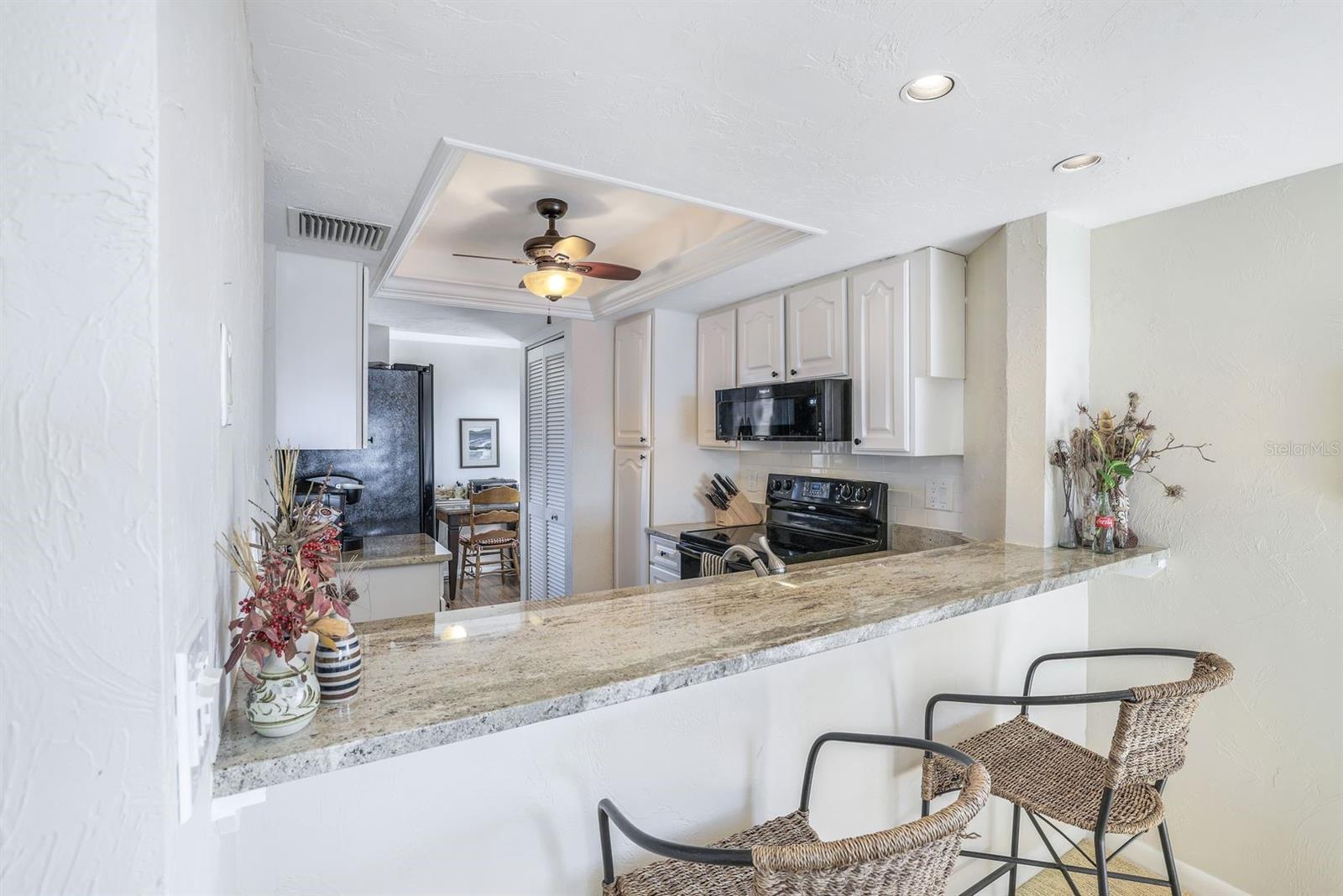 Million dollar views await from your turnkey penthouse condo situated along the Caloosahatchee river in the desirable community of Moorings Point. This corner unit features a Juliet balcony facing east and a corner screened lanai with stunning river and preserve views. The split bedroom floorplan provides privacy for owners and guests. The owner’s suite features a sliding door to the lanai, walk-in closet, and beautifully updated bathroom with custom tile and glass door enclosure. Enjoy the waterview from your kitchen, featuring a tray ceiling, white cabinetry, granite counters, and crown molding. Moorings Point's amenities include a heated pool with grill area for barbeques, and a social room ideal for entertaining family and friends. There’s also a convenient trolley down the street that will transport you across the river to the Fort Myers Downtown River District, with plenty of entertainment, shopping and dining. Don’t miss your opportunity to live the Florida dream—schedule your private tour today!