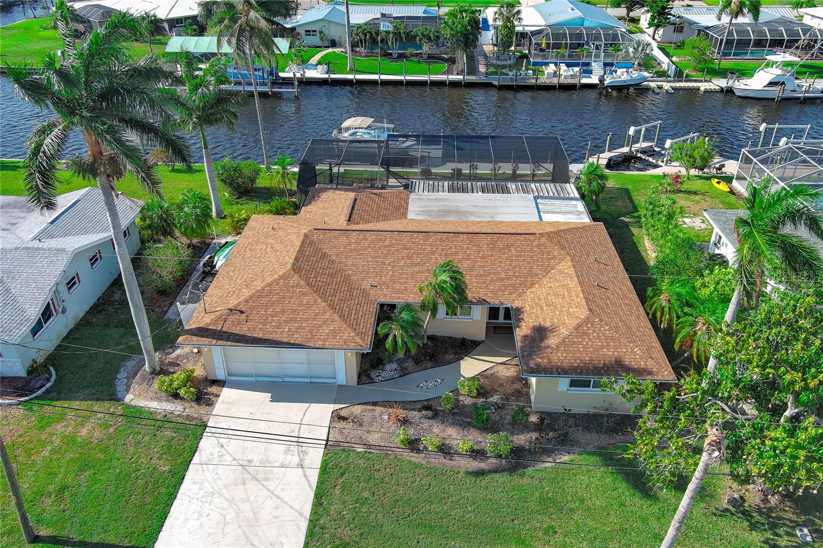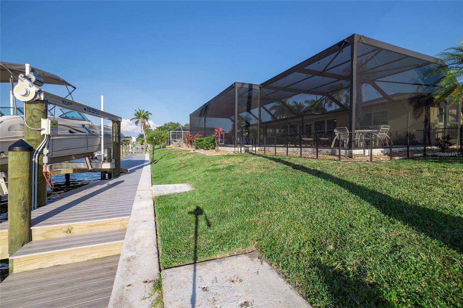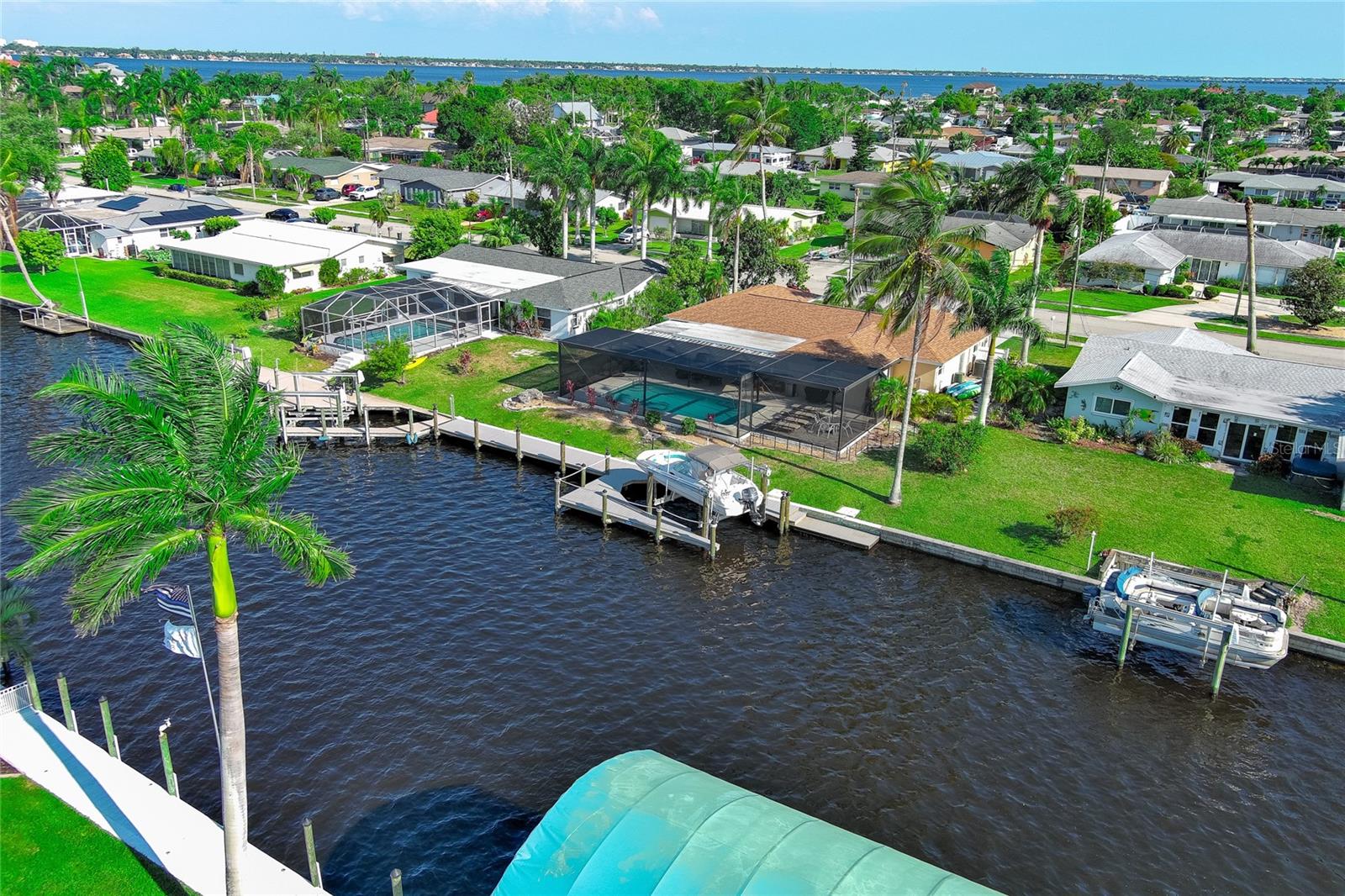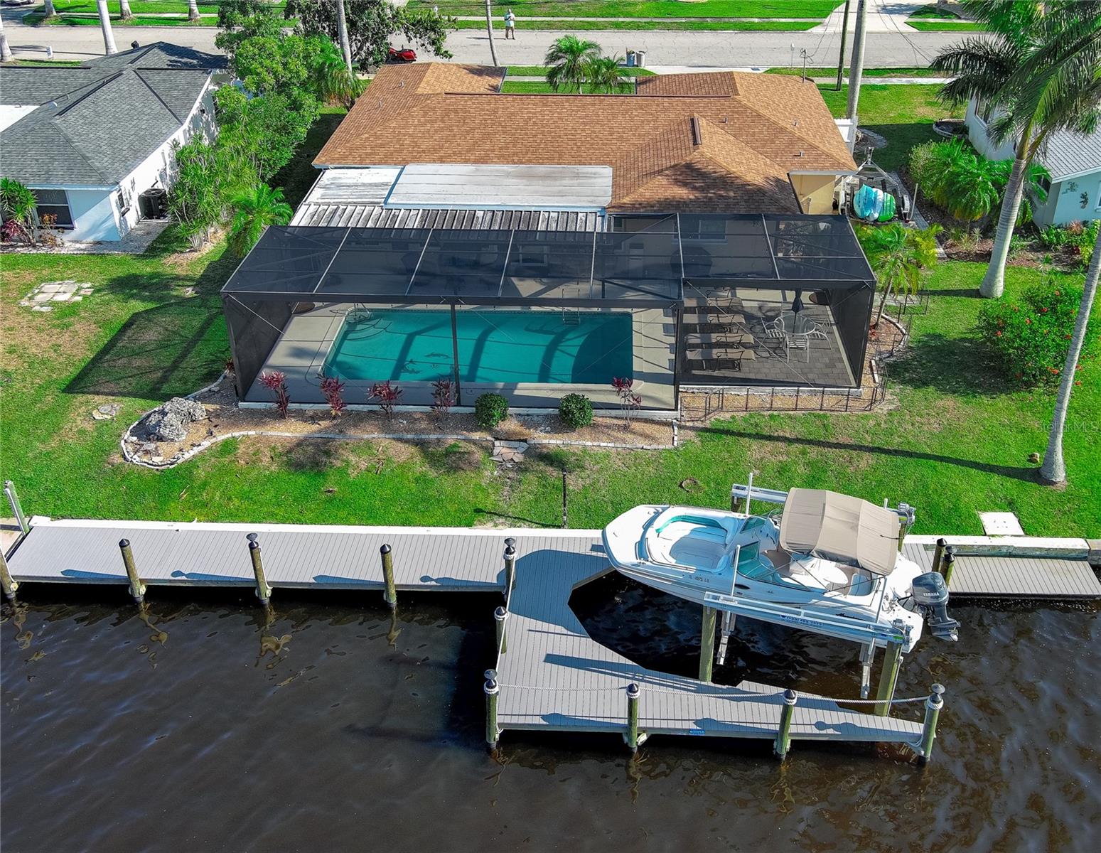 WOW!!!!WAKE UP TO STUNNING WATERFRONT VIEWS OUT YOUR BACKYARD IN THIS EXCEPTIONAL LIKE NEW ROCK SOLID ONE STORY BLOCK HOME! THIS PROPERTY INCLUDES 86 FT OF WATERFRONT WITH A LARGE DOCK AND BOAT LIFT TO ACCOMMODATE A 32 FT BOAT AND PARK UP TO 40 FT VESSEL WITH A KAYAK LAUNCH! This is all situated on one of the widest, and deepest canals off the Caloosahatchee River also named "Little Lake Michigan" (on the map) Upon entering the home, you will be greeted by the bright, airy open-plan living area, complete with a picture-perfect multi-purpose Florida room making it the perfect haven for boating enthusiasts and water lovers alike! No bridges to the Gulf! Newly installed custom designed boat dock/lift constructed of Trex built by Stokes Marina (2022) with excellent seawall inspection. 3 bedrooms with 2 full bathrooms plus a bonus office/art studio! The new gourmet kitchen is a culinary dream, featuring high-end all new (2021) appliances, quartz countertops and generous storage for all your dining needs. A spacious and comfortable living room completes the space, perfect for family gatherings and entertaining friends. New bathrooms, vanities, flooring, lights fixtures (2021) New pressurized toilets (2022) New AC (2021 This home offers a new roof (2021) Hurricane windows and sliding doors (2022) Custom designed pool cage installed with new pool pump (2022)Sewage/drain lines were cleaned and inspected in 2022.