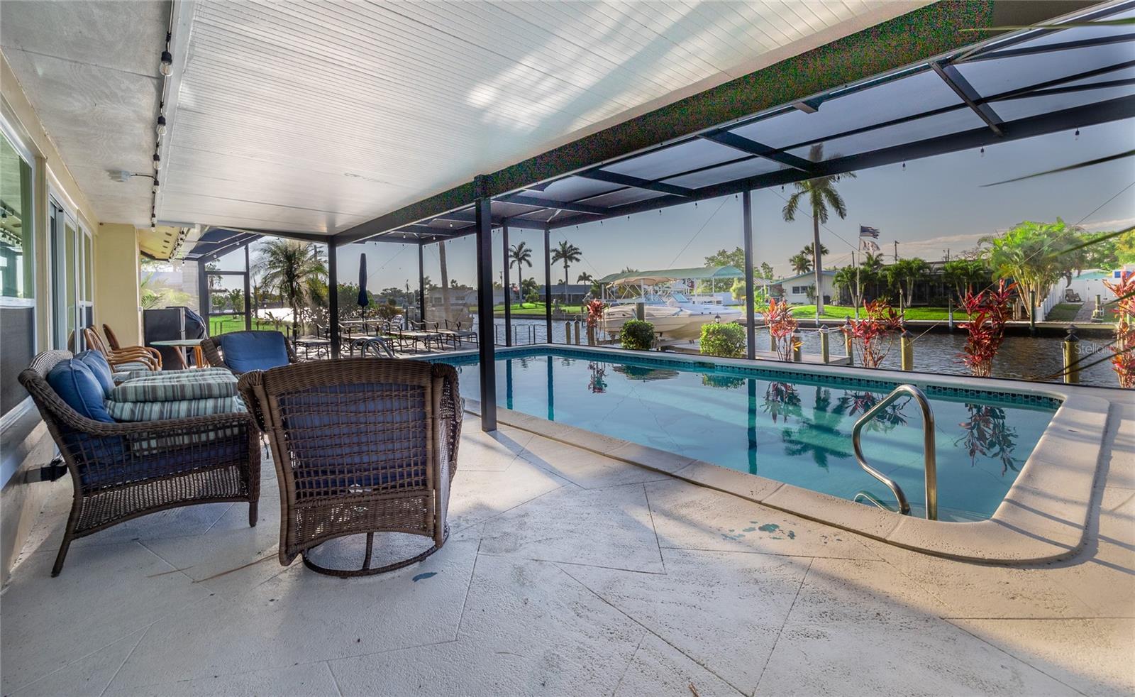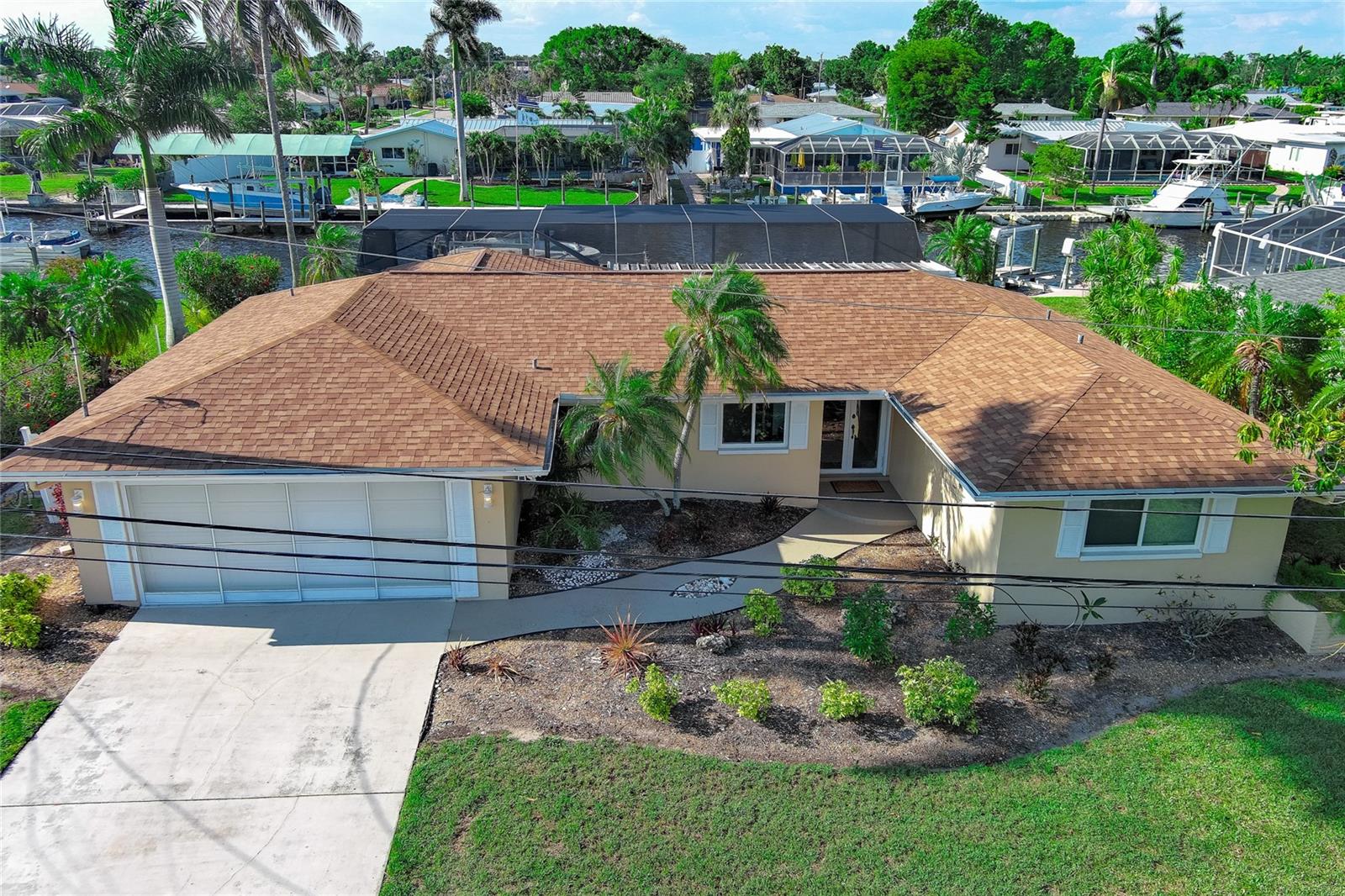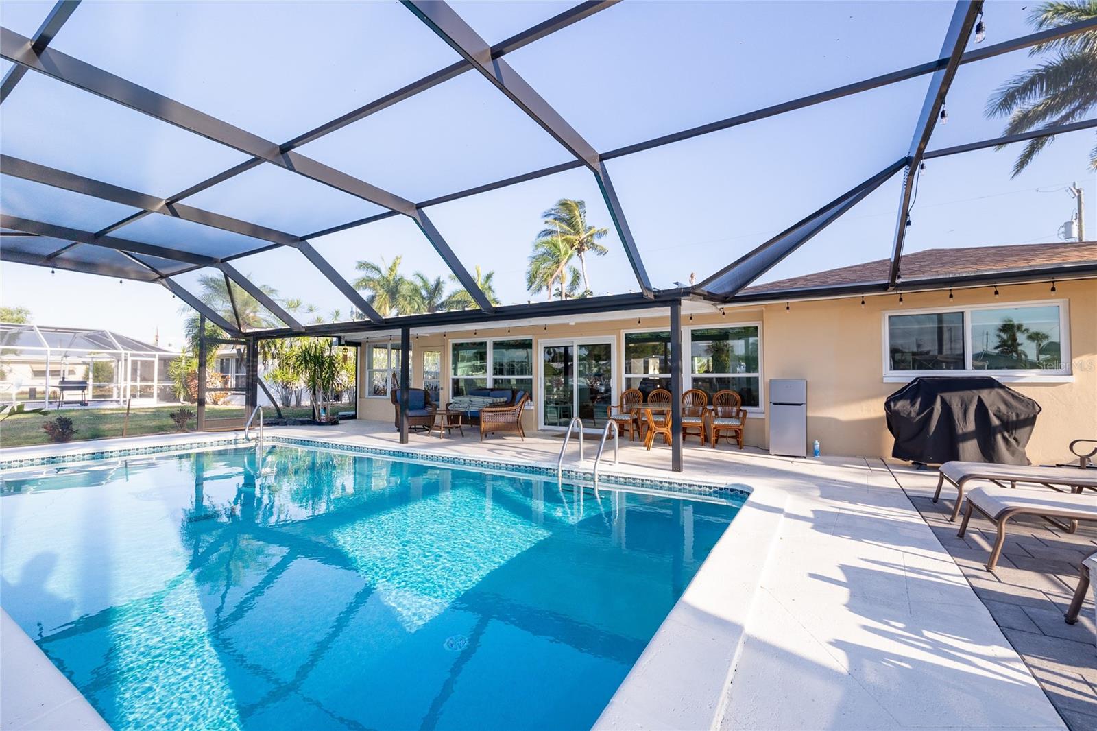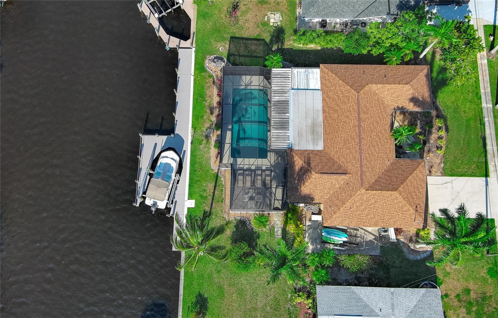 WOW!!!!WAKE UP TO STUNNING WATERFRONT VIEWS OUT YOUR BACKYARD IN THIS EXCEPTIONAL LIKE NEW ROCK SOLID ONE STORY BLOCK HOME! THIS PROPERTY INCLUDES 86 FT OF WATERFRONT WITH A LARGE DOCK AND BOAT LIFT TO ACCOMMODATE A 32 FT BOAT AND PARK UP TO 40 FT VESSEL WITH A KAYAK LAUNCH! This is all situated on one of the widest, and deepest canals off the Caloosahatchee River also named "Little Lake Michigan" (on the map) Upon entering the home, you will be greeted by the bright, airy open-plan living area, complete with a picture-perfect multi-purpose Florida room making it the perfect haven for boating enthusiasts and water lovers alike! No bridges to the Gulf! Newly installed custom designed boat dock/lift constructed of Trex built by Stokes Marina (2022) with excellent seawall inspection. 3 bedrooms with 2 full bathrooms plus a bonus office/art studio! The new gourmet kitchen is a culinary dream, featuring high-end all new (2021) appliances, quartz countertops and generous storage for all your dining needs. A spacious and comfortable living room completes the space, perfect for family gatherings and entertaining friends. New bathrooms, vanities, flooring, lights fixtures (2021) New pressurized toilets (2022) New AC (2021 This home offers a new roof (2021) Hurricane windows and sliding doors (2022) Custom designed pool cage installed with new pool pump (2022)Sewage/drain lines were cleaned and inspected in 2022.