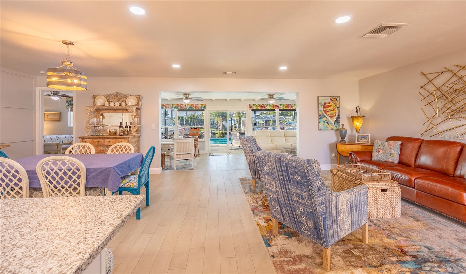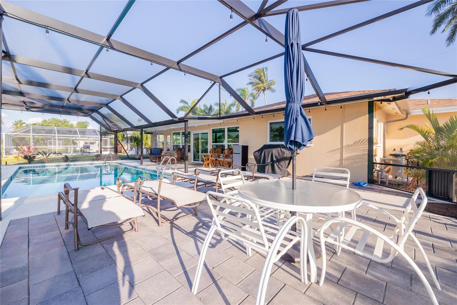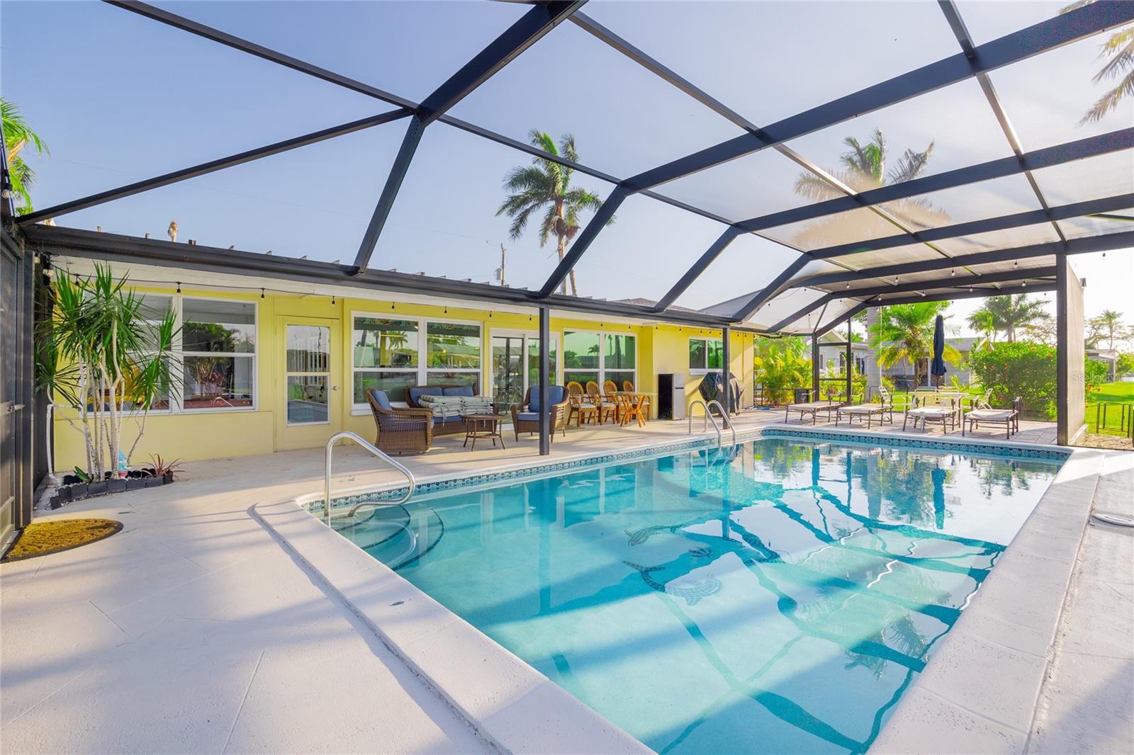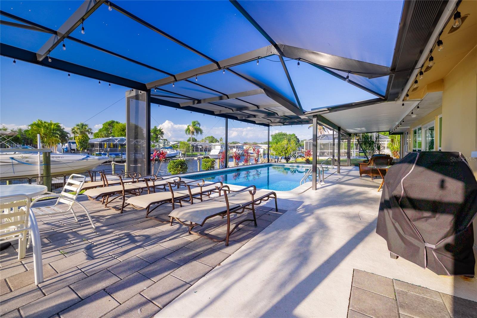 WOW!!!!WAKE UP TO STUNNING WATERFRONT VIEWS OUT YOUR BACKYARD IN THIS EXCEPTIONAL LIKE NEW ROCK SOLID ONE STORY BLOCK HOME! THIS PROPERTY INCLUDES 86 FT OF WATERFRONT WITH A LARGE DOCK AND BOAT LIFT TO ACCOMMODATE A 32 FT BOAT AND PARK UP TO 40 FT VESSEL WITH A KAYAK LAUNCH! This is all situated on one of the widest, and deepest canals off the Caloosahatchee River also named "Little Lake Michigan" (on the map) Upon entering the home, you will be greeted by the bright, airy open-plan living area, complete with a picture-perfect multi-purpose Florida room making it the perfect haven for boating enthusiasts and water lovers alike! No bridges to the Gulf! Newly installed custom designed boat dock/lift constructed of Trex built by Stokes Marina (2022) with excellent seawall inspection. 3 bedrooms with 2 full bathrooms plus a bonus office/art studio! The new gourmet kitchen is a culinary dream, featuring high-end all new (2021) appliances, quartz countertops and generous storage for all your dining needs. A spacious and comfortable living room completes the space, perfect for family gatherings and entertaining friends. New bathrooms, vanities, flooring, lights fixtures (2021) New pressurized toilets (2022) New AC (2021 This home offers a new roof (2021) Hurricane windows and sliding doors (2022) Custom designed pool cage installed with new pool pump (2022)Sewage/drain lines were cleaned and inspected in 2022.