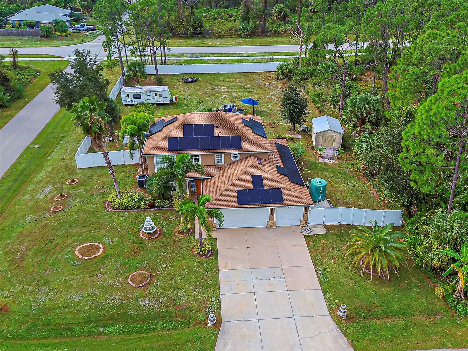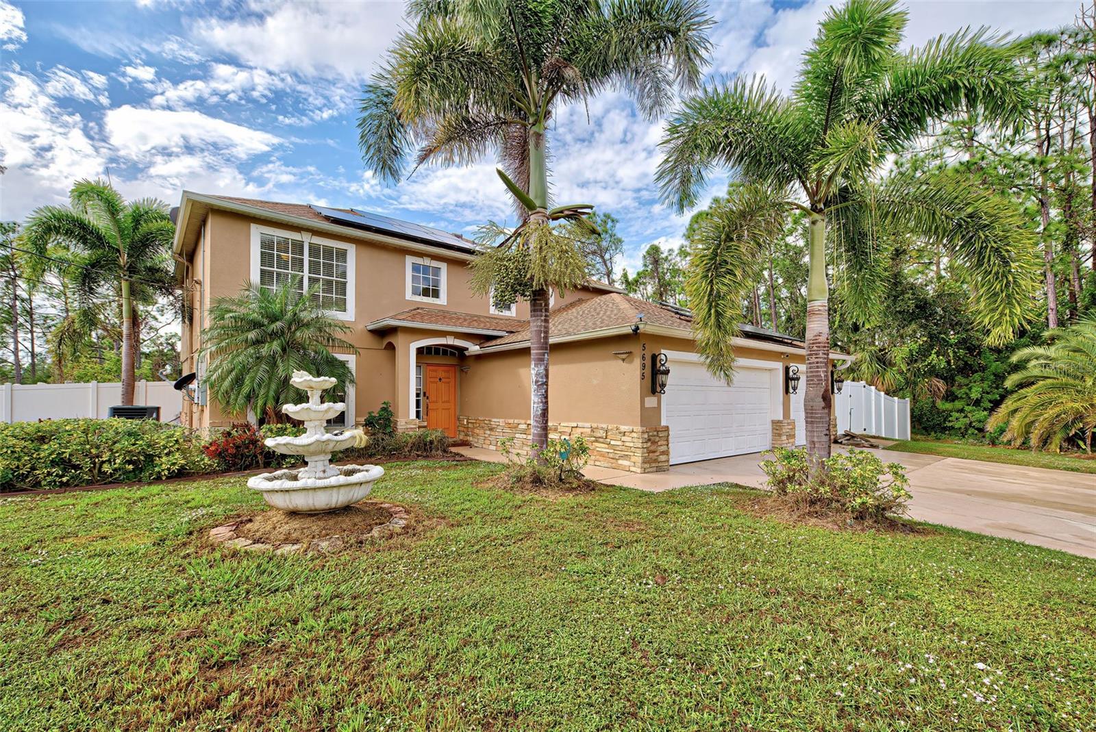 Here's a great chance to own a great 4-bedroom home with a 3-car garage is on an estate-sized .65-acre double lot. New solar electric system offers the potential for very low or no electric bills. THE ONE-YEAR-OLD ROOF, ensuring years of service and low insurance rates. 1000-gallon water reserve, providing ample water storage. An electric panel is prewired for a whole-house generator, adding convenience and peace of mind. Location and Community: Located in an X FLOOD ZONE, eliminating the need for flood insurance. NO HOA rules or fees, NO CDD FEES, or NO DEED RESTRICTIONS provide freedom and flexibility for your lifestyle without HOA hassles. Conveniently close to shopping and dining options, enhancing the overall lifestyle convenience. Interior Features: Well-appointed kitchen with stainless steel appliances, granite counters, pantry, and wood cabinets. The first floor includes a living room, full bathroom, den/study, guest bedroom, and mudroom adjacent to the garage. Second floor comprises the primary suite, two additional bedrooms with walk-in closets, and an open and airy loft. The primary master suite features dual vanities, a garden tub, and a separate shower and water closet. Upgrades include hurricane shutters, a new water pump, a newer conditioning system, and wood-tile floors in the bathrooms, mudroom, and second-floor laundry. Outdoor Spaces: Abundant outdoor areas include a second-floor deck offering prime views of the property, an open lanai off the kitchen, and an exceptionally spacious screened lanai. Given the large lot size, there is plenty of room for additional amenities such as a pool, shop, boat, RV, or garden. OVERALL: This property offers a perfect blend of modern amenities, energy efficiency, ample space, and freedom from restrictive regulations. With its desirable features, convenient location, and potential for customization, it appears to be a must-see gem in North Port. *** LEASE PURSHASE OPTION UP TO 12 MONTHS AT $4000 / MONTH WITH FIXED PURCHASE PRICE ***