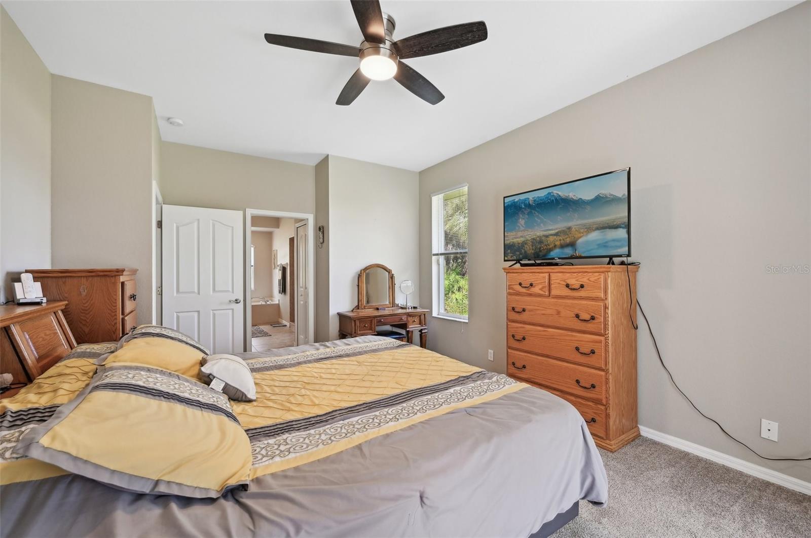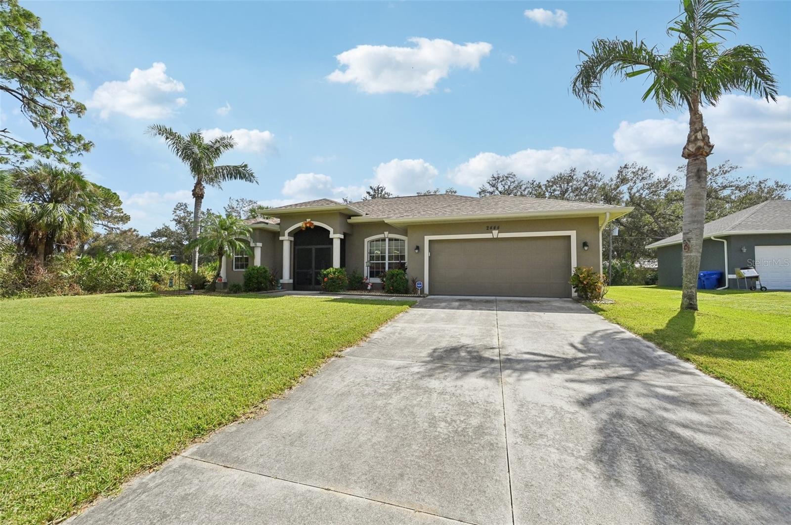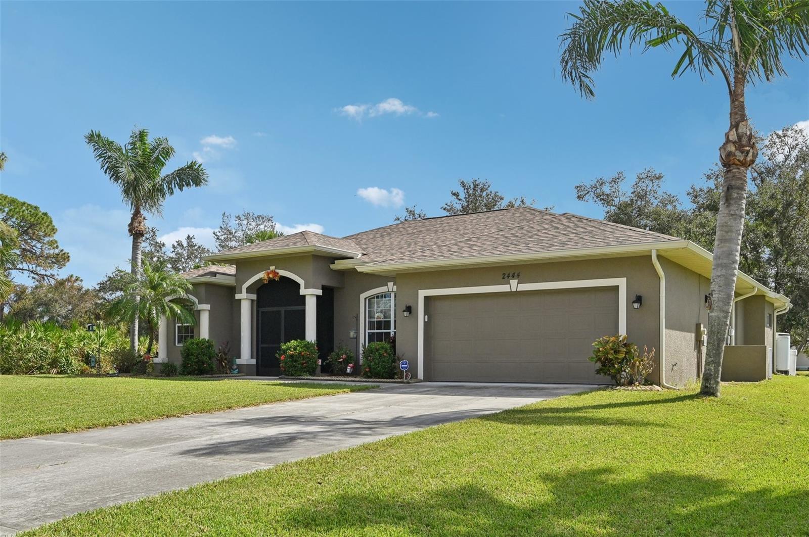 This charming 3-bedroom, 2-bath home, built in 2006, offers over 1,800 sq. ft. of comfortable living space with a 2-car garage. The interior boasts ceramic tile flooring throughout the main areas, with plush carpet in the bedrooms. At the front of the house, you'll find a formal living room and dining room, perfect for hosting guests. The spacious kitchen features white cabinetry, stainless steel appliances, a stainless sink, and a large breakfast bar. The home has a split bedroom floorplan for added privacy. The large primary bedroom includes two walk-in closets with built-in shelving, and sliding doors leading to the patio, offering a beautiful view of the private backyard. The primary bath is a luxurious retreat with a garden tub, walk-in shower, and dual sink vanity, along with decorative tile in the shower. The two guest bedrooms are spacious, each with large closets and ceiling fans. The guest bathroom offers a tub/shower combination. Recent upgrades include a new roof and gutters in 2024, new appliances in 2024, and a new water heater installed in 2023. The home also features an inside utility room with built-in cabinetry, a water chlorinator system, and professional landscaping with a sprinkler system. Conveniently located just minutes from I-75, this home offers easy access for commuters, with shopping, schools, and dining just a short drive away. Plus, the sandy white beaches are only 20 minutes from this ideal location!