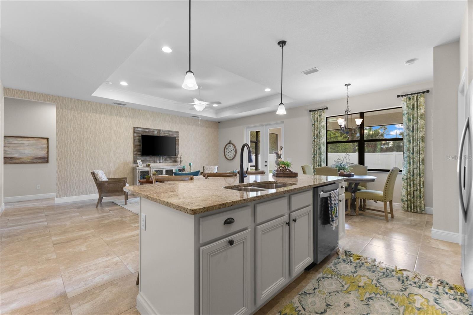FULLY FURNISHED, professionally designed, and upgraded builders 1683 model home for sale. 3/2 + DEN! X FLOOD ZONE, CITY WATER! This meticulously designed home offers a combination of comfort, style, and functionality. This split floor plan features 3 large bedrooms, 2 full baths, and a large private office/den with french doors leading to a large covered and screened lanai. Every room of the home is filled with natural light. Upon entering you will be greeted by tall 9'4 ceilings throughout creating an open and airy ambience throughout the home. The thoughtfully designed layout maximizes every square foot, ensuring a seamless flow from room to room. The living room and primary suite feature beautiful tray ceilings with crown molding. The open concept living room fully opens up to the back with french doors that leads to a beautiful backyard. The lovely kitchen is perfect for entertaining as the island overlooks the living room. The kitchen offers a large pantry, built in garbage cans, granite counters, stainless steel appliances, soft close cabinets, and a large deep sink. The primary suite is a private retreat! Enjoy separate vanities, a private toilet, HUGE walk in closet, and fully tiled shower. The guest rooms are both large bedrooms with ceiling fans and ample closet space. The home is fully tiled throughout. The large garage comes equipped with a garage door opener and keypad for easy entry. In addition the garage door is a 9 foot door so you can fit your larger vehicles and equipment. Located in a very desirable area in North Port, you will find shopping, dining, and schools all within minutes. Just a short drive to many golf courses, beaches, and all of the endless attractions that Florida has to offer.