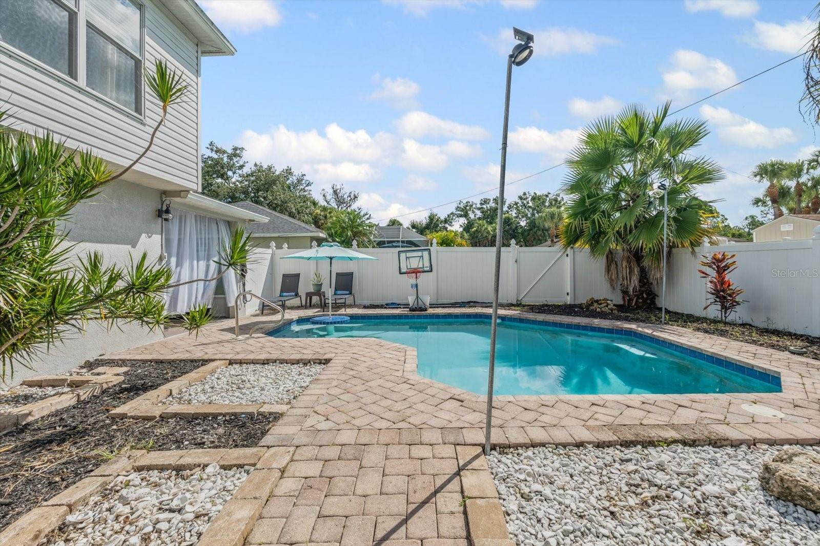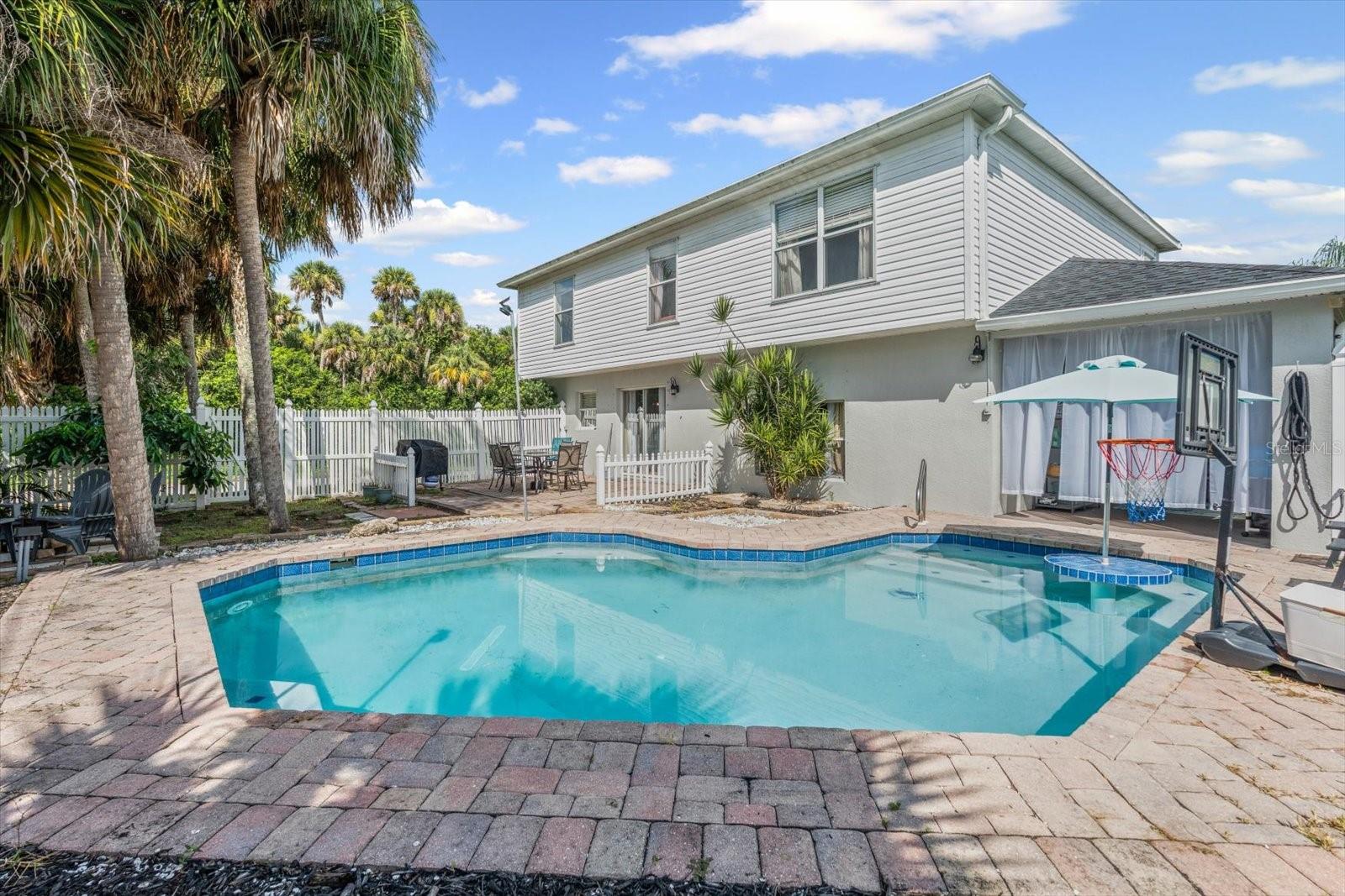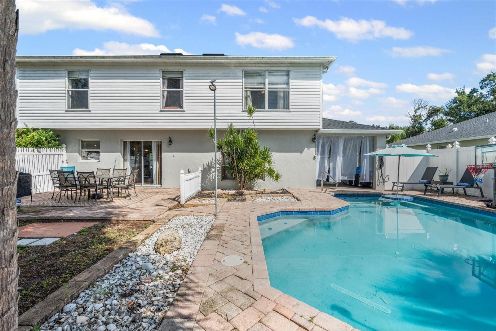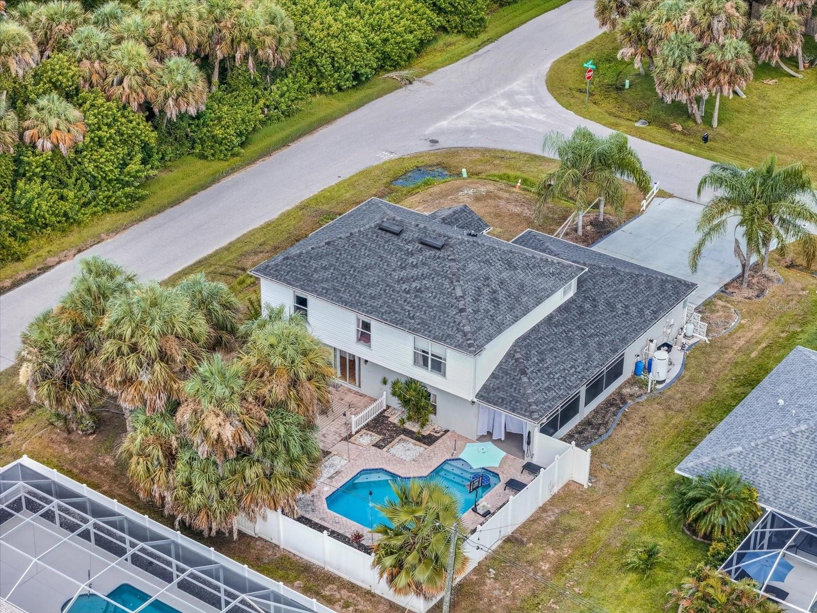 Discover an exceptional blend of style, function, and comfort in this move-in-ready 5-bedroom, 2.5-bathroom home. Spanning 2,248 square feet, this coveted corner lot property has been thoughtfully upgraded with major systems and finishes, offering a truly turn-key experience. Throughout the home, you'll find elegant luxury vinyl plank flooring, with durable laminate in the bathrooms. The heart of the home is the updated kitchen, boasting sleek LG appliances, beautiful quartz countertops, an undermount sink, and a garbage disposal. A convenient pantry provides ample storage. The kitchen opens up to a separate living room, perfect for casual gatherings, while the main family room offers a cozy space to relax by the warmth of an electric fireplace. The first floor also features a powder room, a bedroom, and a dedicated laundry room with new LG washer and dryer appliances. Upstairs, the spacious primary suite is a true retreat, featuring large his-and-hers walk-in closets and a private ensuite bathroom. Three more bedrooms with sizable closet space and an additional full bathroom complete the second floor. Previously a 3-car garage, one of the bays has been cleverly converted into a flexible office space, perfect for remote work or a home gym, still leaving a two-car garage with plenty of room for storage and organization. Step outside into your private backyard paradise, fully fenced for privacy and security. The in-ground pool (2015) includes a unique in-pool table and umbrella—the perfect spot for summer gatherings. For added peace of mind, the home is equipped with hurricane shutters. The property also features a well for irrigation and a water softening system (2019), enhancing daily convenience. Major system upgrades include a new roof and AC unit (both 2022). Situated in Flood Zone X, this property does not require flood insurance, making it an even more attractive investment. Located in a welcoming, no-HOA neighborhood, this home offers the freedom to live without restrictions. Cranberry Elementary, an A+ rated school, is just a short stroll away. Don’t miss the opportunity to make this beautiful property your new home. Schedule your private showing today!