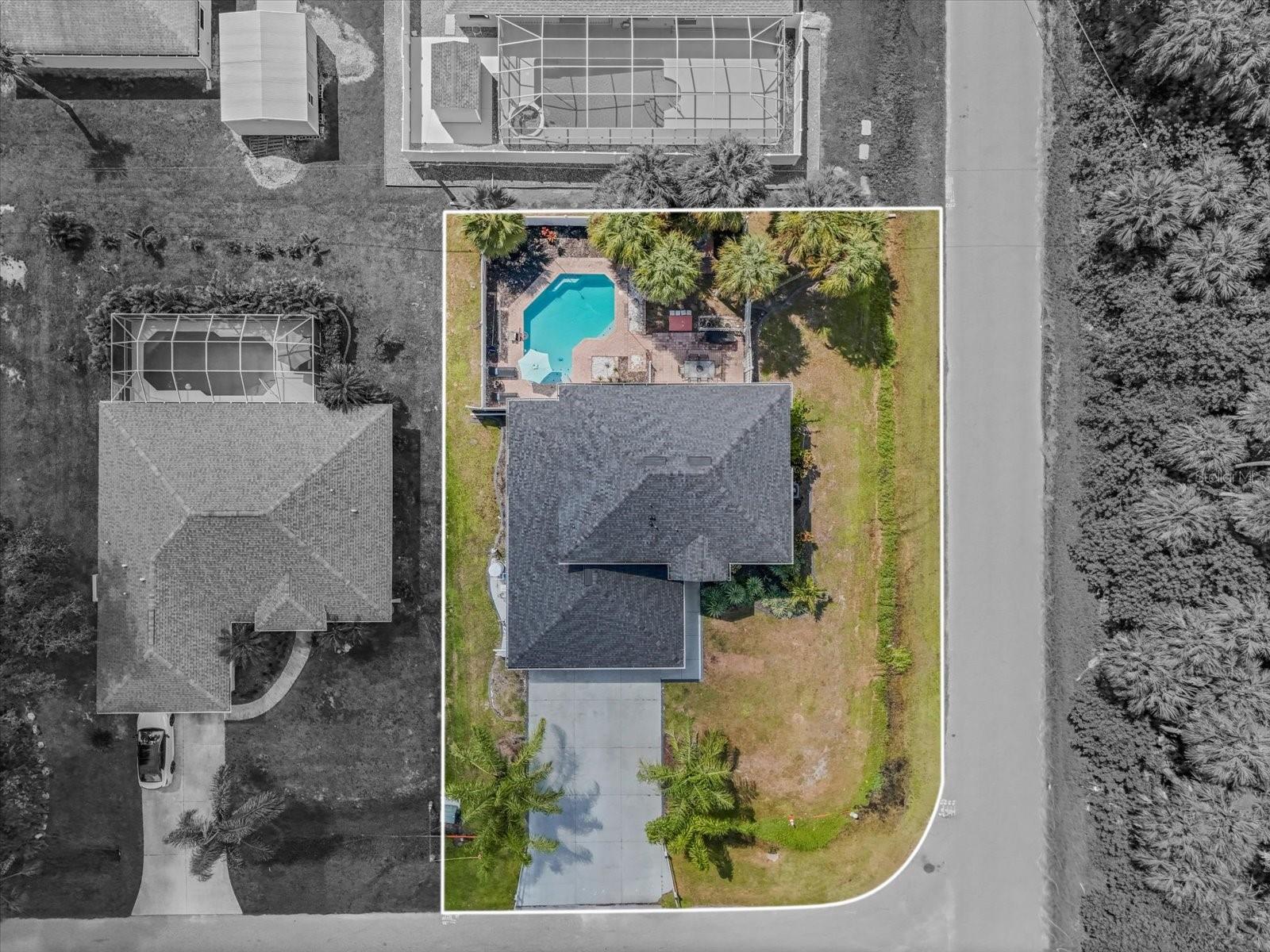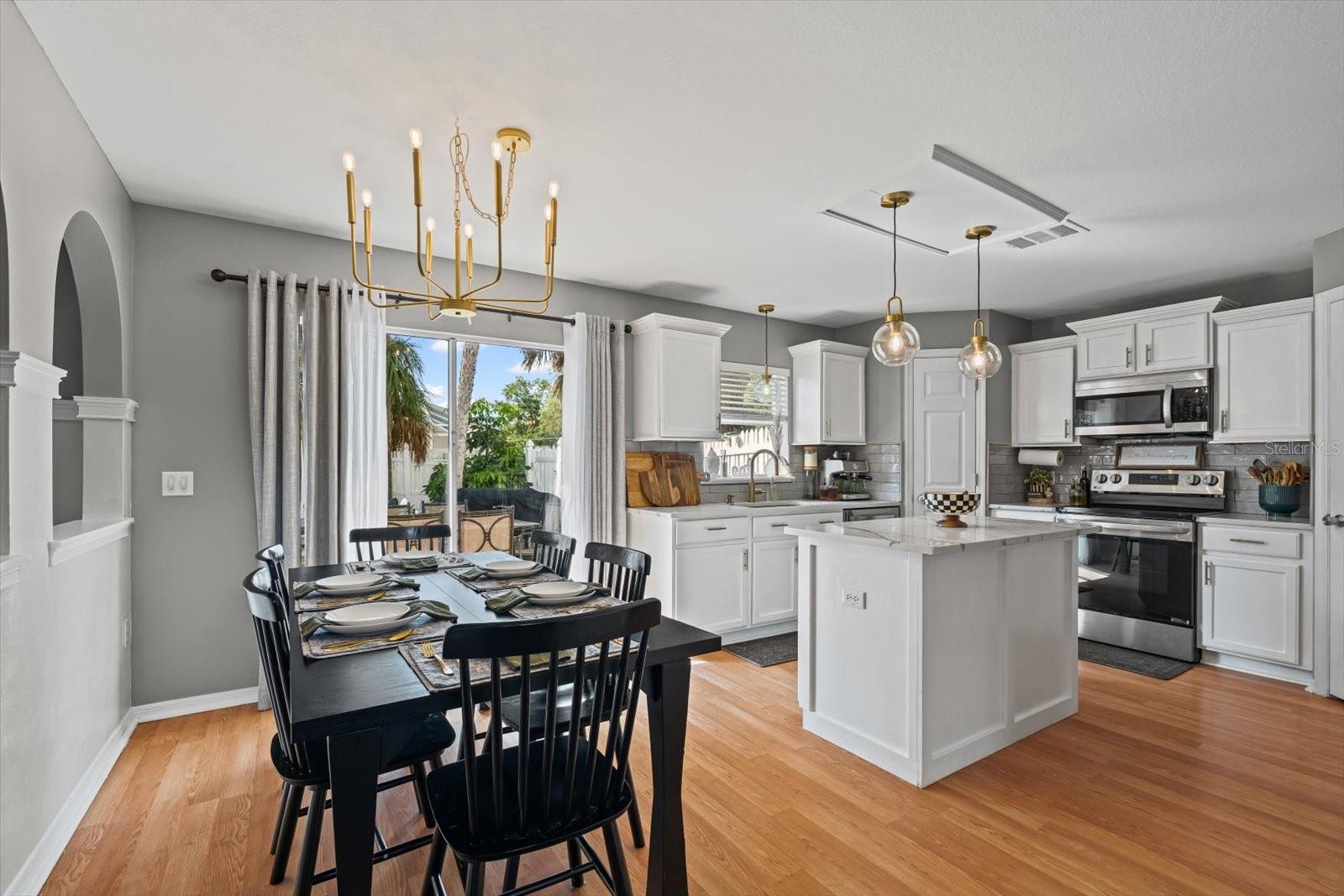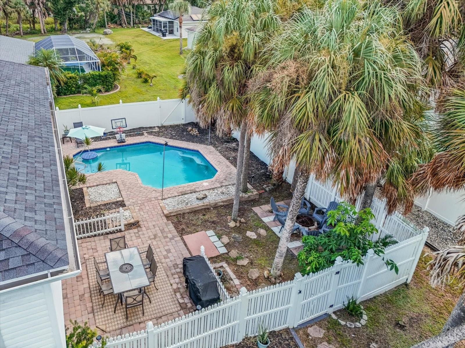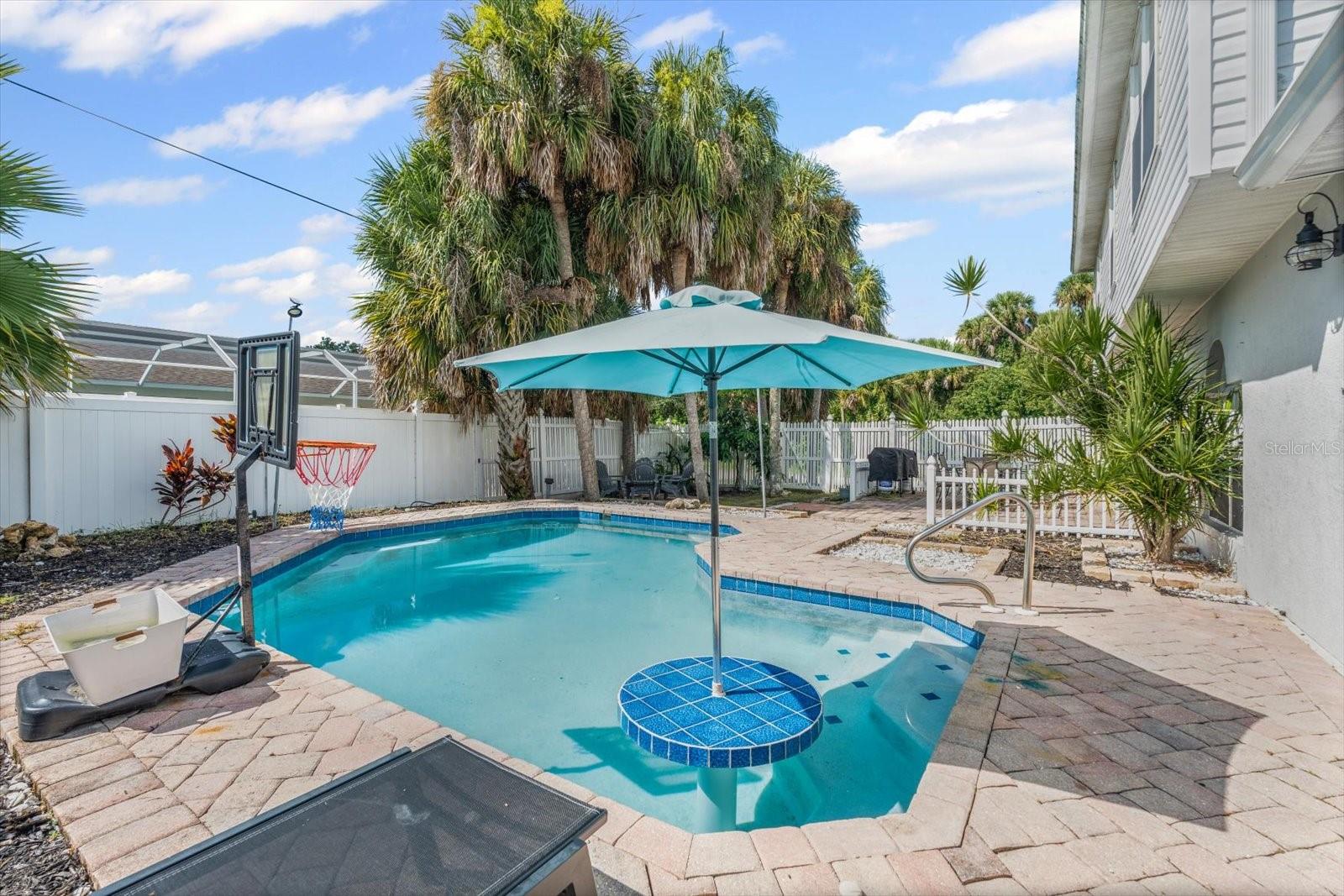 Discover an exceptional blend of style, function, and comfort in this move-in-ready 5-bedroom, 2.5-bathroom home. Spanning 2,248 square feet, this coveted corner lot property has been thoughtfully upgraded with major systems and finishes, offering a truly turn-key experience. Throughout the home, you'll find elegant luxury vinyl plank flooring, with durable laminate in the bathrooms. The heart of the home is the updated kitchen, boasting sleek LG appliances, beautiful quartz countertops, an undermount sink, and a garbage disposal. A convenient pantry provides ample storage. The kitchen opens up to a separate living room, perfect for casual gatherings, while the main family room offers a cozy space to relax by the warmth of an electric fireplace. The first floor also features a powder room, a bedroom, and a dedicated laundry room with new LG washer and dryer appliances. Upstairs, the spacious primary suite is a true retreat, featuring large his-and-hers walk-in closets and a private ensuite bathroom. Three more bedrooms with sizable closet space and an additional full bathroom complete the second floor. Previously a 3-car garage, one of the bays has been cleverly converted into a flexible office space, perfect for remote work or a home gym, still leaving a two-car garage with plenty of room for storage and organization. Step outside into your private backyard paradise, fully fenced for privacy and security. The in-ground pool (2015) includes a unique in-pool table and umbrella—the perfect spot for summer gatherings. For added peace of mind, the home is equipped with hurricane shutters. The property also features a well for irrigation and a water softening system (2019), enhancing daily convenience. Major system upgrades include a new roof and AC unit (both 2022). Situated in Flood Zone X, this property does not require flood insurance, making it an even more attractive investment. Located in a welcoming, no-HOA neighborhood, this home offers the freedom to live without restrictions. Cranberry Elementary, an A+ rated school, is just a short stroll away. Don’t miss the opportunity to make this beautiful property your new home. Schedule your private showing today!