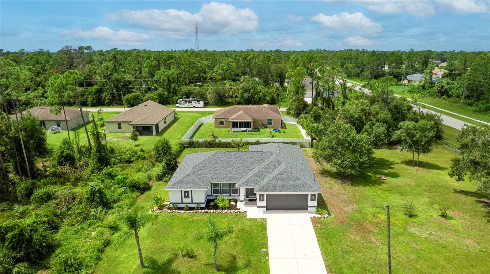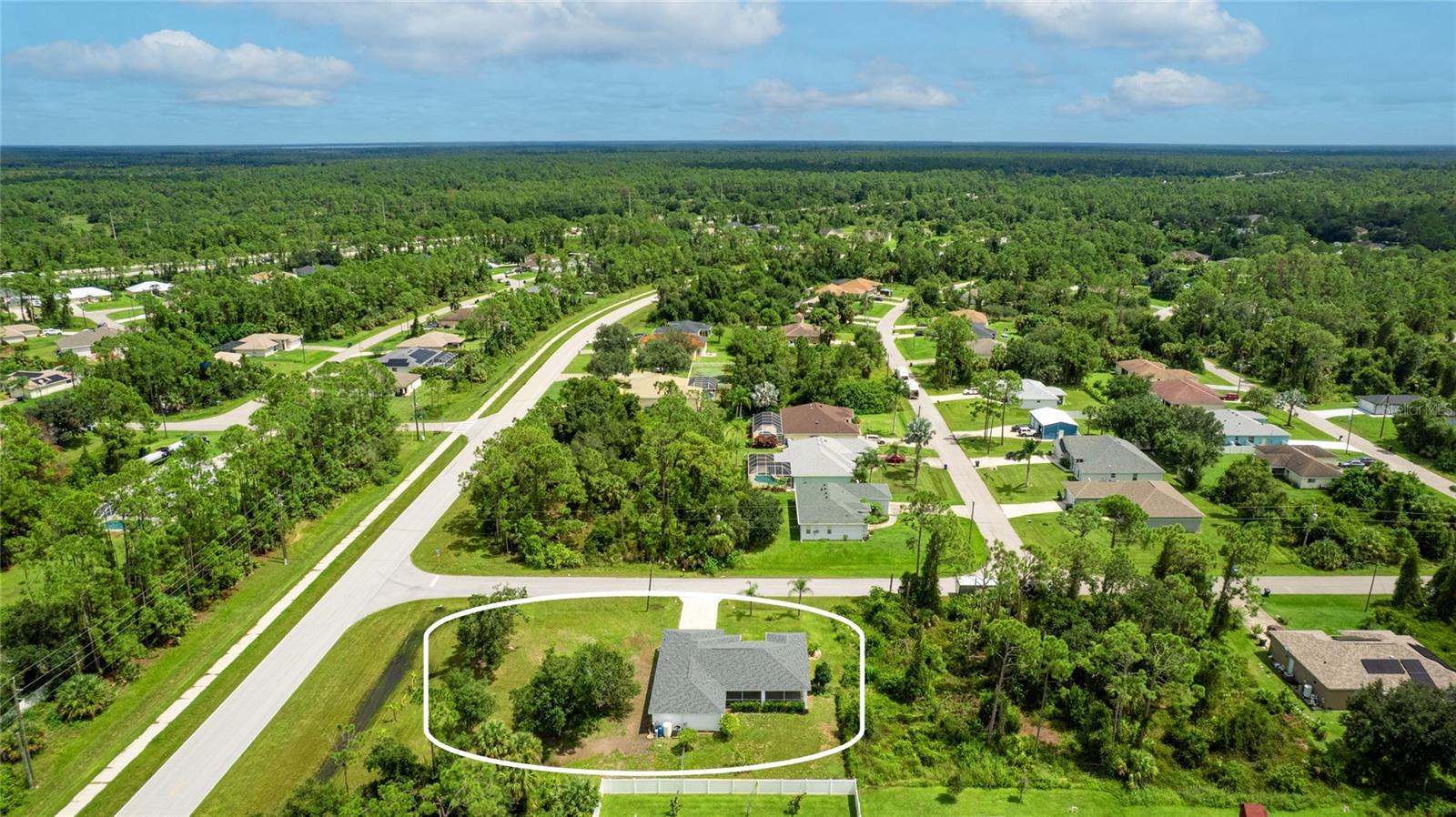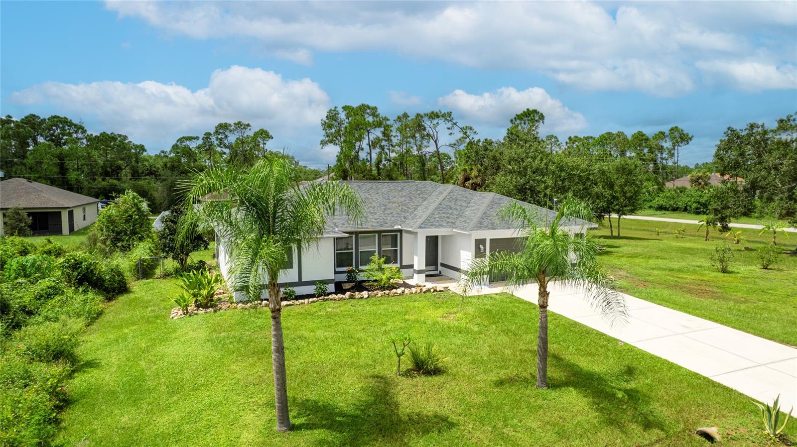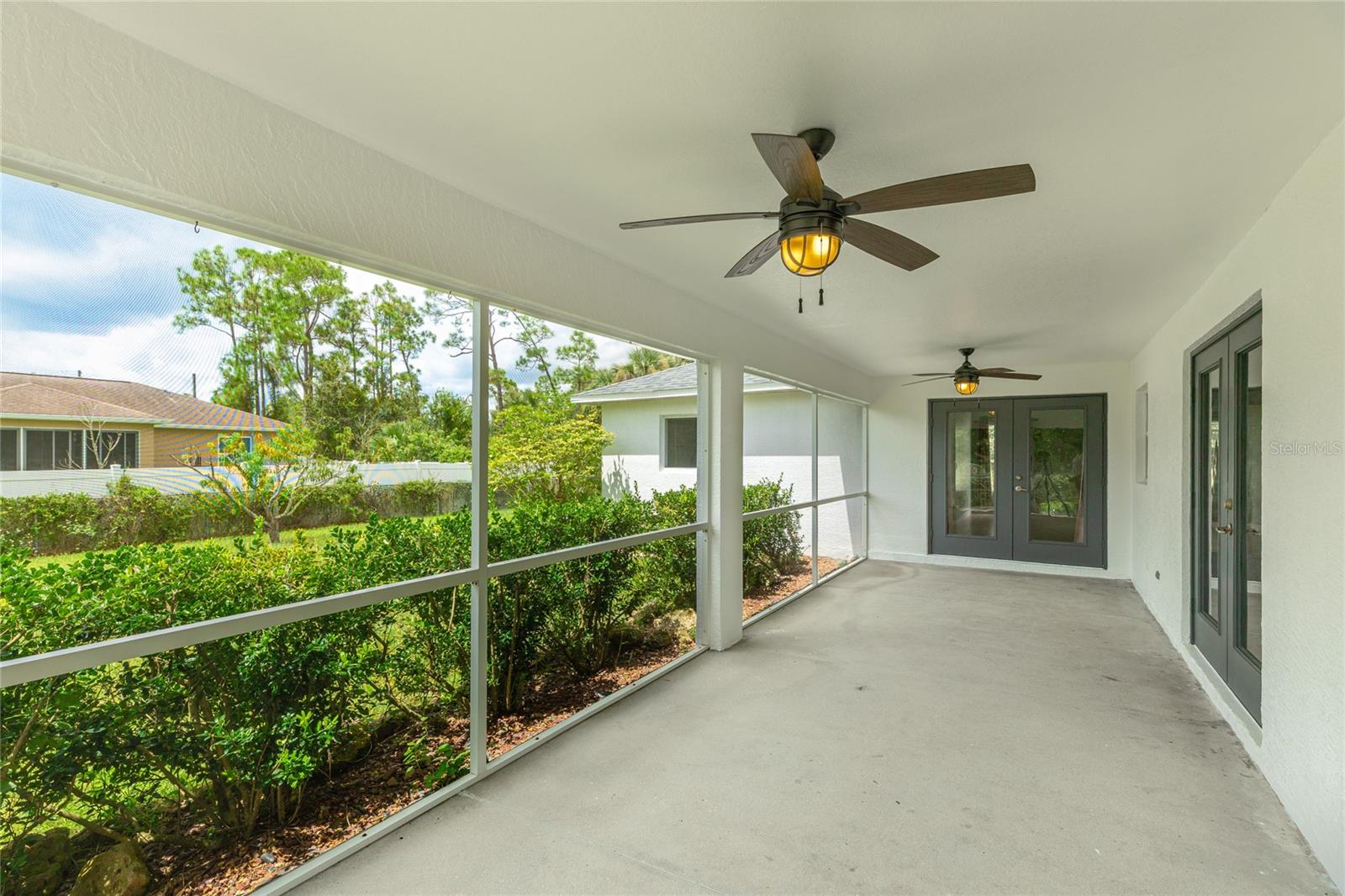 One or more photo(s) has been virtually staged. Set on a rare .51-acre corner lot, this updated 3 bedroom, 2 bathroom home offers just over 1,700 sq ft of move-in ready living with plenty of space to enjoy inside and out. The oversized lot provides privacy, mature oak trees, and fruit trees including peach, banana, and strawberry guava, along with a Moringa tree, all supported by an updated irrigation system with new sprinkler heads. Inside, cathedral and tray ceilings, fresh baseboards, and abundant natural light highlight the thoughtfully designed split floor plan. The central kitchen features refreshed cabinetry, counters, and a pantry, opening seamlessly to both the living and family rooms. The private primary suite includes dual closets, one a walk-in with built-in shelving, and a remodeled ensuite bath with a beautifully tiled walk-in shower. Two additional bedrooms also offer walk-in closets, and the second bathroom has been updated with modern finishes. French doors in multiple rooms lead to an expansive screened lanai with concrete columns and ceiling fans, creating a perfect retreat for year-round outdoor living. Additional features include porcelain tile flooring, a laundry room, and ceiling fans in every room. Major improvements include a new roof in 2023 and a new AC in 2022, giving added peace of mind. Conveniently located near schools, shopping, dining, Myakkahatchee Environmental Park, the North Port Aquatic Center, Charlotte Sports Park, and a short drive to Gulf beaches. **THIS PROPERTY QUALIFIES FOR A 1% LENDER INCENTIVE IF USING PREFERRED LENDER. INQUIRE FOR MORE DETAILS.**