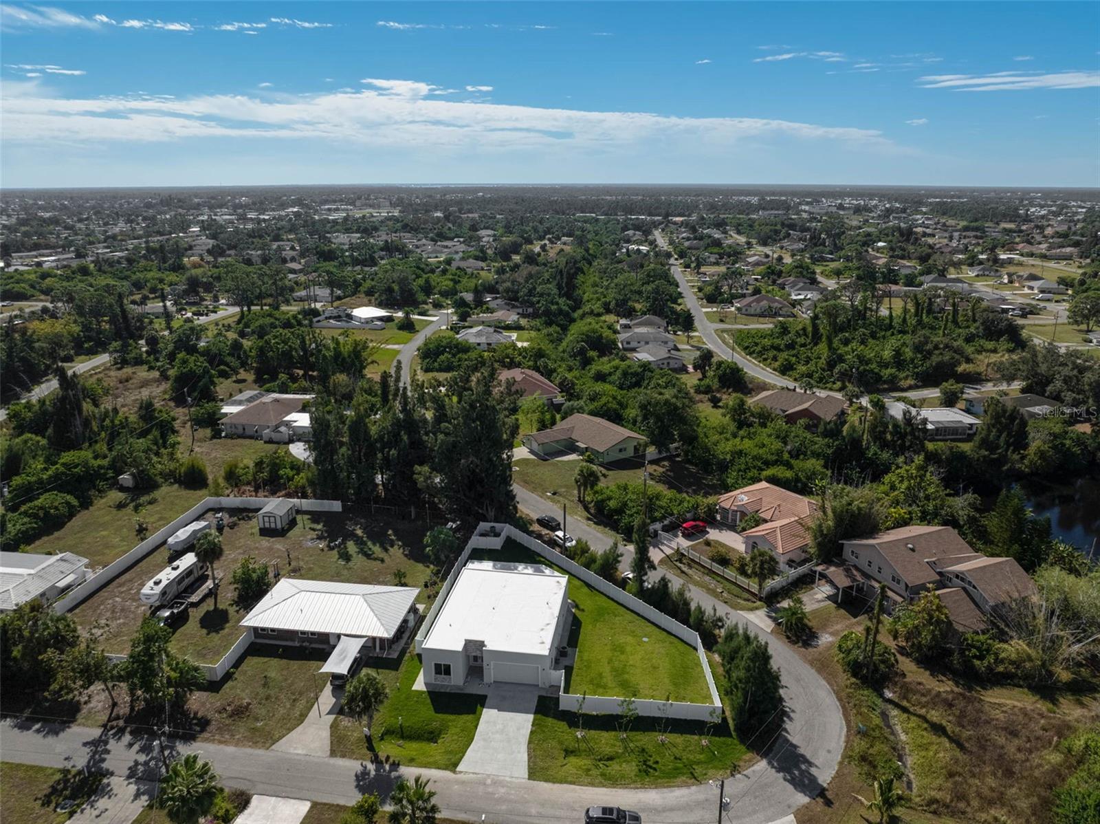Stunning 2025-Built Modern Home – Energy Efficient & Hurricane Ready Discover cutting-edge design and peace of mind in this newly constructed modern custom home featuring a sleek flat roof engineered for durability, enhanced wind resistance, and long-lasting performance. Located in a X flood zone, this residence is equipped with HURRICANE RATED WINDOWS, providing superior protection and energy efficiency. This home also features a french drain system designed to efficiently redirect groundwater and prevent flooding, ensuring a dry foundation and well-drained landscaping year-round. Step inside to soaring 10-foot ceilings, striking 9-foot double front doors, and elegant custom modern lighting throughout. The open-concept living area showcases luxury vinyl flooring and a spacious chef-inspired kitchen with quartz countertops, a large island, walk-in pantry, and upscale stainless steel appliances—including a hood vent above the stove. A new washer and dryer are also included for added convenience. The thoughtfully designed split floor plan offers 3 bedrooms and 2 bathrooms, featuring double sinks in both baths. The guest bath includes a large soaking tub, while the primary suite boasts a walk-in closet, large walk-in shower, and contemporary finishes. You’ll love the ample storage found throughout the home. Enjoy Florida indoor-outdoor living on the large screened-in lanai and benefit from an oversized, finished 2-car garage. The property is fully fenced with a 6-foot vinyl privacy fence and features a sprinkler system with fresh sod in both front and back yards. Nearby Warm Mineral Springs with its year around 85 F water offers a therapeutic, relaxing experience. A standout upgrade is the whole-house reverse osmosis water system—dual membrane filtration removes salt and chlorine prior to entry into the home, producing up to 4,000 gallons of purified water per day. Move-in ready with modern comforts, storm security, and elevated style—this is the home you’ve been waiting for!