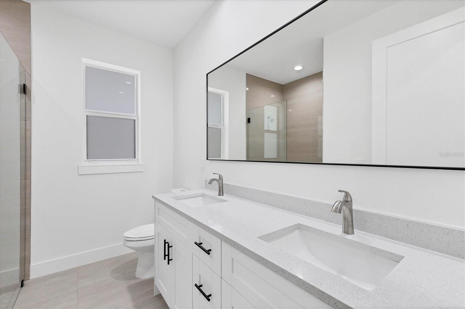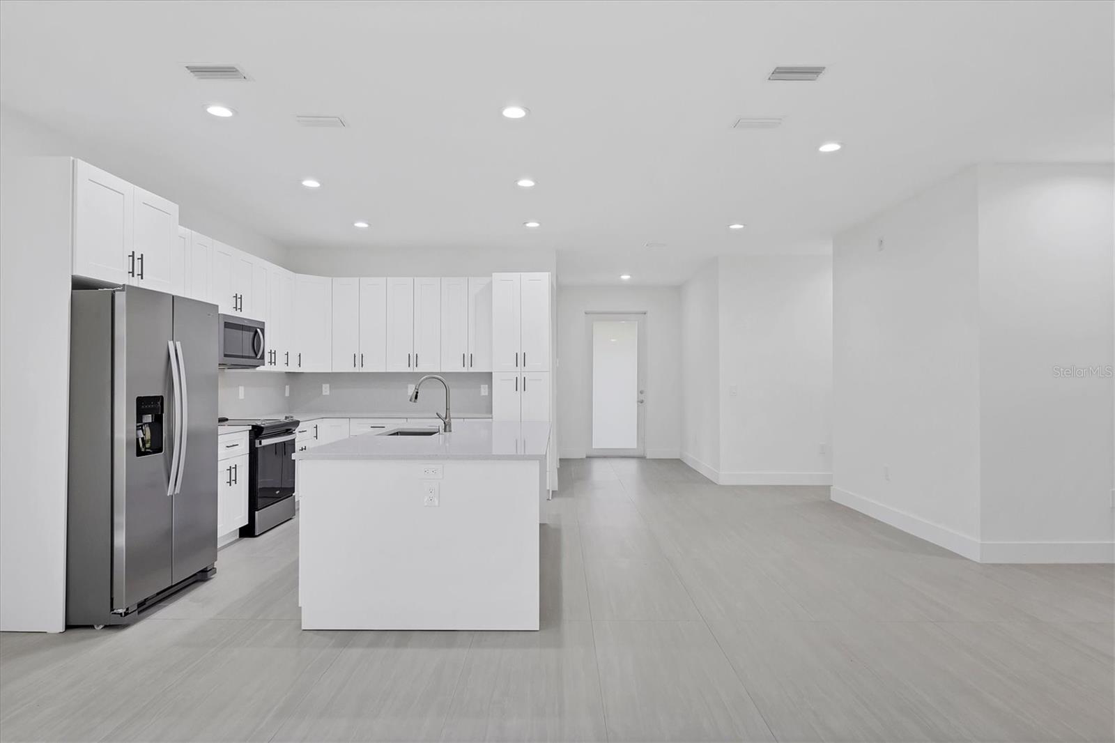 One or more photo(s) has been virtually staged. THIS PROPERTY QUALIFIES FOR A 1% LENDER INCENTIVE IF USING OUR PREFERRED LENDER! Discover unparalleled elegance and affordability in this stunning 2025-built 3-bedroom, 2-bathroom modern residence of 2,374 SF when you add the covered porch and lanai, perfectly positioned in a highly desirable North Port neighborhood with no HOA fees and no flood zone requirements. Boasting hurricane-rated impact windows and doors throughout, a whole-house gutter system, and an efficient irrigation setup, this energy-saving home combines superior safety features and utility savings, all backed by a 1-year builder craftsmanship warranty. Step through the elegant full-view frosted impact-glass entry door onto a charming tiled front porch, ideal for welcoming neighbors, and into a light-filled foyer complete with a coat closet. Sleek 24x48 tile flooring flows seamlessly across every room, complemented by soaring 9’-4” ceilings, tall 8-foot interior doors, 6-inch modern baseboards, and smooth flat walls. The heart of the home is a sophisticated open- concept gourmet kitchen equipped with premium Whirlpool stainless steel appliances, soft-close wood cabinetry featuring 42-inch uppers and a convenient lazy Susan, sparkling quartz countertops paired with a matching backsplash, and a generous eat-in island that anchors the spacious living and dining areas. Entertain effortlessly as impact-rated sliding glass doors open to an expansive 24’ x 11.5’ covered, tiled lanai overlooking a serene, tree-filled tropical backyard framed by mature landscaping. Each bedroom is appointed with custom closet organizers, while the luxurious primary suite impresses with a large walk-in closet featuring a premium organization system and a spa-like en-suite bath showcasing dual quartz vanities, a glass-enclosed tiled walk-in shower, a dual-flush toilet, and a privacy-glass window. The guest bathroom echoes this refined style with matching quartz finishes and a modern glass walk-in shower. Ideally located just minutes from Town Center Mall’s shopping, dining, and movie theater, top-rated Sarasota County schools (Atwater Elementary, Woodland Middle, North Port High), two community pools, the expansive North Port Aquatic Center with its lazy river and slides, and Centennial Park’s fitness facilities, sports fields, and trails. Enjoy quick access to Warm Mineral Springs, Peace River, Charlotte Harbor’s boating canals, Wellen Park’s vibrant restaurants and concerts, Fishermen’s Village, CoolToday Park (home of the Atlanta Braves spring training), I-75, and pristine Gulf beaches in Venice or Englewood—all within 30 minutes. This move-in-ready masterpiece delivers exceptional quality craftsmanship and contemporary Florida living at its finest! Some photos virtually staged.