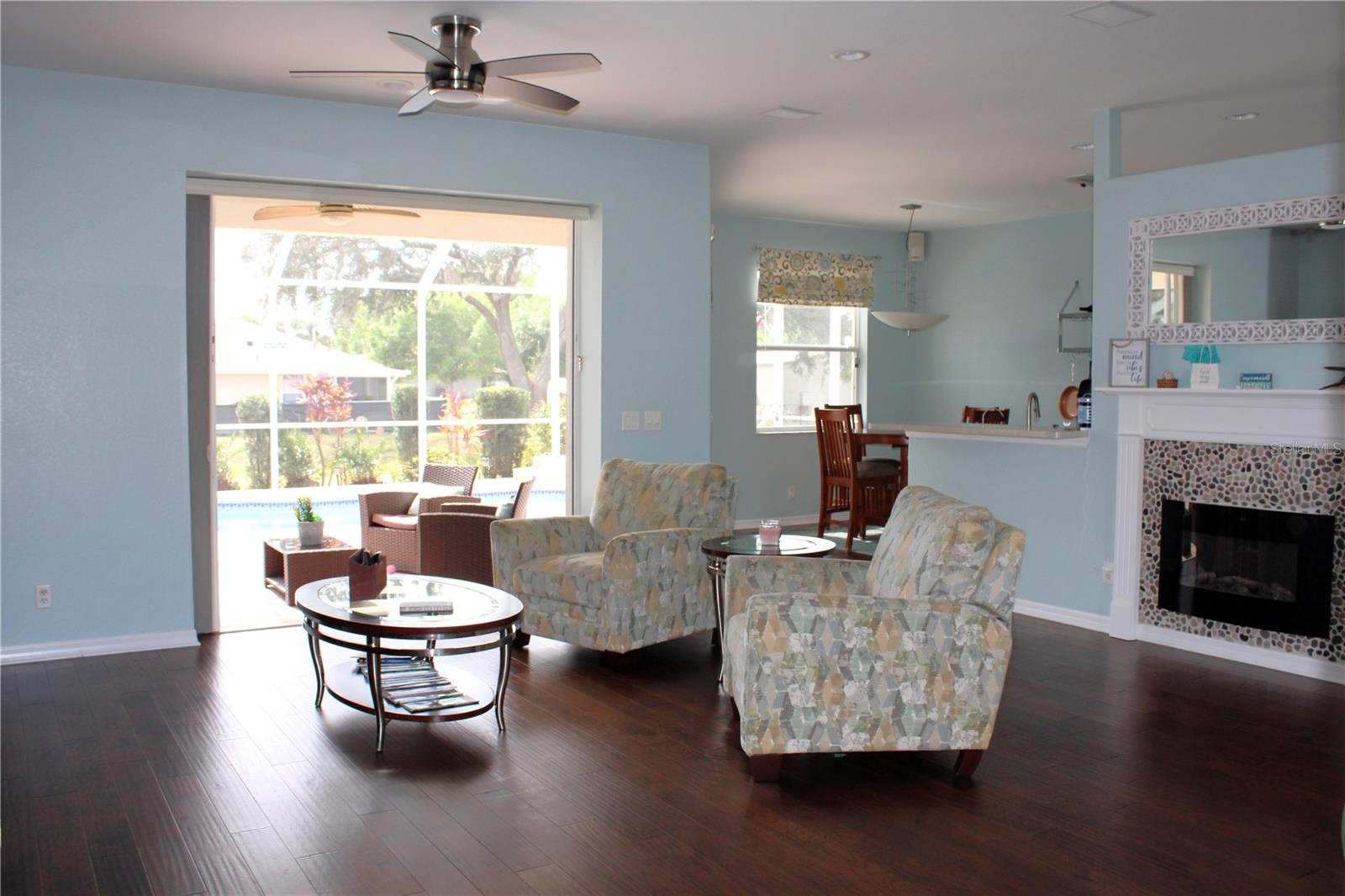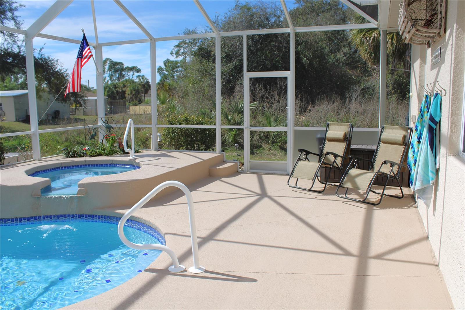 Improved Pricing! So welcome to your high and dry, no Flood zone and EVERYTHING included, 2005 Pool/Spa home! Sold TURNKEY, this meticulously maintained property includes everything inside and outside from pool chairs to the Motion perfect serta adjustable bases in bedrooms 2 and 3 with remote controls. The ONLY excluded items are in the garage and closets, ensuring a seamless transition for the lucky new owner. Looking for more space? The greenbelt lot next door can be purchased seperatly if you have the need for your toys or shed, extra garage, garden, Play area or just for the privacy. There is the option to have a brand-new roof installed PRIOR to closing. If you choose this upgrade, the price of the additional (your choice) roofing will be added to the final purchase price.This option allows you to Purchase the home within the guidlines of FHA or Va lending and allowing you to enjoy the peace of mind that comes with a newly installed roof, ensuring the property is in top condition for years to come! Home has impact windows, 9.3-foot ceilings, and an electric heat-producing fireplace, creating a warm and inviting atmosphere for our occaisional chilly days. Step through the pocket sliding doors leading to the impressive lanai, which extends the full length of the house. The covered seating area flows into the BBQ/kitchen space with granite countertops, a refrigerator, Grill and side burners which is perfect for watching your favorite sports on the outside TV and entertaining guests year-round. Additionally, there's an additional Trex deck outside the lanai, providing even more space for outdoor seating or grilling. Love to float the days stress away? Take a dip in the heated or chilled saltwater POOL/SPA with existing floating pool chairs and loungers for sun and relaxing, all while listening to the soothing sounds of the waterfall. Both the master suite, living and dining area feature sliding doors overlooking the pool area, offering views and easy access to outdoor living. The master suite provides a serene retreat, a spacious walk-in closet and bathroom. The laundry room is equipped with all the essentials, including a utility tub, cabinets, and a large pantry, along with a washer and dryer. Additional features include an extra refrigerator and storage cabinets in the garage. There are lots of additional extra features inside and out, so don't miss this opportunity to own a slice of paradise - schedule a showing today and experience the epitome of Florida living!