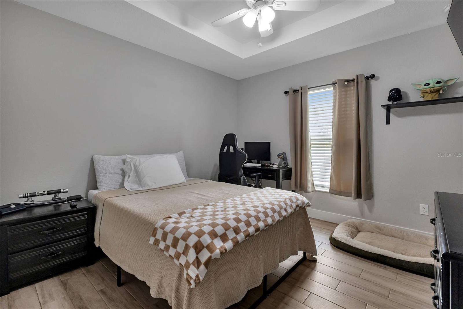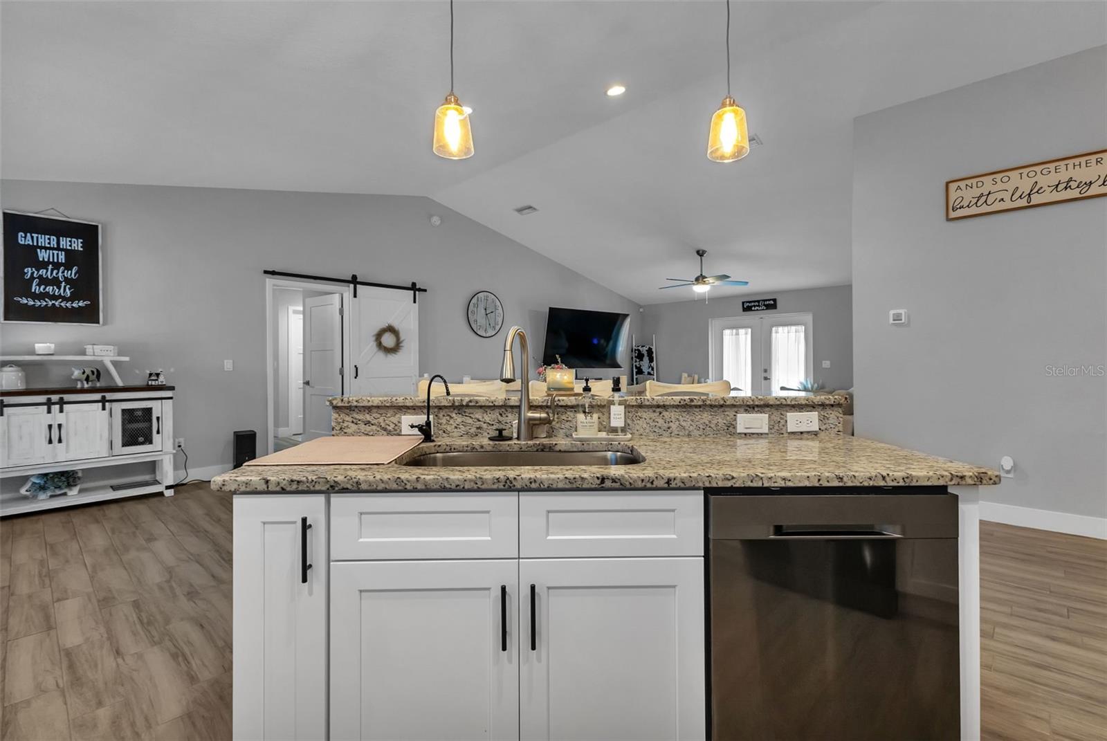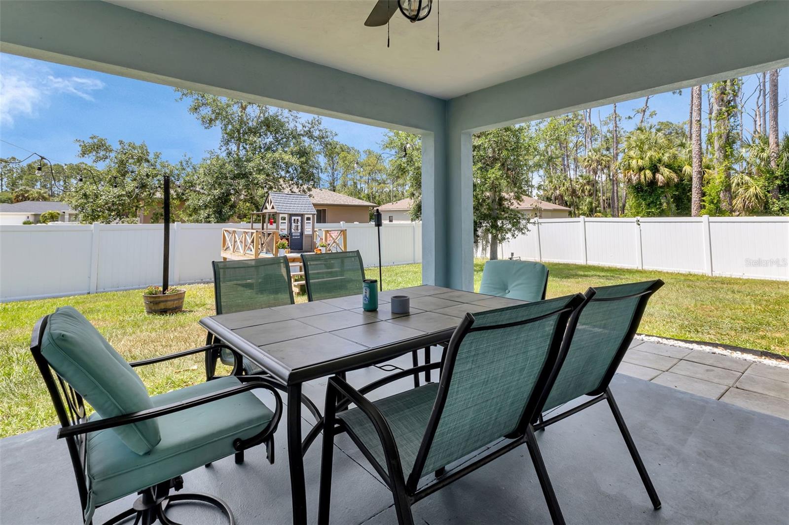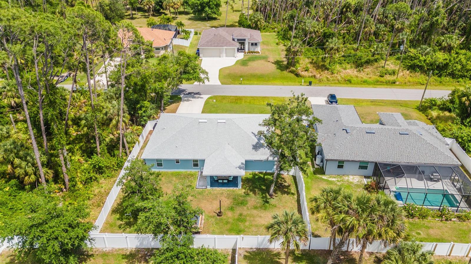 Welcome to your dream home! This custom-built beauty, constructed in 2020, offers the epitome of modern comfort and luxury. Situated on a spacious lot, this 3 bed, 2 bath, 2 car garage home boasts 1,842 square feet under air, providing ample space for gracious living. As you step inside, you'll be greeted by plank tile flooring that seamlessly flows throughout the entire home, creating a sleek and contemporary ambiance. The heart of the home is the stunning kitchen, adorned with granite countertops, upgraded stainless steel appliances, and an expansive island perfect for culinary endeavors. The open floor plan effortlessly connects the great room, dining area, and kitchen, making entertaining a breeze. The master suite is a true sanctuary, occupying the entire left side of the home for ultimate privacy. Here, you'll find his and her walk-in closets, his and her granite vanities, a fully tiled his & her walk-thru shower, a luxurious freestanding tub, and a private toilet area. Coffered ceilings add a touch of elegance, while French doors in the great room lead to the rear lanai, inviting indoor-outdoor living. Outside, a vinyl fence encloses the property, offering privacy and security. Upgraded hurricane impact french doors and windows add a touch of worry-free during hurricane season. Enjoy Florida living at its finest on the expansive front porch, stretching 60 feet in length, or relax on the rear lanai under a truss-engineered roof to grill and enjoy the sunsets. Two additional bedrooms feature coffered ceilings, ample closet space, and abundant natural light, making them ideal for family members or guests. The second bathroom boasts a walk-in shower and dual sinks and granite vanity, providing convenience and comfort for all. With its thoughtful design, high-end finishes, and thoughtful layout, this home offers a perfect blend of style and functionality. Don't miss your chance to make this exquisite residence your own, schedule your showing now! Bedroom Closet Type: Walk-in Closet (Primary Bedroom).