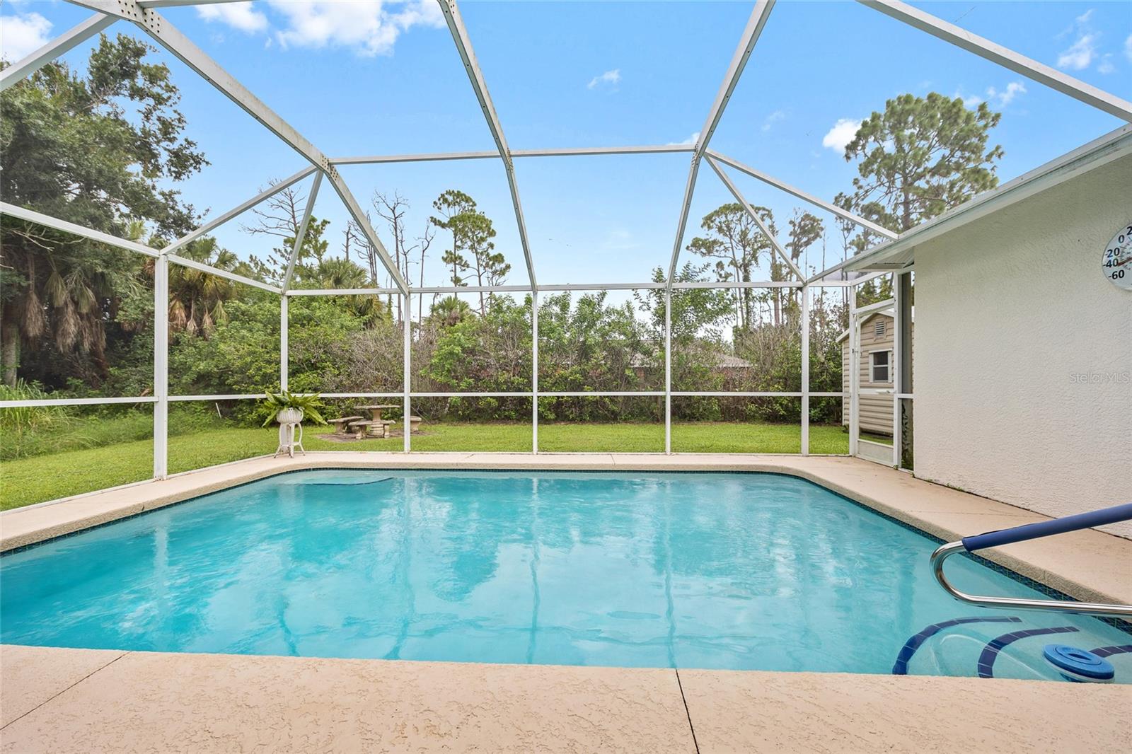 SELLER MOTIVATED! TRIPLE LOT! Beautiful 3 bedroom, 2 bath, 2-car garage pool home nestled in the middle of an OVERSIZED lot offering lots of privacy in North Port! Light and bright open floor plan features high ceilings, soothing colors, living room with triple glass pocketing slider to lanai bringing the outdoors in and ceramic tile flooring in main living area. The kitchen features ample cabinetry and counterspace, newer stainless appliances and breakfast bar. Primary bedroom boasts laminate flooring and updated bath with new vanity featuring dual bowl sinks and custom tiled shower with Rainshower head. Split floor plan allows for company to have their own space and access to pool through guest bath. Outdoor entertaining area features covered lanai, 17’ x 25’ screened pool overlooking large backyard with BBQ, firepit, and lots of room for games and furry friends to roam. Enjoy gorgeous SWFL sunsets with the northwestern exposure. Seller updates and additional features include brand new front door, new roof and water heater in 2022, new well pump, pool pump and water filtration system in 2024, just added ionic system to well, freshly painted interior, new ceiling lights and fans, new lanai screen, electric roll down storm screen for lanai, metal hurricane shutters, security system, automatic sprinkler system,12’ x 20’ shed with electric for extra storage, landscaped exterior and private lot with very few neighbors. Great location with easy access to I-75, restaurants, shopping, schools, parks, golf and a short drive to Venice beaches plus fishing and boating on the Myakka River. Don’t miss this opportunity to make this home your new permanent residence or Florida retreat. Schedule your private showing today!