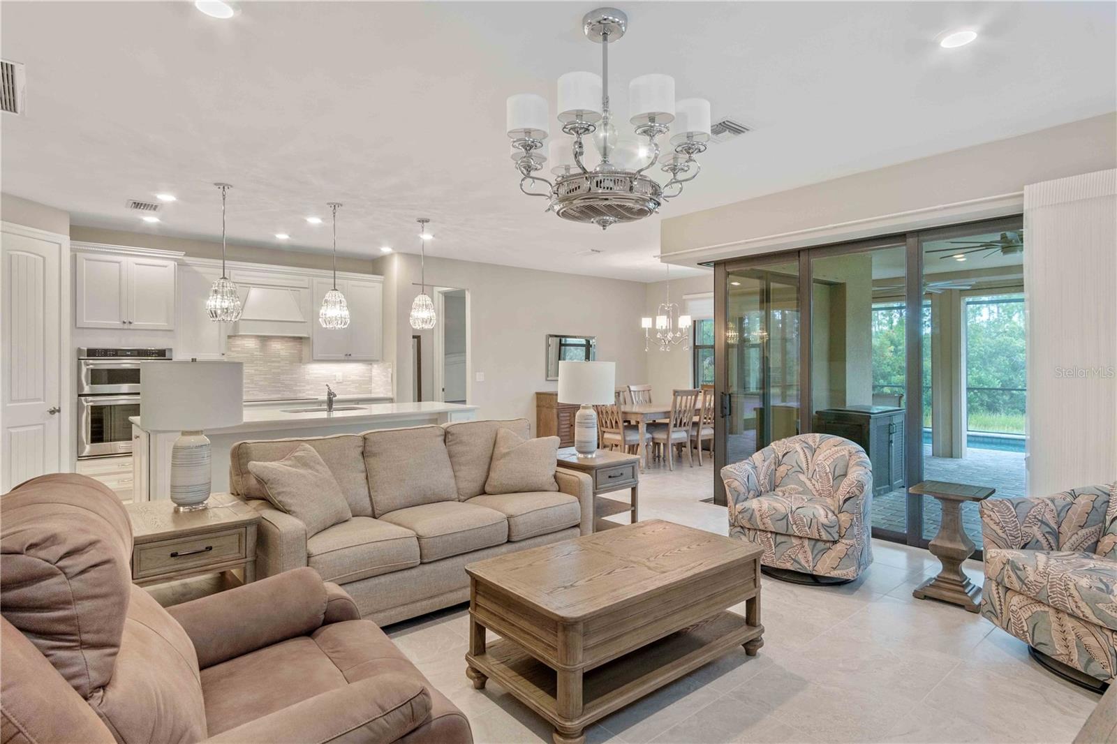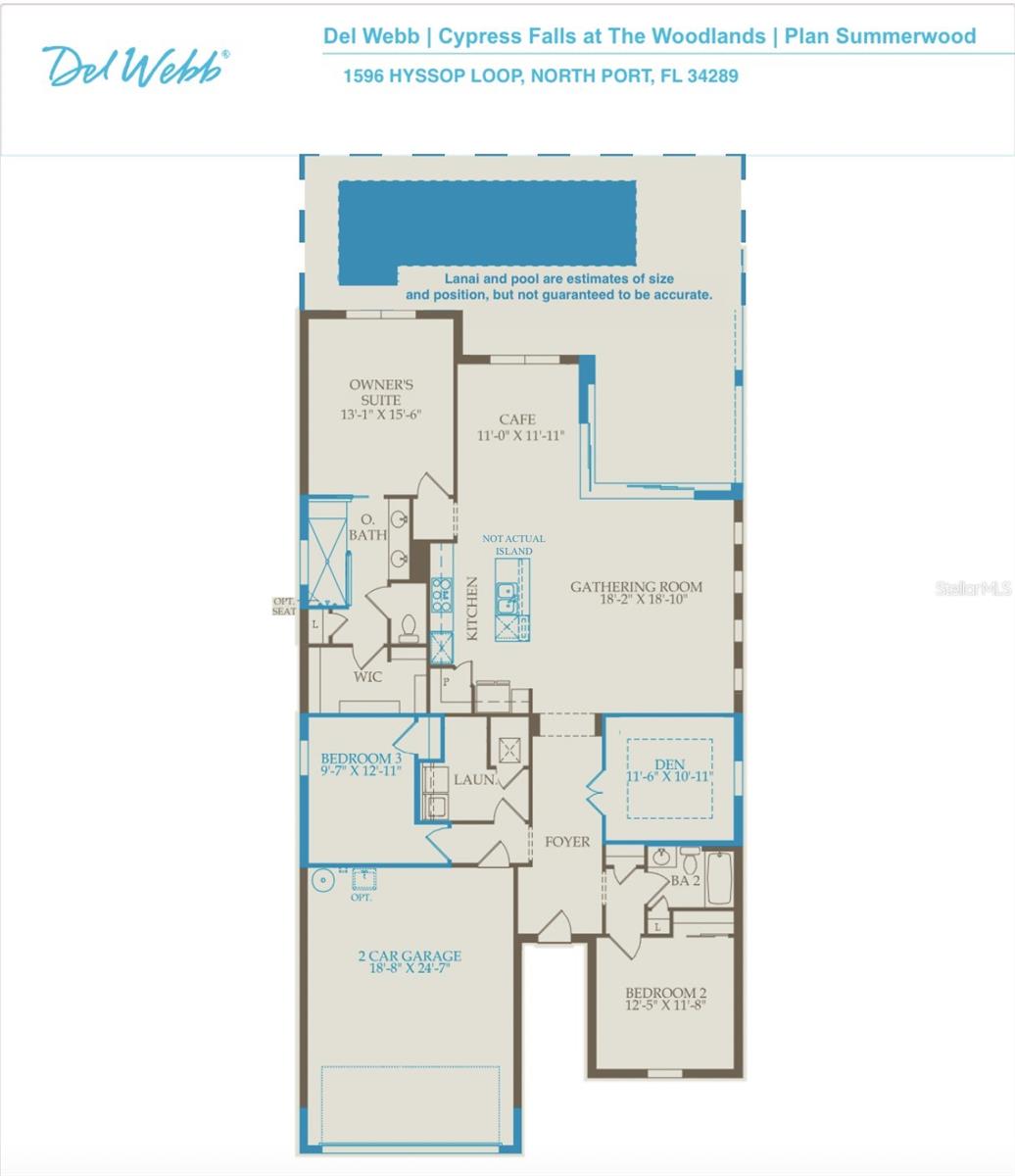 ASSUMABLE 2.875% VA LOAN OPTION!! POND, POOL, PRIVACY AND IT'S NOT IN A FLOOD ZONE! This home feels like walking into a Del Webb model! Multiple upgrades were thoughtfully chosen when designing this Florida style home encompassing almost 2000 sq. ft. of living area. COMPLETE UPGRADE LIST AVAILABLE! The custom heated pool overlooks a lake and preserve, ensuring that no homes will ever be part of your scenic backyard views. Light, bright, open, and airy describe the ambiance which is enhanced by the zero-degree sliders, while peaceful, calm, and serene capture the overall feelings this home brings. This always popular Summerwood plan features three bedrooms, plus a den/flex room for you to configure to best suit your needs! Third bedroom currently used as sewing room, would also make a great man cave, she shed or could be used for extra storage if you don’t need an extra room for living. All furniture currently in the home is included. Generous owner's suite leads to the private bath which includes a spacious walk-in shower, double sinks, private lavatory, and linen closet, as well as a large master closet with tons of shelving. This large open floor plan flaunts the kitchen as a beautiful focal point with its white wooden cabinets, enlarged quartz center island, built in stainless appliances, decorative wooden range hood above the new cooktop, and icicle glass backsplash adding those extra touches of elegance. Interior Utility Room with premium Washer and Dryer included. Even the garage has been upgraded with an extra 4' extension and epoxy flake flooring. Additional features include Hurricane shutters, Electric roll-down hurricane screens on lanai, new carpet in Owner’s suite, and custom window treatments. Cypress Falls has been recognized as being one of the premier retirement communities in Florida! This 55+, maintenance free community offers resort style living. The community is small enough to still have a small town feel, while large enough to have all the activities and amenities you’d love to enjoy in your retirement years including: a resistance pool, beach access pool, spa, pickleball courts, bocce ball, billiards, ping pong, horseshoes, library, internet café; with numerous clubs and classes, crafters, Bridge, poker, euchre, yoga, tai chi, water aerobics, dance club, mahjong, Bible study, and more. Community activities also include Bingo, parties, and professional entertainment. With numerous beaches and golf courses nearby, the lifestyle you’ve only dreamed about can be yours at Cypress Falls!