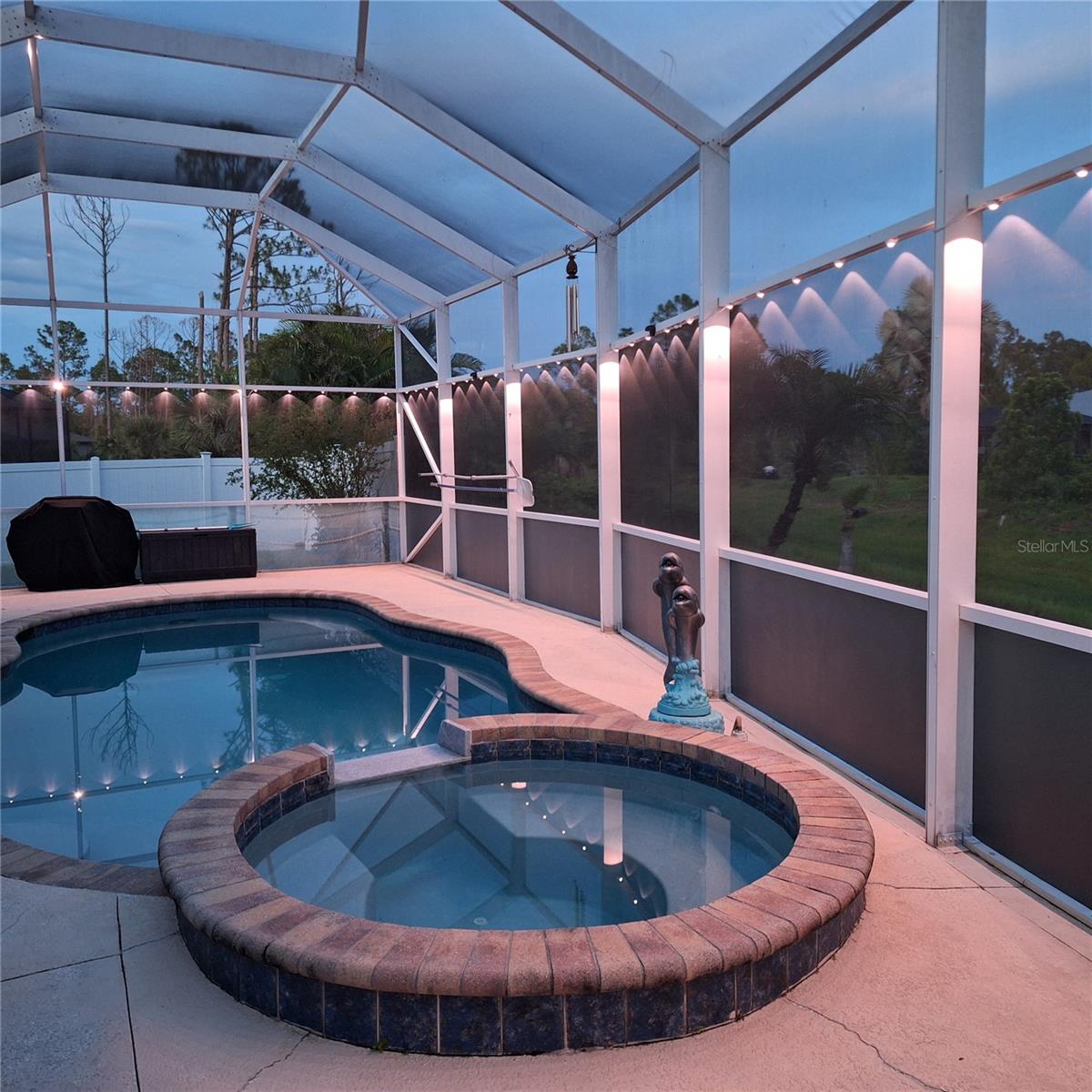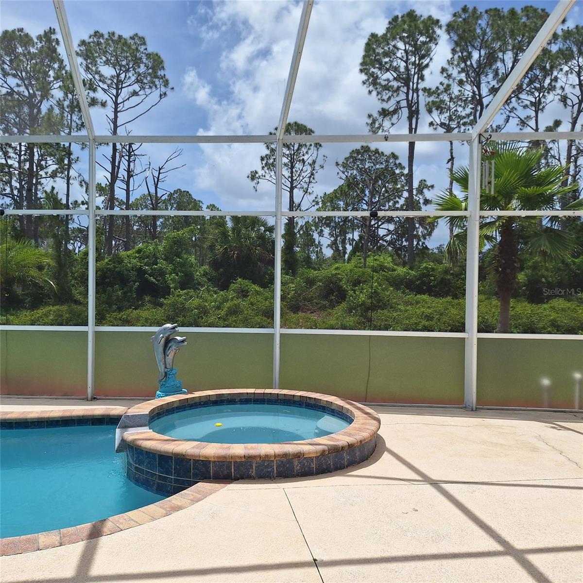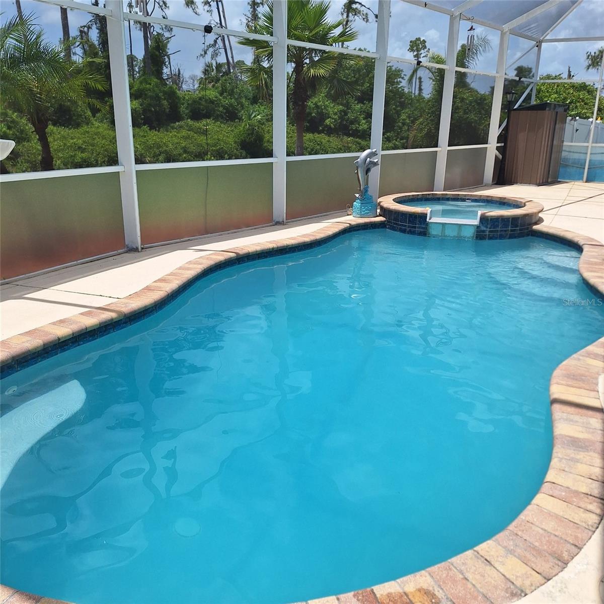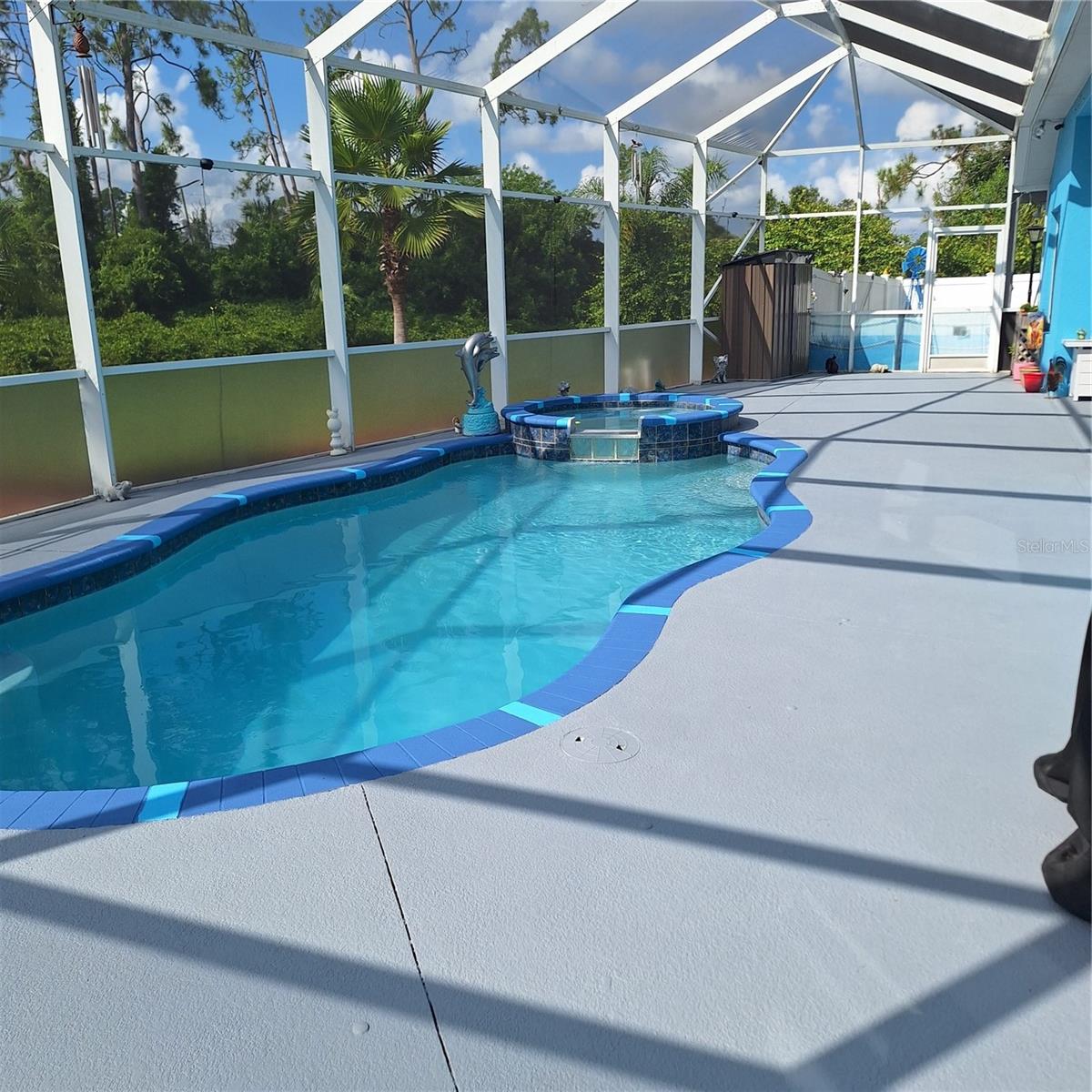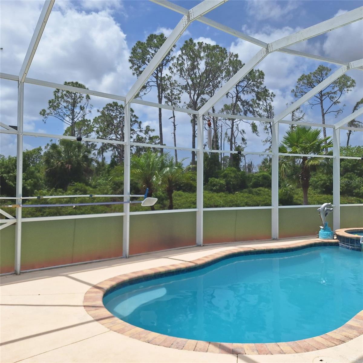 Seller is motivated and will consider all offer! Extraordinary Custom Home with Heated Pool & Spa on a Stunning Oversized Lot! This impressive 3/4-bedroom, 2-bath, 2-car garage home offers 2,370 sq. ft. under air, blending luxury, comfort, and top-tier upgrades! Situated on an oversized 11,504 sq. ft. lot, this mini estate is completely fenced and backs onto a peaceful greenbelt, creating a serene and private retreat. Step inside and experience 10-foot ceilings adorned with elegant crown molding, adding a touch of grandeur throughout. The dedicated office, complete with 8-foot glass French doors and plantation shutters, provides flexibility as a fourth bedroom if needed. Every inch of this home boasts high-end upgrades, including new tile flooring in the bedrooms and bathrooms, new plumbing fixtures, and new ceiling fans and lighting in every room—including the porch and garage. The gourmet kitchen is designed for both function and style, featuring new stainless-steel appliances, a convection double oven, abundant counter space, a large breakfast bar, and a charming breakfast nook with aquarium glass that frames breathtaking views of the sparkling pool. A formal dining room with mirrored walls and an eye-catching window adds a sophisticated touch. The primary suite is a true retreat, offering an expansive layout with a private sitting area, a luxury en-suite bathroom with dual sinks, granite countertops, a separate garden tub, and a walk-in tiled shower. The additional bedrooms are generously sized, each with ceiling fans and ample closet space. Step outside, and prepare to be amazed! The resort-style 6 foot deep heated pool and spa are surrounded by an expansive 26-foot lanai and an extended 32x36 pool deck, complete with a safety gate, dolphin fountain and a second storage shed for pool equipment. Beyond the pool cage, the property extends with a privacy easement, offering even more space to enjoy. This home is packed with upgraded features, including a whole-house reverse osmosis water purification system, new well pump, new AC (2023), new hot water heater (2022), brand new pool heater and pool pump, whole-house surge protector, fresh interior and exterior paint, a new shed, and a security system with built-in speakers. The garage features epoxy flooring, while the driveway and front porch showcase a custom dolphin design. There's even expanded parking to accommodate an RV, boat, or extra vehicles. The professionally landscaped yard is a tropical paradise, featuring $135,000 in premium landscaping, including mature palm trees, flowering shrubs, cherry trees, colored rock with weed guard protection, and custom concrete curbing around the front, side, and backyard. Home includes Hurricane shutters too. Located in North Port's desirable new home area, this spectacular property offers easy access to I-75, shopping, dining, Town Center Mall, and more. This home is one-of-a-kind—schedule your showing today!