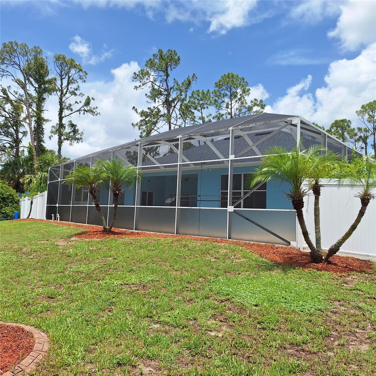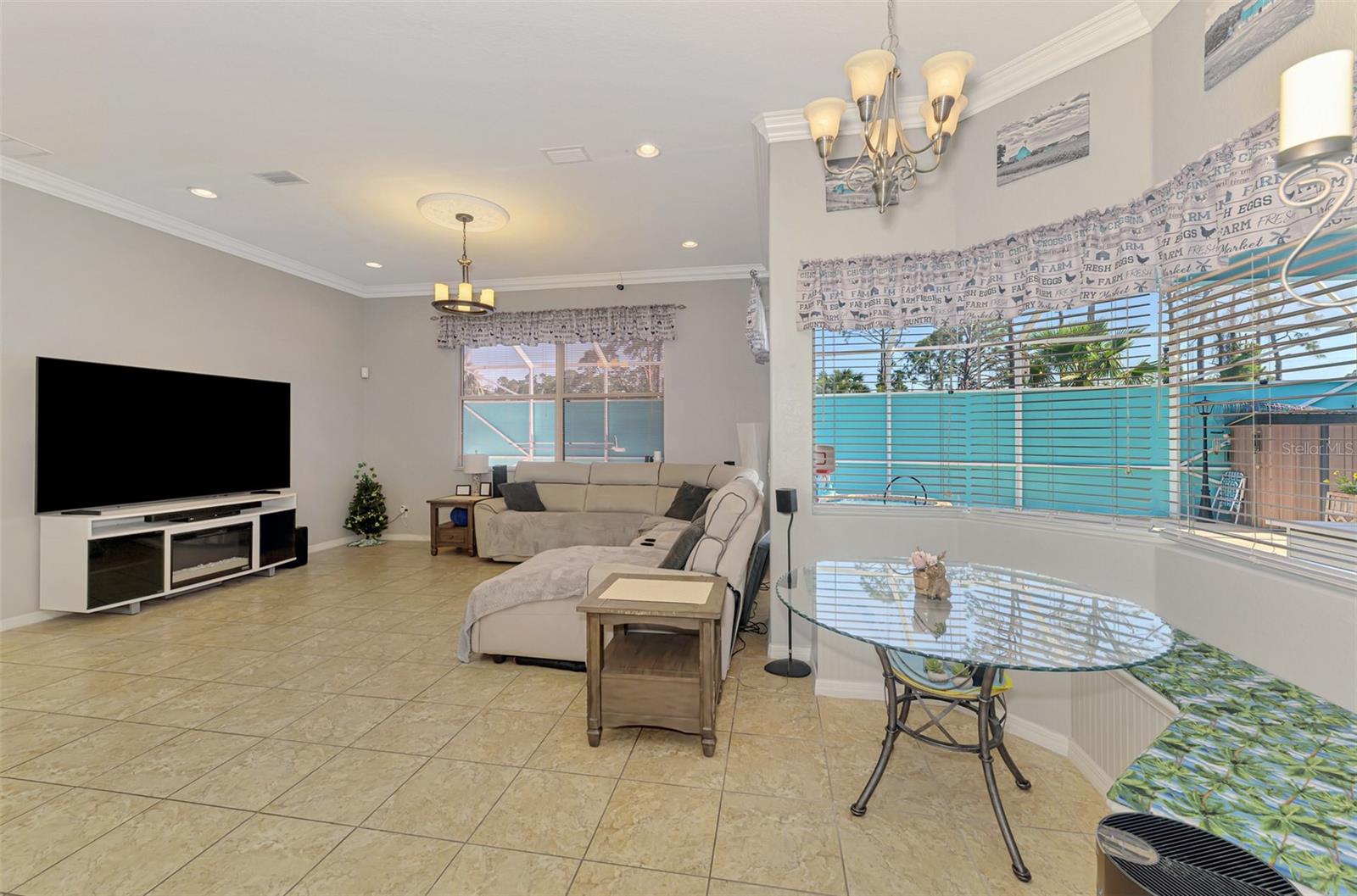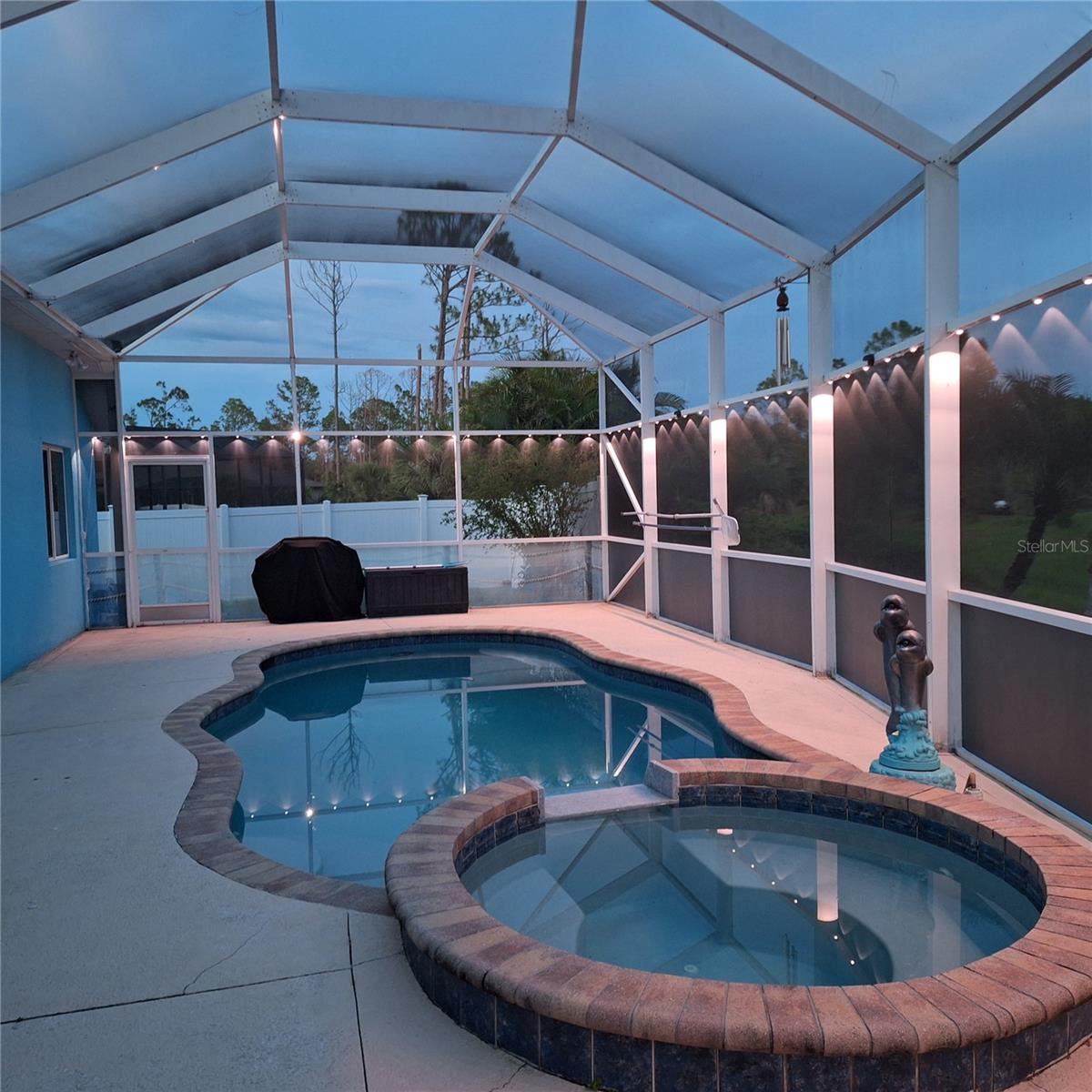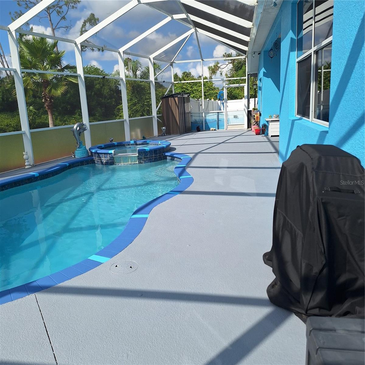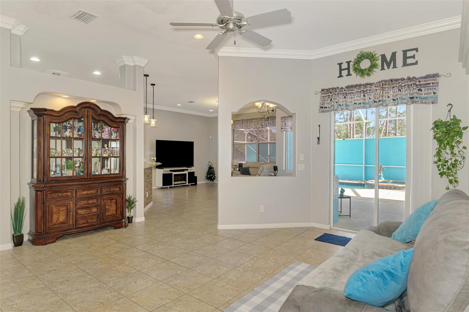 Seller is motivated and will consider all offer! Extraordinary Custom Home with Heated Pool & Spa on a Stunning Oversized Lot! This impressive 3/4-bedroom, 2-bath, 2-car garage home offers 2,370 sq. ft. under air, blending luxury, comfort, and top-tier upgrades! Situated on an oversized 11,504 sq. ft. lot, this mini estate is completely fenced and backs onto a peaceful greenbelt, creating a serene and private retreat. Step inside and experience 10-foot ceilings adorned with elegant crown molding, adding a touch of grandeur throughout. The dedicated office, complete with 8-foot glass French doors and plantation shutters, provides flexibility as a fourth bedroom if needed. Every inch of this home boasts high-end upgrades, including new tile flooring in the bedrooms and bathrooms, new plumbing fixtures, and new ceiling fans and lighting in every room—including the porch and garage. The gourmet kitchen is designed for both function and style, featuring new stainless-steel appliances, a convection double oven, abundant counter space, a large breakfast bar, and a charming breakfast nook with aquarium glass that frames breathtaking views of the sparkling pool. A formal dining room with mirrored walls and an eye-catching window adds a sophisticated touch. The primary suite is a true retreat, offering an expansive layout with a private sitting area, a luxury en-suite bathroom with dual sinks, granite countertops, a separate garden tub, and a walk-in tiled shower. The additional bedrooms are generously sized, each with ceiling fans and ample closet space. Step outside, and prepare to be amazed! The resort-style 6 foot deep heated pool and spa are surrounded by an expansive 26-foot lanai and an extended 32x36 pool deck, complete with a safety gate, dolphin fountain and a second storage shed for pool equipment. Beyond the pool cage, the property extends with a privacy easement, offering even more space to enjoy. This home is packed with upgraded features, including a whole-house reverse osmosis water purification system, new well pump, new AC (2023), new hot water heater (2022), brand new pool heater and pool pump, whole-house surge protector, fresh interior and exterior paint, a new shed, and a security system with built-in speakers. The garage features epoxy flooring, while the driveway and front porch showcase a custom dolphin design. There's even expanded parking to accommodate an RV, boat, or extra vehicles. The professionally landscaped yard is a tropical paradise, featuring $135,000 in premium landscaping, including mature palm trees, flowering shrubs, cherry trees, colored rock with weed guard protection, and custom concrete curbing around the front, side, and backyard. Home includes Hurricane shutters too. Located in North Port's desirable new home area, this spectacular property offers easy access to I-75, shopping, dining, Town Center Mall, and more. This home is one-of-a-kind—schedule your showing today!