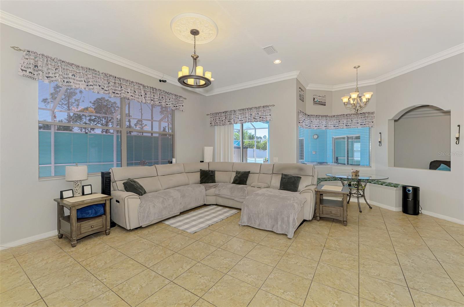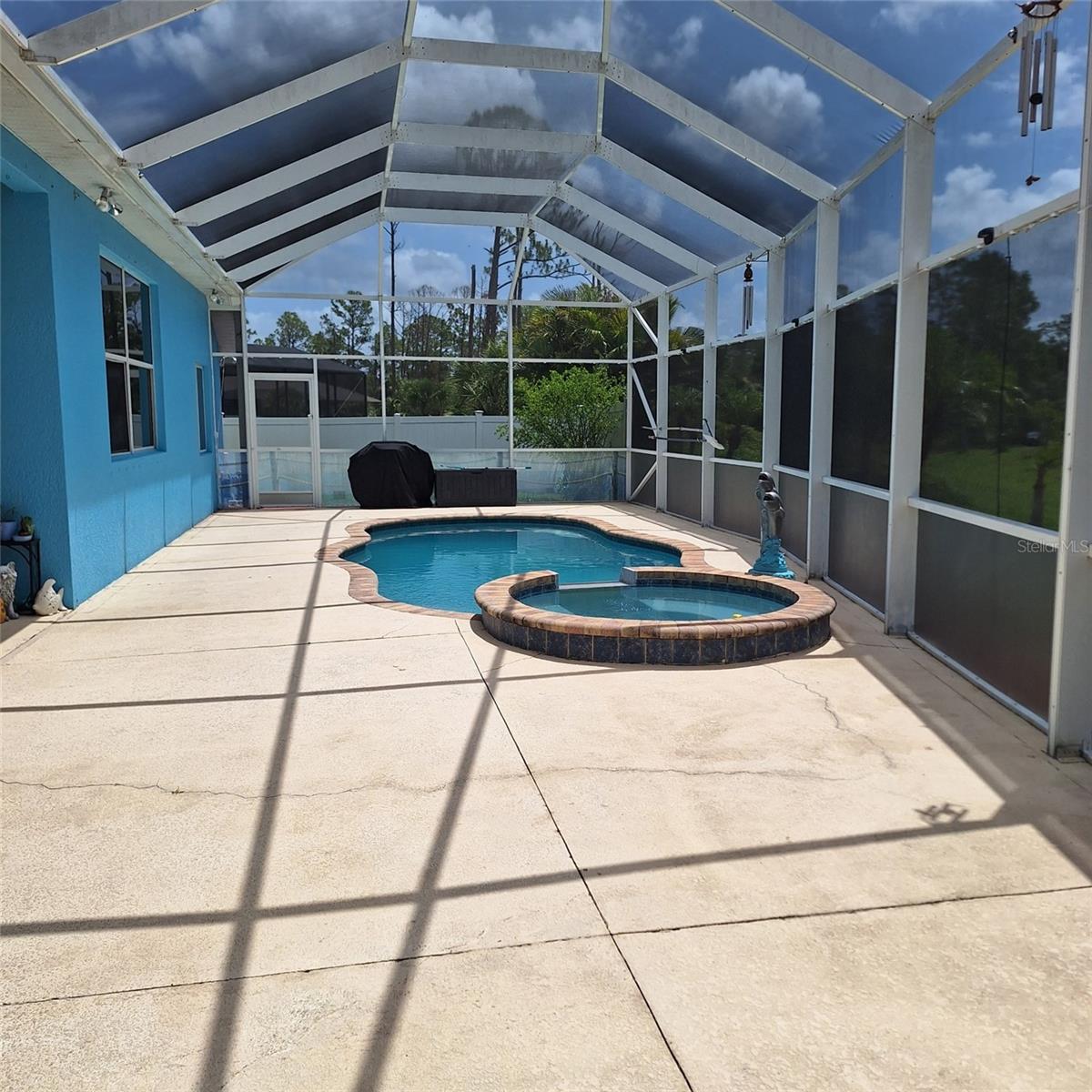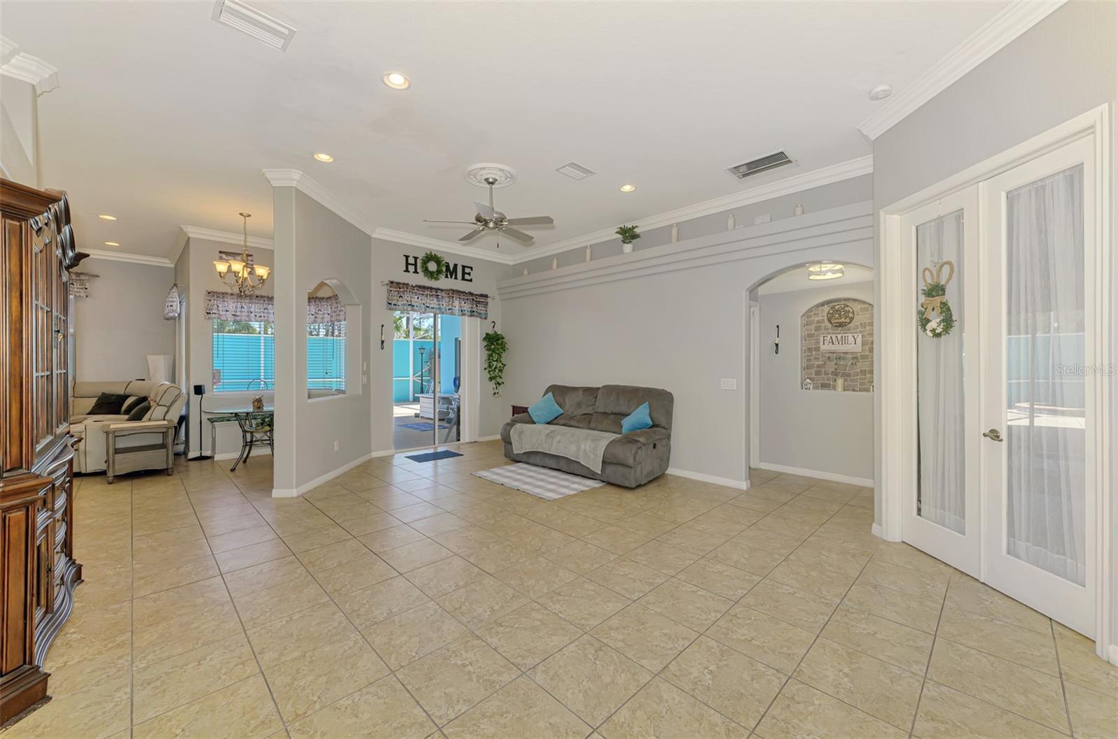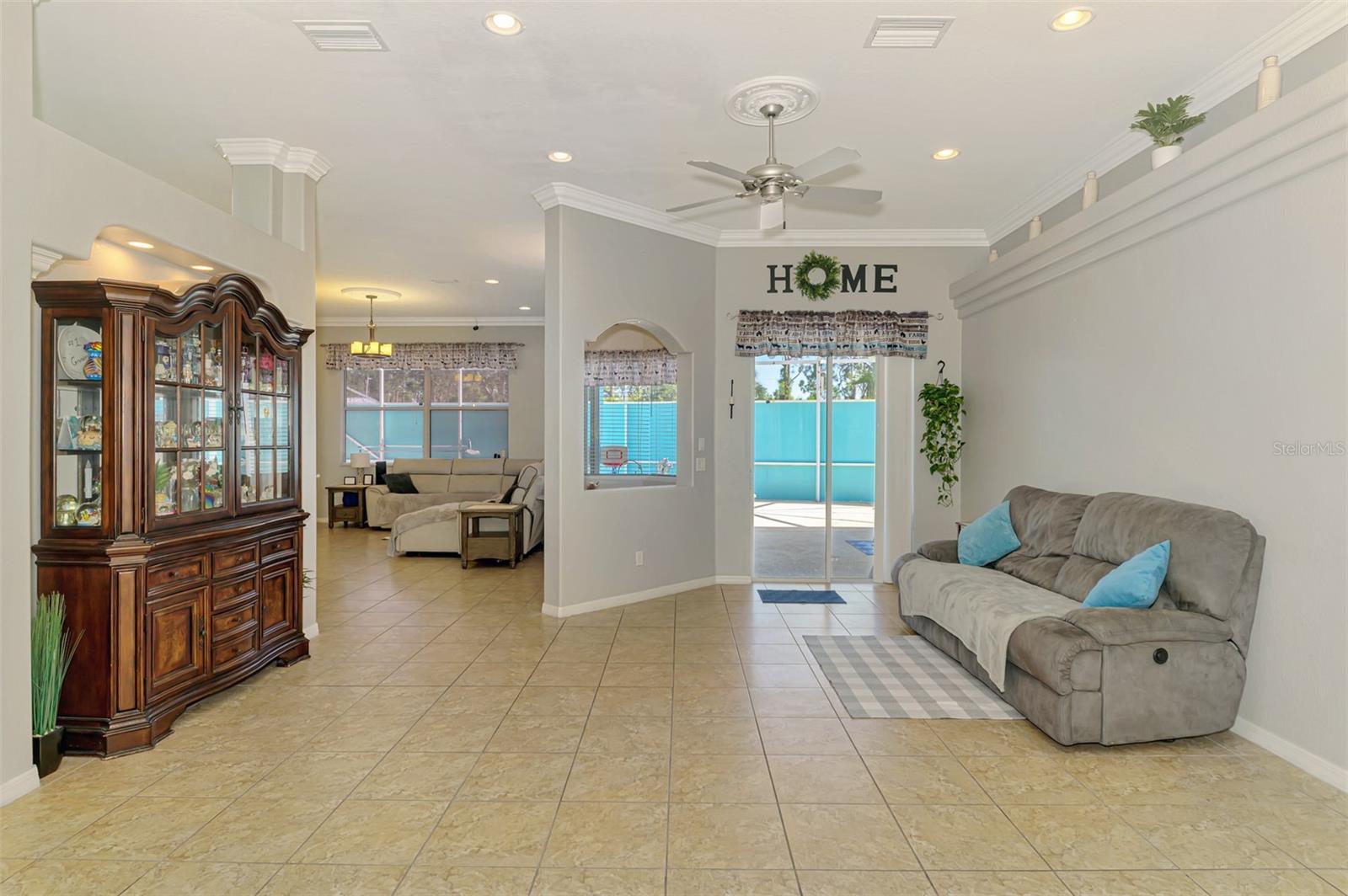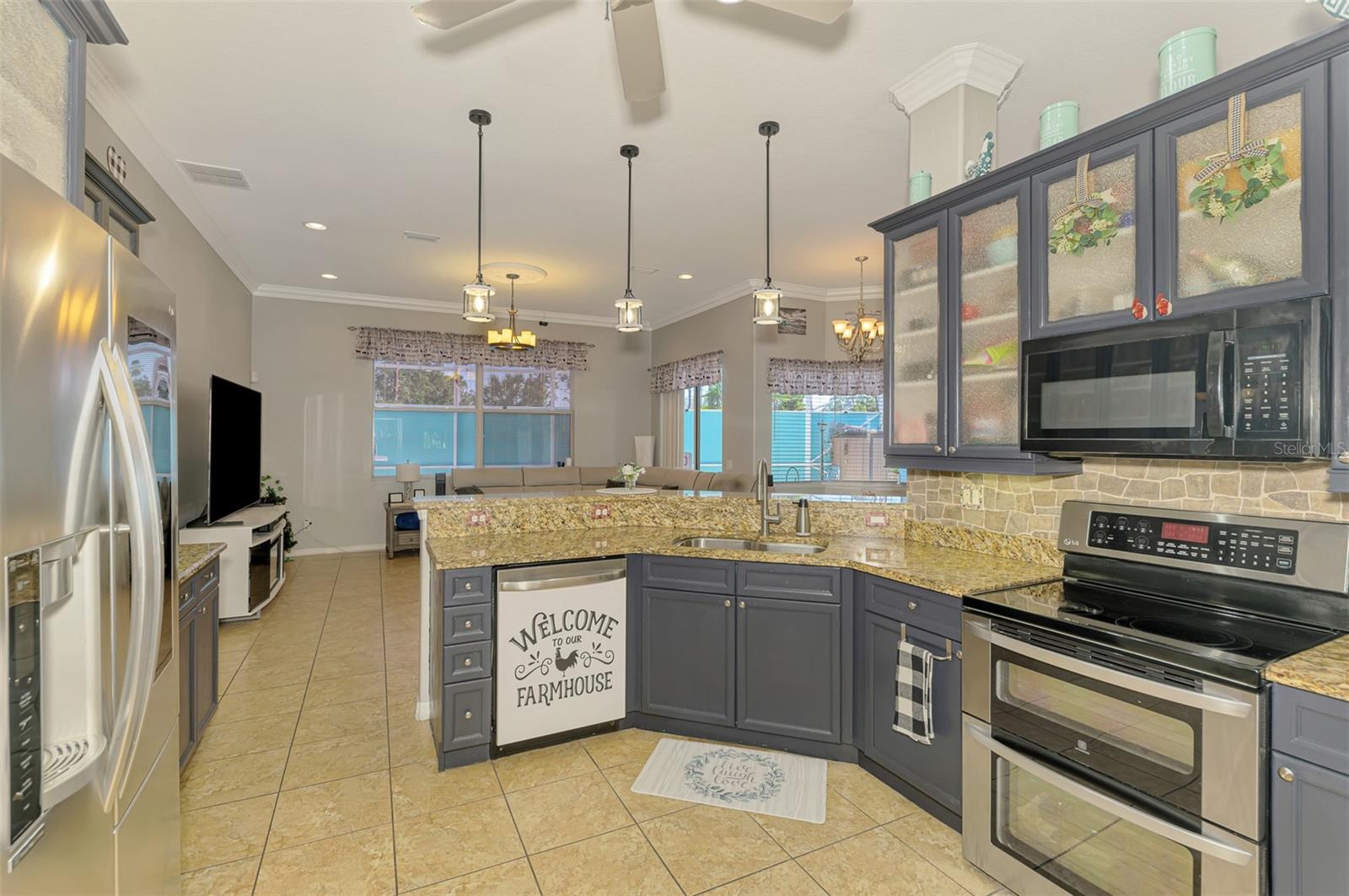 Seller is motivated and will consider all offer! Extraordinary Custom Home with Heated Pool & Spa on a Stunning Oversized Lot! This impressive 3/4-bedroom, 2-bath, 2-car garage home offers 2,370 sq. ft. under air, blending luxury, comfort, and top-tier upgrades! Situated on an oversized 11,504 sq. ft. lot, this mini estate is completely fenced and backs onto a peaceful greenbelt, creating a serene and private retreat. Step inside and experience 10-foot ceilings adorned with elegant crown molding, adding a touch of grandeur throughout. The dedicated office, complete with 8-foot glass French doors and plantation shutters, provides flexibility as a fourth bedroom if needed. Every inch of this home boasts high-end upgrades, including new tile flooring in the bedrooms and bathrooms, new plumbing fixtures, and new ceiling fans and lighting in every room—including the porch and garage. The gourmet kitchen is designed for both function and style, featuring new stainless-steel appliances, a convection double oven, abundant counter space, a large breakfast bar, and a charming breakfast nook with aquarium glass that frames breathtaking views of the sparkling pool. A formal dining room with mirrored walls and an eye-catching window adds a sophisticated touch. The primary suite is a true retreat, offering an expansive layout with a private sitting area, a luxury en-suite bathroom with dual sinks, granite countertops, a separate garden tub, and a walk-in tiled shower. The additional bedrooms are generously sized, each with ceiling fans and ample closet space. Step outside, and prepare to be amazed! The resort-style 6 foot deep heated pool and spa are surrounded by an expansive 26-foot lanai and an extended 32x36 pool deck, complete with a safety gate, dolphin fountain and a second storage shed for pool equipment. Beyond the pool cage, the property extends with a privacy easement, offering even more space to enjoy. This home is packed with upgraded features, including a whole-house reverse osmosis water purification system, new well pump, new AC (2023), new hot water heater (2022), brand new pool heater and pool pump, whole-house surge protector, fresh interior and exterior paint, a new shed, and a security system with built-in speakers. The garage features epoxy flooring, while the driveway and front porch showcase a custom dolphin design. There's even expanded parking to accommodate an RV, boat, or extra vehicles. The professionally landscaped yard is a tropical paradise, featuring $135,000 in premium landscaping, including mature palm trees, flowering shrubs, cherry trees, colored rock with weed guard protection, and custom concrete curbing around the front, side, and backyard. Home includes Hurricane shutters too. Located in North Port's desirable new home area, this spectacular property offers easy access to I-75, shopping, dining, Town Center Mall, and more. This home is one-of-a-kind—schedule your showing today!