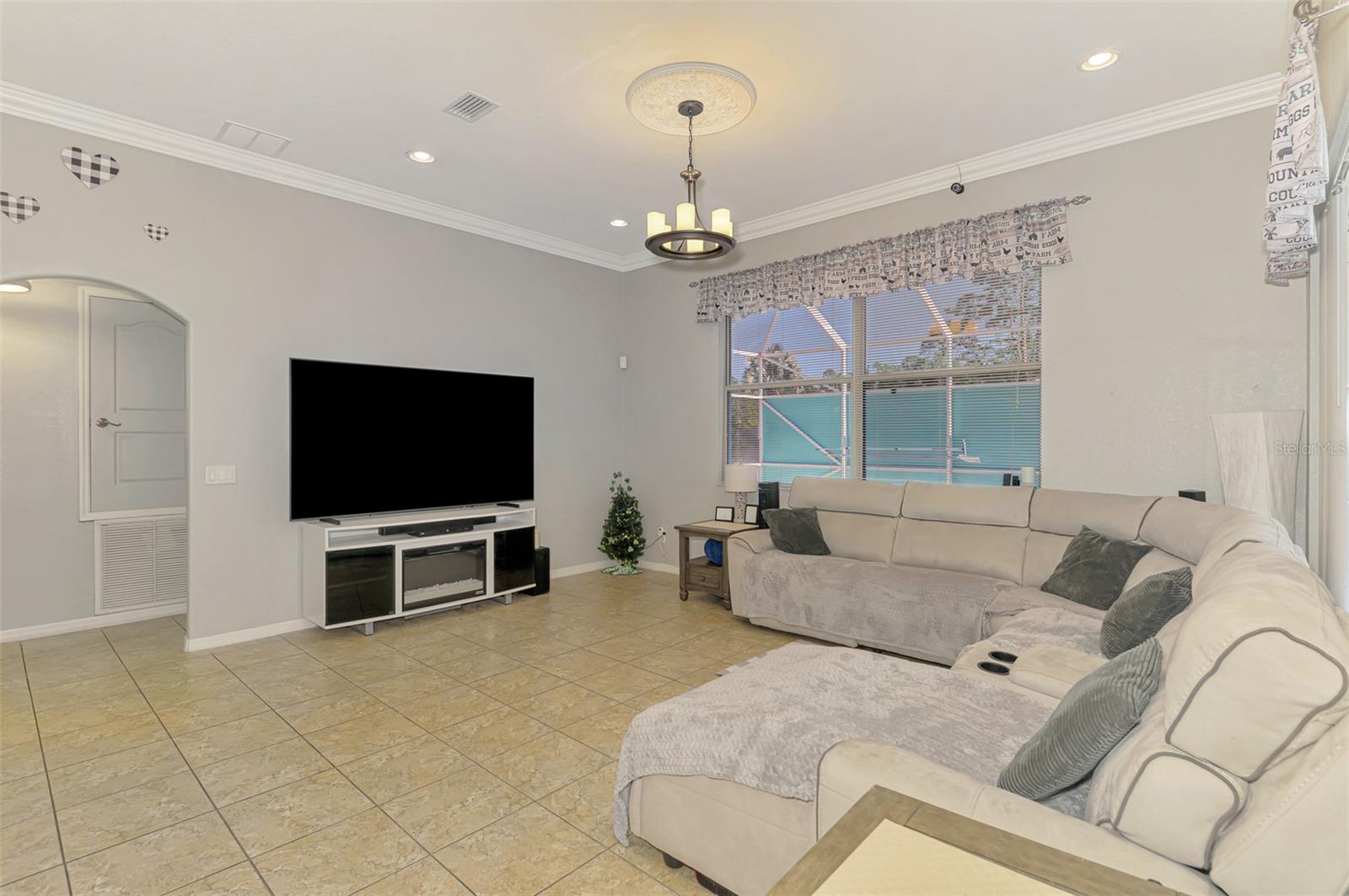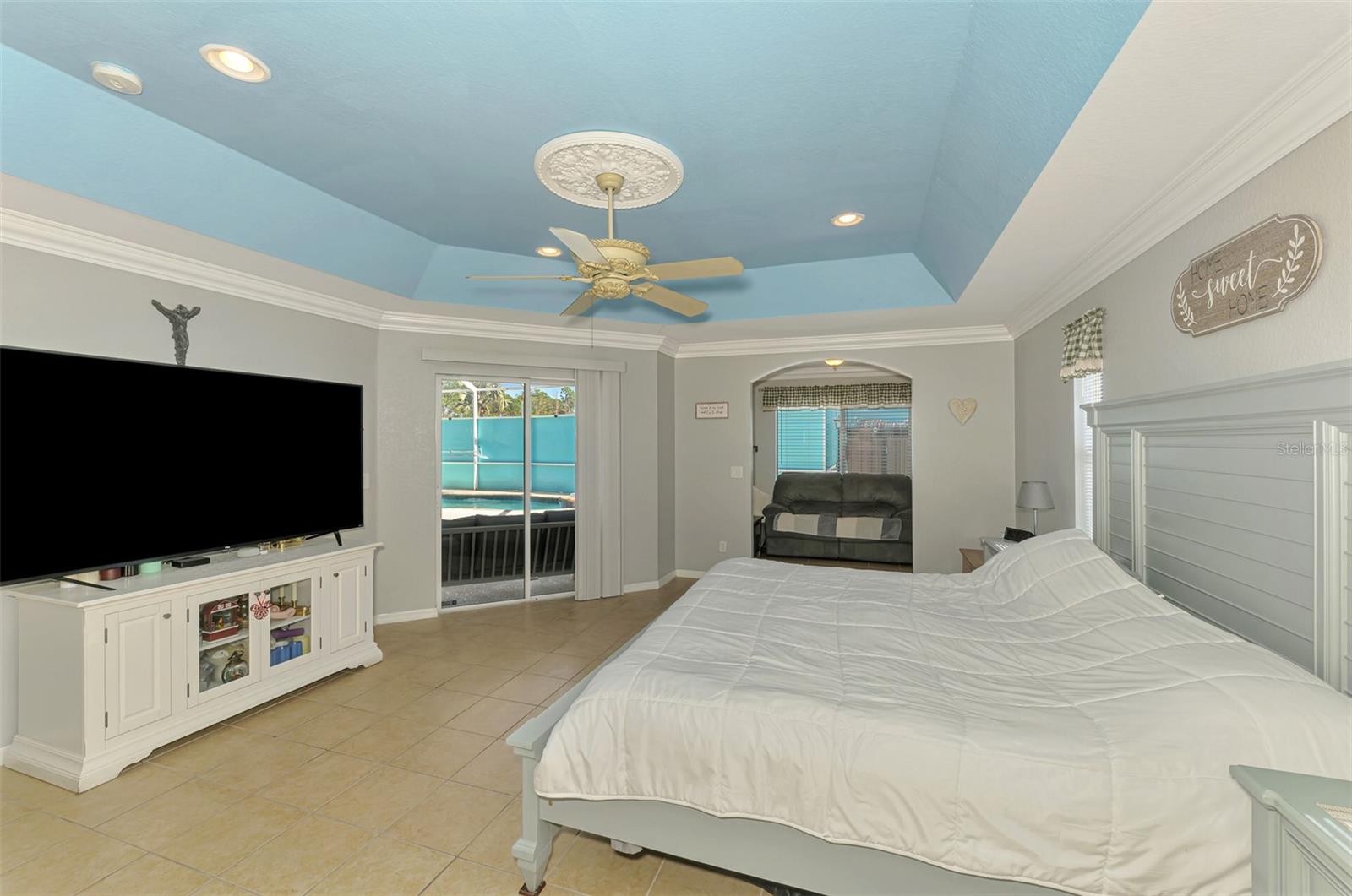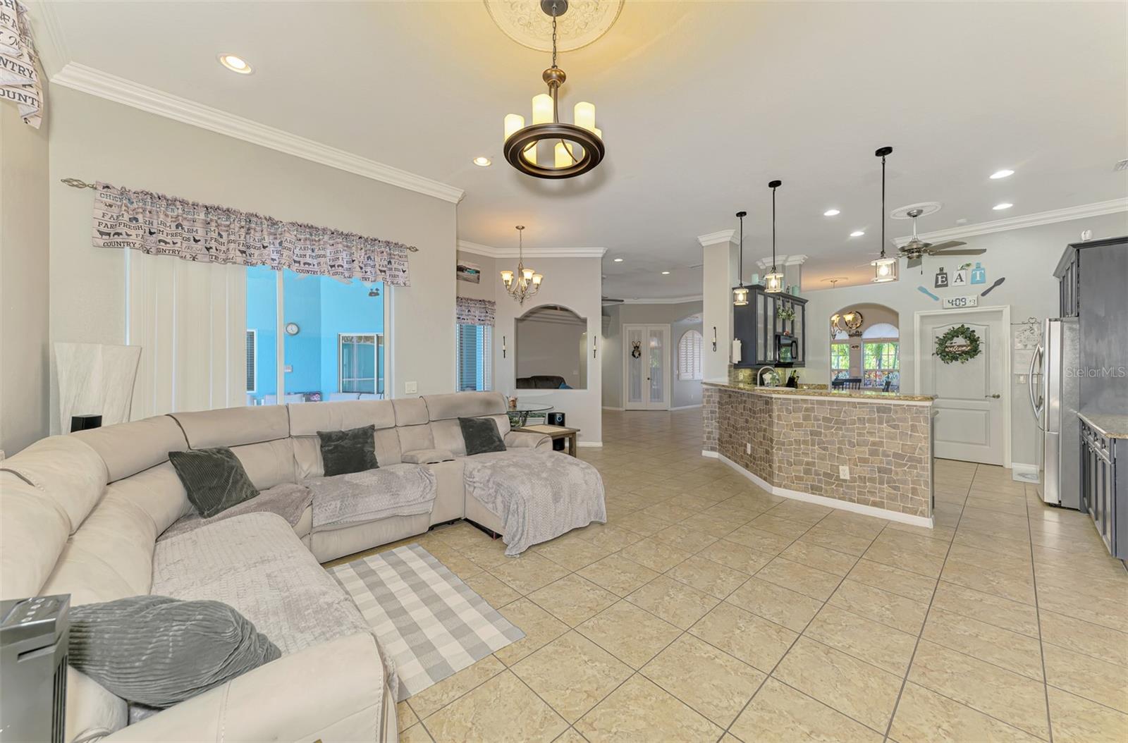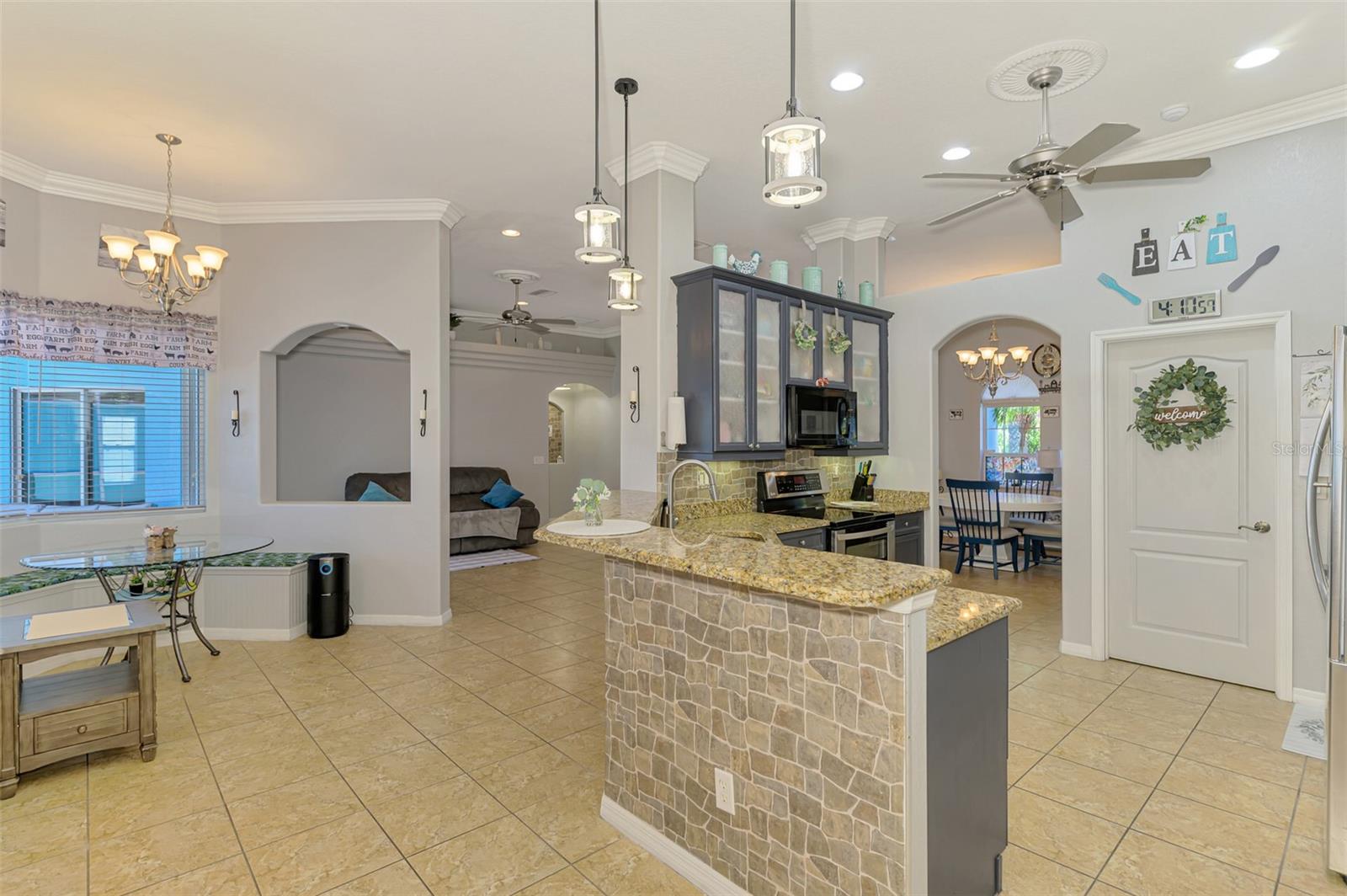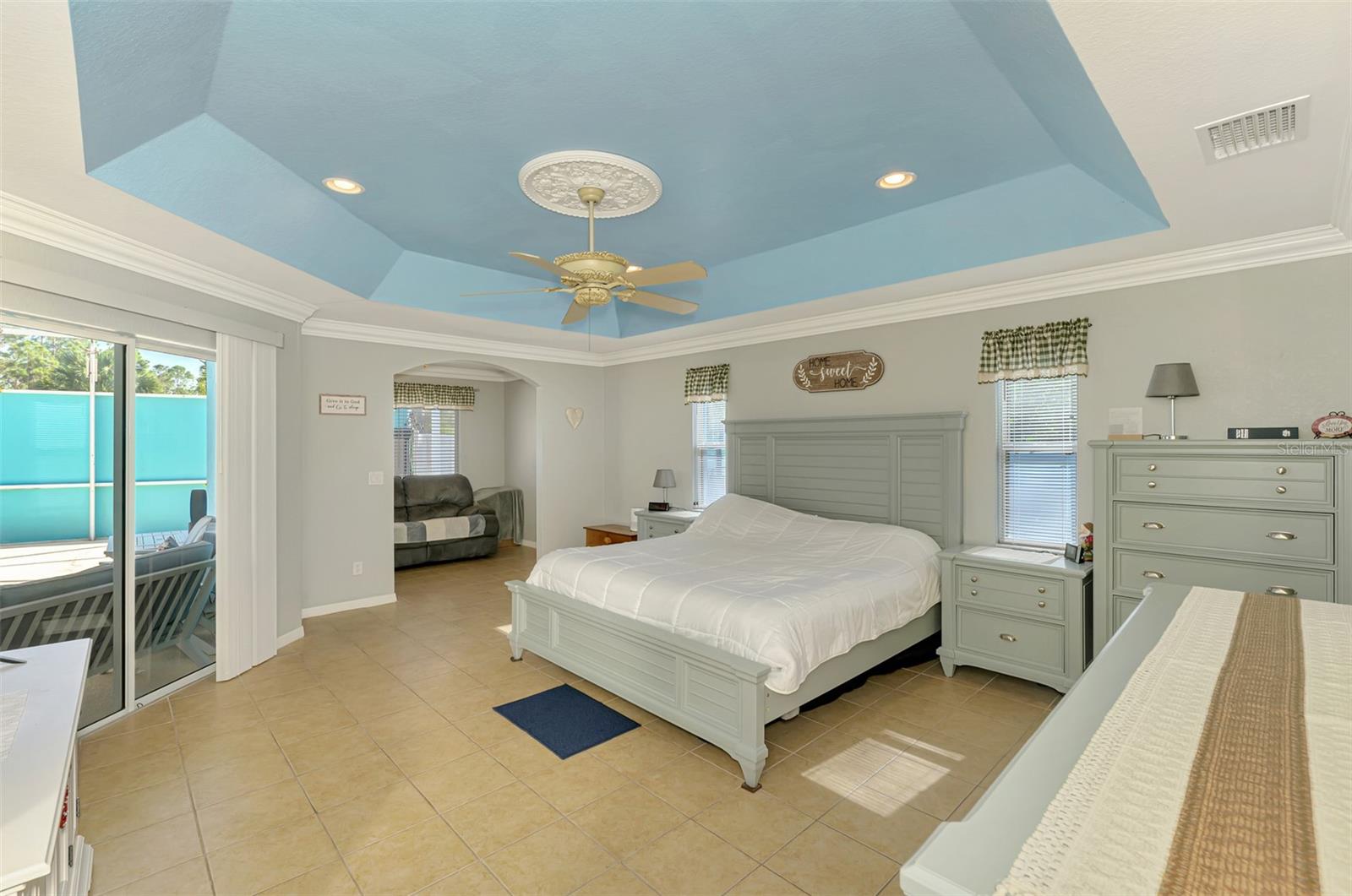 Seller is motivated and will consider all offer! Extraordinary Custom Home with Heated Pool & Spa on a Stunning Oversized Lot! This impressive 3/4-bedroom, 2-bath, 2-car garage home offers 2,370 sq. ft. under air, blending luxury, comfort, and top-tier upgrades! Situated on an oversized 11,504 sq. ft. lot, this mini estate is completely fenced and backs onto a peaceful greenbelt, creating a serene and private retreat. Step inside and experience 10-foot ceilings adorned with elegant crown molding, adding a touch of grandeur throughout. The dedicated office, complete with 8-foot glass French doors and plantation shutters, provides flexibility as a fourth bedroom if needed. Every inch of this home boasts high-end upgrades, including new tile flooring in the bedrooms and bathrooms, new plumbing fixtures, and new ceiling fans and lighting in every room—including the porch and garage. The gourmet kitchen is designed for both function and style, featuring new stainless-steel appliances, a convection double oven, abundant counter space, a large breakfast bar, and a charming breakfast nook with aquarium glass that frames breathtaking views of the sparkling pool. A formal dining room with mirrored walls and an eye-catching window adds a sophisticated touch. The primary suite is a true retreat, offering an expansive layout with a private sitting area, a luxury en-suite bathroom with dual sinks, granite countertops, a separate garden tub, and a walk-in tiled shower. The additional bedrooms are generously sized, each with ceiling fans and ample closet space. Step outside, and prepare to be amazed! The resort-style 6 foot deep heated pool and spa are surrounded by an expansive 26-foot lanai and an extended 32x36 pool deck, complete with a safety gate, dolphin fountain and a second storage shed for pool equipment. Beyond the pool cage, the property extends with a privacy easement, offering even more space to enjoy. This home is packed with upgraded features, including a whole-house reverse osmosis water purification system, new well pump, new AC (2023), new hot water heater (2022), brand new pool heater and pool pump, whole-house surge protector, fresh interior and exterior paint, a new shed, and a security system with built-in speakers. The garage features epoxy flooring, while the driveway and front porch showcase a custom dolphin design. There's even expanded parking to accommodate an RV, boat, or extra vehicles. The professionally landscaped yard is a tropical paradise, featuring $135,000 in premium landscaping, including mature palm trees, flowering shrubs, cherry trees, colored rock with weed guard protection, and custom concrete curbing around the front, side, and backyard. Home includes Hurricane shutters too. Located in North Port's desirable new home area, this spectacular property offers easy access to I-75, shopping, dining, Town Center Mall, and more. This home is one-of-a-kind—schedule your showing today!