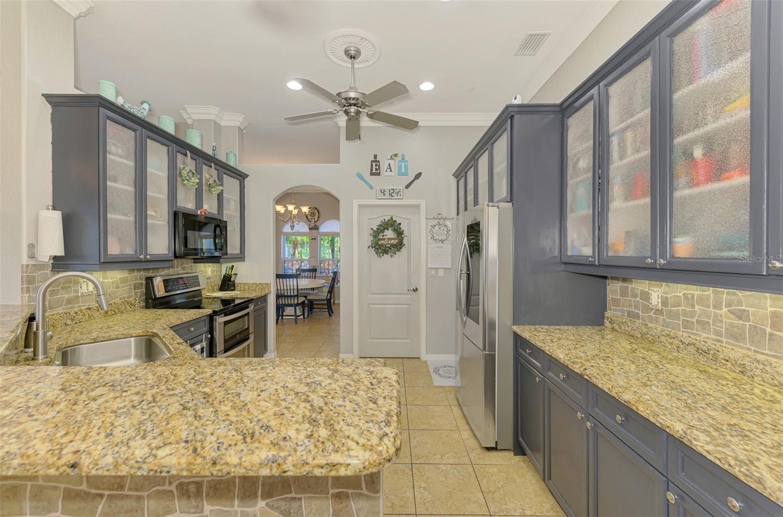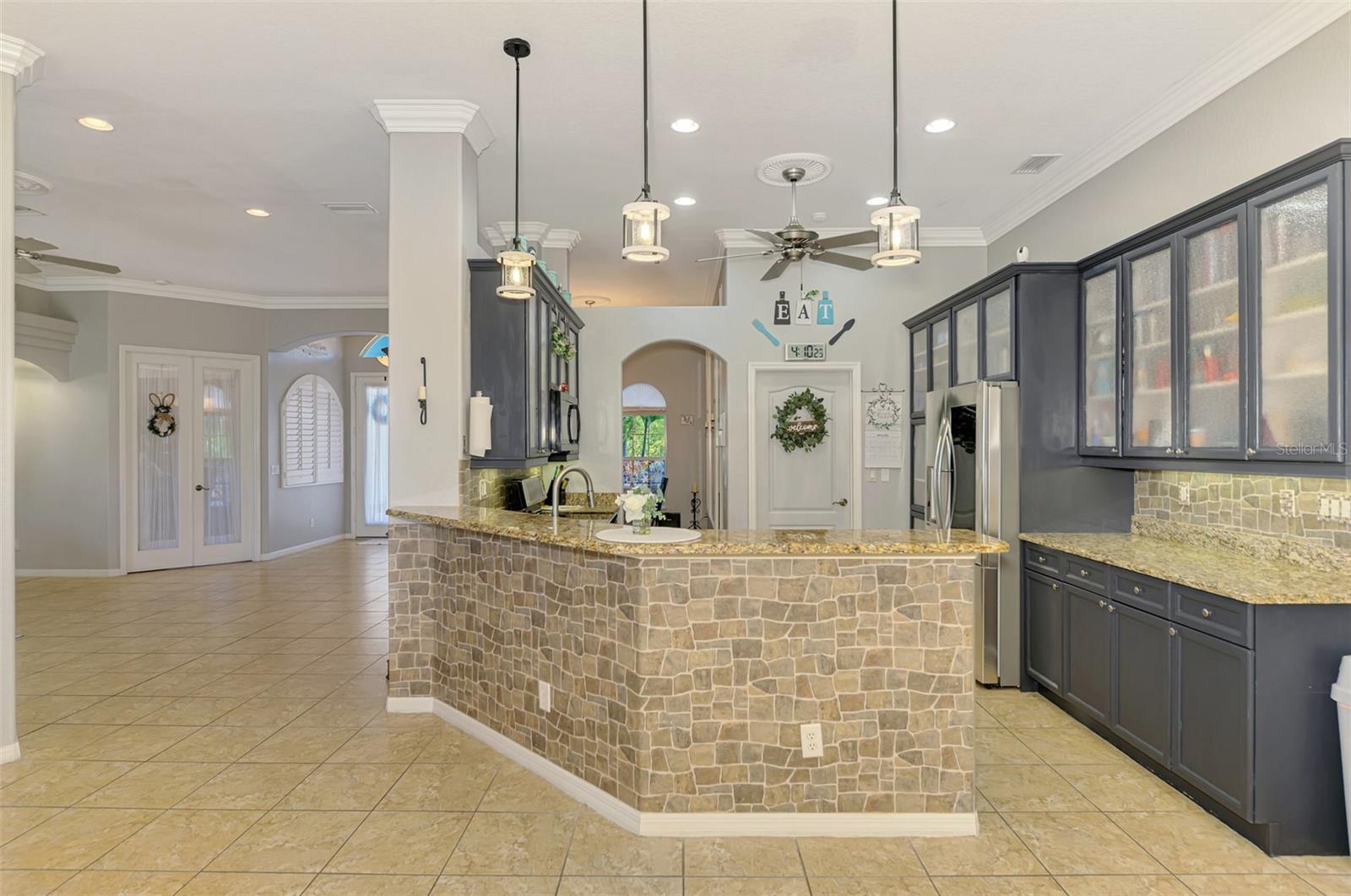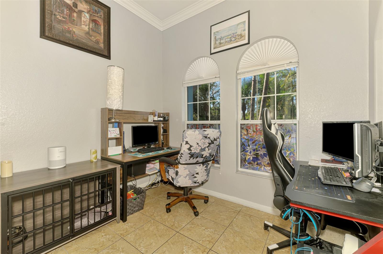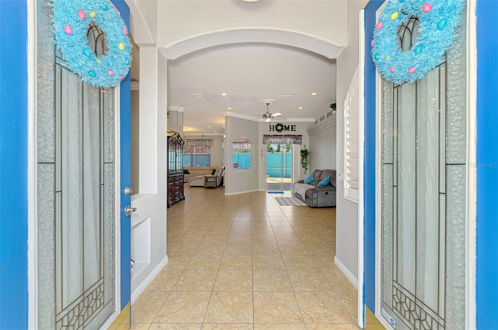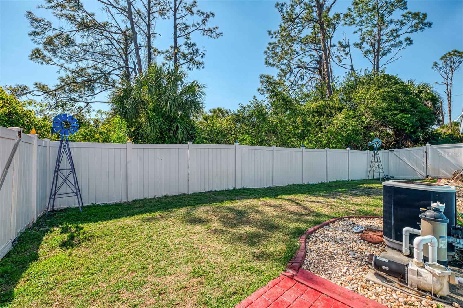 Seller is motivated and will consider all offer! Extraordinary Custom Home with Heated Pool & Spa on a Stunning Oversized Lot! This impressive 3/4-bedroom, 2-bath, 2-car garage home offers 2,370 sq. ft. under air, blending luxury, comfort, and top-tier upgrades! Situated on an oversized 11,504 sq. ft. lot, this mini estate is completely fenced and backs onto a peaceful greenbelt, creating a serene and private retreat. Step inside and experience 10-foot ceilings adorned with elegant crown molding, adding a touch of grandeur throughout. The dedicated office, complete with 8-foot glass French doors and plantation shutters, provides flexibility as a fourth bedroom if needed. Every inch of this home boasts high-end upgrades, including new tile flooring in the bedrooms and bathrooms, new plumbing fixtures, and new ceiling fans and lighting in every room—including the porch and garage. The gourmet kitchen is designed for both function and style, featuring new stainless-steel appliances, a convection double oven, abundant counter space, a large breakfast bar, and a charming breakfast nook with aquarium glass that frames breathtaking views of the sparkling pool. A formal dining room with mirrored walls and an eye-catching window adds a sophisticated touch. The primary suite is a true retreat, offering an expansive layout with a private sitting area, a luxury en-suite bathroom with dual sinks, granite countertops, a separate garden tub, and a walk-in tiled shower. The additional bedrooms are generously sized, each with ceiling fans and ample closet space. Step outside, and prepare to be amazed! The resort-style 6 foot deep heated pool and spa are surrounded by an expansive 26-foot lanai and an extended 32x36 pool deck, complete with a safety gate, dolphin fountain and a second storage shed for pool equipment. Beyond the pool cage, the property extends with a privacy easement, offering even more space to enjoy. This home is packed with upgraded features, including a whole-house reverse osmosis water purification system, new well pump, new AC (2023), new hot water heater (2022), brand new pool heater and pool pump, whole-house surge protector, fresh interior and exterior paint, a new shed, and a security system with built-in speakers. The garage features epoxy flooring, while the driveway and front porch showcase a custom dolphin design. There's even expanded parking to accommodate an RV, boat, or extra vehicles. The professionally landscaped yard is a tropical paradise, featuring $135,000 in premium landscaping, including mature palm trees, flowering shrubs, cherry trees, colored rock with weed guard protection, and custom concrete curbing around the front, side, and backyard. Home includes Hurricane shutters too. Located in North Port's desirable new home area, this spectacular property offers easy access to I-75, shopping, dining, Town Center Mall, and more. This home is one-of-a-kind—schedule your showing today!