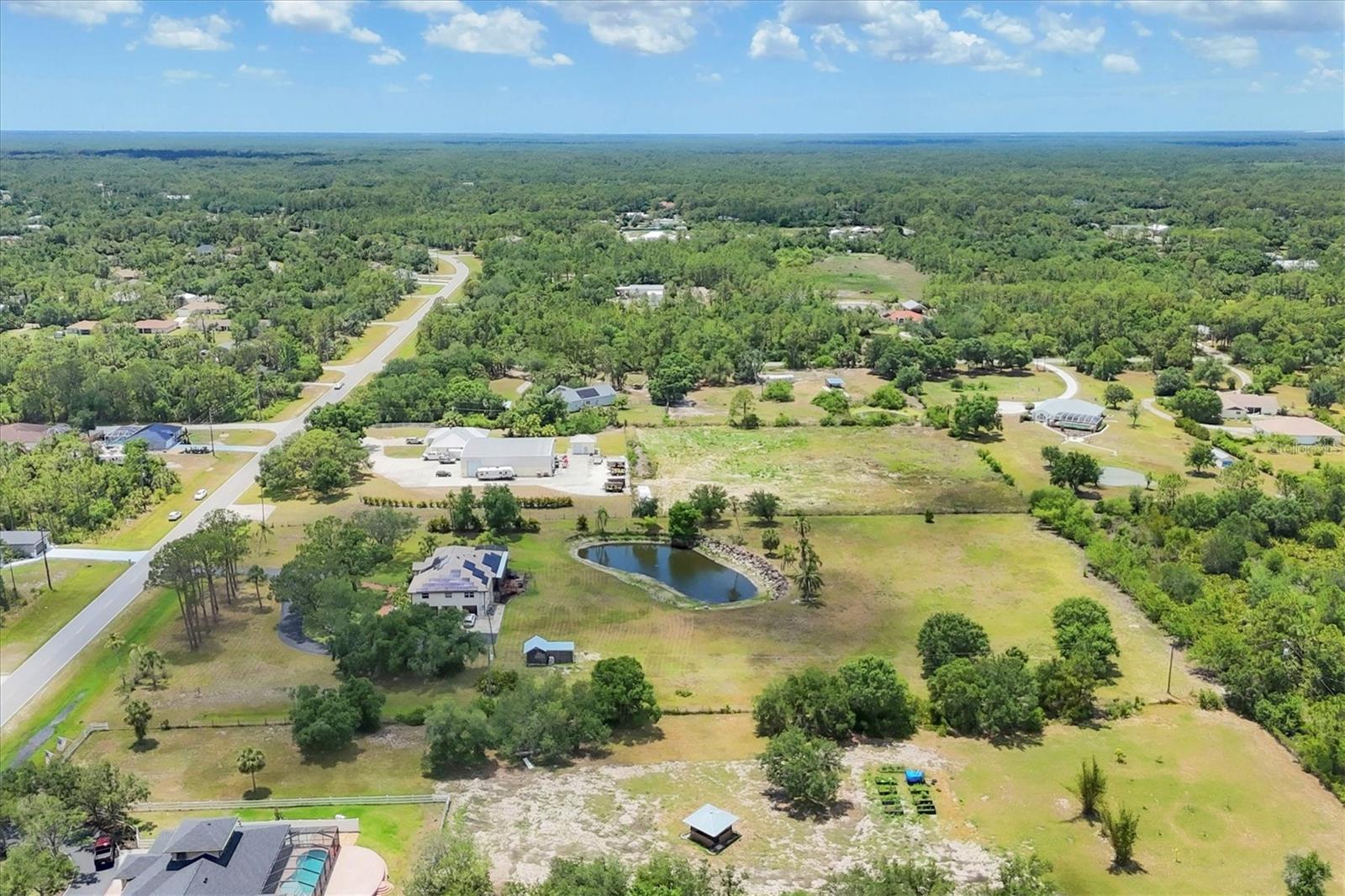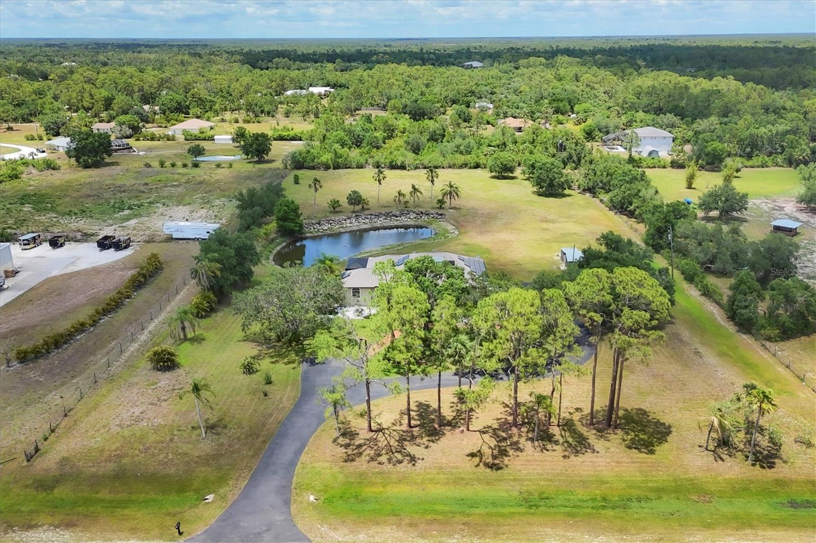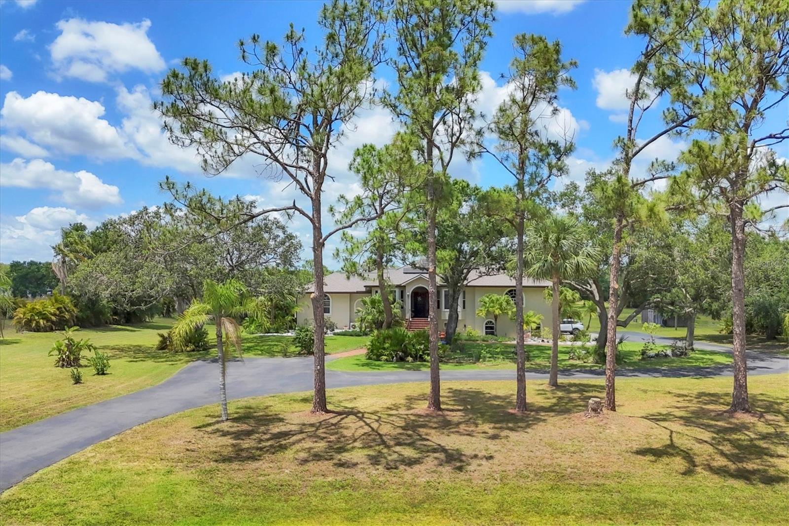 *Seller is offering $10,000 credit toward buyer’s closing costs* Elegant Custom Estate on Over 4 Acres with In-Law Suite – No Flood Insurance Required! Welcome to your private retreat just minutes from town! This stunning 4-bedroom + den, 3.5-bath custom home with a 3-car garage sits on over 4 acres of serene, agriculturally zoned land that is ideal for horses, farm animals, or simply embracing a peaceful country lifestyle. Step inside to soaring ceilings, rich Bolivian Rosewood flooring, and an open-concept layout that blends everyday comfort with timeless elegance. The main living area features oversized sliding pocket doors that open fully to a screened Trex deck, creating seamless indoor-outdoor living, perfect for entertaining. The thoughtfully designed kitchen combines form and function with Cherrywood cabinetry, granite countertops, a tile backsplash, stainless steel appliances, a counter-height breakfast bar, and a sunny breakfast nook overlooking tranquil pond views. A separate family room and formal dining room add to the home's versatility, while a dedicated office makes working from home a breeze. A split-bedroom layout offers privacy for everyone. The guest wing includes two bedrooms, a full bath plus a 1/2 bath with stackable washer/dryer, along with generous closet space. The expansive primary suite, with private lanai access offers two closets—including a large walk-in—and a spa-inspired bathroom featuring granite counters, dual sinks, custom cabinetry, a jetted soaking tub, and a beautifully tiled walk-in shower. One of the home’s most unique features is the approx. 2,000 SQFT in-law suite, providing outstanding flexibility for multigenerational living, guest accommodations, or rental income. With its own private entrance and interior access, it includes a spacious living/dining area, oversized bedroom, full bath, kitchenette, wood plank style tile flooring throughout, a large laundry room, and its own mini-split A/C system. Enjoy outdoor living at its finest with your choice of spaces, from the upper screened lanai to the open-air lower deck that features a hot tub! The perfect space for watching fish jump in your private pond, taking in the peaceful surroundings, or stargazing at night. This country estate is loaded with upgrades, including a new roof, gutters, and upgraded enclosure screens (2022), Hurricane-rated garage doors with epoxy flooring, new flooring in guest bedrooms, whole-home solar energy system, dual HVAC systems and 18” attic insulation, whole-house reverse osmosis water system, dual water heaters (solar and hybrid), central vacuum and invisible pet fencing, well-fed irrigation system and backyard shed, tropical landscaping with landscape lighting, RV parking with hookup, plus a portable Generac generator is included (not currently connected). Best of all, this home is not located in a flood zone—flood insurance is not required, offering peace of mind and additional savings. Agricultural zoning allows you to fully enjoy a rural lifestyle. Bring your horses, plant a garden, or raise animals while still being just minutes from I-75, Gulf beaches, shopping, dining, and parks. This exceptional property offers elegance, space, and versatility, a rare opportunity that won’t last. Schedule your private showing today and see everything this one-of-a-kind estate has to offer!