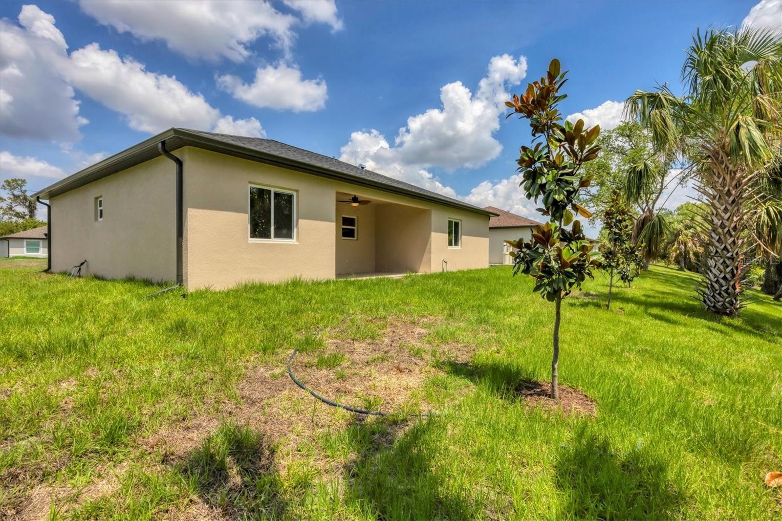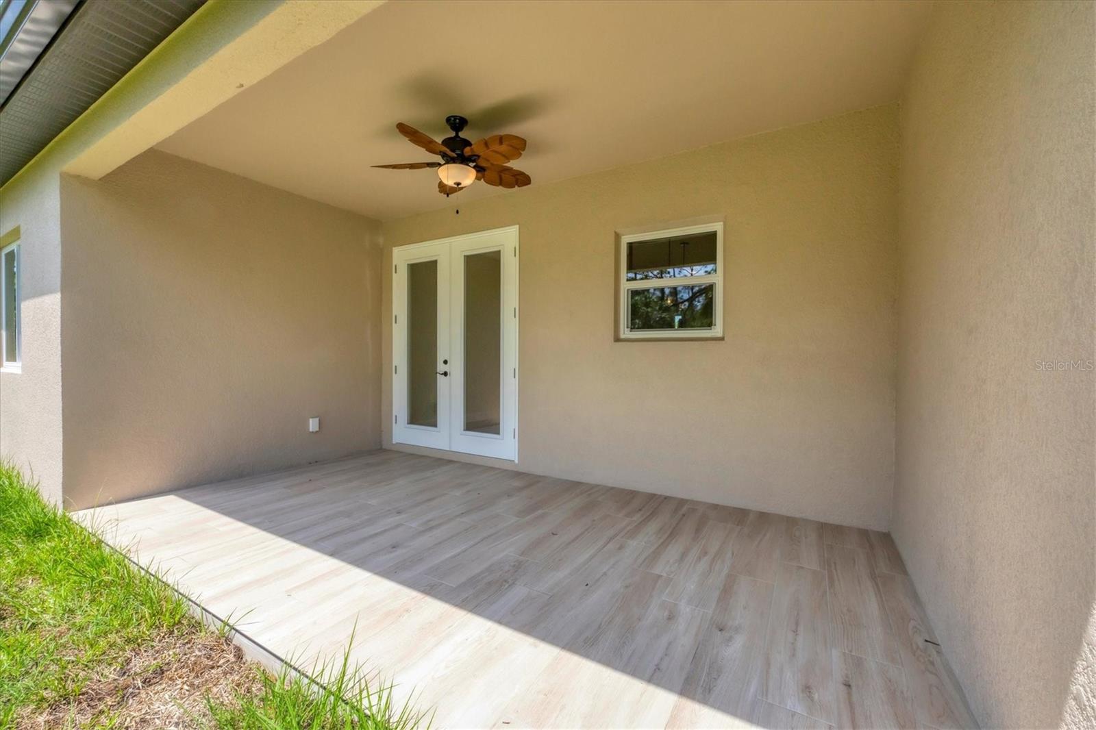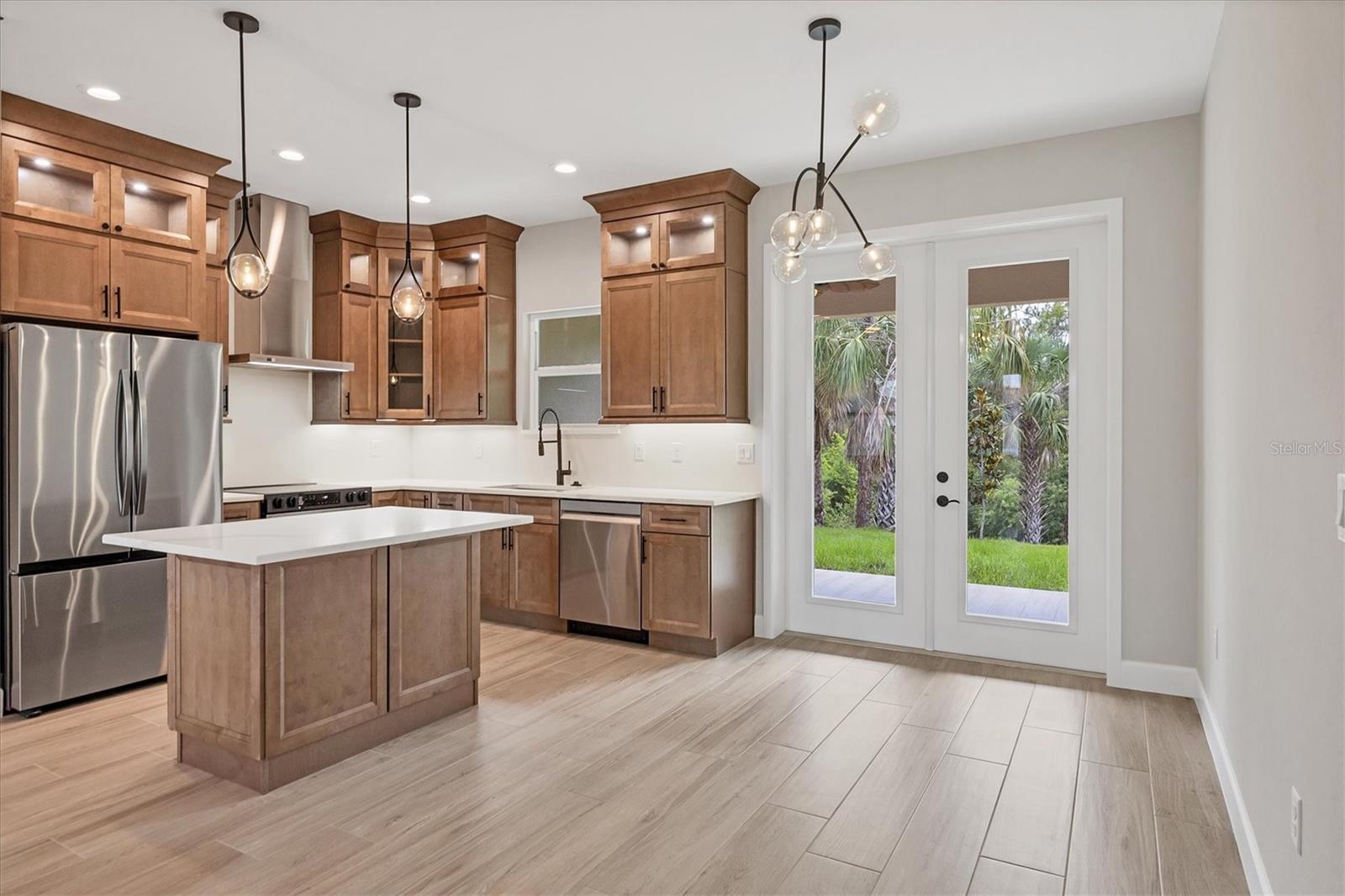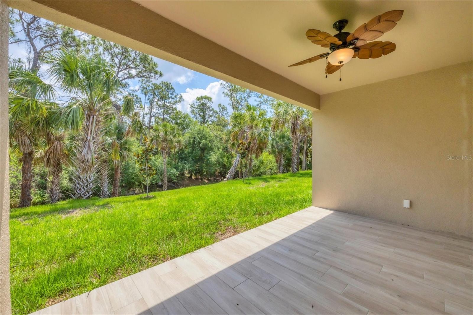 FRESHWATER CANAL VIEW. Brand-new modern classic luxury home featuring 3 bedrooms, 2 bathrooms, and a fully enclosed office (optional 4th BR) with soaring 9.4' ceilings. Located in a prime area with no HOA and outside the flood zone. Interior showcases Spanish porcelain tile throughout, impact-resistant windows and doors, and an open-concept living space with large double doors leading to a tiled lanai overlooking a peaceful freshwater canal. The chef’s kitchen includes quartz countertops, 42" soft-close cabinets, under/over cabinet lighting, stainless steel appliances, range hood, and stylish backsplash. The primary suite offers a walk-in closet and spa-like en-suite bath with a double vanity, linen closet, and walk-in shower with bench. Both bathrooms have full-length tiled shower walls. MOEN plumbing fixtures are featured throughout the entire home for consistent quality and style. Additional highlights: Interior laundry room with sink, seamless gutters, quartz windowsills, and designer lighting throughout.