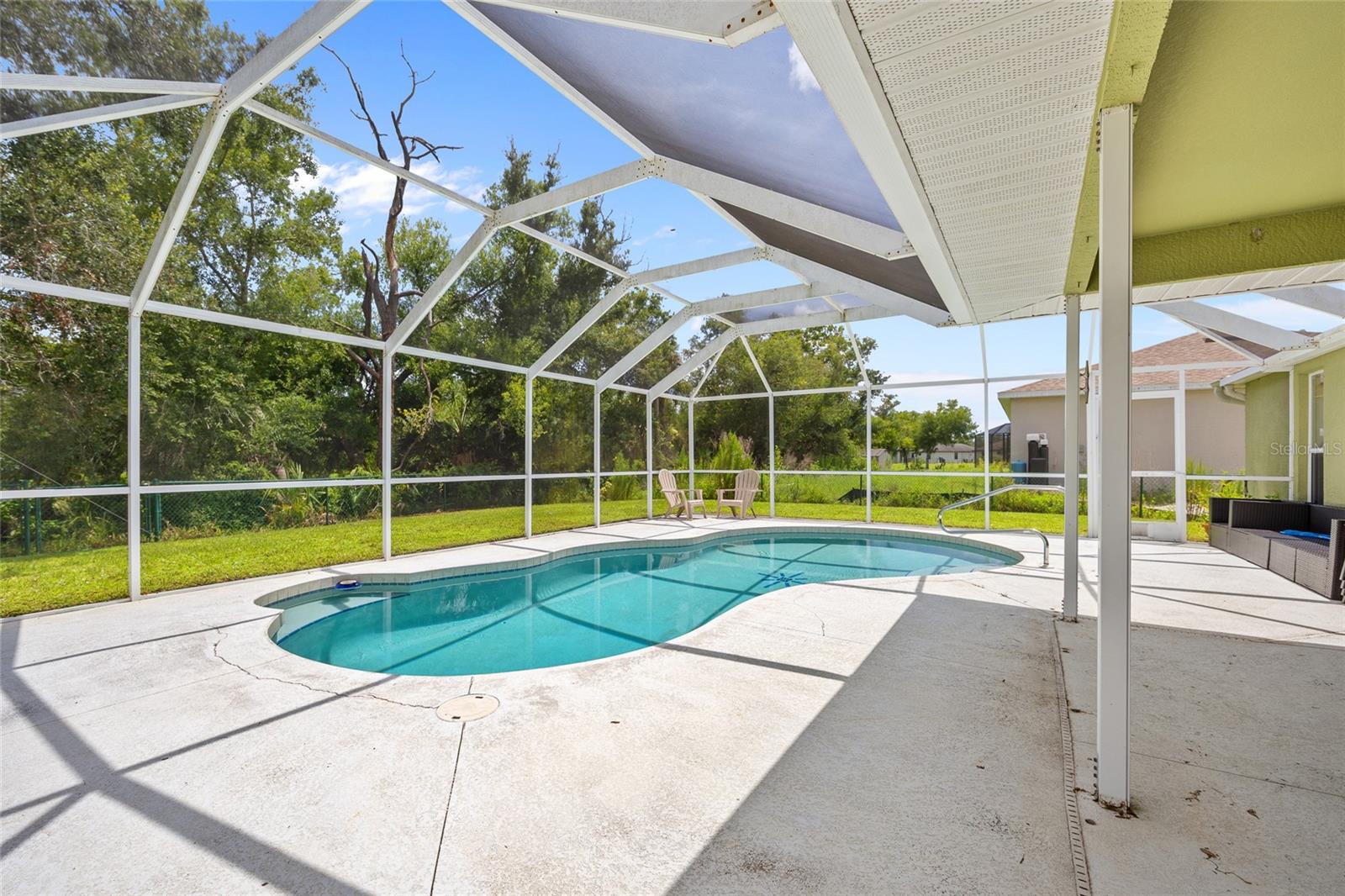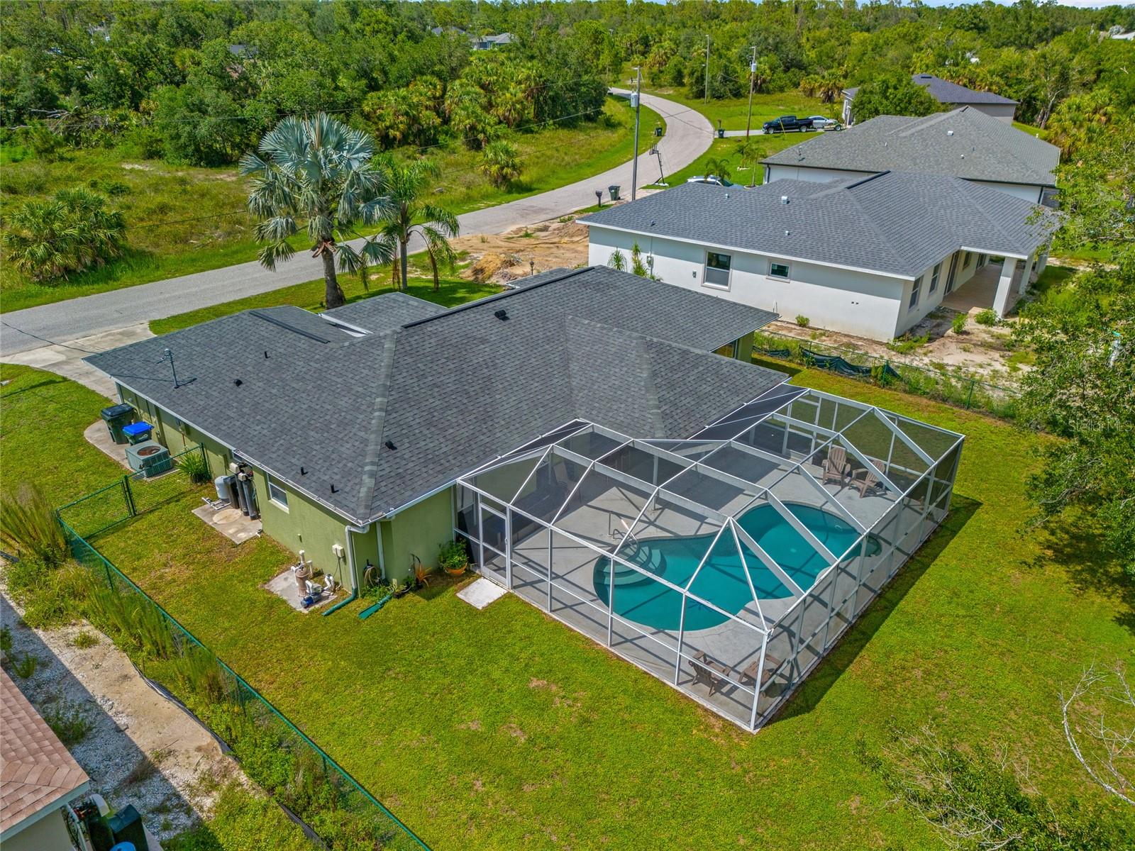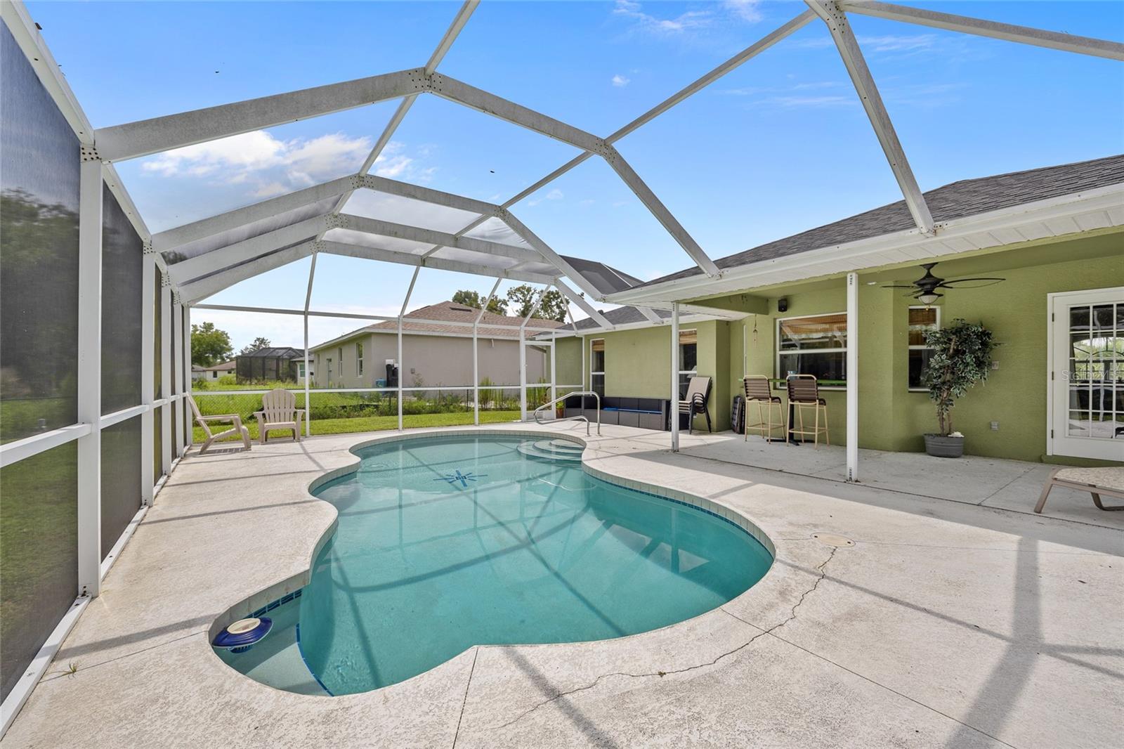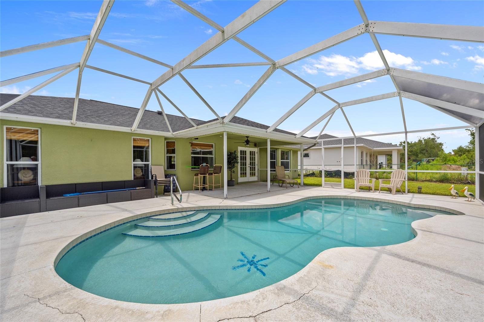 SPACIOUS 3 BEDROOM, 2 BATH, 2-CAR GARAGE CANAL FRONT POOL HOME IN NORTH PORT! This home features 1,623 sf of living space, high ceilings, laminate and tile flooring throughout. The kitchen offers an abundance of cabinetry, granite counters, stainless steel appliances, and breakfast bar that overlooks the dining and family room. Generous primary bedroom has views of the pool and lanai area, walk-in closet and private ensuite featuring dual sinks, soaker tub, and walk-in shower. Split floor plan ensures privacy, with two additional bedrooms sharing a full guest bath. Additional upgrades and features include newer roof 2022, hot water heater 2024, pool pump 2024, well pump 2024, water softener 2024, canal lot, nicely landscaped exterior, screen front entry and inside laundry room. Step outside to a covered lanai with screened pool overlooking fenced backyard with mature trees for privacy. Located near I-75, Murdock shopping and restaurant district, schools, hospitals and outdoor activities. Don’t miss this opportunity! Schedule your private showing today!