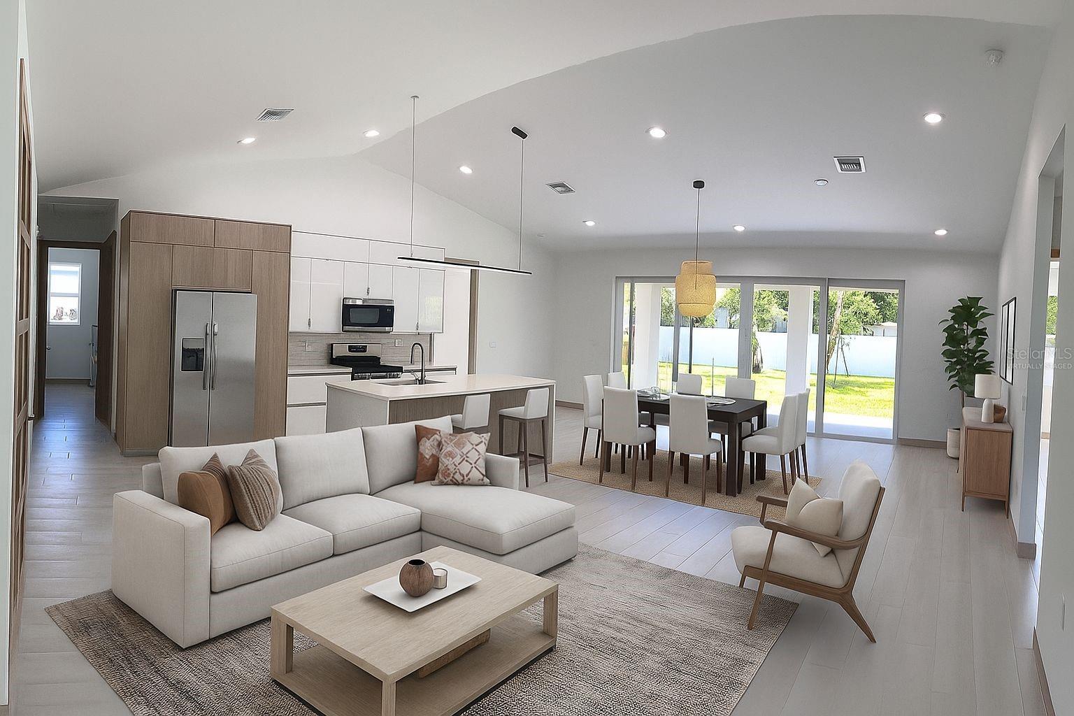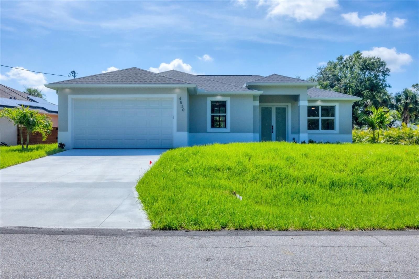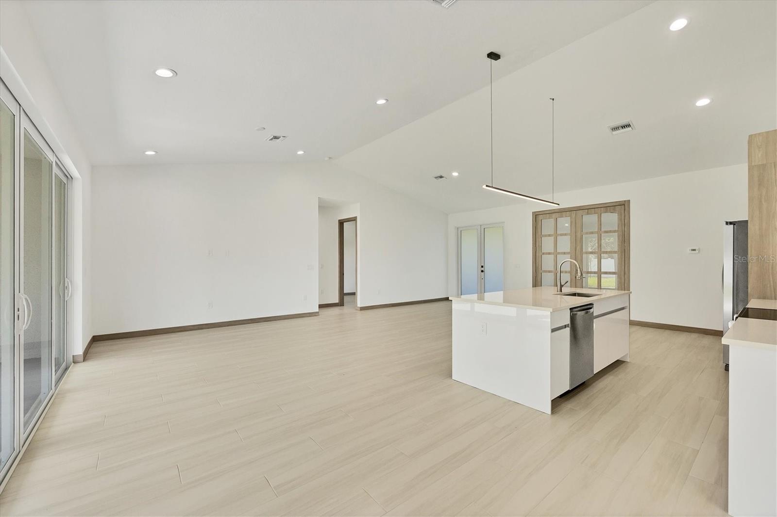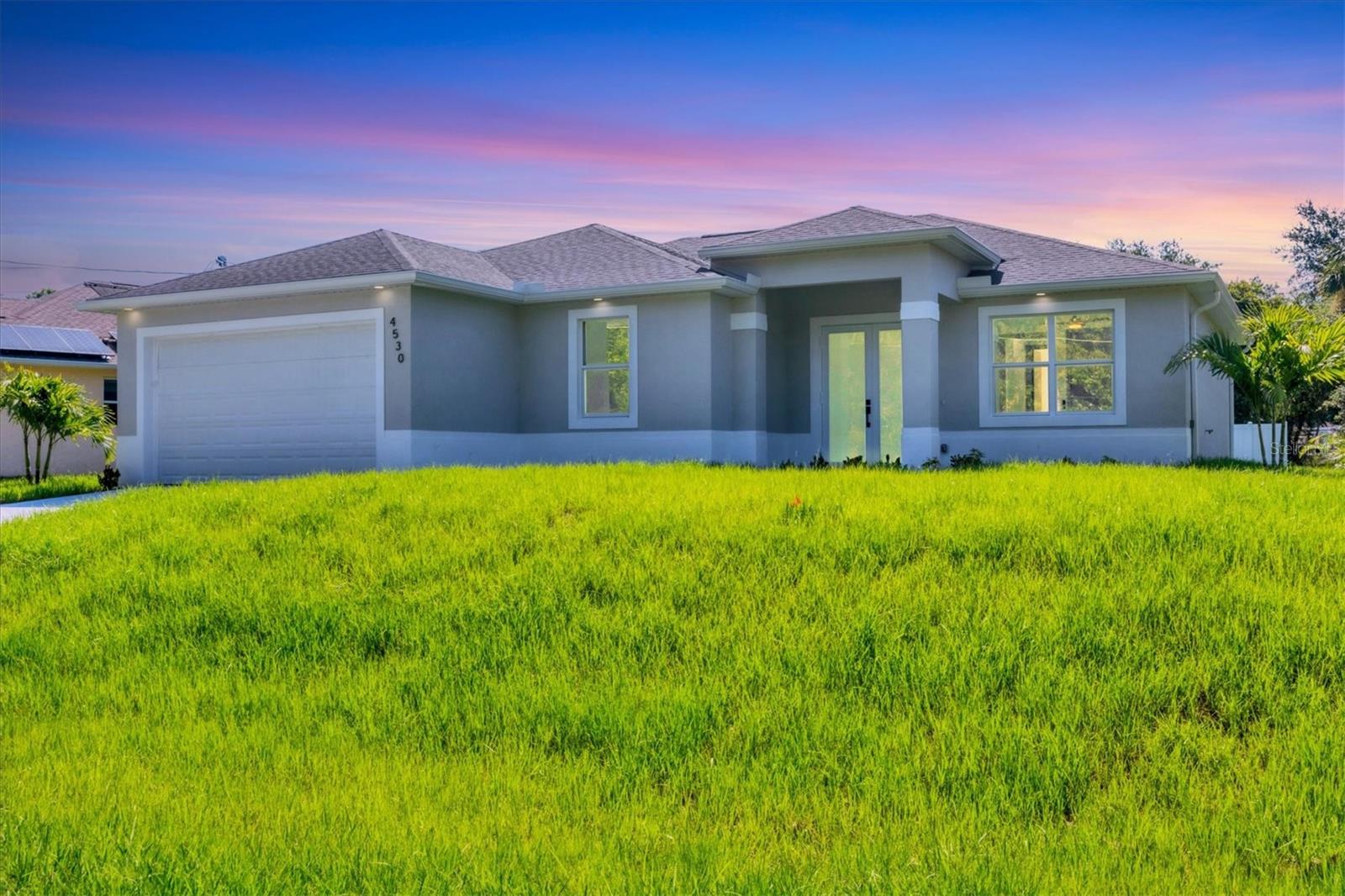 One or more photo(s) has been virtually staged. Stunning New Construction – Available for Purchase or Rent From the moment you arrive, the impressive 8-foot double glass doors welcome you into a bright, open-concept living space filled with recessed lighting and contemporary finishes. At the heart of the home is an amazing kitchen featuring quartz countertops, modern cabinetry, a gorgeous tile backsplash, and stainless steel appliances. Four 8-foot sliding glass doors create seamless indoor-outdoor living, opening to a spacious open patio — perfect for entertaining and relaxing. The home is outfitted with impact-rated windows and doors for peace of mind, along with a smart MyQ garage door opener, a full gutter system, and an efficient sprinkler system to keep the landscaping lush. Inside, you'll find tile flooring throughout, elegant quartz surfaces in both the kitchen and baths, and a dedicated home office enhanced by French glass doors. The spacious laundry room includes a convenient mop sink, and the oversized primary closet provides abundant storage. Ceiling fans with remotes and modern hardware and light fixtures add to the home’s stylish aesthetic. Plus, with fencing already in place on two sides from neighboring homes, you’re well on your way to a fully enclosed backyard. This move-in-ready gem offers exceptional quality and attention to detail in a desirable neighborhood. Available for purchase or for rent at $2,600/month, with a $2,600 security deposit, application fee, and lease preparation fee. Schedule your private showing today — homes like this don't last long! One or more pictures have been virtually staged.