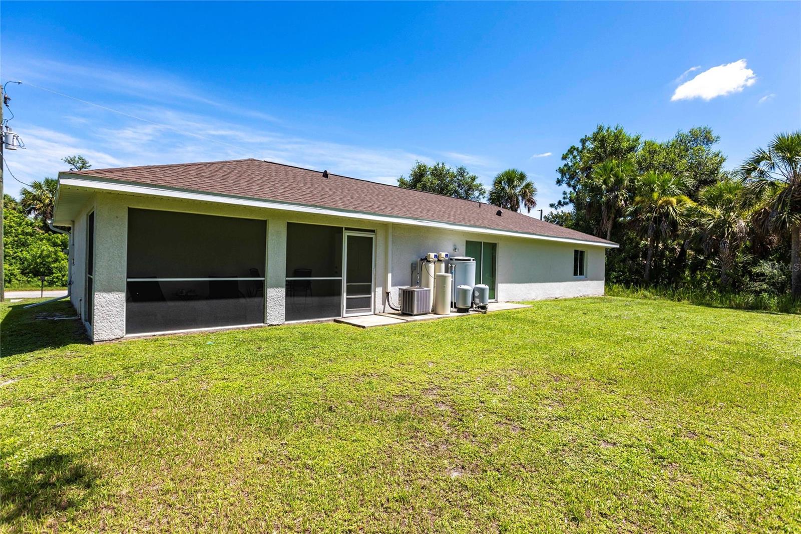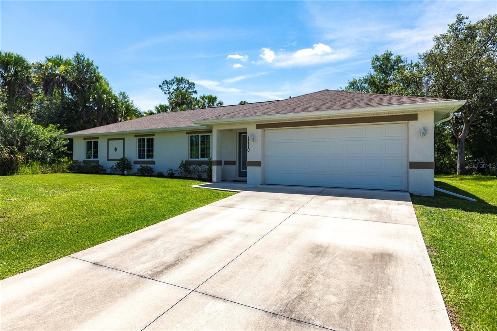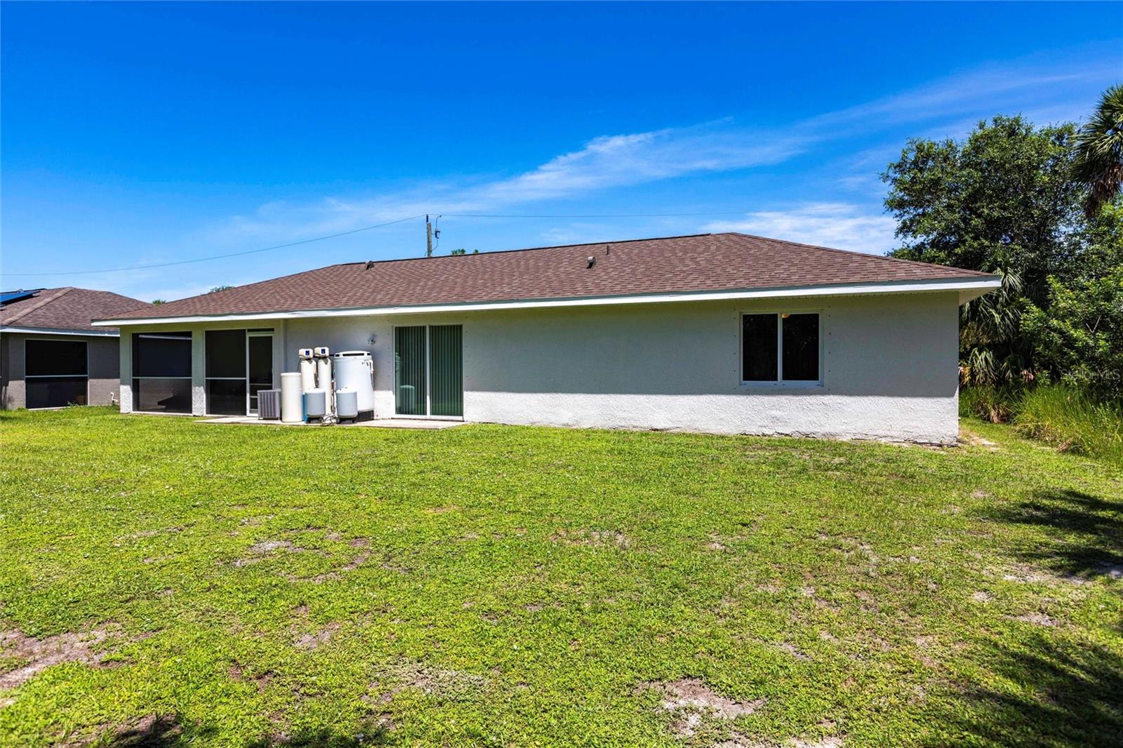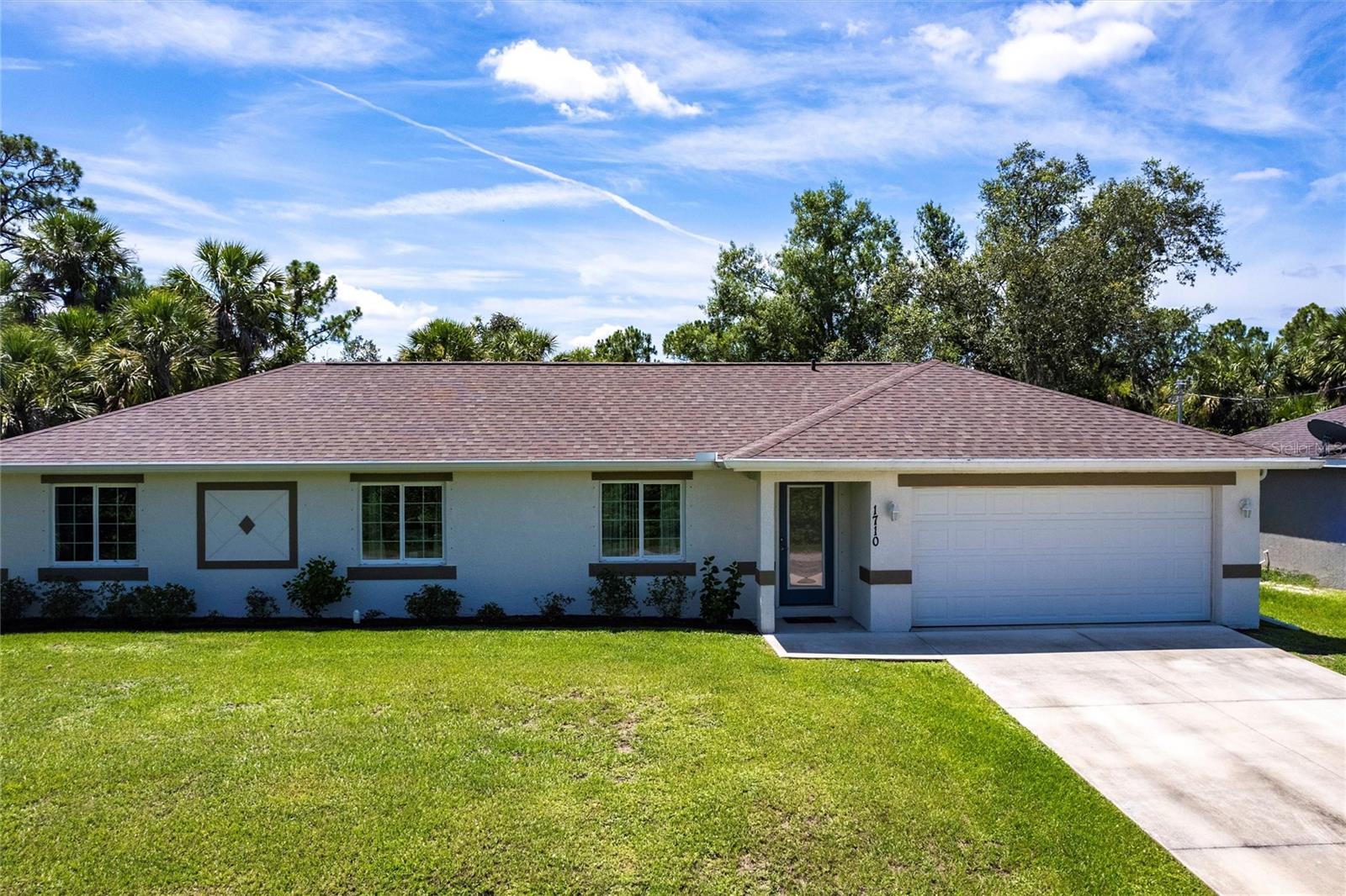 Welcome to your dream home! This beautifully maintained 3-bedroom, 2-bathroom, 2 car garage residence offers 1,192 square feet of modern living space, situated on a spacious 10,000-square-foot lot. Recently updated with a new roof (2023), this home showcases a smart open split floor plan with soaring ceilings, blending style and function effortlessly. As you step inside, you'll immediately notice the wood laminate flooring throughout the home, creating a warm and inviting atmosphere. The kitchen is outfitted with Shaker style wood cabinetry, stainless steel appliances, granite countertops, breakfast bar and is open to the dining/living room. The open-concept design seamlessly connects the kitchen to the spacious living and dining room, that leads to the expansive lanai ideal for outdoor entertaining or simply relaxing. The primary bedroom is a true sanctuary. The en-suite bath includes a walk-in shower, extended vanity, and a convenient linen closet. Two additional well-sized guest bedrooms, each with built-in closets, share a full bathroom, ensuring comfort and privacy for family and visitors. The large backyard is a blank canvas with plenty of space for a pool, providing endless opportunities for outdoor living. Surrounded by lush, wooded land in the back, the property provides a serene and peaceful outdoor retreat. The two-car garage includes a dedicated laundry area, adding convenience and practicality to this already exceptional home. With hurricane shutters, water heater and A/C system (2021), water filtration this home is ready for years of worry-free living. Don’t miss the chance to own this beautifully updated property that blends modern features with ample space and a prime location! Situated in a desirable North Port neighborhood, this home is not located in a flood zone or subject to HOA fees. It’s conveniently close to I-75 and Tamiami Trail, with quick access to some of Florida’s best beaches. **PLEASE ENJOY THE 3D INTERACTIVE VIRTUAL TOUR ASSOCIATED WITH THIS LISTING**