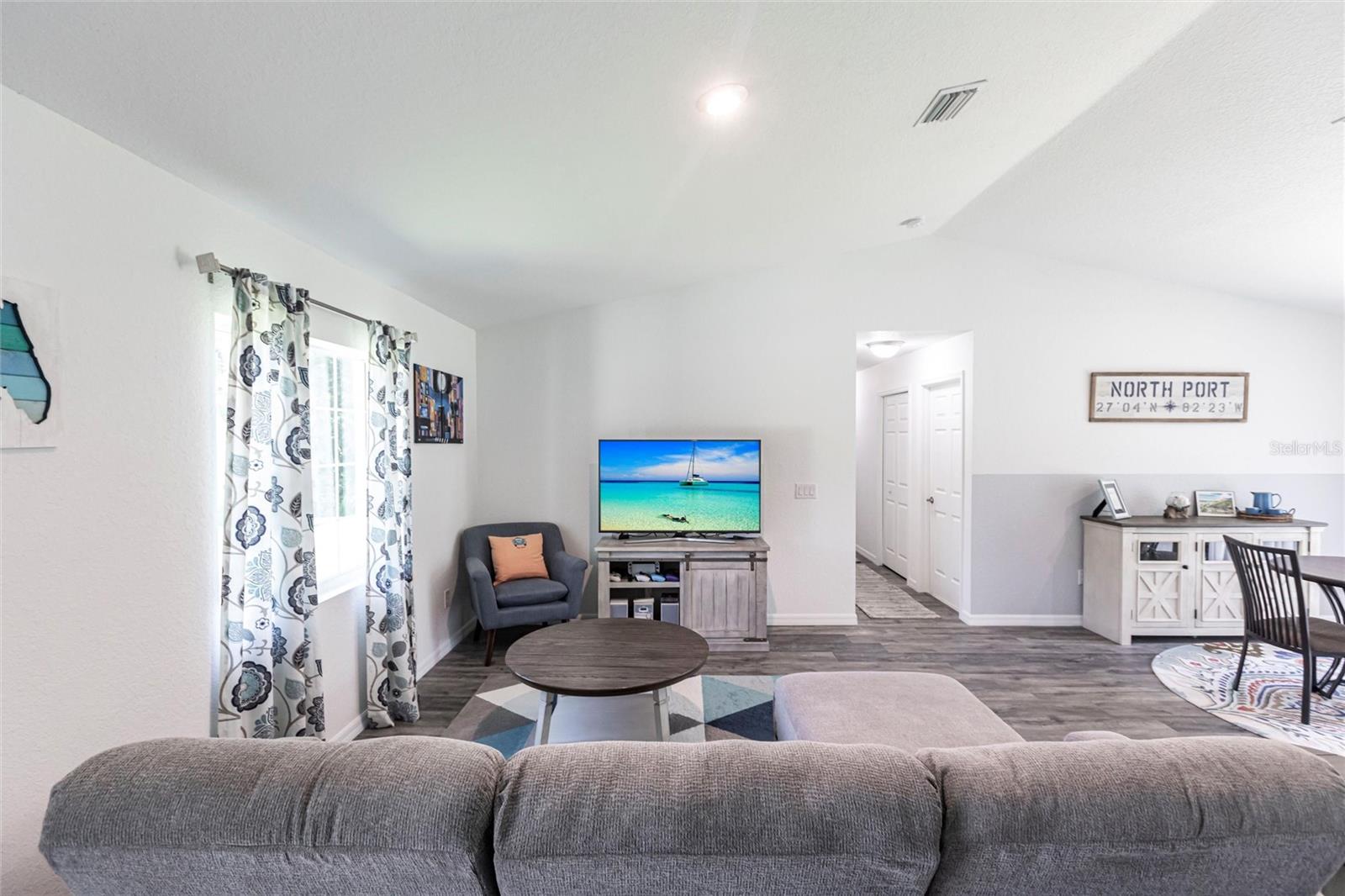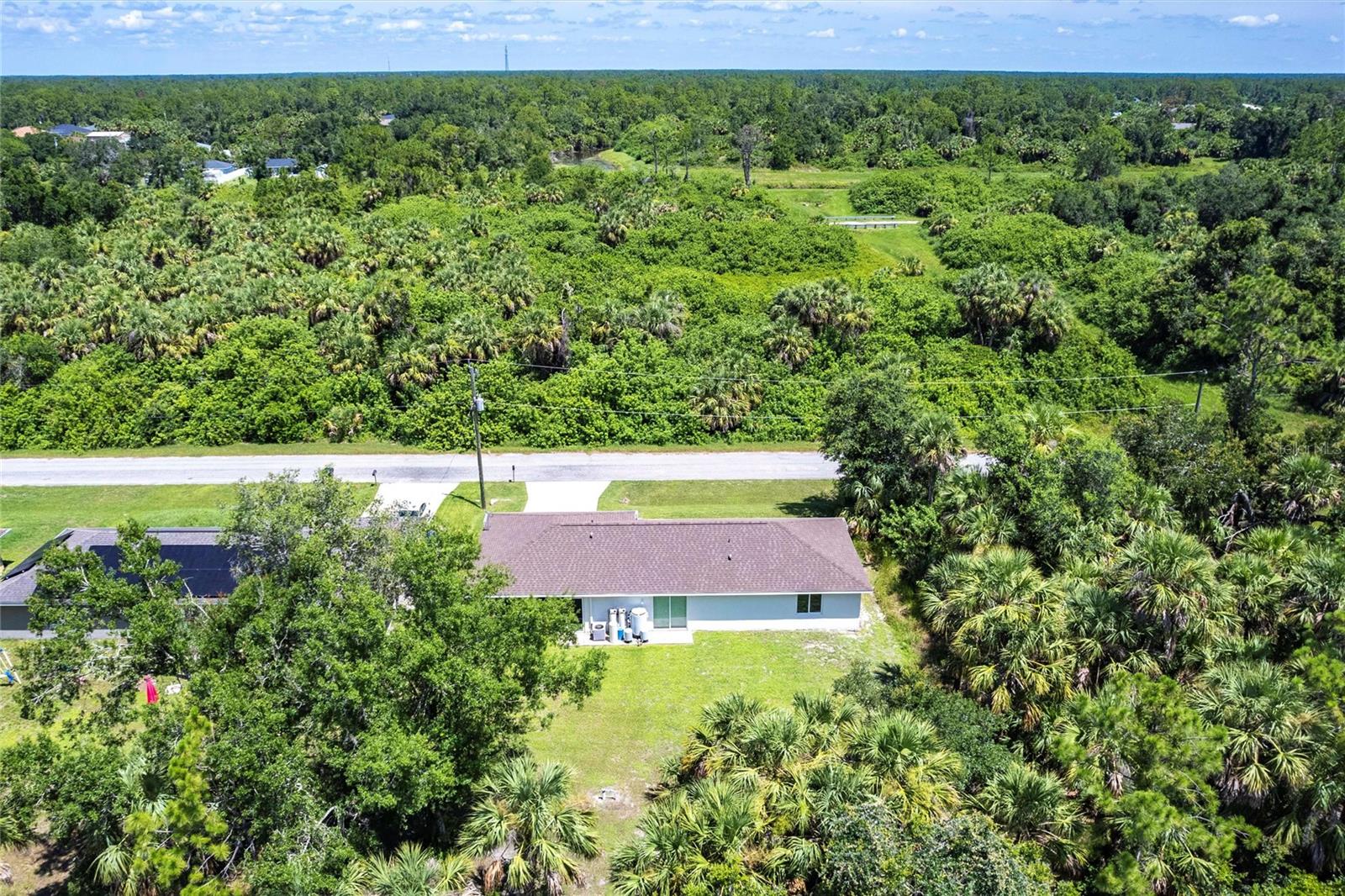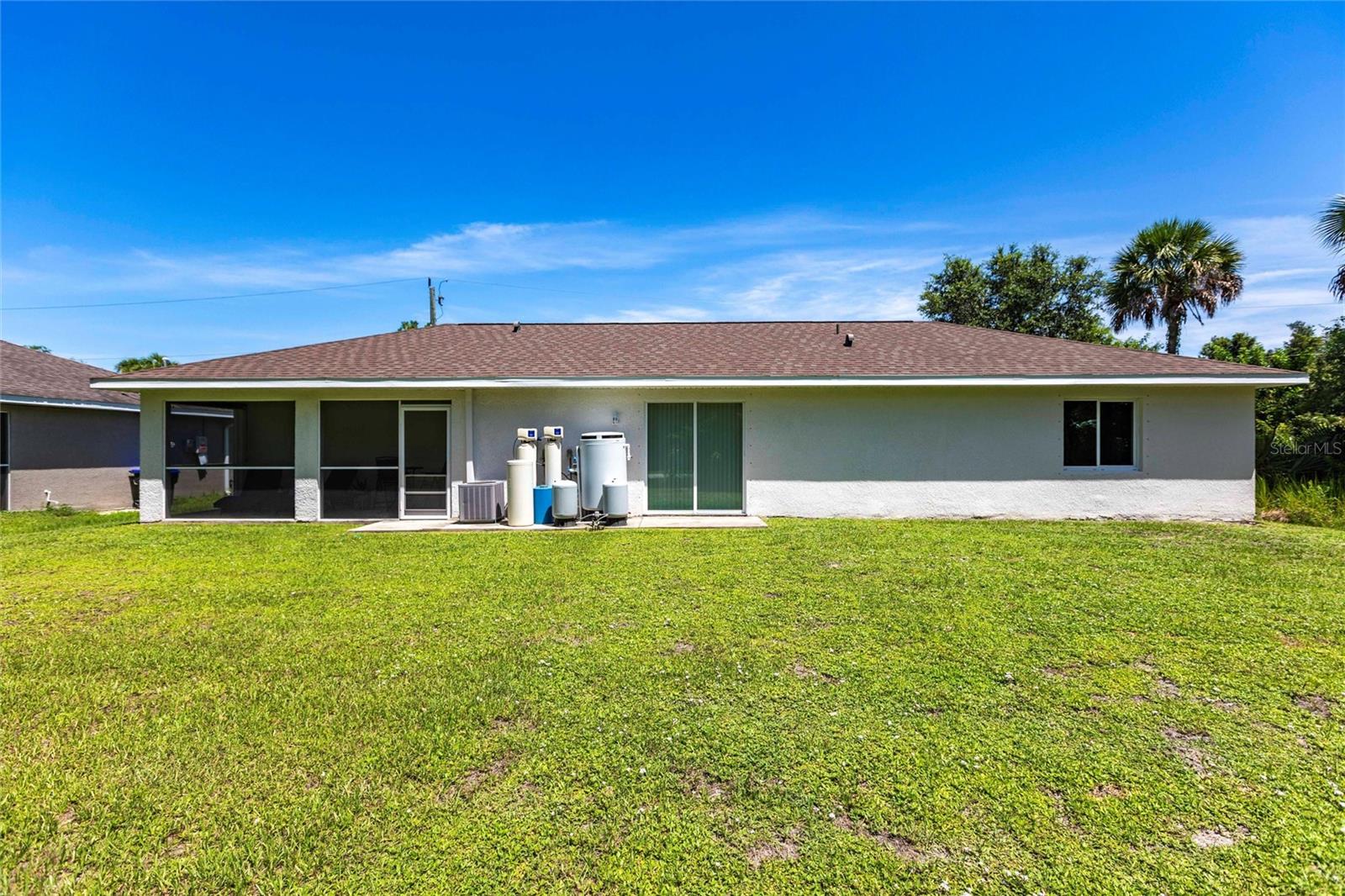 Welcome to your dream home! This beautifully maintained 3-bedroom, 2-bathroom, 2 car garage residence offers 1,192 square feet of modern living space, situated on a spacious 10,000-square-foot lot. Recently updated with a new roof (2023), this home showcases a smart open split floor plan with soaring ceilings, blending style and function effortlessly. As you step inside, you'll immediately notice the wood laminate flooring throughout the home, creating a warm and inviting atmosphere. The kitchen is outfitted with Shaker style wood cabinetry, stainless steel appliances, granite countertops, breakfast bar and is open to the dining/living room. The open-concept design seamlessly connects the kitchen to the spacious living and dining room, that leads to the expansive lanai ideal for outdoor entertaining or simply relaxing. The primary bedroom is a true sanctuary. The en-suite bath includes a walk-in shower, extended vanity, and a convenient linen closet. Two additional well-sized guest bedrooms, each with built-in closets, share a full bathroom, ensuring comfort and privacy for family and visitors. The large backyard is a blank canvas with plenty of space for a pool, providing endless opportunities for outdoor living. Surrounded by lush, wooded land in the back, the property provides a serene and peaceful outdoor retreat. The two-car garage includes a dedicated laundry area, adding convenience and practicality to this already exceptional home. With hurricane shutters, water heater and A/C system (2021), water filtration this home is ready for years of worry-free living. Don’t miss the chance to own this beautifully updated property that blends modern features with ample space and a prime location! Situated in a desirable North Port neighborhood, this home is not located in a flood zone or subject to HOA fees. It’s conveniently close to I-75 and Tamiami Trail, with quick access to some of Florida’s best beaches. **PLEASE ENJOY THE 3D INTERACTIVE VIRTUAL TOUR ASSOCIATED WITH THIS LISTING**