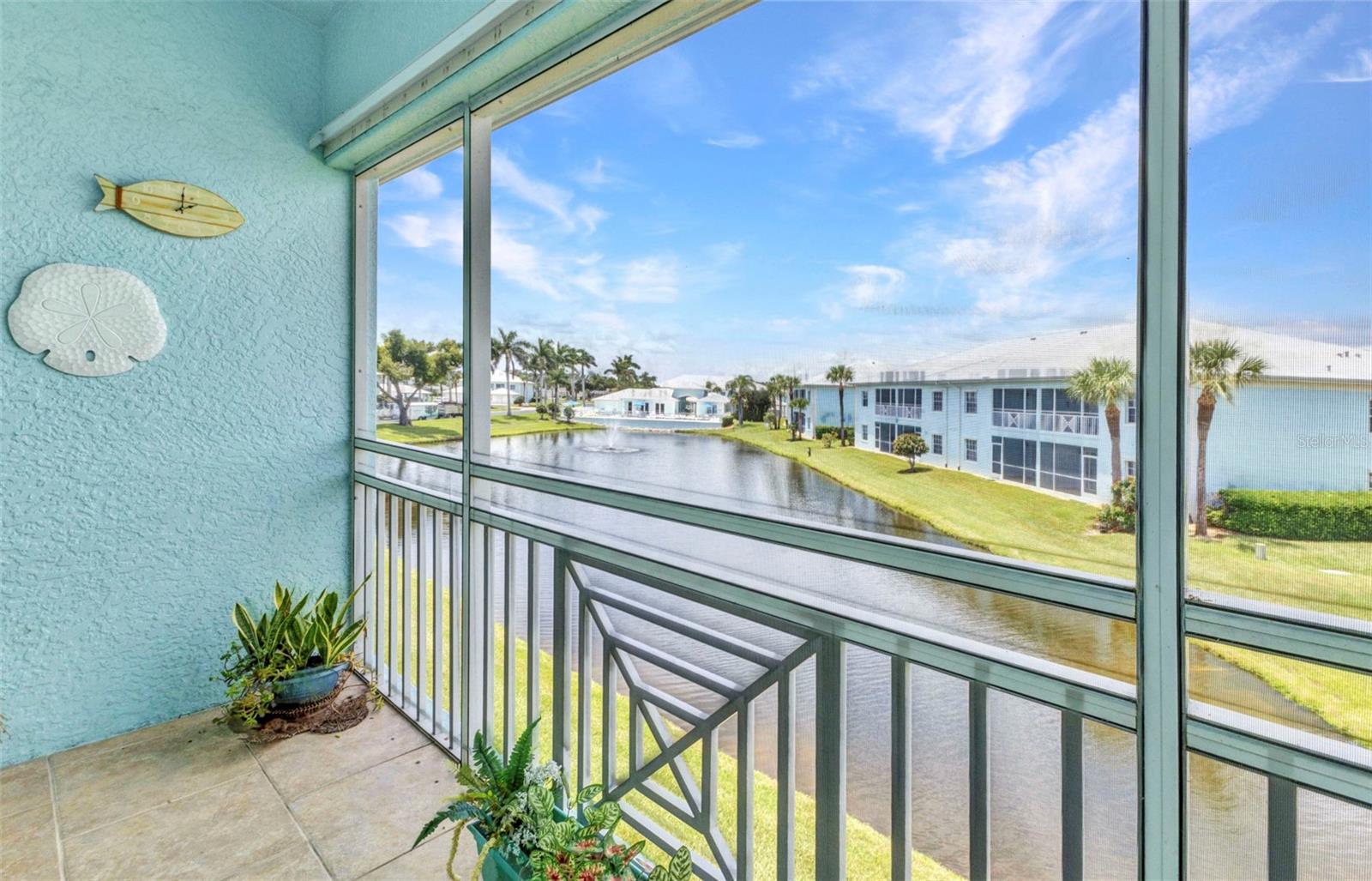 Discover this immaculate 2-bedroom, 2-bath condo with a den, featuring an open-concept floor plan, vaulted ceilings, and abundant natural light. Sliding glass doors from the dining and living areas lead to a private balcony overlooking a tranquil pond and fountain. The kitchen is equipped with a refrigerator, electric range, microwave, and dishwasher, all regularly maintained. Elegant water-resistant Parkay flooring, installed in 2022, flows throughout the home. The spacious primary suite boasts pond views, room for a king bed, dual closets plus a walk-in closet, and an ensuite bath with a large step-in shower. A true split floor plan places the second bedroom and full bath with tub/shower on the opposite side. Recent updates include hurricane shutters (2024) and a rescreened balcony (2025). Sabal Trace Colony offers resort-style amenities: a heated pool, fitness center, clubhouse, and walking paths—all with maintenance-free living. Conveniently close to shopping, dining, golf, and Gulf Coast beaches!