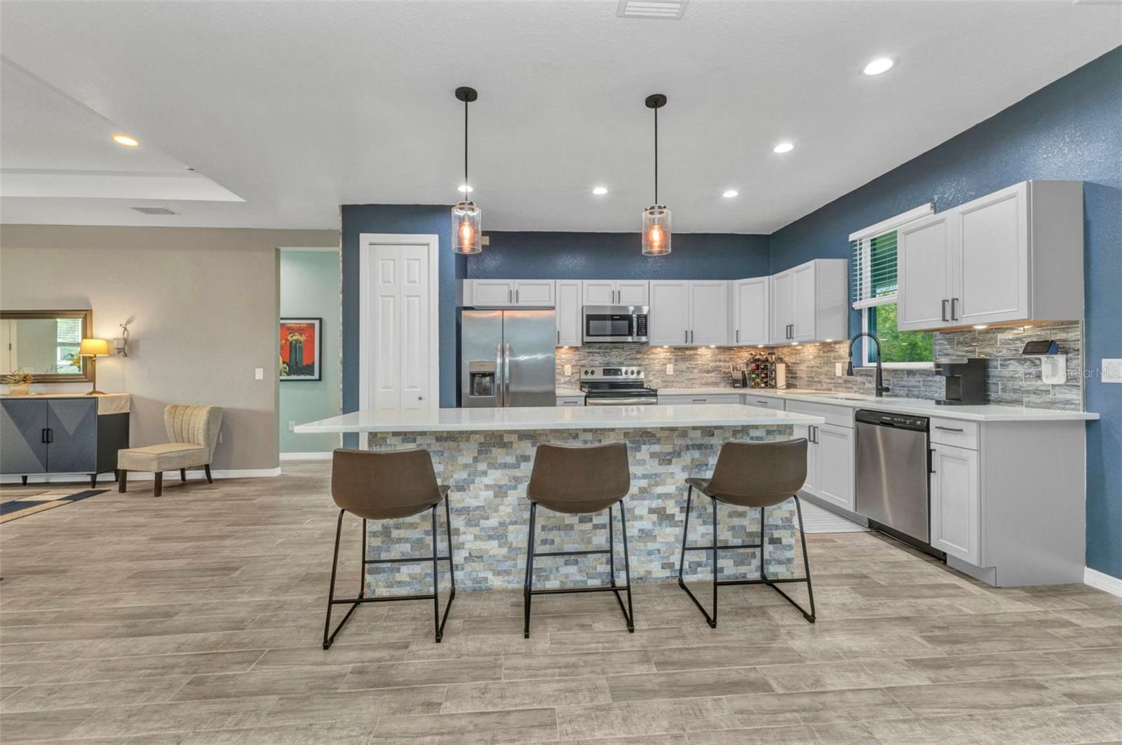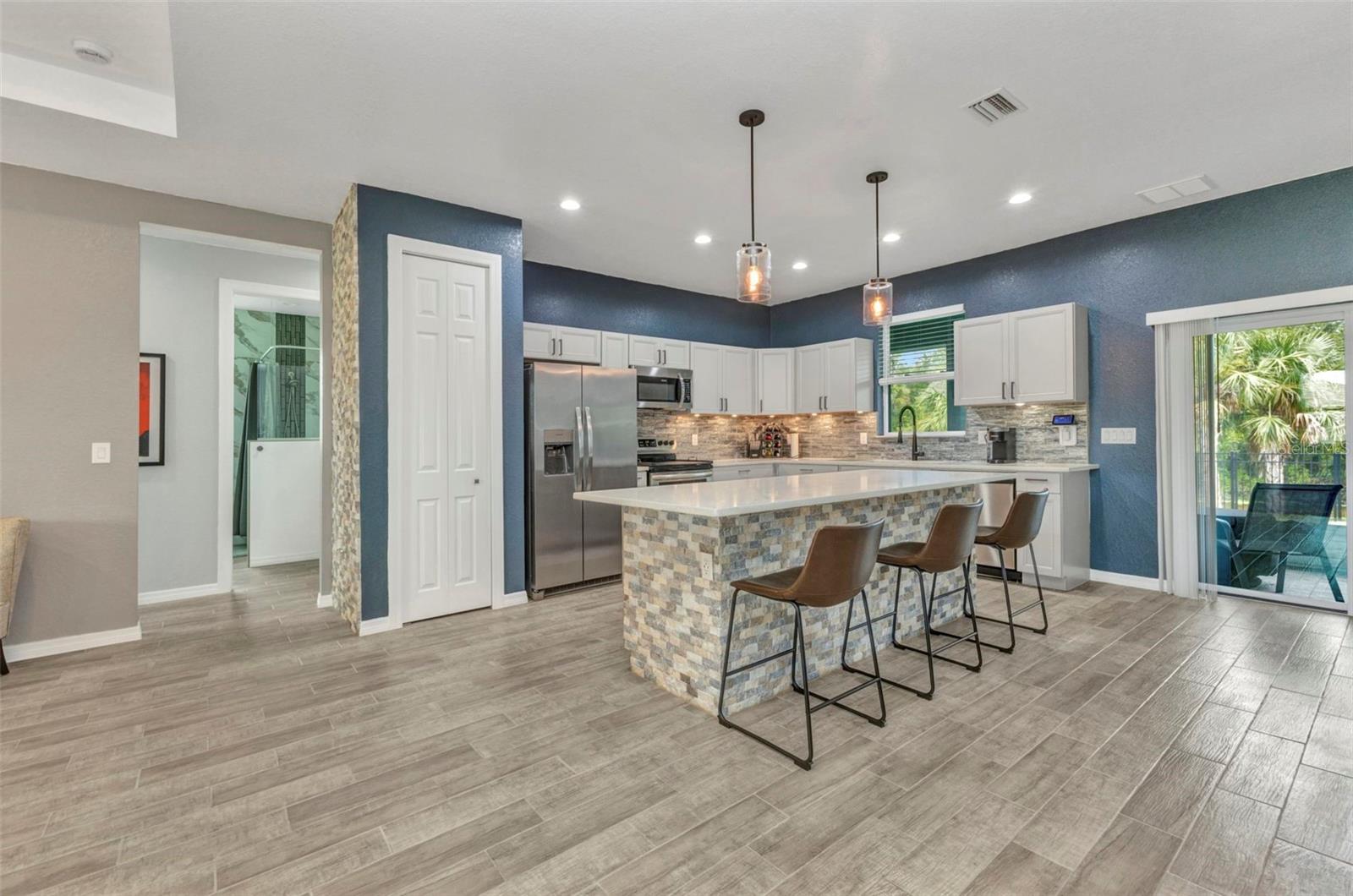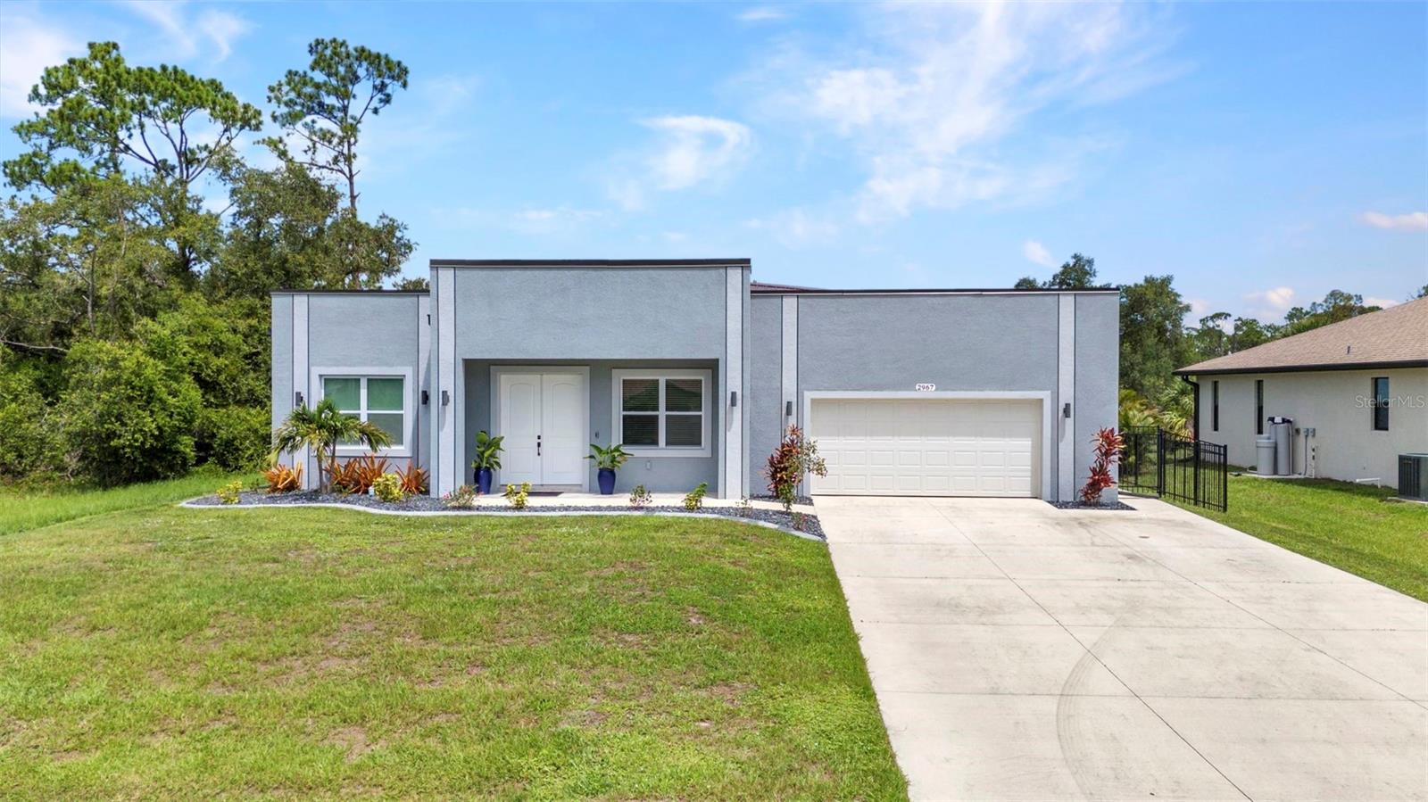 Stunning 2023 built modern 3 Bedrooms, 2 1/2 Baths, WATERFRONT masterpiece offers a rare blend of style, strength, sophistication and hurricane-resistant construction. Built with solid concrete block walls and a sleek metal roof designed without overhangs for optimal wind protection, this home is fully equipped with impact-rated windows, exterior and sliding doors, and a reinforced impact garage door. Inside, you'll find soaring 10-foot ceilings, 8-foot doors throughout, sleek ceramic tile floors, and tile-to-ceiling bathrooms. The expansive chef’s kitchen features an oversized quartz island, pantry, and stainless steel appliances including a double-door refrigerator with water and ice dispenser. A spacious laundry room with an utility sink. Smart details include LED lighting, anti-fog LED mirrors, remote-controlled ceiling, and modern heavy-duty door hardware. Enjoy indoor-outdoor living with screened in patio access from the kitchen, primary suite, and third bedroom. The primary closet is reinforced and can function as a safe room. Additional highlights include an oversized 2 car garage with extended wide driveway, aluminum fencing, rain gutters, and beautiful views of a fresh water canal. This unique home is packed with thoughtful features and high-end finishes—come see the details in person before it’s gone!