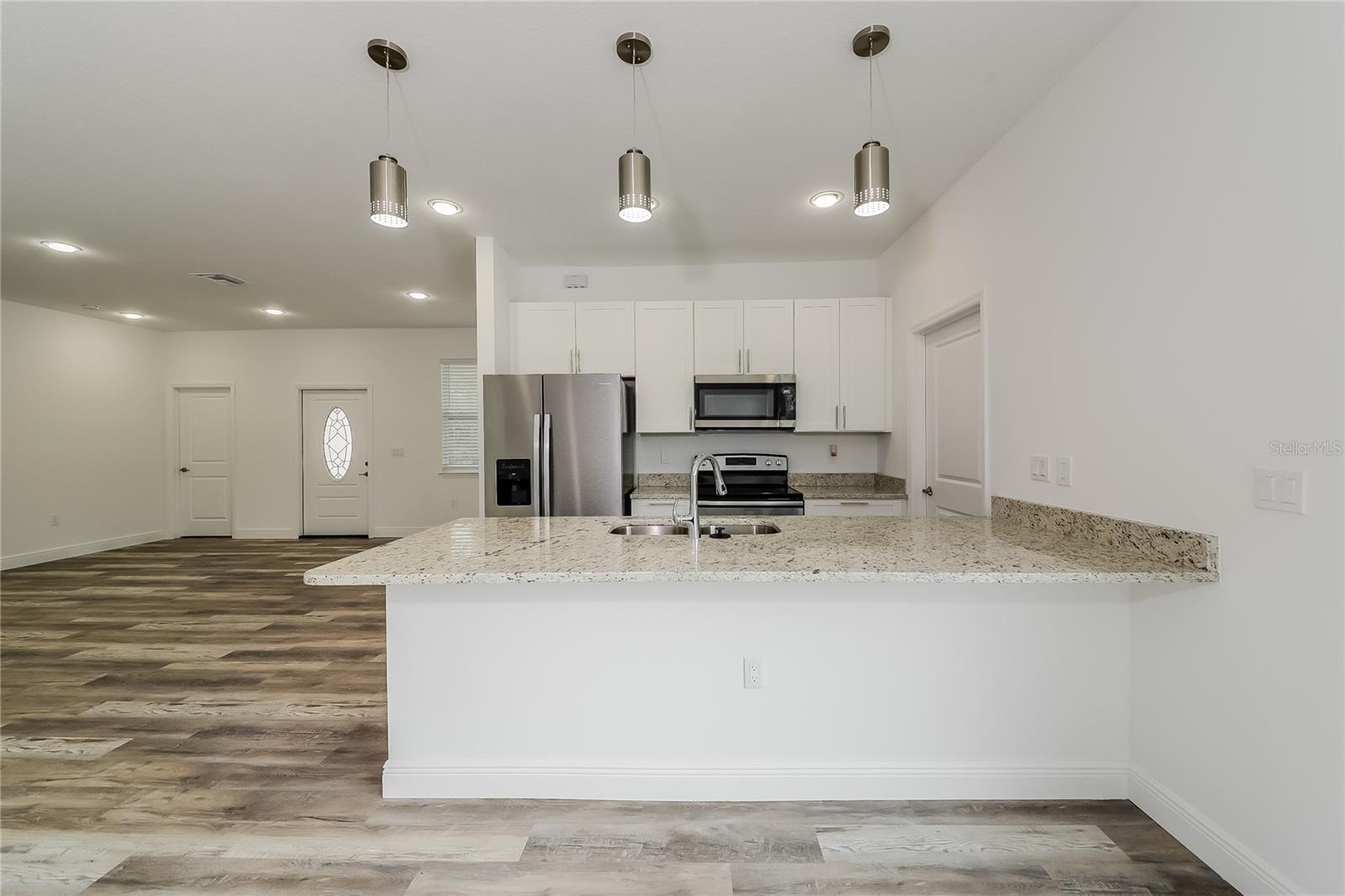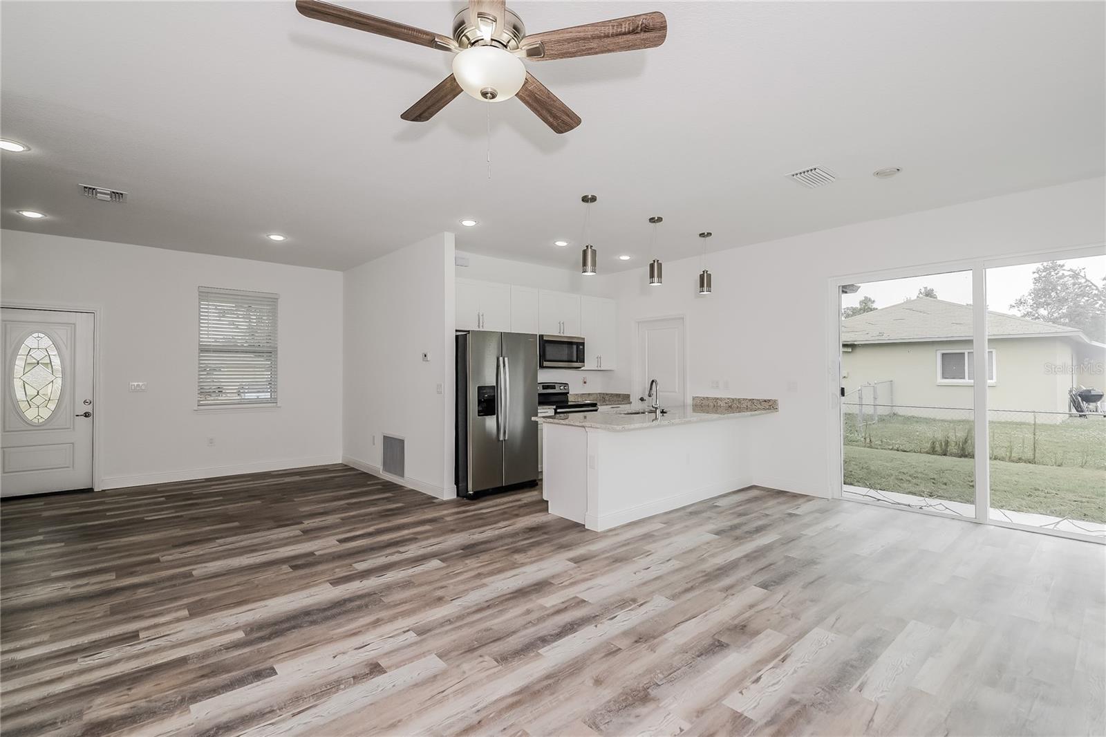 This updated 3-bedroom, 2-bath home is move-in ready and has a great open layout. The kitchen comes with granite countertops, stainless steel appliances, and a breakfast bar that connects seamlessly to the living and dining areas. Durable vinyl flooring runs throughout, creatinf a bright and clean atmosphere. Situated on a quiet street with convenient access to shopping, schools, and more. Vacant and easy to show!