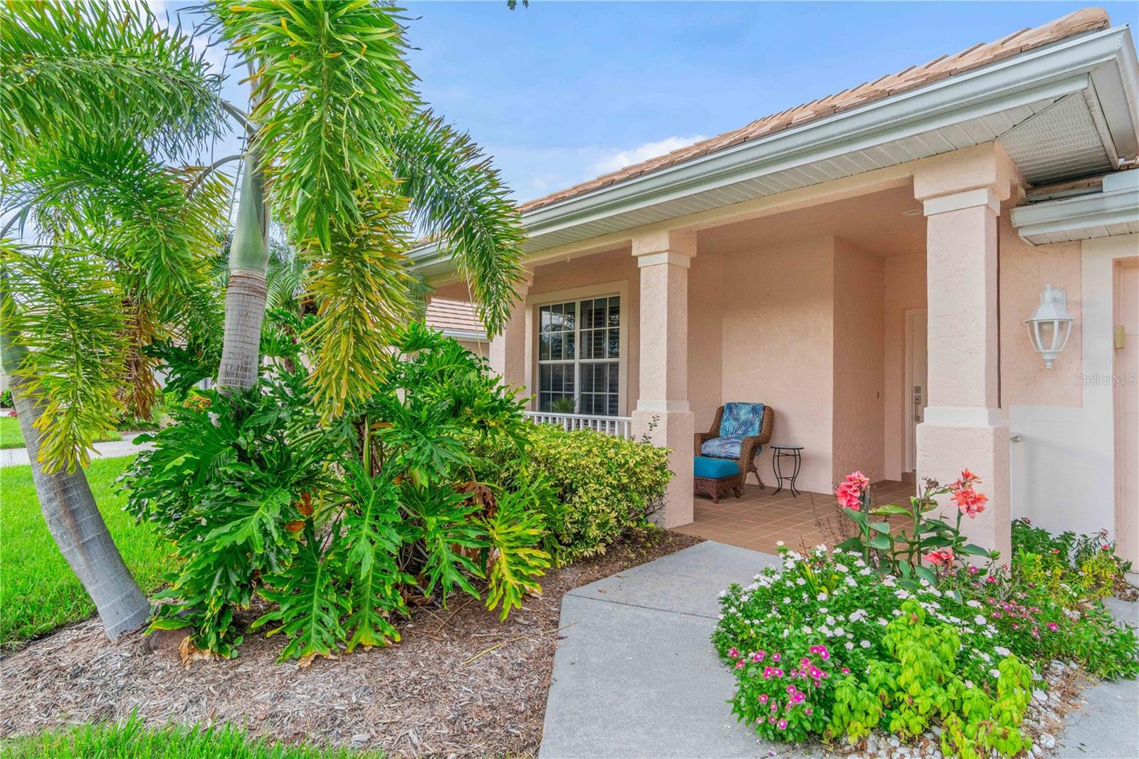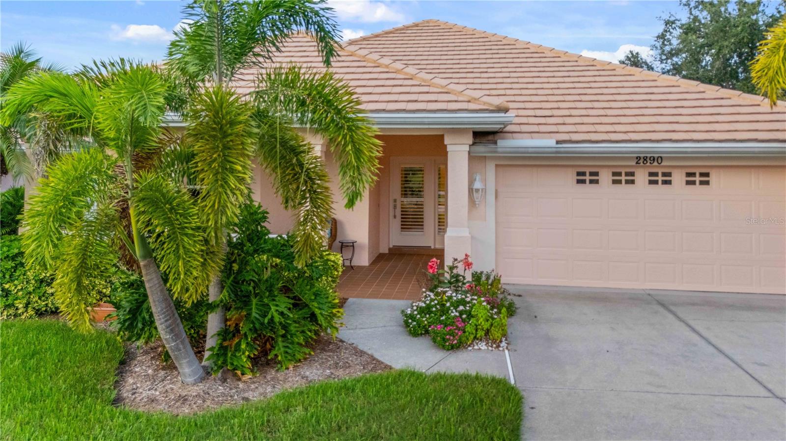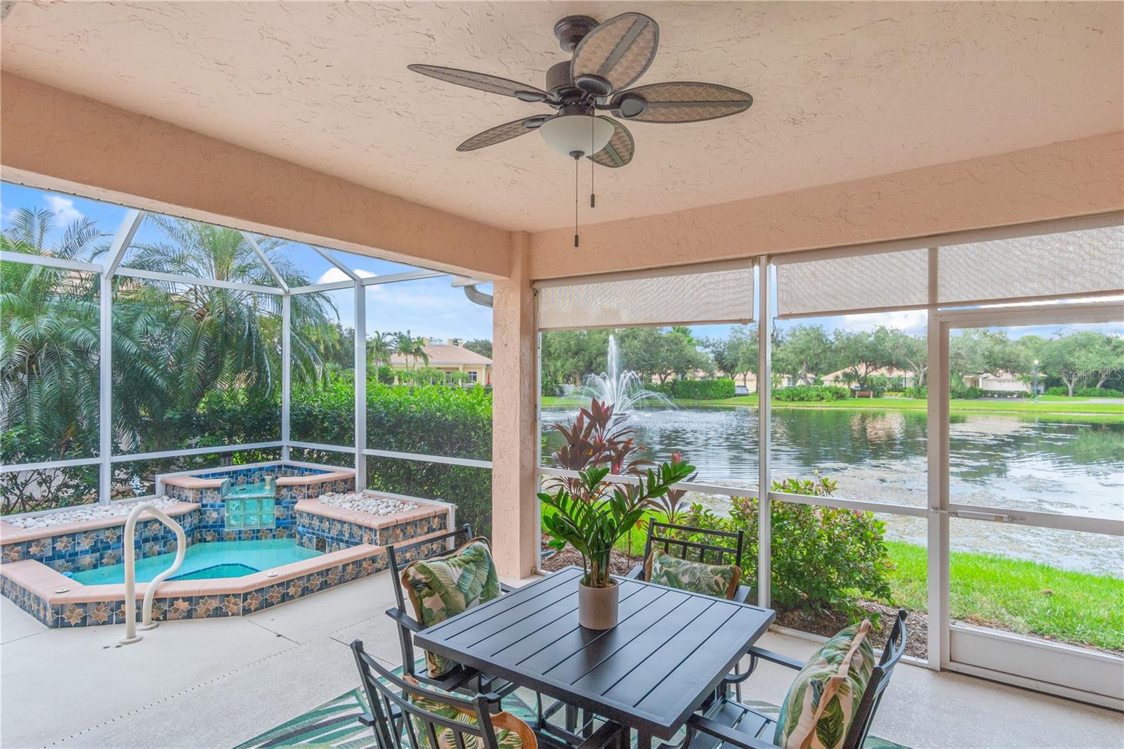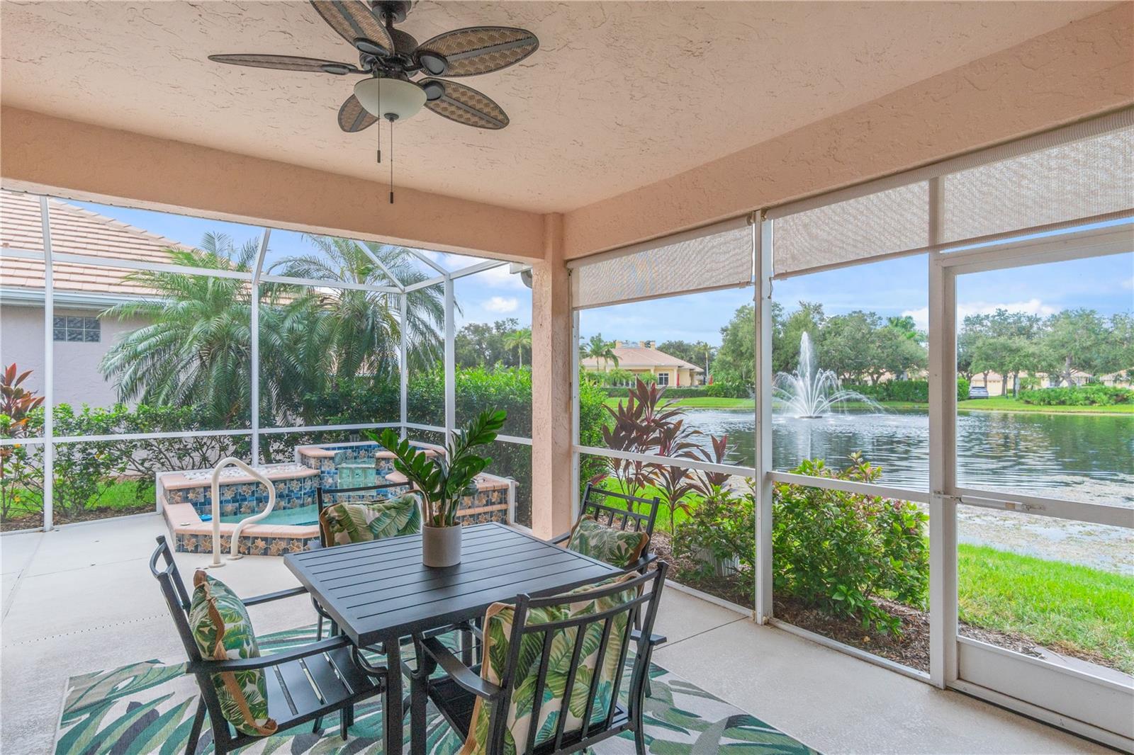 Enjoy this private gated and beautifully landscaped community with sidewalks, pond fountains, park benches, and lantern-lit streets. This recently painted, meticulously maintained home is at the end of a private cul-de-sac and offers the perfect blend of comfort and style. Inside, you’ll find move-in ready 3 bedrooms, 2 full baths, impact glass windows, plantation window shutters, crown molding, tray ceilings, and updated plank ceramic tile flooring. A full-sized laundry room with cabinets and utility sink adds convenience. The covered front porch leads into a spacious foyer with arched doorways, tray ceiling and welcoming wet bar. The well-equipped kitchen is designed for entertaining, featuring ample cabinets, pull out sliding shelving, a serving island, breakfast bar, tray ceiling and dinette area. The open living space has ceramic tile plank flooring and flows seamlessly to the outdoors through triple sliding glass doors. Step onto the expansive wrap-around screened lanai with a private spa looking out to the attractive pond with lighted fountain—ideal for morning coffee or relaxing evenings. The spacious master suite with double sliders offers lanai access, a walk-in closet, and a private en-suite bath with double sinks and a Roman walk-in shower. A split-bedroom layout ensures privacy for guests, with two additional bedrooms and a conveniently located full guest bath. Quality curb appeal includes a tile roof, mature landscaping, inviting front porch, long and wide expanded driveway. Community amenities include resort-style tropical pool with sundeck, clubhouse with fitness room, library, and billiards, patio with tables and umbrellas. Whether living here full-time or seasonally, you’ll enjoy a low-maintenance lifestyle with low HOA fees, no CDD fees, and X flood zone. Centrally located just 15 minutes to Wellen Park, golf, beaches, MLB spring training baseball, boat launches, world class fishing, biking and walking paths, shopping, and medical facilities.