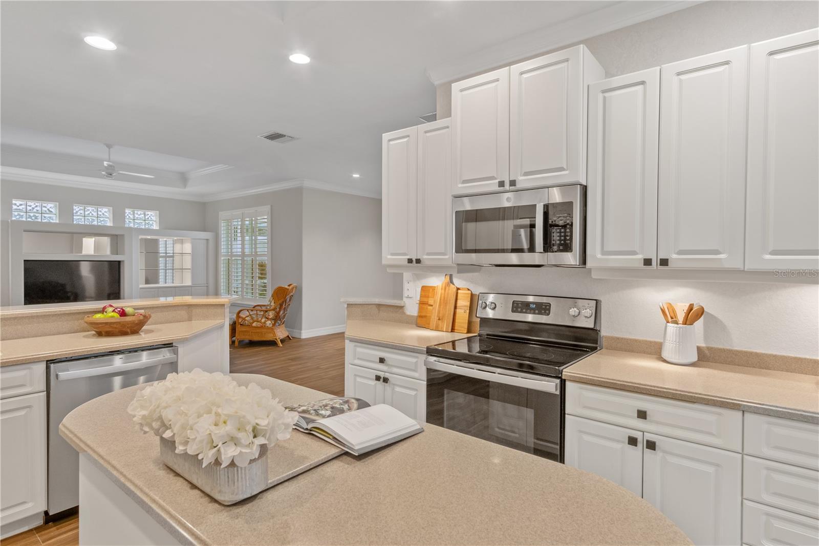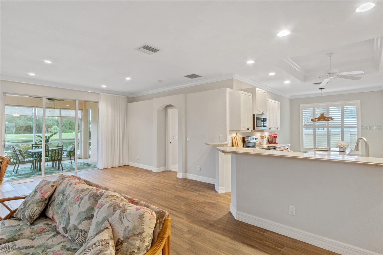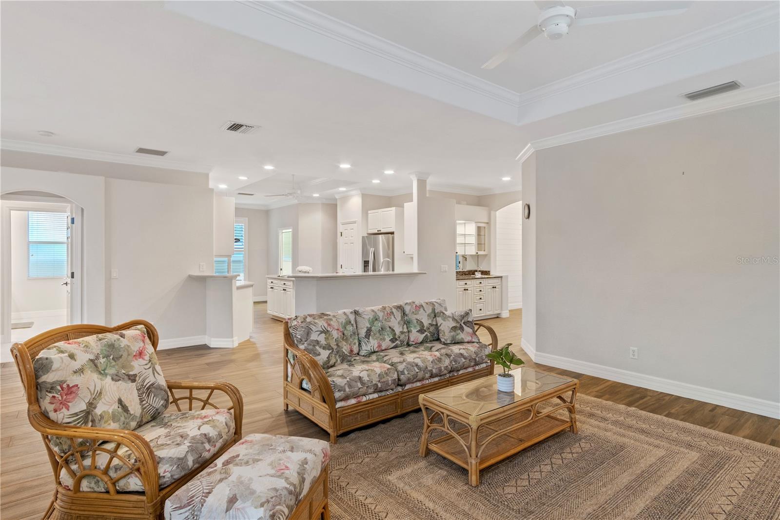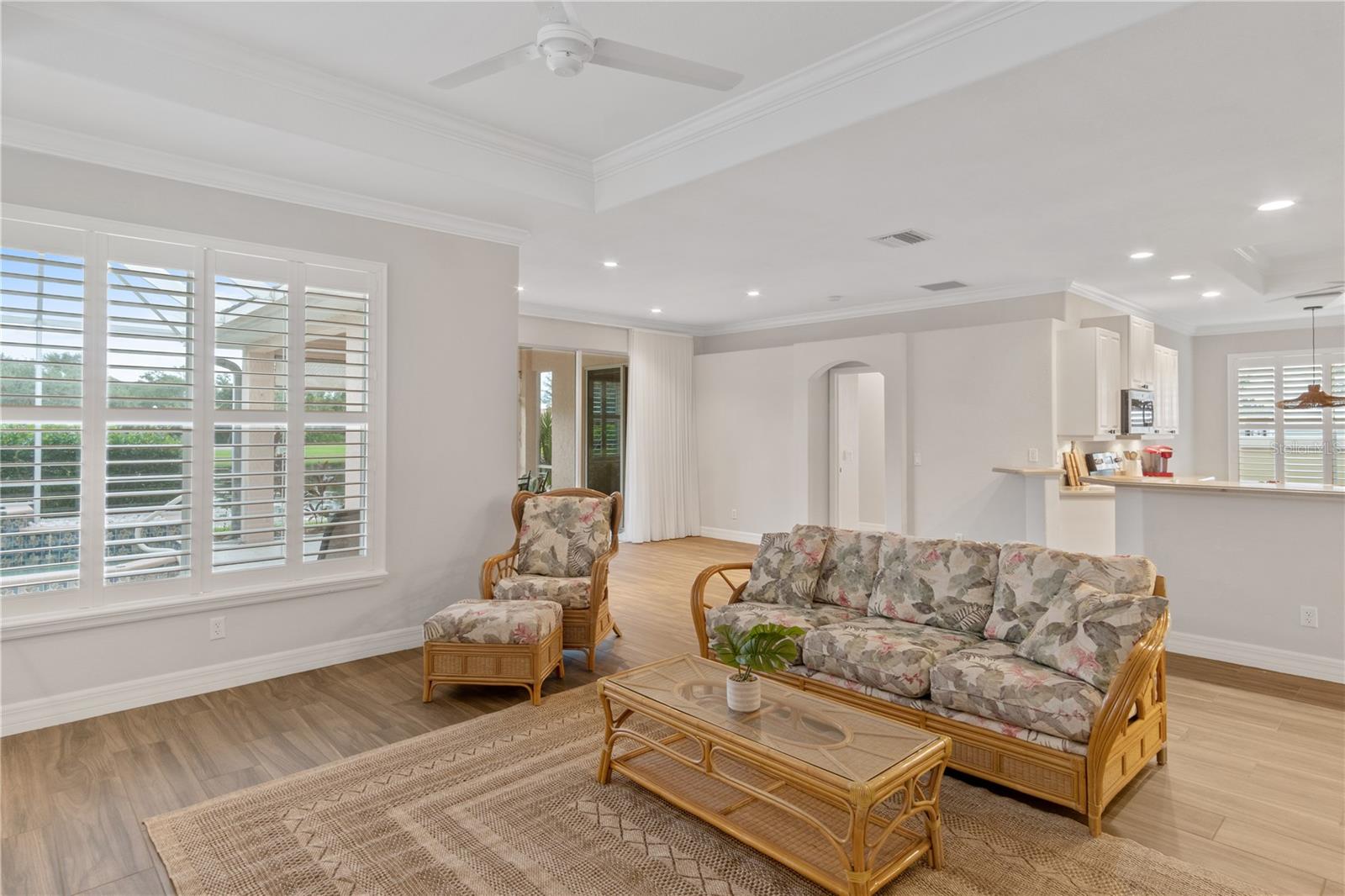 Enjoy this private gated and beautifully landscaped community with sidewalks, pond fountains, park benches, and lantern-lit streets. This recently painted, meticulously maintained home is at the end of a private cul-de-sac and offers the perfect blend of comfort and style. Inside, you’ll find move-in ready 3 bedrooms, 2 full baths, impact glass windows, plantation window shutters, crown molding, tray ceilings, and updated plank ceramic tile flooring. A full-sized laundry room with cabinets and utility sink adds convenience. The covered front porch leads into a spacious foyer with arched doorways, tray ceiling and welcoming wet bar. The well-equipped kitchen is designed for entertaining, featuring ample cabinets, pull out sliding shelving, a serving island, breakfast bar, tray ceiling and dinette area. The open living space has ceramic tile plank flooring and flows seamlessly to the outdoors through triple sliding glass doors. Step onto the expansive wrap-around screened lanai with a private spa looking out to the attractive pond with lighted fountain—ideal for morning coffee or relaxing evenings. The spacious master suite with double sliders offers lanai access, a walk-in closet, and a private en-suite bath with double sinks and a Roman walk-in shower. A split-bedroom layout ensures privacy for guests, with two additional bedrooms and a conveniently located full guest bath. Quality curb appeal includes a tile roof, mature landscaping, inviting front porch, long and wide expanded driveway. Community amenities include resort-style tropical pool with sundeck, clubhouse with fitness room, library, and billiards, patio with tables and umbrellas. Whether living here full-time or seasonally, you’ll enjoy a low-maintenance lifestyle with low HOA fees, no CDD fees, and X flood zone. Centrally located just 15 minutes to Wellen Park, golf, beaches, MLB spring training baseball, boat launches, world class fishing, biking and walking paths, shopping, and medical facilities.