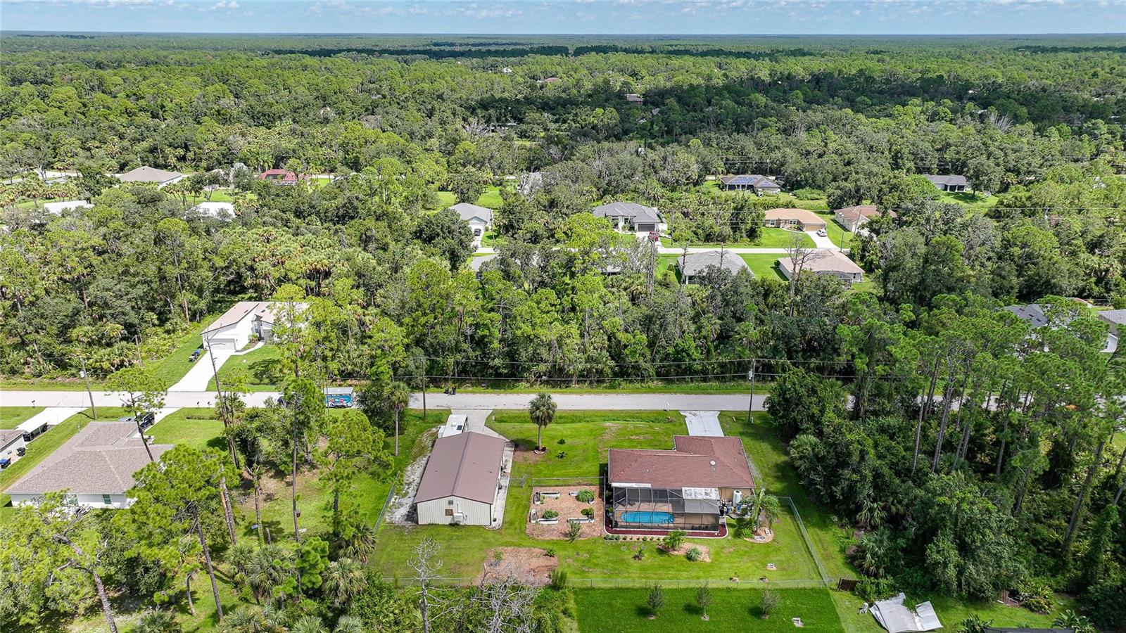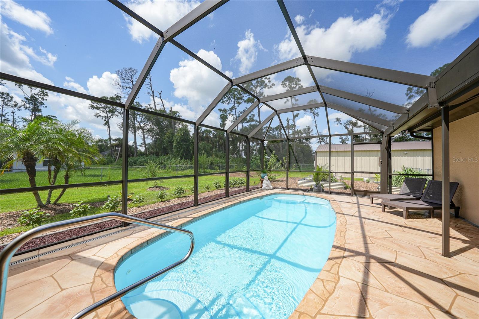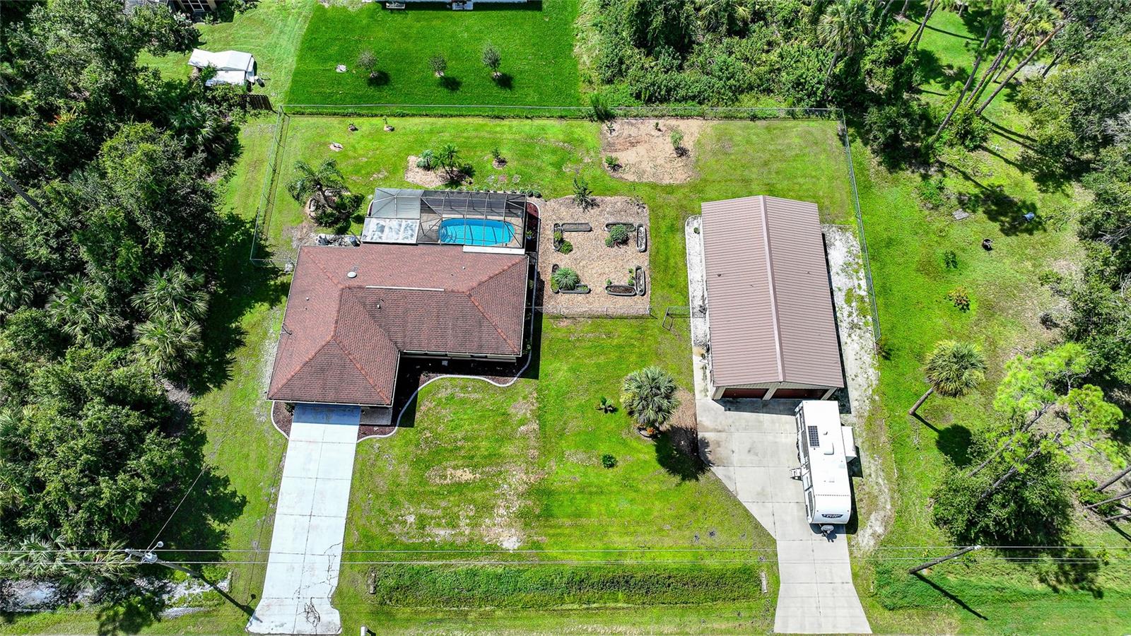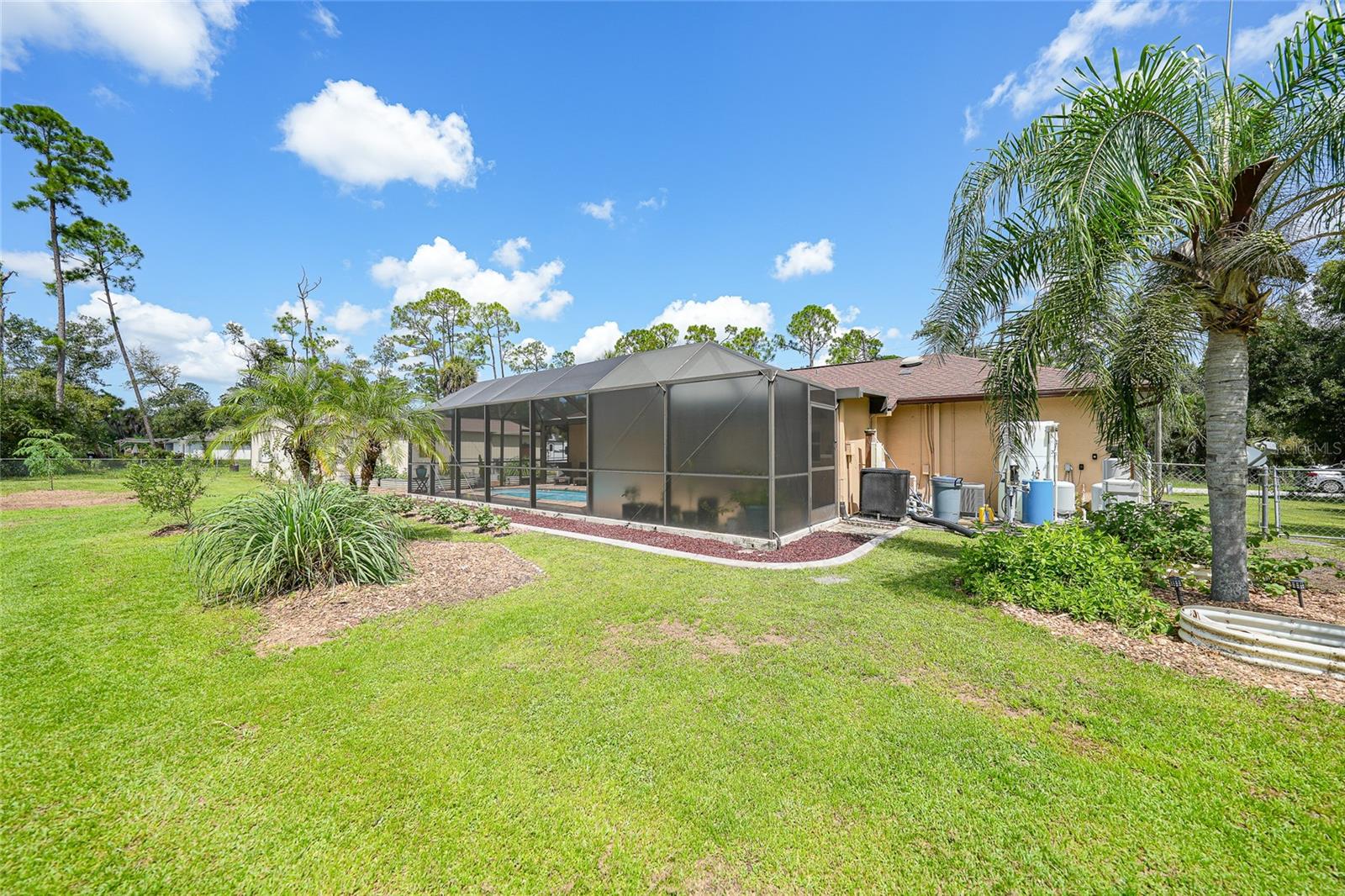 Come see this charming 3-bedroom, 2-bath home on a double lot in desirable North Port Estates! This exceptionally maintained home offers the perfect blend of freedom, space, and modern upgrades all with NO HOA fees, NO deed restrictions, and NO FLOOD ZONE. It also offers 1500 ADDITIONAL SQUARE FEET OF FLEX SPACE. Situated on nearly half an acre of fully fenced land, this property is a private tropical oasis complete with lush landscaping and tropical fruit trees.The heated pool and screened lanai invites year-round enjoyment, creating the perfect outdoor retreat just steps from your back door. The MASSIVE 30x50 DETACHED METAL BUILDING is perfect for a car collection, gym, playroom, workshop, home-based business or additional living area, and is finished with epoxy flooring, spray foam insulation, it’s own electric panel, and a 1 year old mini split system that keeps the entire building comfortably cooled. Inside you'll find a beautifully remodeled kitchen featuring quartz countertops and updated cabinetry with under cabinet lighting, updated appliances, and tile flooring throughout, cathedral ceilings, split bedroom floorpan, interior laundry, ample closet space, ideal for both everyday living and entertaining. Recent improvements throughout the home include a 5 year old ROOF, 4 year old HVAC system, upgraded electric panel, 1 year old water heater, fresh exterior paint, and a resurfaced pool with a refinished deck. The home also features a whole house generator hookup and a brand NEW WHOLE HOUSE REVERSE OSMOSIS SYSTEM installed in 2025, complete with a 100-gallon holding tank and a new pump, ensuring high-quality water throughout the property. This move-in ready home comes with hurricane shutters for all windows and sliding door. This quiet neighborhood has easy access to I-75, making it a breeze for your commute or traveling. The future Sarasota Memorial Hospital will be 2.5 miles away, at exit 182 adding value and convenience. For your outdoor activities, Myakkahatchee Creek Environmental Park is minutes away which will lead you to the Legacy Trail with miles of trails and to explore. Venice Beach, Nokomis Beach, Wellen Park, and Sarasota, are all under 30 minutes away! Bring your RV, boat, car collection, business, and enjoy this piece of tranquil paradise. This is a rare opportunity, so don’t wait. Schedule your private showing today!