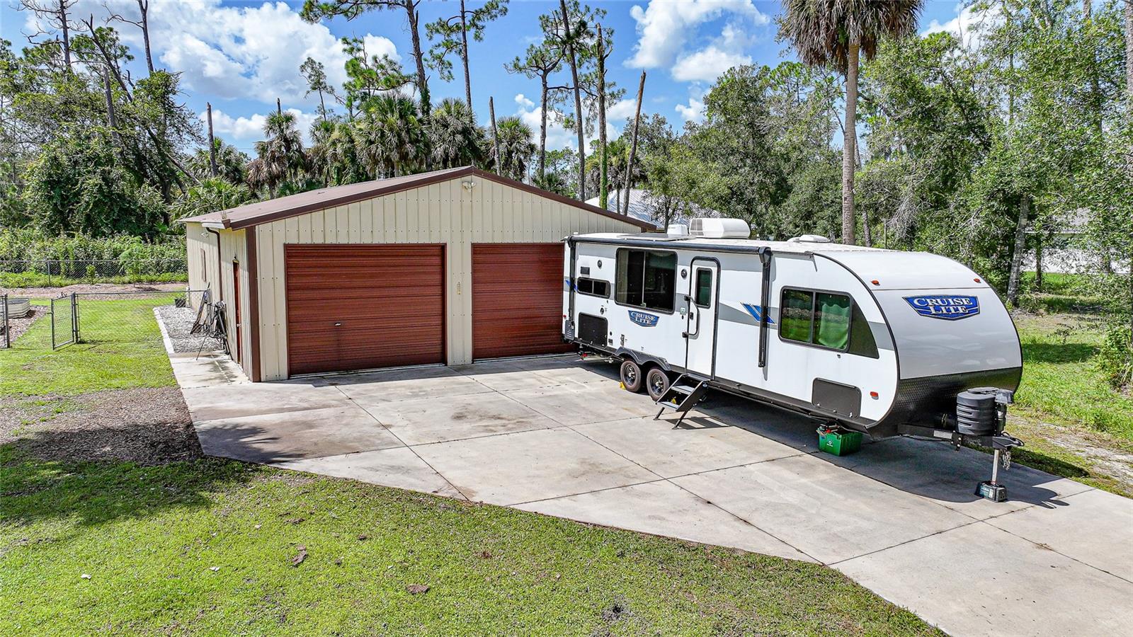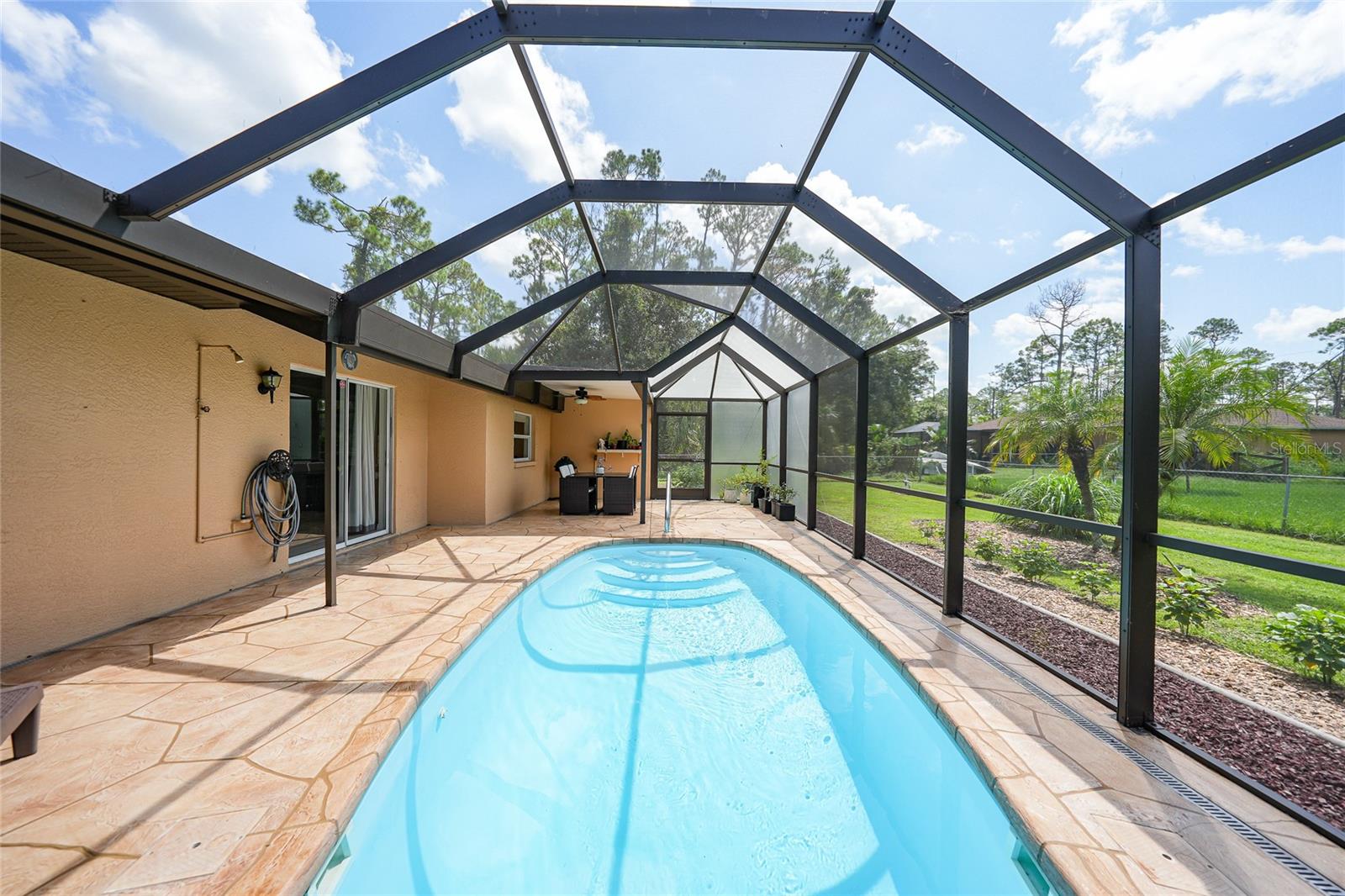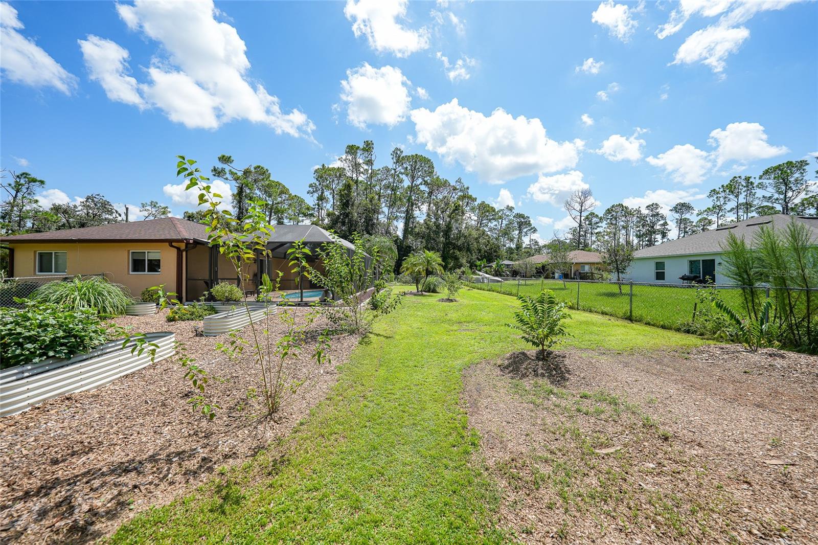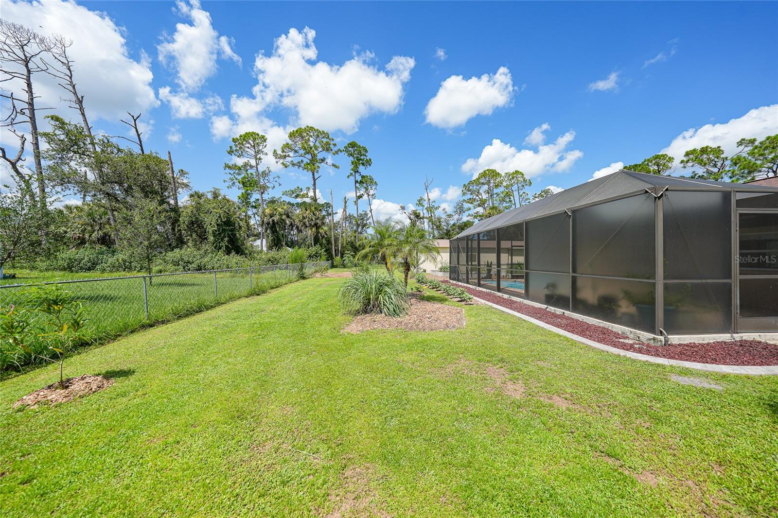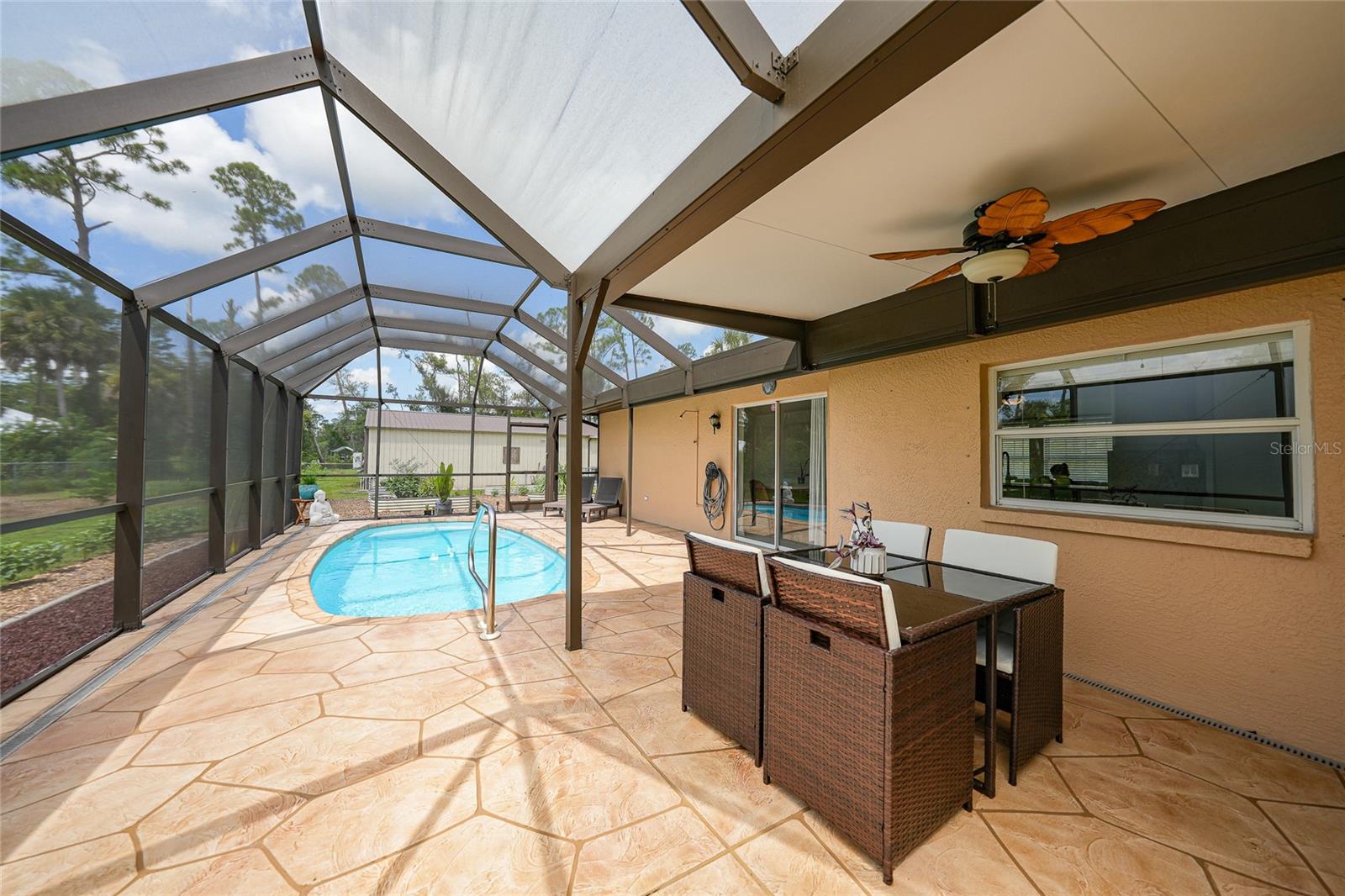 Come see this charming 3-bedroom, 2-bath home on a double lot in desirable North Port Estates! This exceptionally maintained home offers the perfect blend of freedom, space, and modern upgrades all with NO HOA fees, NO deed restrictions, and NO FLOOD ZONE. It also offers 1500 ADDITIONAL SQUARE FEET OF FLEX SPACE. Situated on nearly half an acre of fully fenced land, this property is a private tropical oasis complete with lush landscaping and tropical fruit trees.The heated pool and screened lanai invites year-round enjoyment, creating the perfect outdoor retreat just steps from your back door. The MASSIVE 30x50 DETACHED METAL BUILDING is perfect for a car collection, gym, playroom, workshop, home-based business or additional living area, and is finished with epoxy flooring, spray foam insulation, it’s own electric panel, and a 1 year old mini split system that keeps the entire building comfortably cooled. Inside you'll find a beautifully remodeled kitchen featuring quartz countertops and updated cabinetry with under cabinet lighting, updated appliances, and tile flooring throughout, cathedral ceilings, split bedroom floorpan, interior laundry, ample closet space, ideal for both everyday living and entertaining. Recent improvements throughout the home include a 5 year old ROOF, 4 year old HVAC system, upgraded electric panel, 1 year old water heater, fresh exterior paint, and a resurfaced pool with a refinished deck. The home also features a whole house generator hookup and a brand NEW WHOLE HOUSE REVERSE OSMOSIS SYSTEM installed in 2025, complete with a 100-gallon holding tank and a new pump, ensuring high-quality water throughout the property. This move-in ready home comes with hurricane shutters for all windows and sliding door. This quiet neighborhood has easy access to I-75, making it a breeze for your commute or traveling. The future Sarasota Memorial Hospital will be 2.5 miles away, at exit 182 adding value and convenience. For your outdoor activities, Myakkahatchee Creek Environmental Park is minutes away which will lead you to the Legacy Trail with miles of trails and to explore. Venice Beach, Nokomis Beach, Wellen Park, and Sarasota, are all under 30 minutes away! Bring your RV, boat, car collection, business, and enjoy this piece of tranquil paradise. This is a rare opportunity, so don’t wait. Schedule your private showing today!