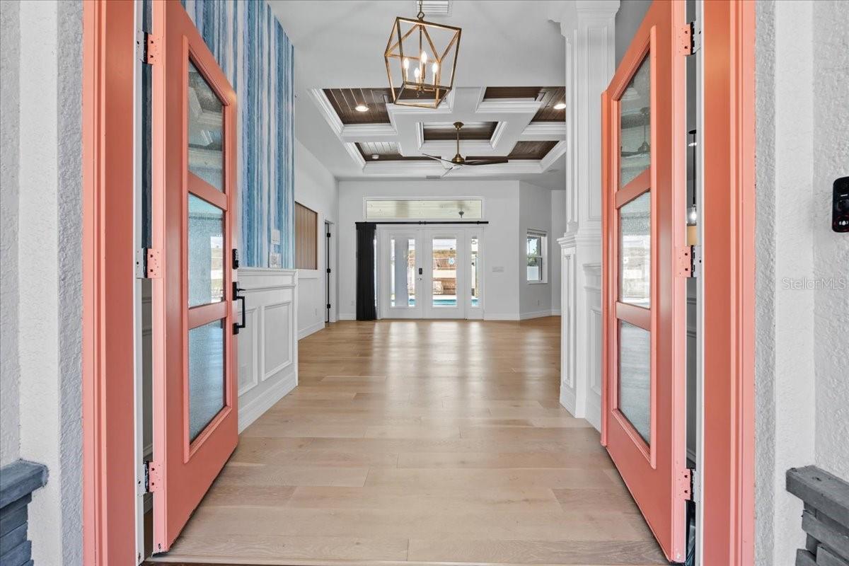 Step into luxury with this custom home built in 2018 by Walker Homes, offering 2,286 square feet of beautifully finished living space on an oversized half-acre lot in the heart of North Port. Featuring three bedrooms and two and a half baths, this thoughtfully designed residence boasts a split-bedroom layout with a spacious main-level primary suite, offering the perfect combination of comfort and privacy. The gourmet kitchen is a chef’s dream, highlighted by a striking waterfall island, custom cabinetry, stainless steel appliances, and high-end finishes throughout. The open-concept living space features coffered ceilings and is bathed in natural light, with durable luxury vinyl plank flooring throughout the main living areas and luxury tile in the bathrooms for a modern, cohesive feel. A bonus room off the main living area provides additional flexible space—ideal for a home office, playroom, den, or guest area—and includes extra built-in storage with endless potential to fit your lifestyle needs. Step outside into your private tropical retreat. Take a dip in the in-ground pool, grill under the expansive covered lanai with built-in summer kitchen or unwind beneath the brand-new patio pergola. A charming tiki hut adds a touch of island living—perfect for entertaining or simply relaxing in the shade. The lush landscaping is supported by an irrigation well system and enhanced by solar lighting, creating a tranquil, resort-style setting. The home also includes a finished RV port/garage wing with its own private entrance, workshop, office space, and half bath—perfect for guests, hobbies, or extended workspace. With plenty of parking for RVs, boats, or extra vehicles and no HOA or CDD fees, this home offers flexibility and freedom rarely found in a custom property.