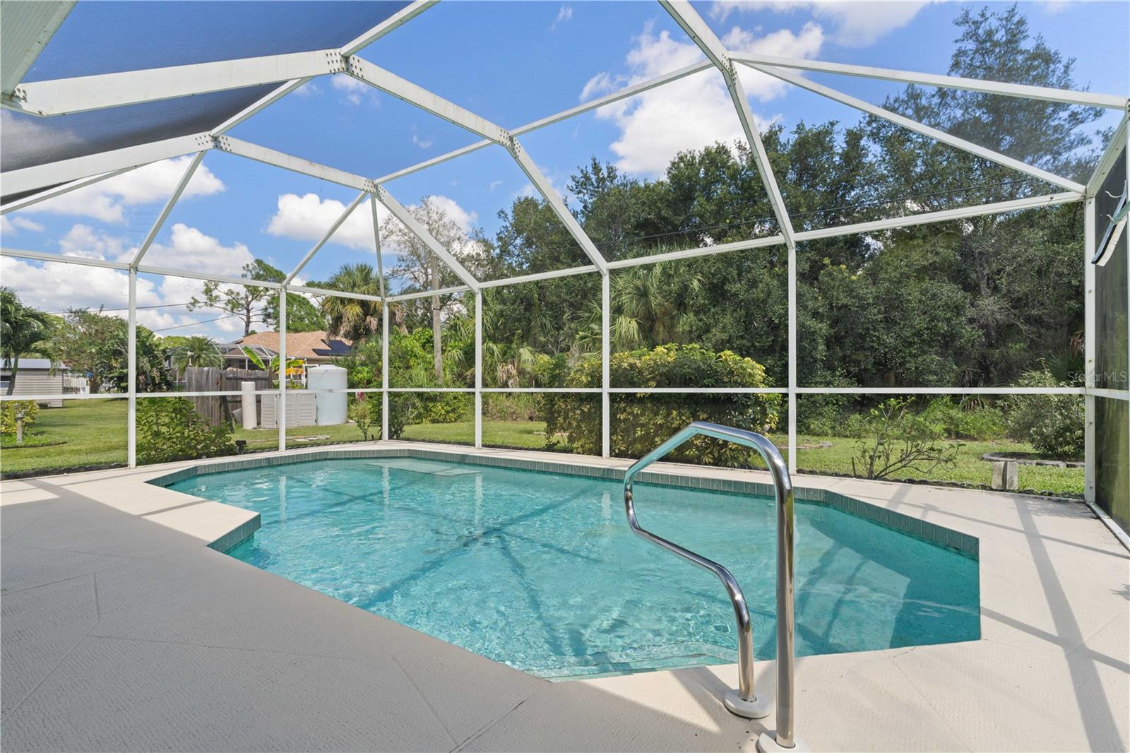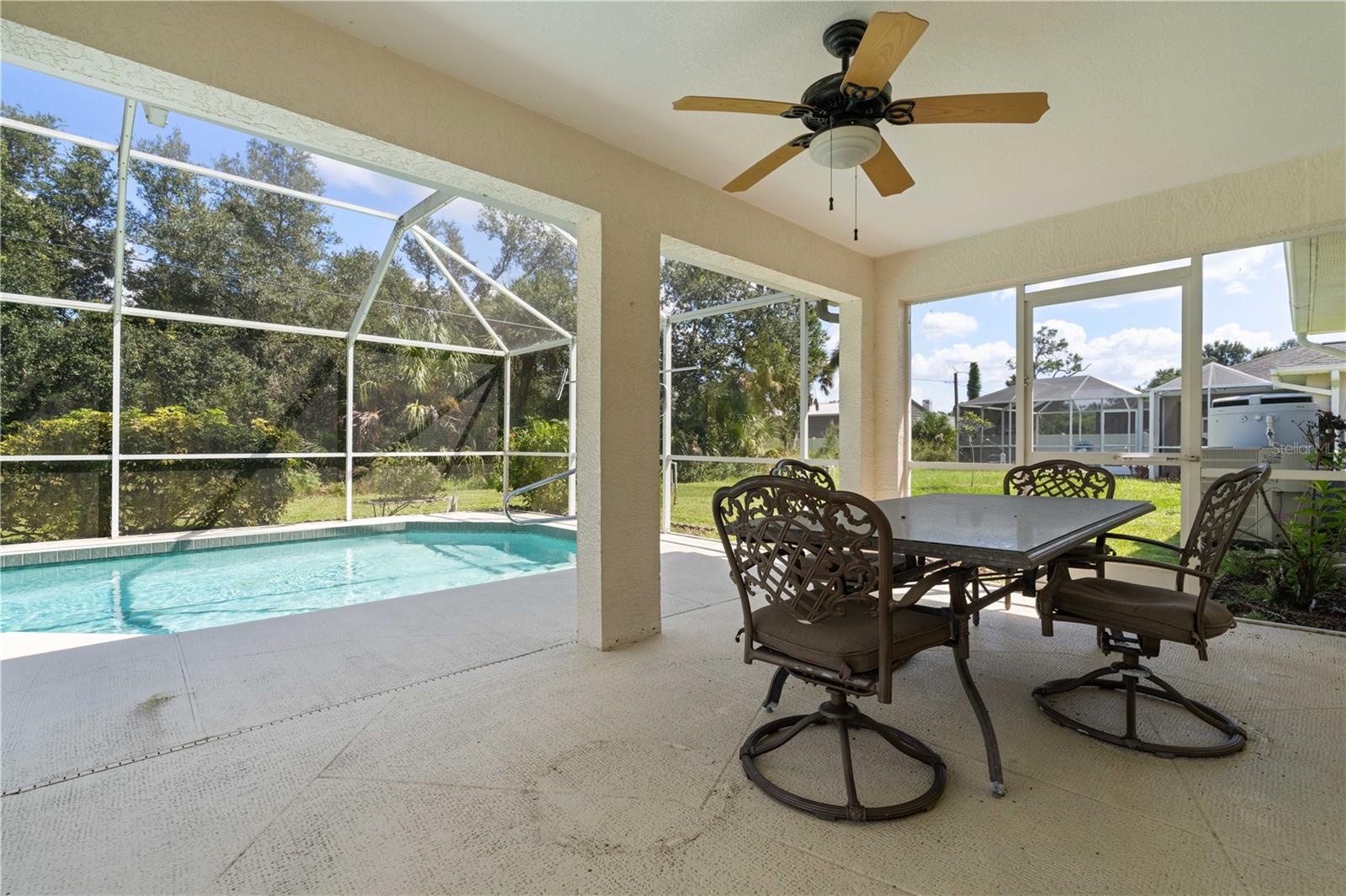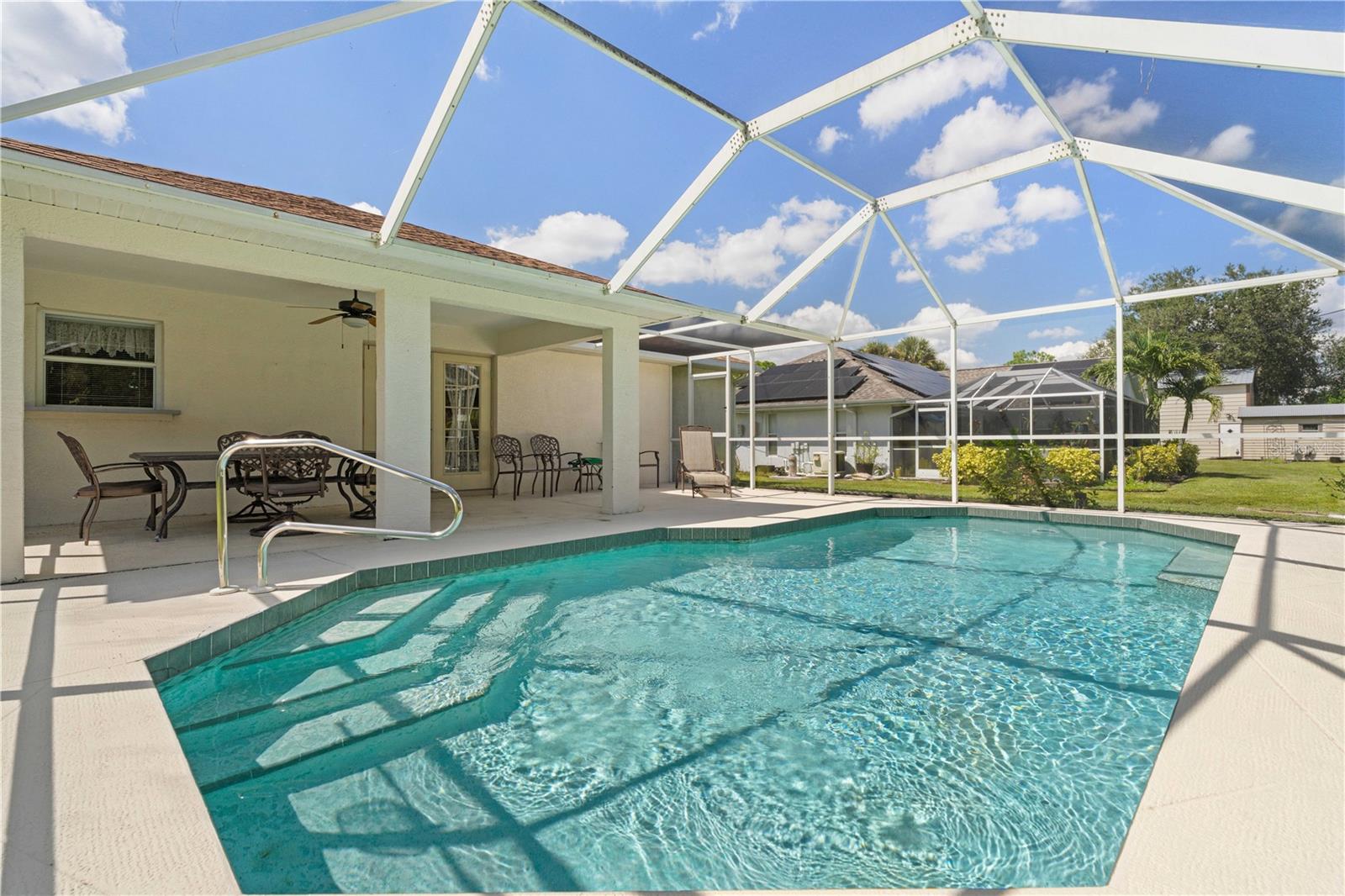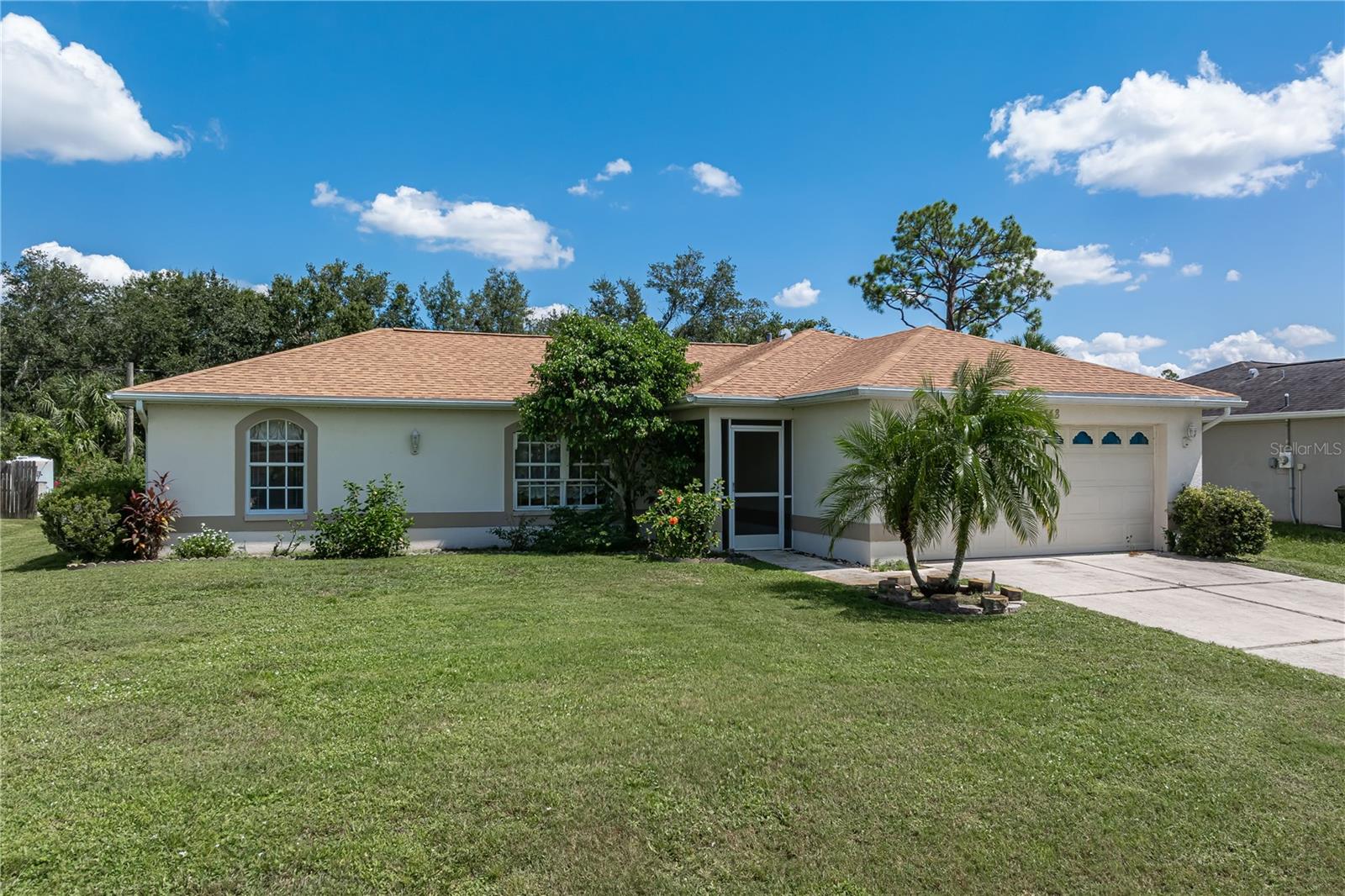 NORTH PORT POOL HOME W/NEW ROOF - Check out this 3 bed/2 bath home in the heart of North Port offering a heated pool, open layout, and a convenient location close to shopping, dining, and medical facilities. Inside, cathedral ceilings and an open layout create a light-filled great room that flows easily into the dining area and kitchen. Kitchen has an island w/breakfast bar seating, an adjacent dining area as well as a pass-through window to the lanai. The home features a large master retreat w/en-suite bath & oversized walk-in closet. The guest bedrooms share a full hall bath. The split-bedroom design ensures privacy, while an interior laundry/mudroom with utility sink and direct garage access adds everyday function. Outdoor living shines here with a covered lanai and in-ground, heated pool surrounded by a screened enclosure. Relax poolside or under the shade of the covered area. Spend your days lounging by the in-ground, heated pool or gathering with friends in the screened lanai. Set on a quiet street with no HOA restrictions, this property delivers Florida living without compromise. Priced right and full of potential, the home is a smart option whether you’re a first-time buyer, investor, or simply looking for an affordable way to enjoy Florida living.