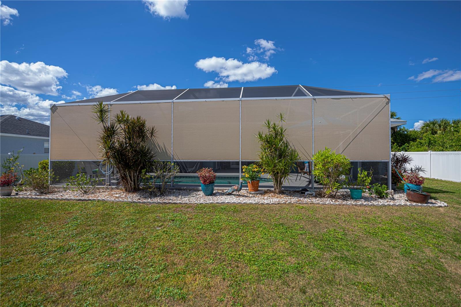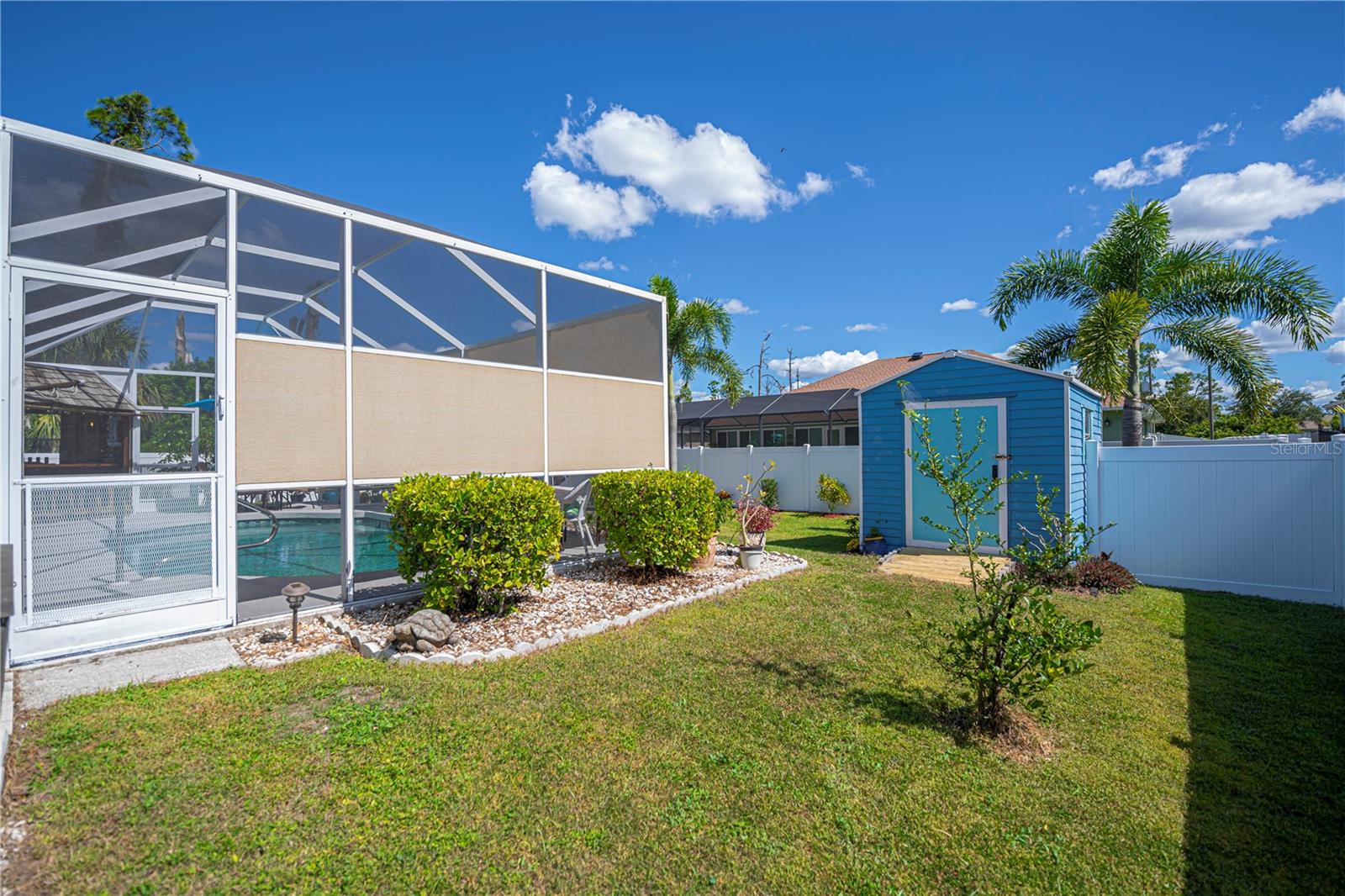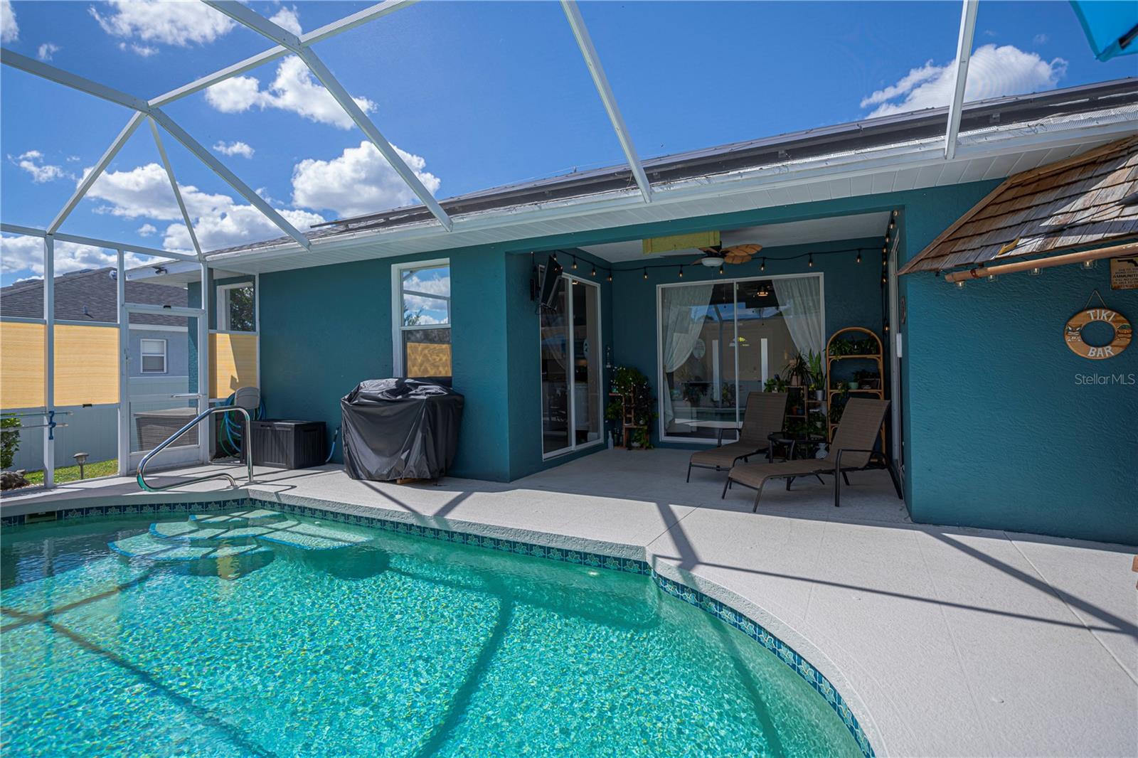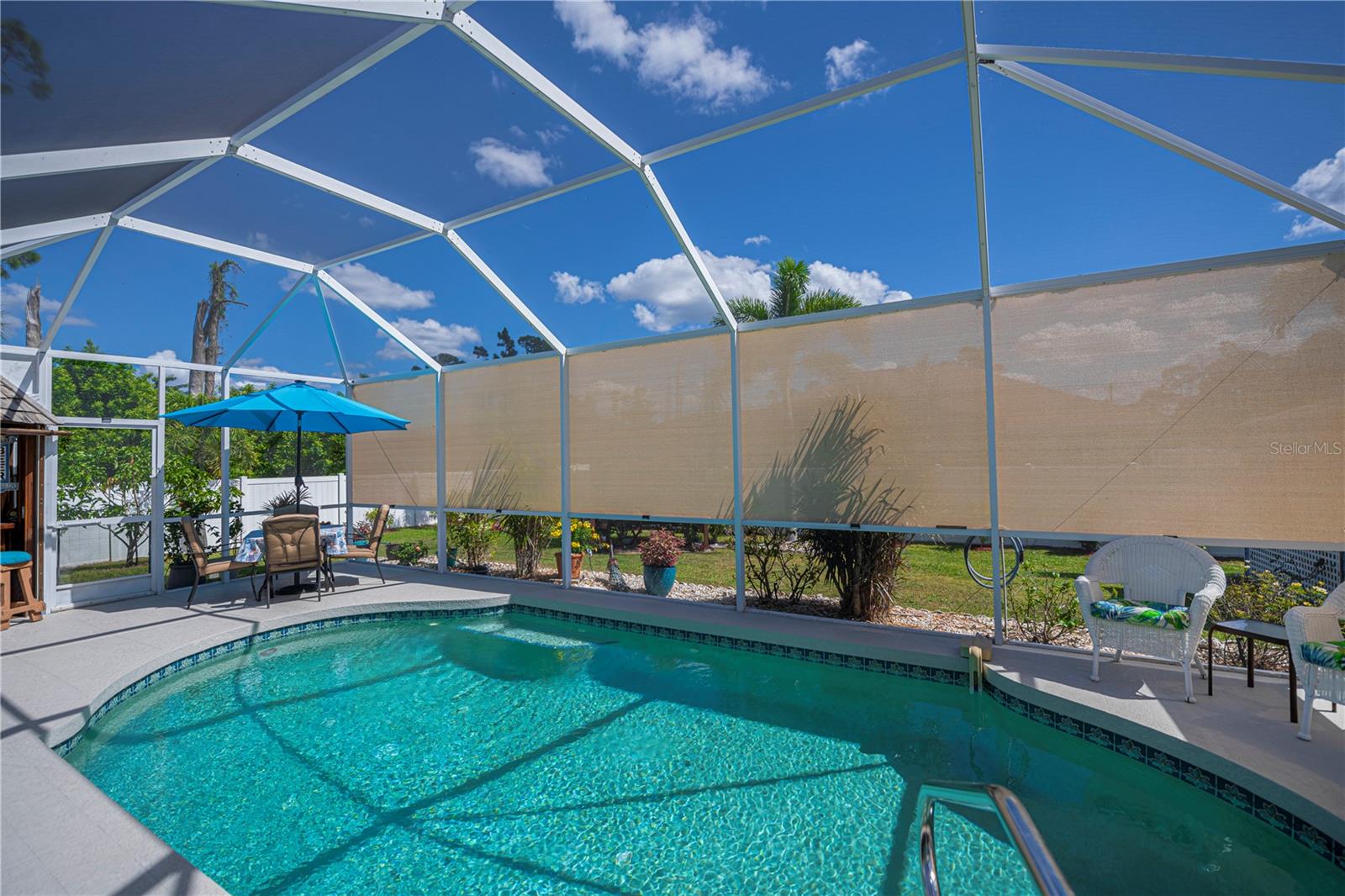 ABSOLUTELY STUNNING 3-bedroom, 2-bathroom, 2-car garage POOL HOME in North Port featuring the ULTIMATE BACKYARD SHOWSTOPPER—a one-of-a-kind POOLSIDE TIKI BAR perfect for unforgettable gatherings and fun-filled weekends! This beautifully updated residence offers incredible SOLAR SAVINGS and custom decorator touches throughout that make it truly unique. $$ PRICE IMPROVEMENT ALERT $$ Step inside through a welcoming entry to elegant ceramic plank tile flooring, rounded corners, and sunburst windows that bathe the home in natural light, all within a private, fully fenced yard. The chef’s dream kitchen boasts pristine white shaker cabinetry with soft-close doors and drawers, a subway tile backsplash, granite countertops, a spacious pantry, and a convenient breakfast island with high-quality appliances. Gather in the expansive living room and separate dining area, enhanced with stylish custom accents—ideal for entertaining family and friends. Retreat to the luxurious master suite featuring private patio access, pool entry, a large walk-in closet, and a beautifully updated ensuite with dual sinks, granite vanities, and a private commode. Guest bedrooms offer ample space and share a modern, updated bathroom. Step outside to your oversized private pool with a generous sundeck perfect for lounging, a large covered patio, and the show-stopping custom tiki-style outdoor wet bar—a backyard entertainer’s dream! Garden lovers will adore the pergola misting system designed to nurture orchids and create a serene outdoor oasis. Additional highlights include: *New 2023 pool cage and 2025 A/C system *Recent property survey *Public water & septic (2013) *Smart 8-zone sprinkler system with Bluetooth tech (2020) *Inside laundry with extra storage cabinetry *Miami-Dade Kevlar hurricane protection for peace of mind *29 solar panels (half already paid off by seller) delivering instant solar equity and an average power bill of only $279/month *Garage with sliding screened doors for airflow and privacy *8x10 outdoor shed with electricity and water—perfect for hobbies or storage *No HOA fees or flood insurance required Located near Myakka State Park and Myakkahatchee Creek Environmental Center with miles of trails, horseback riding, hiking, birdwatching, water access, plus close to Punta Gorda airport, shopping, dining, beaches, Warm Mineral Springs, and the aquatic center. This SOLAR-POWERED PARADISE blends luxury, comfort, and exceptional savings—your private resort awaits in North Port. DON'T MISS OUT—schedule your visit today before this spectacular home is gone!