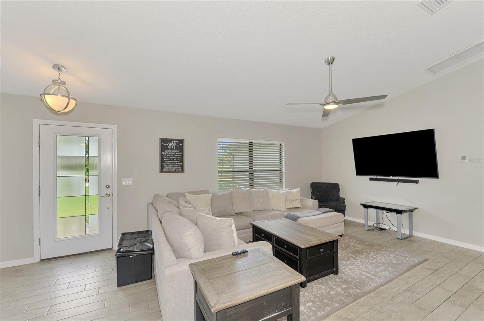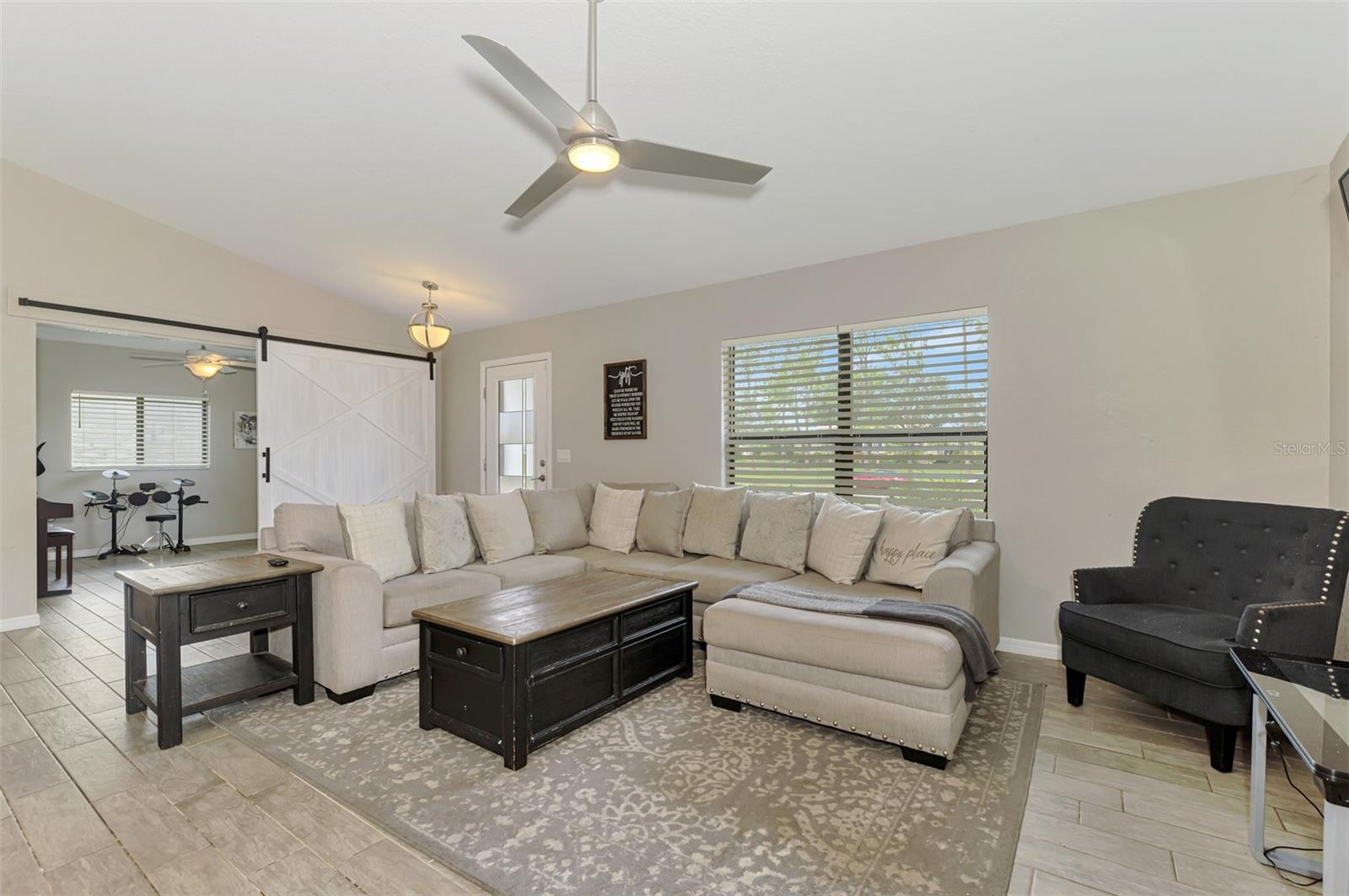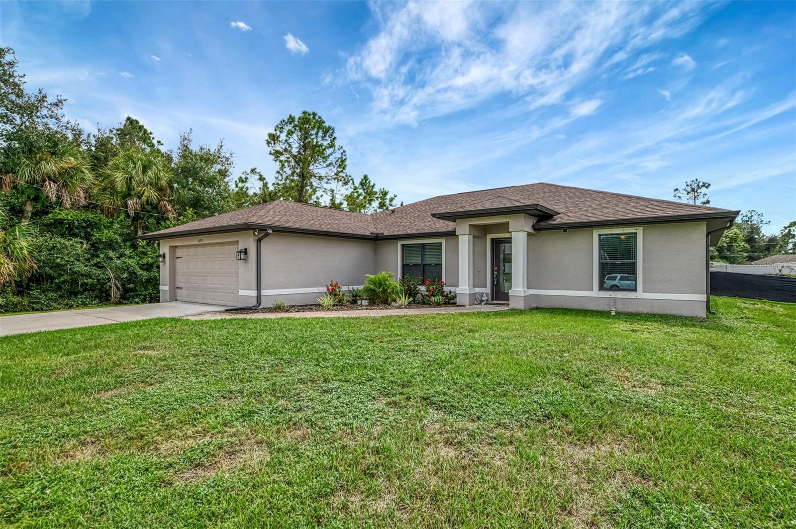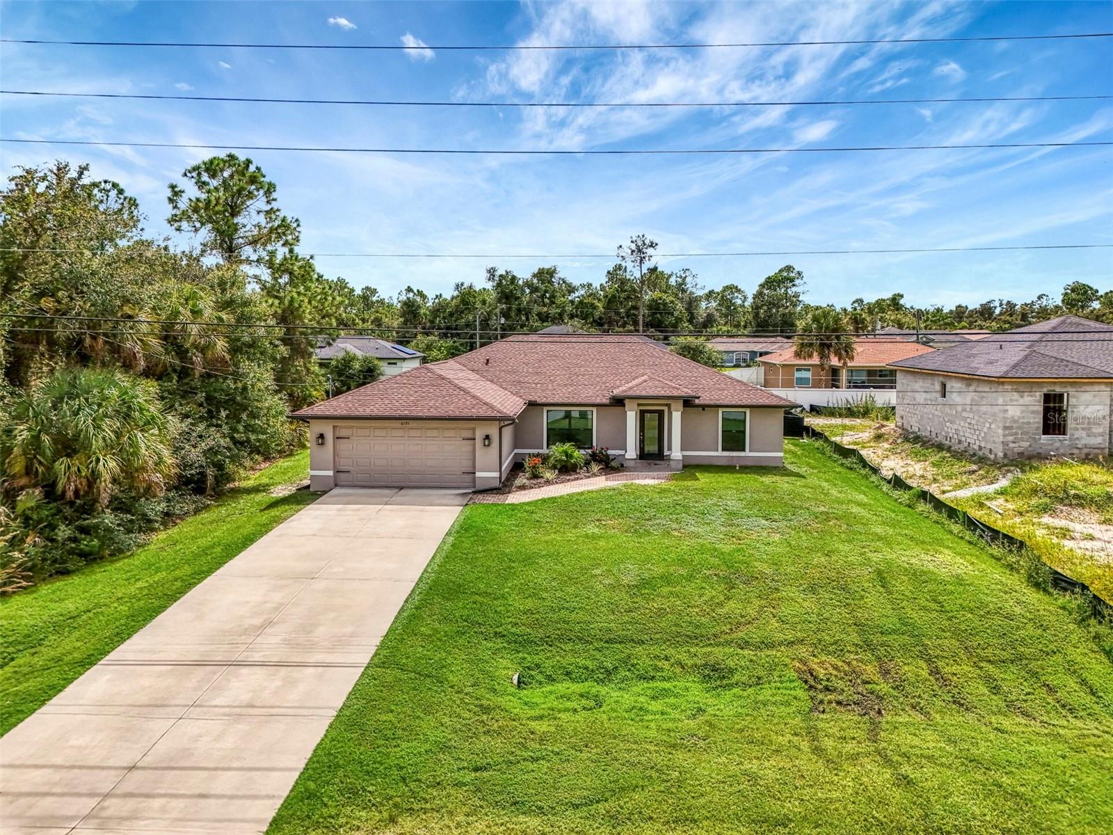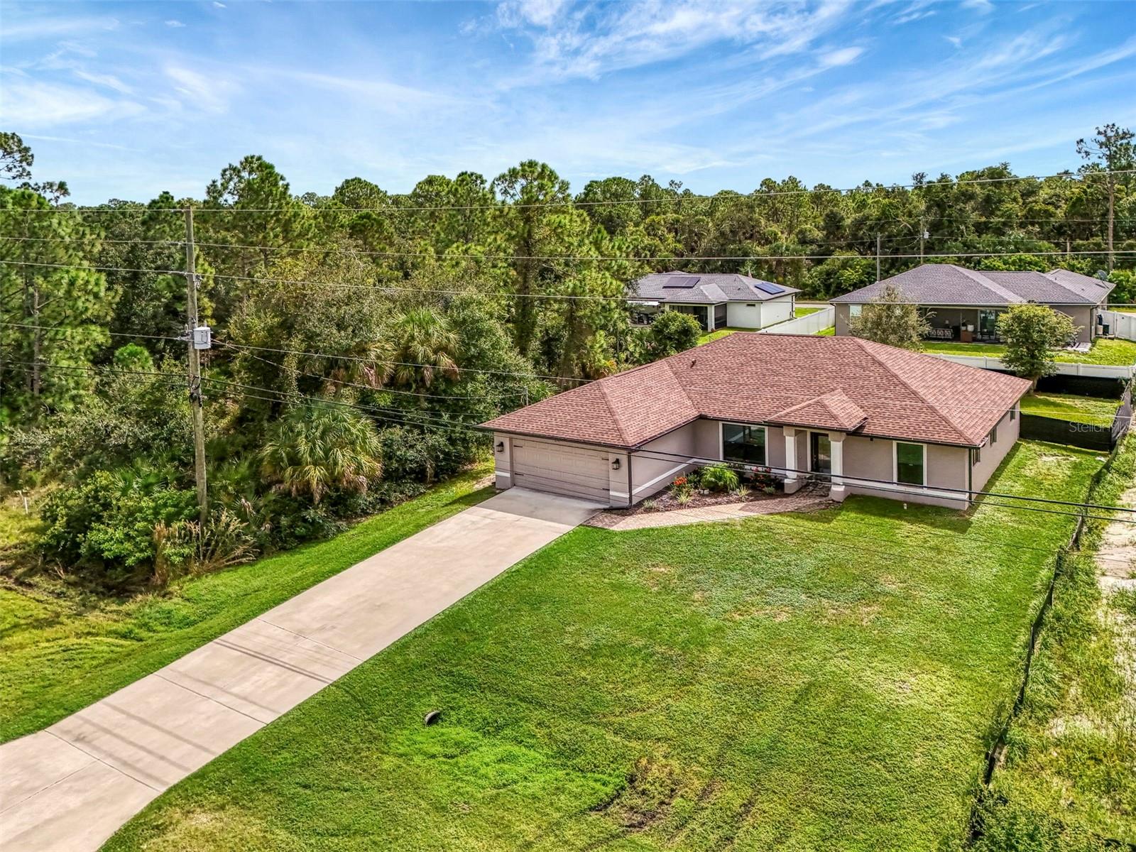 NORTH PORT ESTATES BEAUTY! Built in 2019 and offering nearly 1,700 square feet of UPGRADED living space, this 3-bedroom, 2-bathroom home—with an ADDITIONAL DEN OR OFFICE featuring a decorative BARN DOOR that can easily serve as a 4th bedroom—delivers the perfect blend of style, comfort, and practicality. With a NEW ROOF (2023), no HOA fees, and NO FLOOD ZONE, this property is ready for worry-free living. Step inside and feel the open flow of cathedral ceilings and elegant plank tile flooring throughout. The great room seamlessly connects to a gorgeous modern kitchen, complete with a CENTER ISLAND QUARTZ OPEN BREAKFAST BAR, SLOW-CLOSE WOOD CABINETRY WITH CROWN MOLDING, SUBWAY TILE BACKSPLASH & BLACK STAINLESS -STEEL APPLIANCES and UPGRADED PENDANT LIGHTING. Whether preparing a meal or entertaining, this kitchen makes it easy and enjoyable. The dining area’s FRENCH DOORS open to an HUGE OVERSIZED 12x37-FT. COVERED LANAI, overlooking a FENCED BACKYARD with room to relax, play, or garden. (Yes, the trampoline can stay!) Enjoy outdoor living all year long in privacy and peace. The primary suite is a showpiece with a tray ceiling, a large walk-in closet, and a luxurious ensuite featuring DUAL QUARTZ SINKS, a GARDEN TUB, and a MULTI HEAD SHOWER. Both guest bedrooms are generously sized—13x11—with walk-in closets and ceiling fans. The guest bath includes a tub/shower combo and stylish finishes. Additional highlights include: indoor laundry with washer and dryer, BRICK PAVER DRIVEWAY & WALKWAY, FULL HURRICANE PROTECTION, newer well, UPDATED A/C, WATER SOFTNOR, and SECURITY CAMERAS. Located in sought-after North Port Estates, you’ll enjoy the quiet country feel while being just minutes from city conveniences. Nearby Myakkahatchee Creek Environmental Park offers scenic walking and biking trails, horseback riding, fishing, and picnic areas. You’re also close to I-75, the new Sarasota Memorial Hospital, shopping, restaurants, and top local attractions. Move-in ready, beautifully maintained, and priced right—this home checks every box. FURNITURE IS NEGOTIALE! Schedule your private showing today!