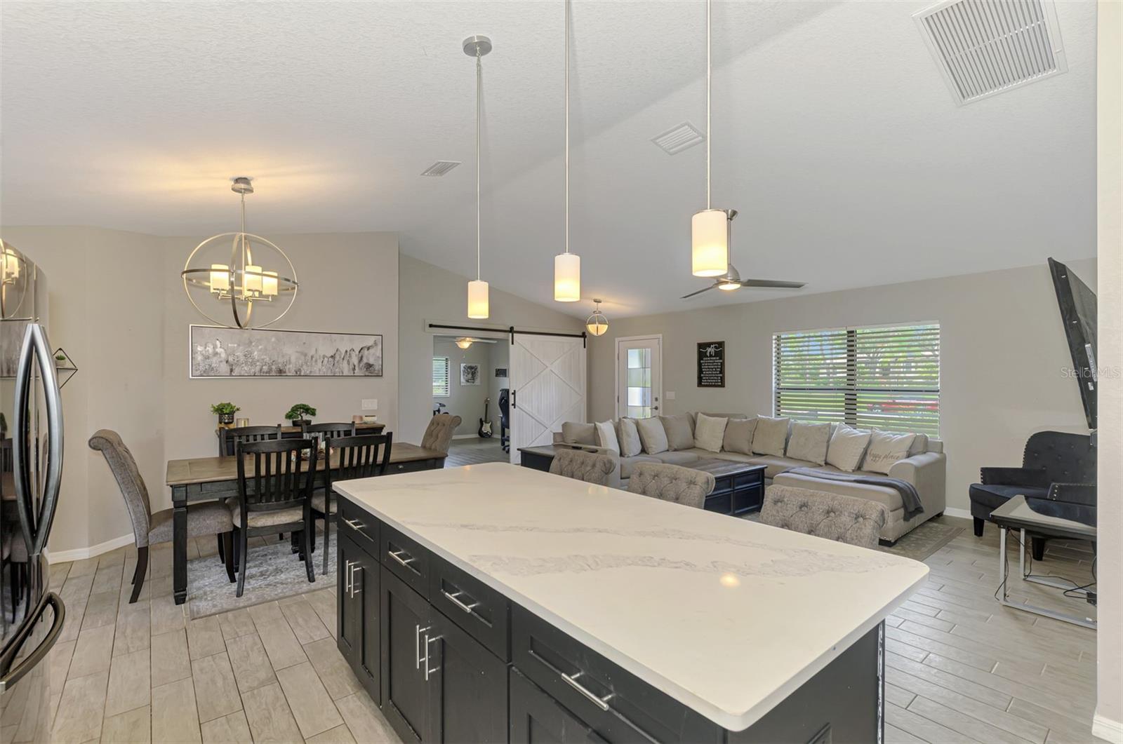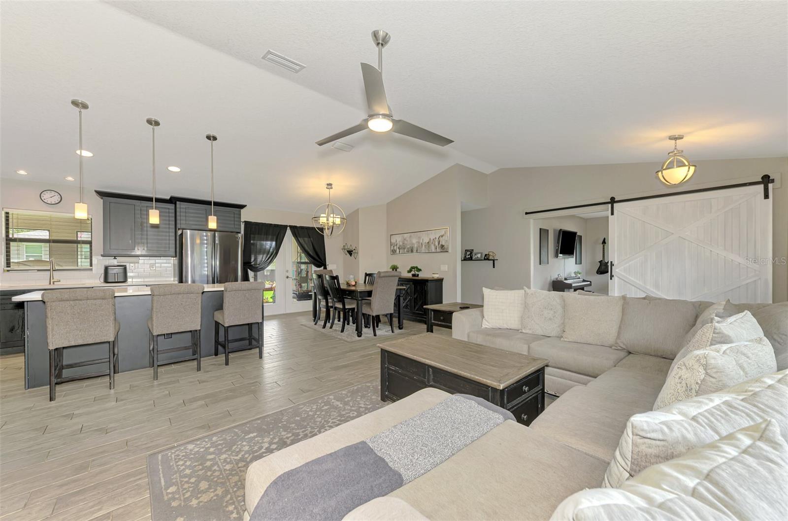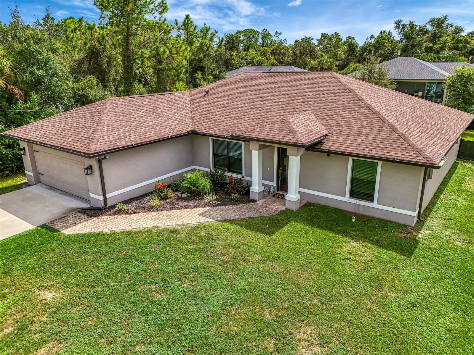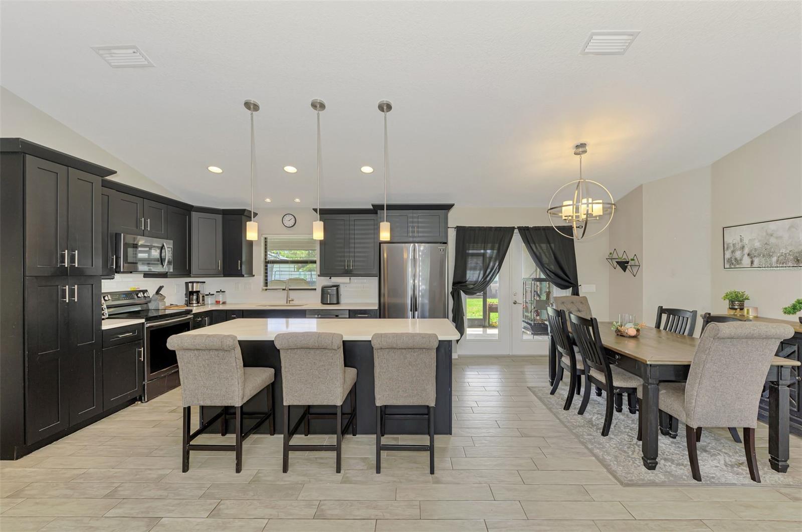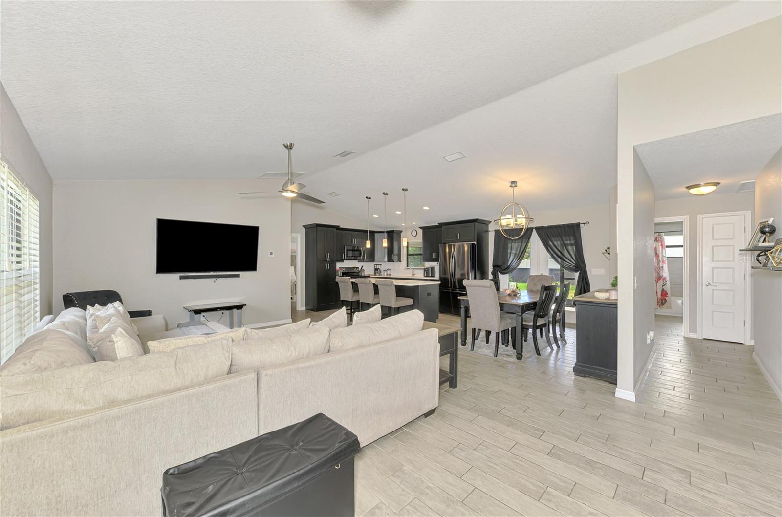 NORTH PORT ESTATES BEAUTY! Built in 2019 and offering nearly 1,700 square feet of UPGRADED living space, this 3-bedroom, 2-bathroom home—with an ADDITIONAL DEN OR OFFICE featuring a decorative BARN DOOR that can easily serve as a 4th bedroom—delivers the perfect blend of style, comfort, and practicality. With a NEW ROOF (2023), no HOA fees, and NO FLOOD ZONE, this property is ready for worry-free living. Step inside and feel the open flow of cathedral ceilings and elegant plank tile flooring throughout. The great room seamlessly connects to a gorgeous modern kitchen, complete with a CENTER ISLAND QUARTZ OPEN BREAKFAST BAR, SLOW-CLOSE WOOD CABINETRY WITH CROWN MOLDING, SUBWAY TILE BACKSPLASH & BLACK STAINLESS -STEEL APPLIANCES and UPGRADED PENDANT LIGHTING. Whether preparing a meal or entertaining, this kitchen makes it easy and enjoyable. The dining area’s FRENCH DOORS open to an HUGE OVERSIZED 12x37-FT. COVERED LANAI, overlooking a FENCED BACKYARD with room to relax, play, or garden. (Yes, the trampoline can stay!) Enjoy outdoor living all year long in privacy and peace. The primary suite is a showpiece with a tray ceiling, a large walk-in closet, and a luxurious ensuite featuring DUAL QUARTZ SINKS, a GARDEN TUB, and a MULTI HEAD SHOWER. Both guest bedrooms are generously sized—13x11—with walk-in closets and ceiling fans. The guest bath includes a tub/shower combo and stylish finishes. Additional highlights include: indoor laundry with washer and dryer, BRICK PAVER DRIVEWAY & WALKWAY, FULL HURRICANE PROTECTION, newer well, UPDATED A/C, WATER SOFTNOR, and SECURITY CAMERAS. Located in sought-after North Port Estates, you’ll enjoy the quiet country feel while being just minutes from city conveniences. Nearby Myakkahatchee Creek Environmental Park offers scenic walking and biking trails, horseback riding, fishing, and picnic areas. You’re also close to I-75, the new Sarasota Memorial Hospital, shopping, restaurants, and top local attractions. Move-in ready, beautifully maintained, and priced right—this home checks every box. FURNITURE IS NEGOTIALE! Schedule your private showing today!