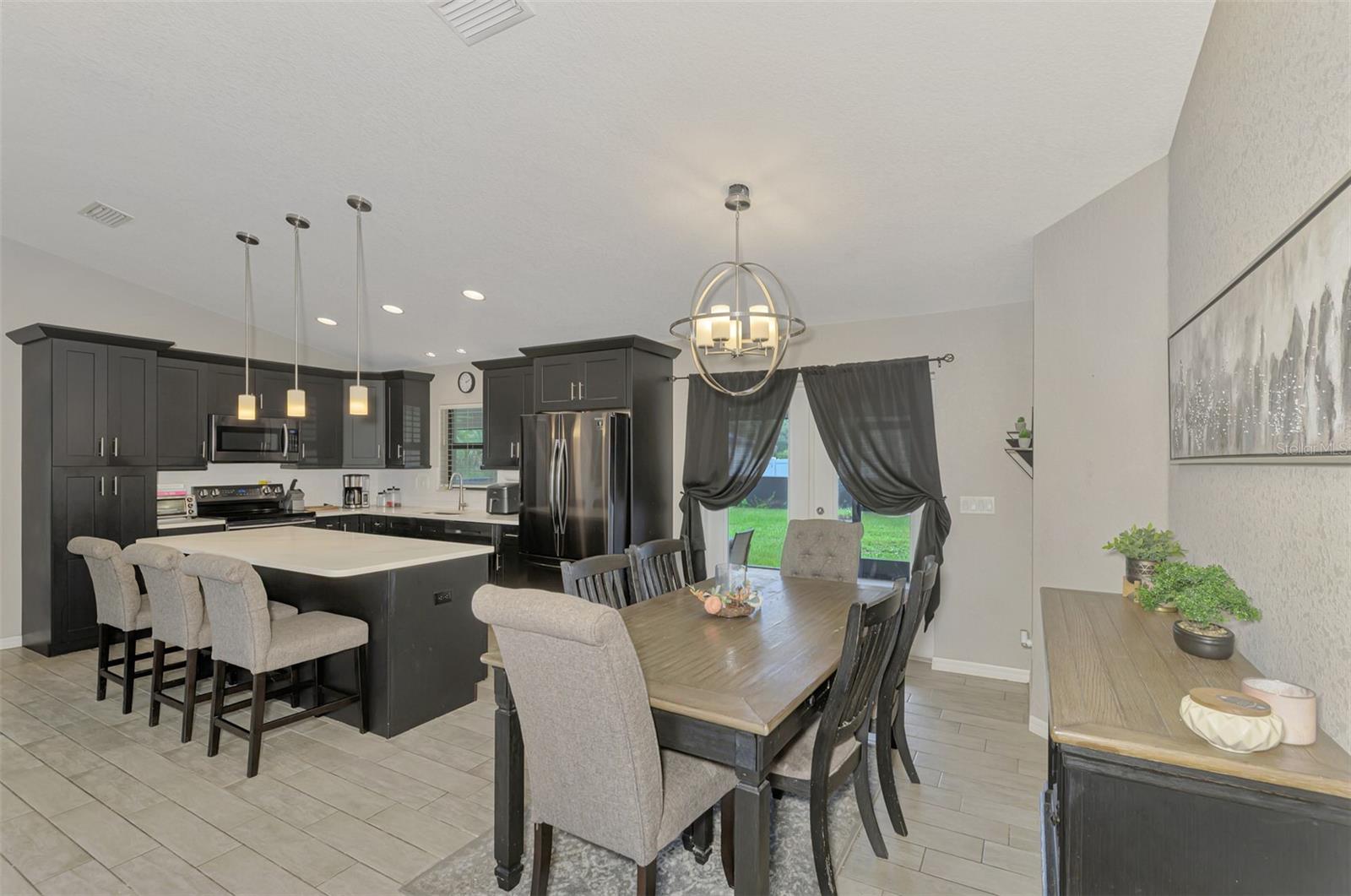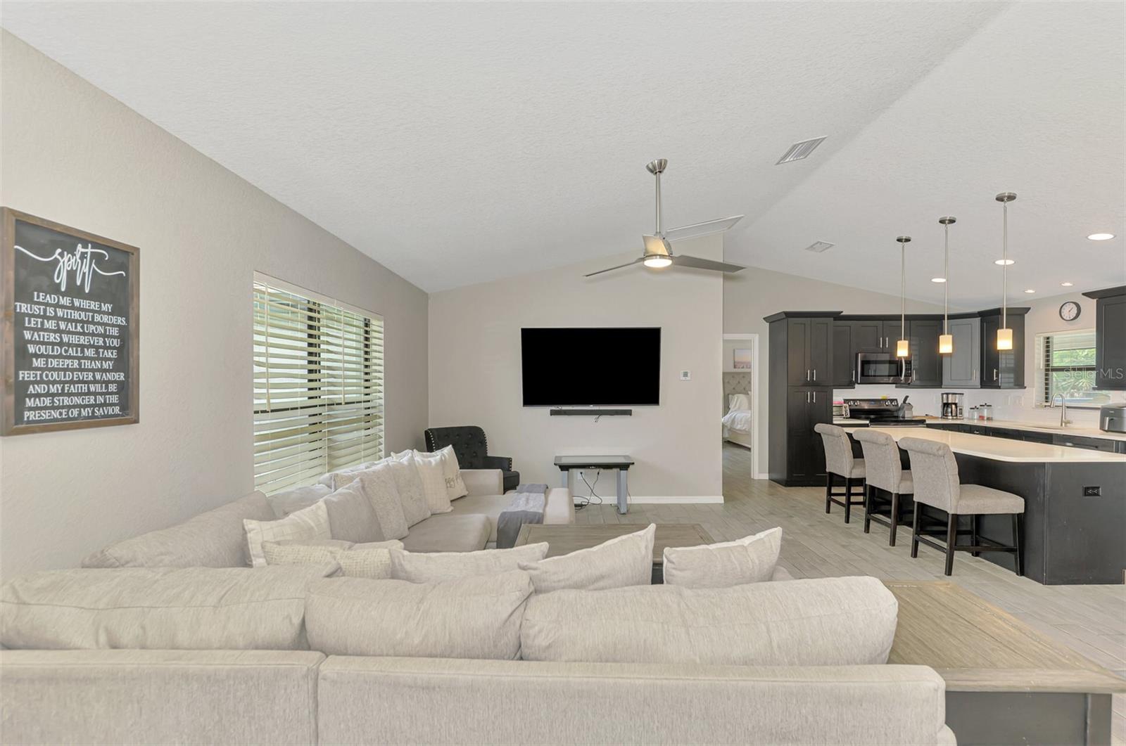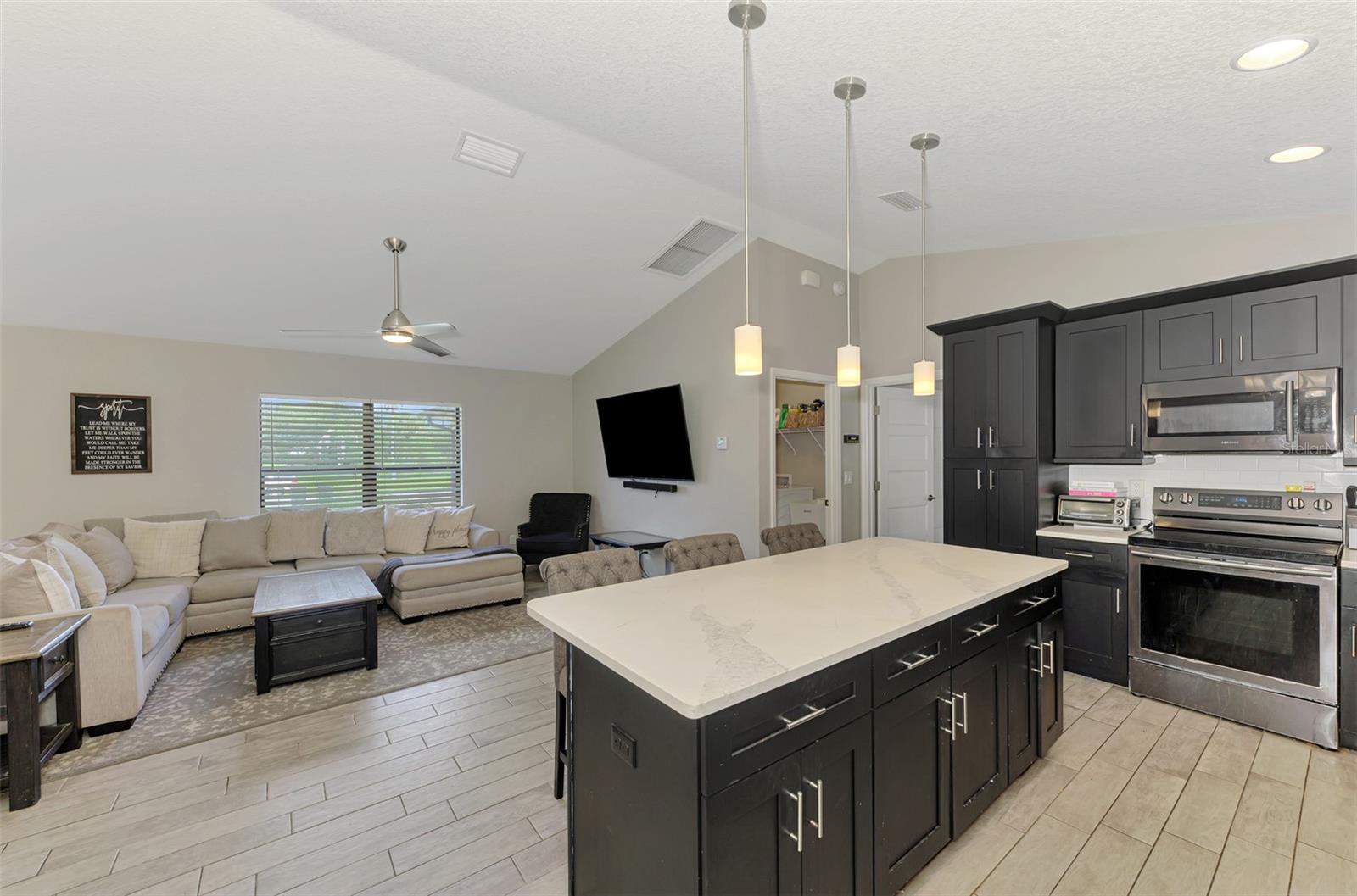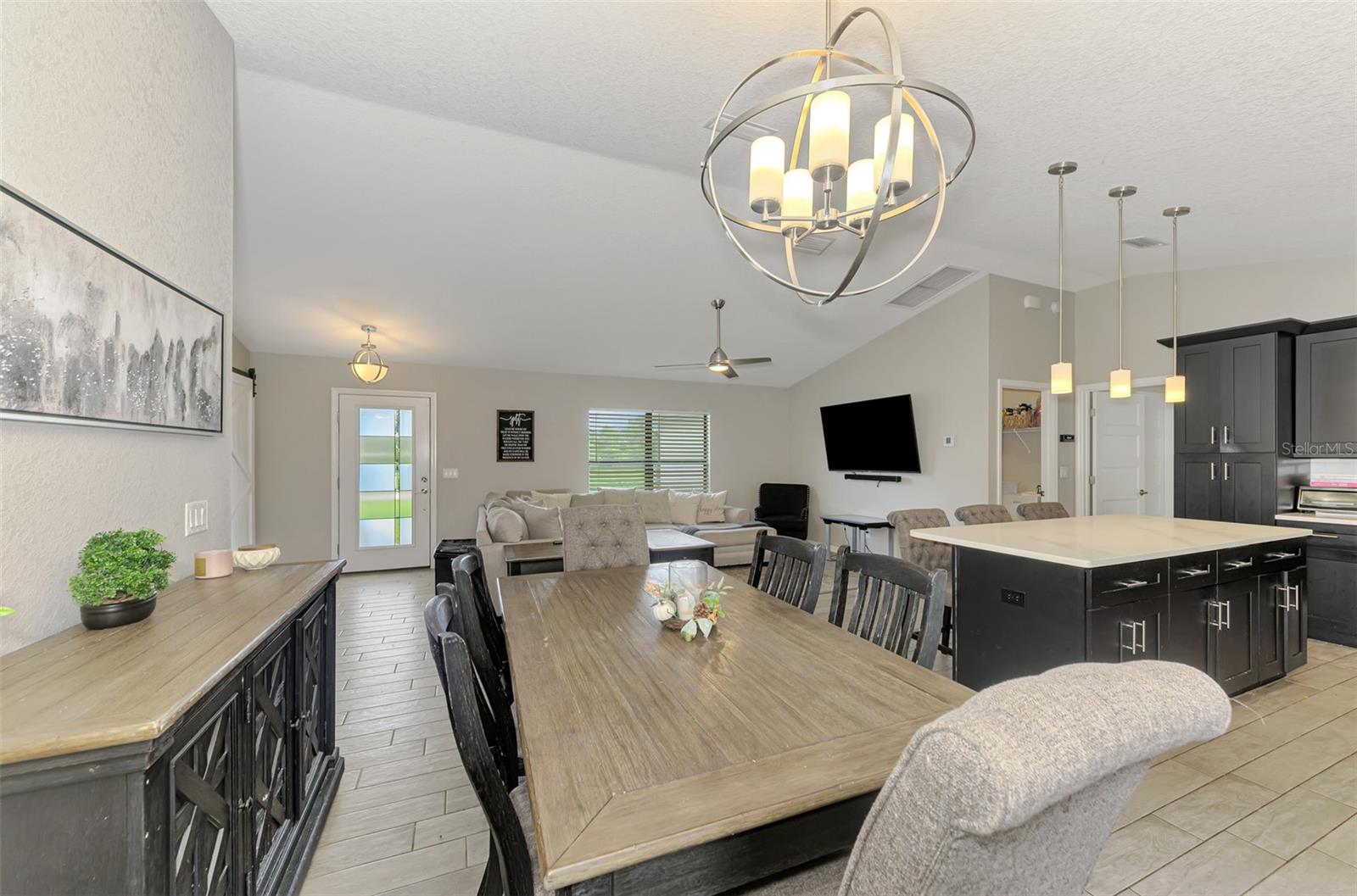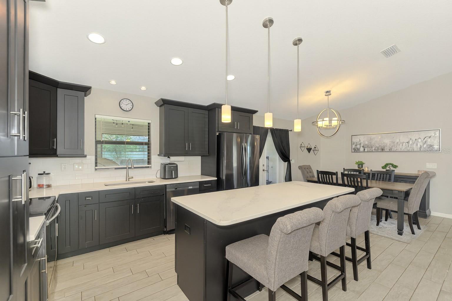 NORTH PORT ESTATES BEAUTY! Built in 2019 and offering nearly 1,700 square feet of UPGRADED living space, this 3-bedroom, 2-bathroom home—with an ADDITIONAL DEN OR OFFICE featuring a decorative BARN DOOR that can easily serve as a 4th bedroom—delivers the perfect blend of style, comfort, and practicality. With a NEW ROOF (2023), no HOA fees, and NO FLOOD ZONE, this property is ready for worry-free living. Step inside and feel the open flow of cathedral ceilings and elegant plank tile flooring throughout. The great room seamlessly connects to a gorgeous modern kitchen, complete with a CENTER ISLAND QUARTZ OPEN BREAKFAST BAR, SLOW-CLOSE WOOD CABINETRY WITH CROWN MOLDING, SUBWAY TILE BACKSPLASH & BLACK STAINLESS -STEEL APPLIANCES and UPGRADED PENDANT LIGHTING. Whether preparing a meal or entertaining, this kitchen makes it easy and enjoyable. The dining area’s FRENCH DOORS open to an HUGE OVERSIZED 12x37-FT. COVERED LANAI, overlooking a FENCED BACKYARD with room to relax, play, or garden. (Yes, the trampoline can stay!) Enjoy outdoor living all year long in privacy and peace. The primary suite is a showpiece with a tray ceiling, a large walk-in closet, and a luxurious ensuite featuring DUAL QUARTZ SINKS, a GARDEN TUB, and a MULTI HEAD SHOWER. Both guest bedrooms are generously sized—13x11—with walk-in closets and ceiling fans. The guest bath includes a tub/shower combo and stylish finishes. Additional highlights include: indoor laundry with washer and dryer, BRICK PAVER DRIVEWAY & WALKWAY, FULL HURRICANE PROTECTION, newer well, UPDATED A/C, WATER SOFTNOR, and SECURITY CAMERAS. Located in sought-after North Port Estates, you’ll enjoy the quiet country feel while being just minutes from city conveniences. Nearby Myakkahatchee Creek Environmental Park offers scenic walking and biking trails, horseback riding, fishing, and picnic areas. You’re also close to I-75, the new Sarasota Memorial Hospital, shopping, restaurants, and top local attractions. Move-in ready, beautifully maintained, and priced right—this home checks every box. FURNITURE IS NEGOTIALE! Schedule your private showing today!